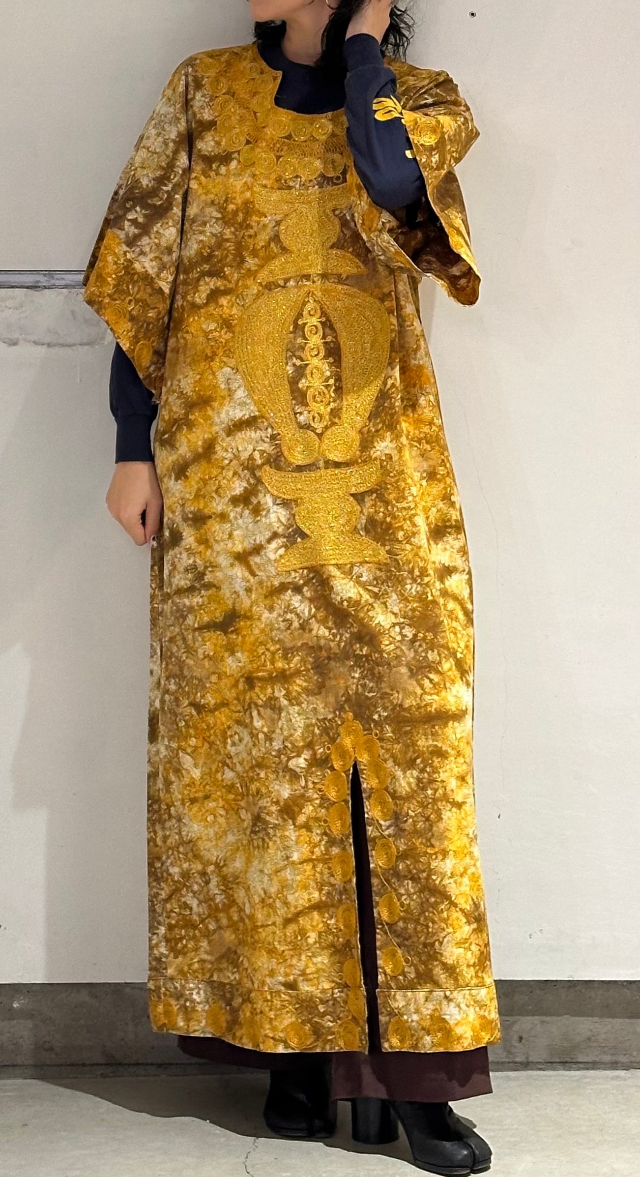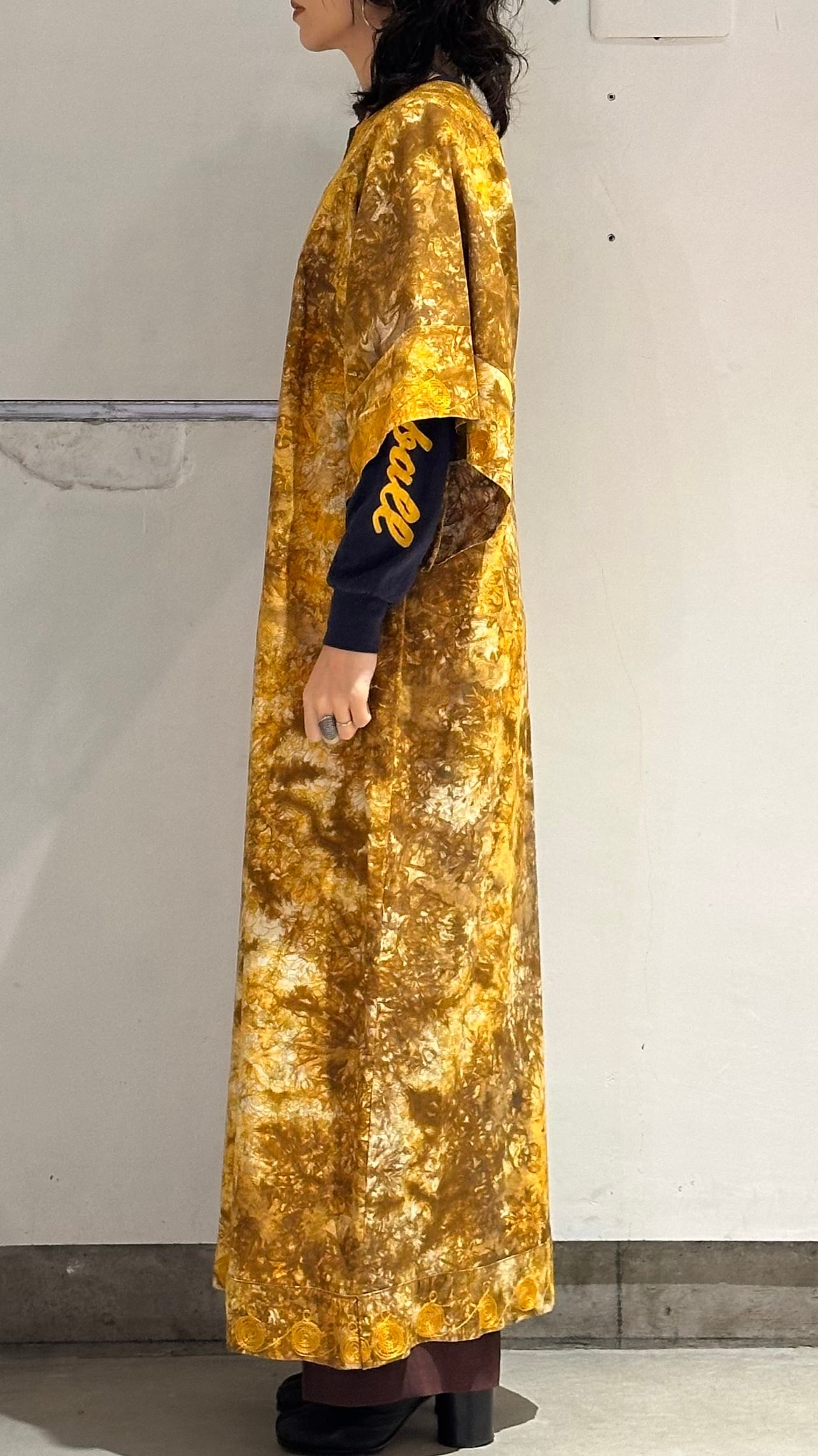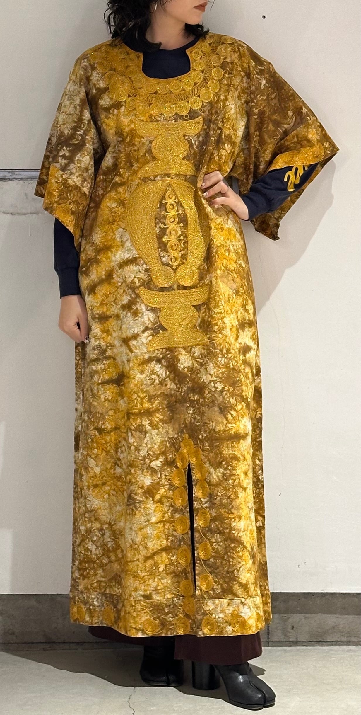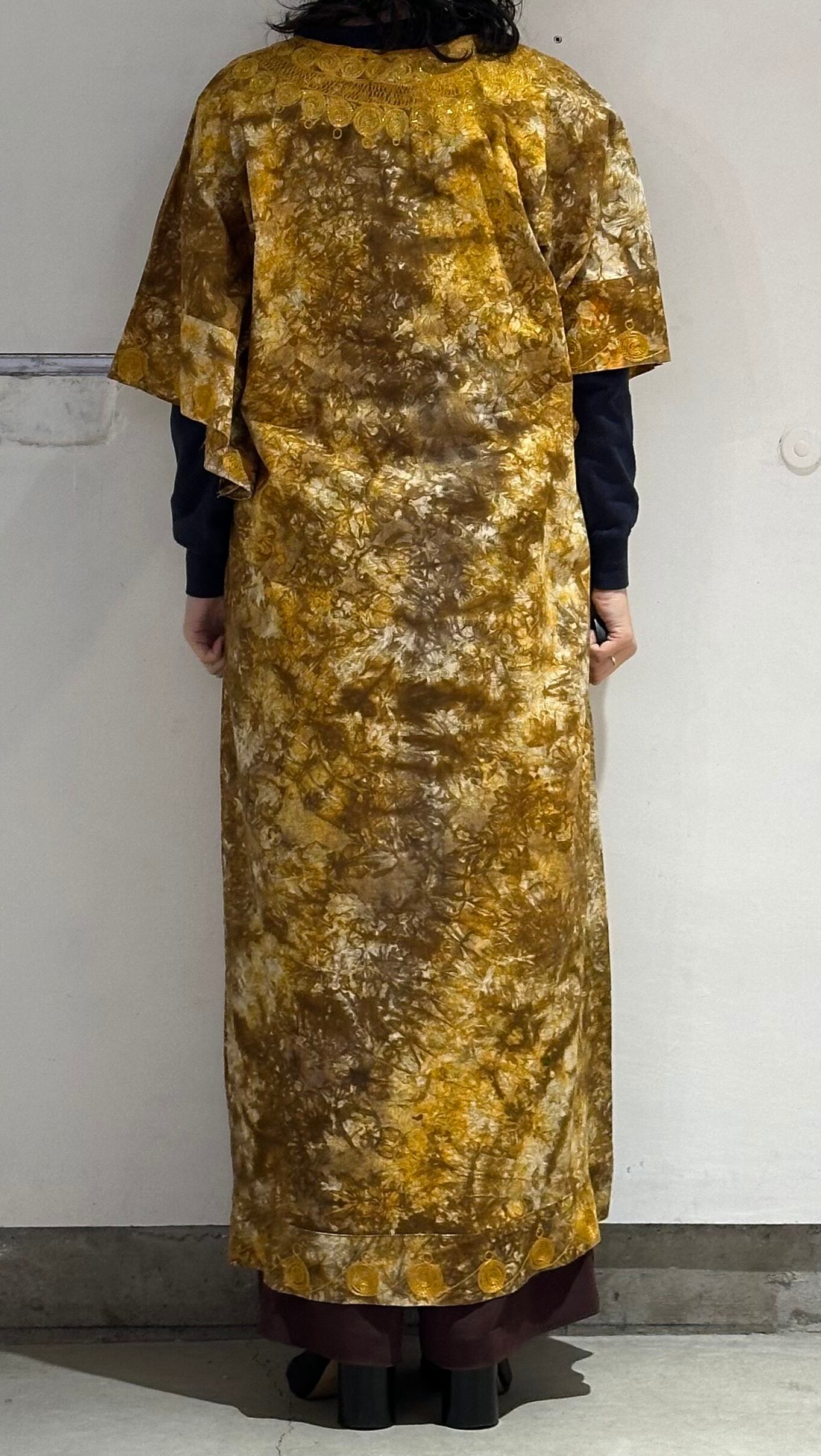 パキスタンのヴィンテージドレス、圧巻の刺繍が胸や袖、裾周り、首元までびっしりと縫われています。とんでもない刺繍です。ボディはコットンだと思いますが、薄い花柄にタイダイのような色がのせられ、全体がイエロー〜ブラウンのカラーリングでとても綺麗です。