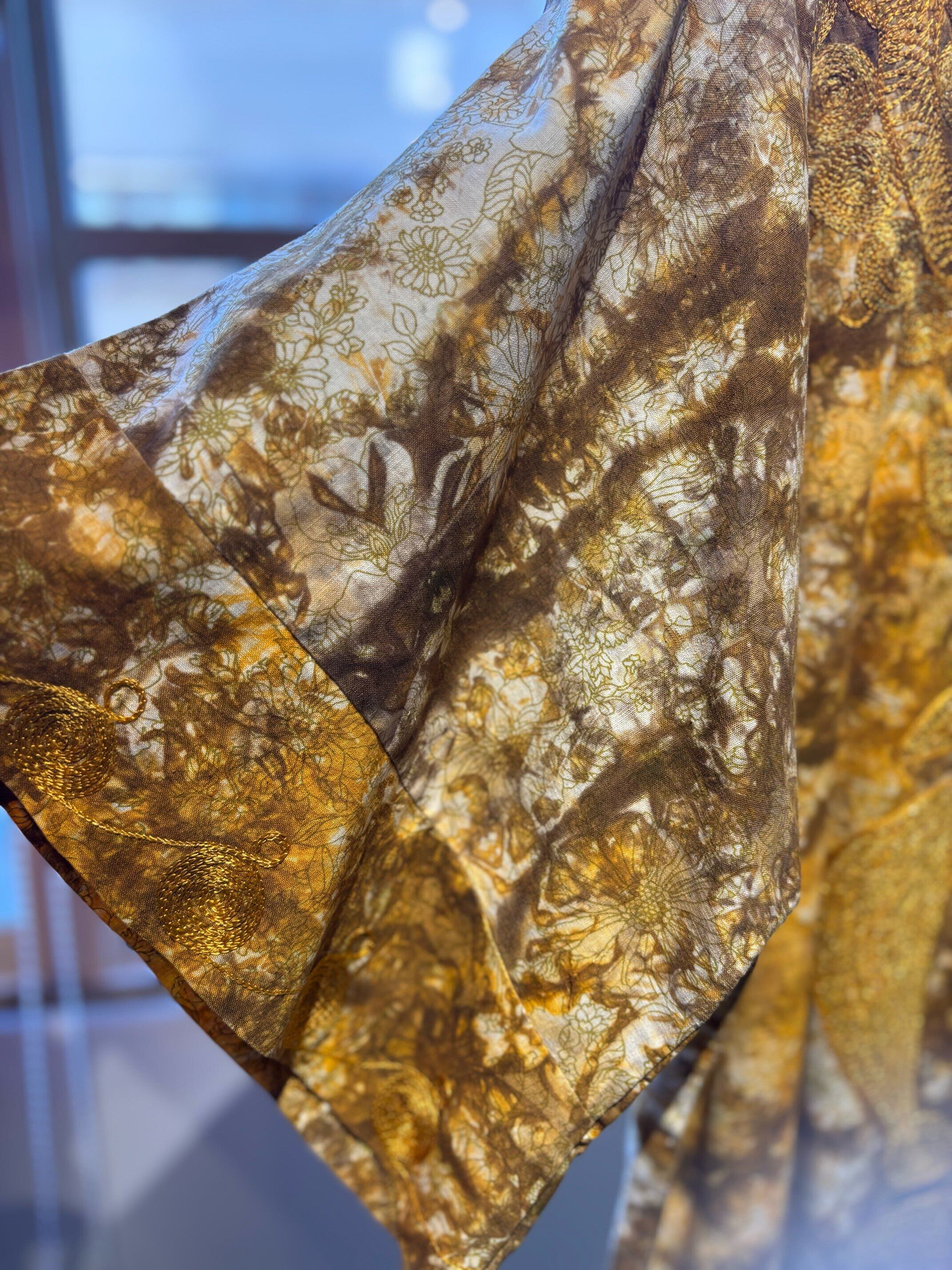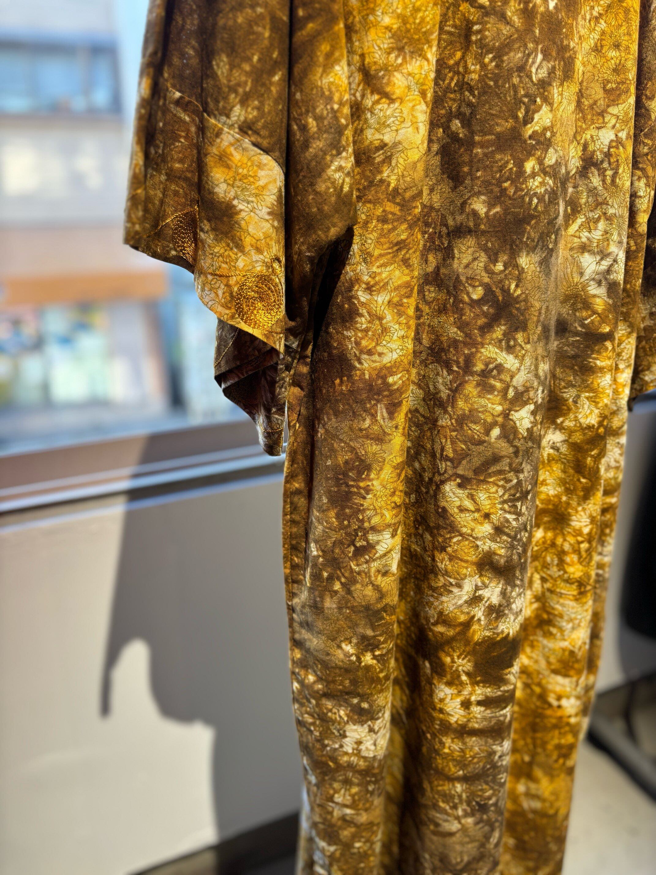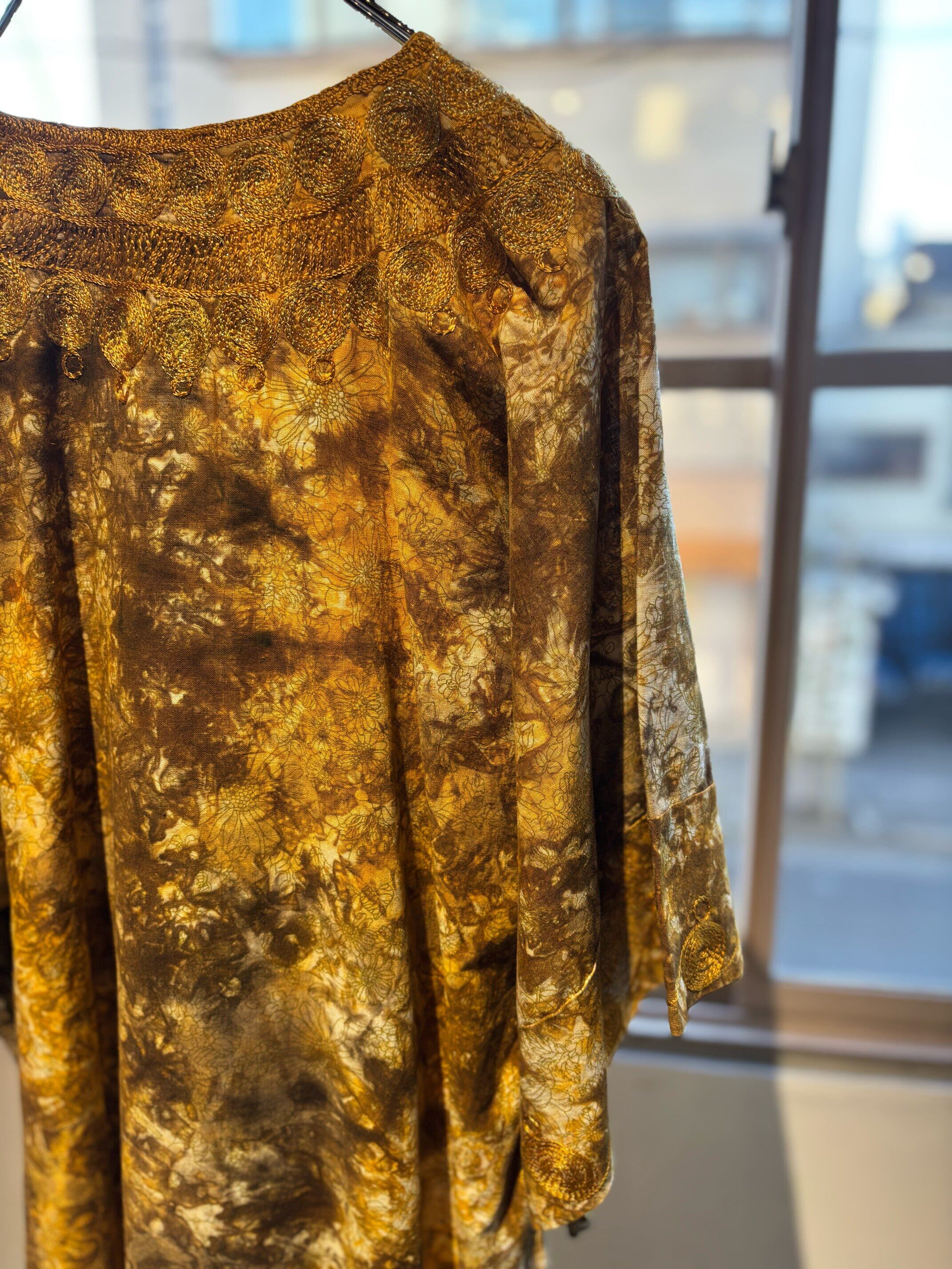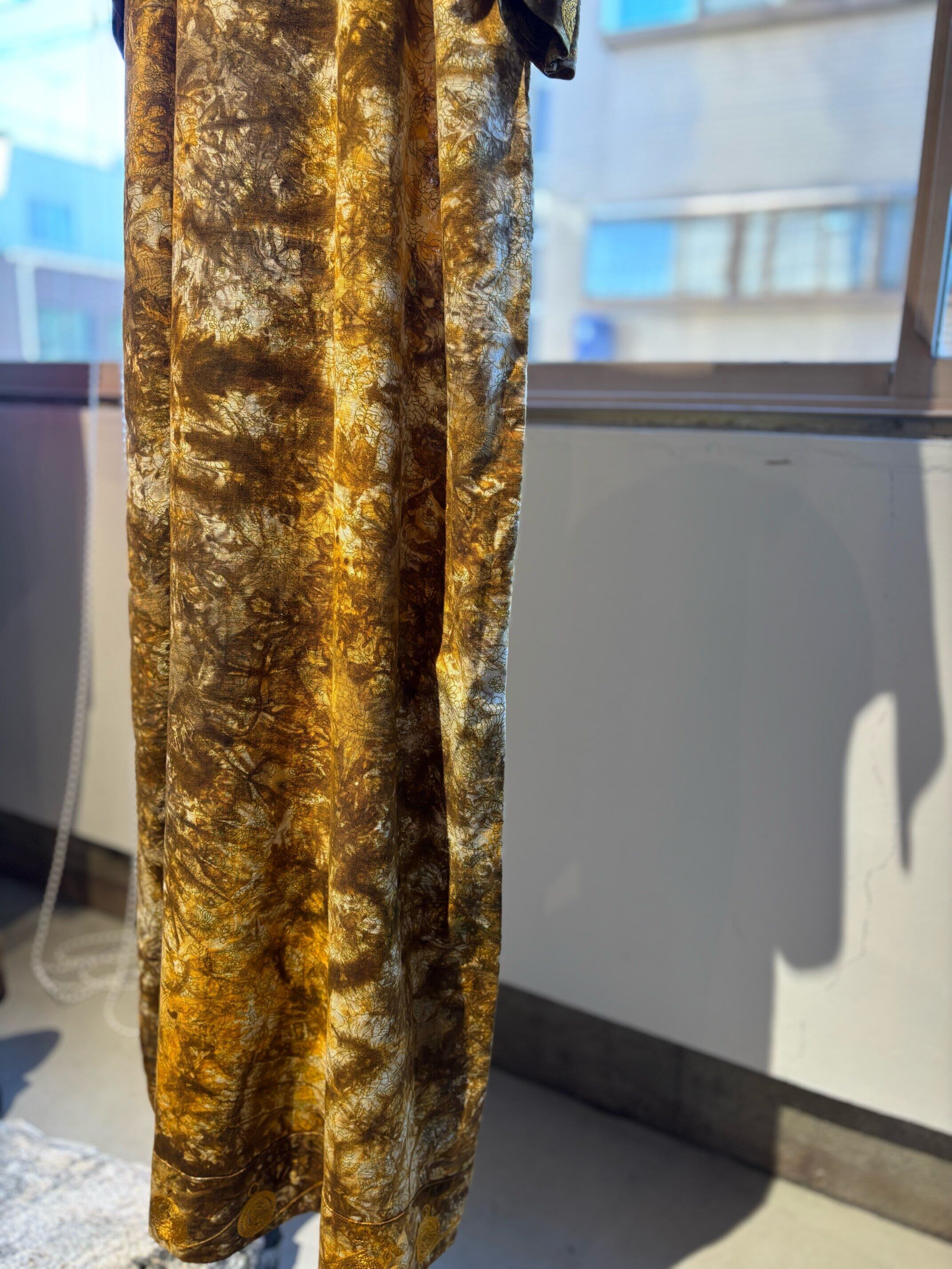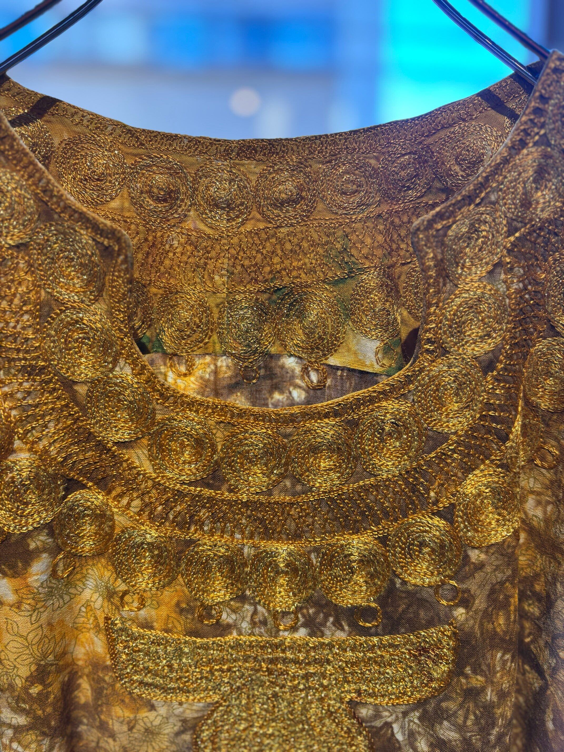 パキスタンのヴィンテージドレス、圧巻の刺繍が胸や袖、裾周り、首元までびっしりと縫われています。とんでもない刺繍です。ボディはコットンだと思いますが、薄い花柄にタイダイのような色がのせられ、全体がイエロー〜ブラウンのカラーリングでとても綺麗です。