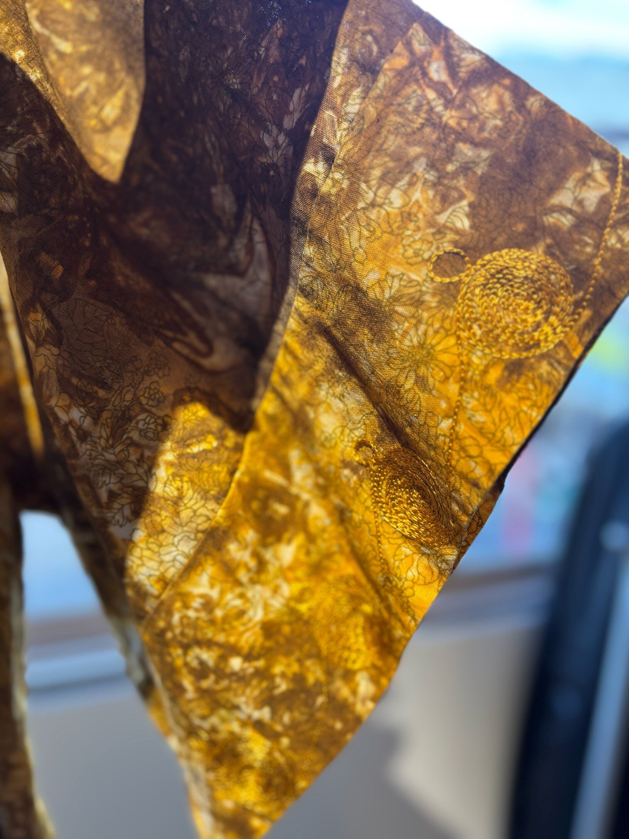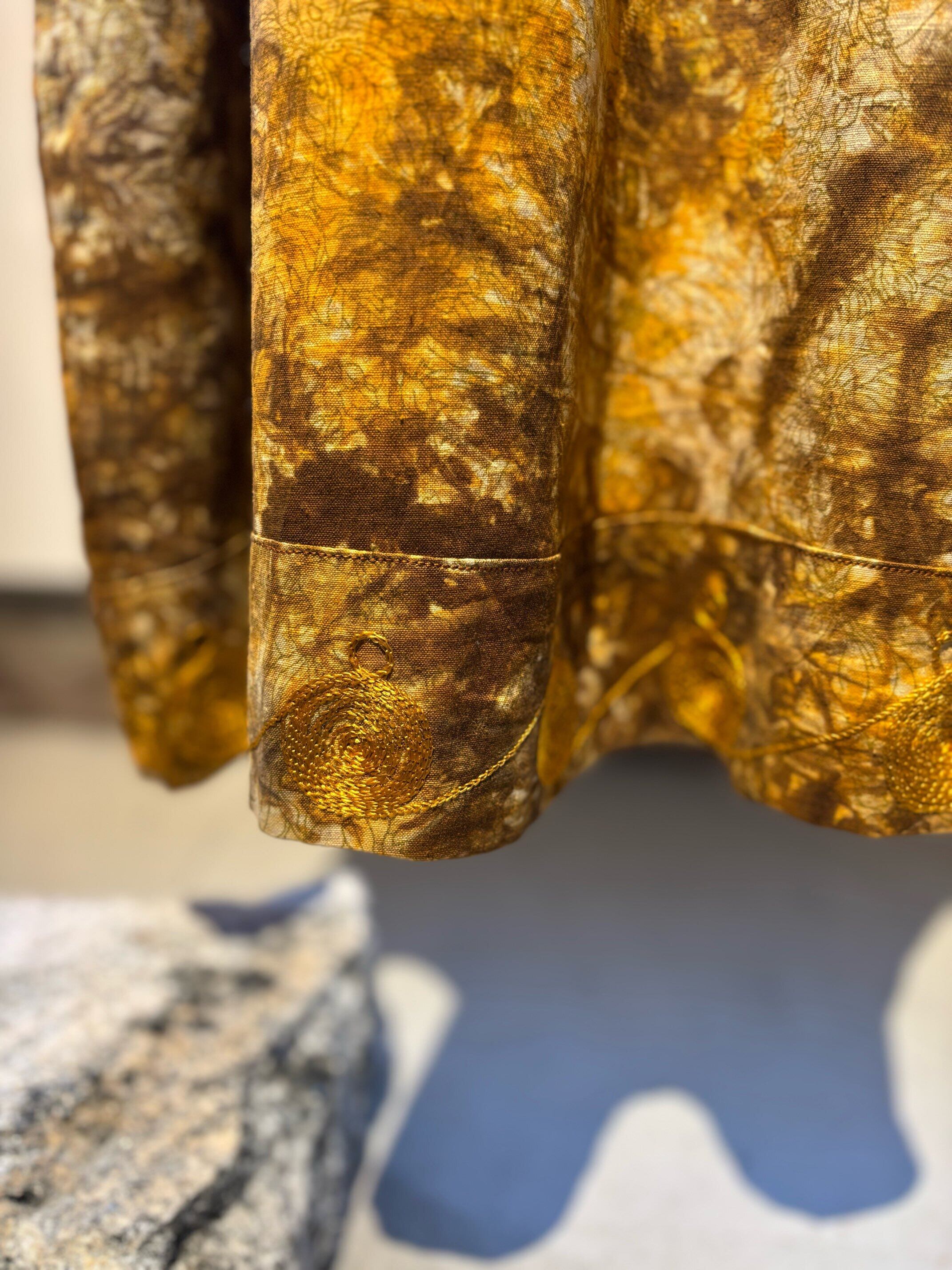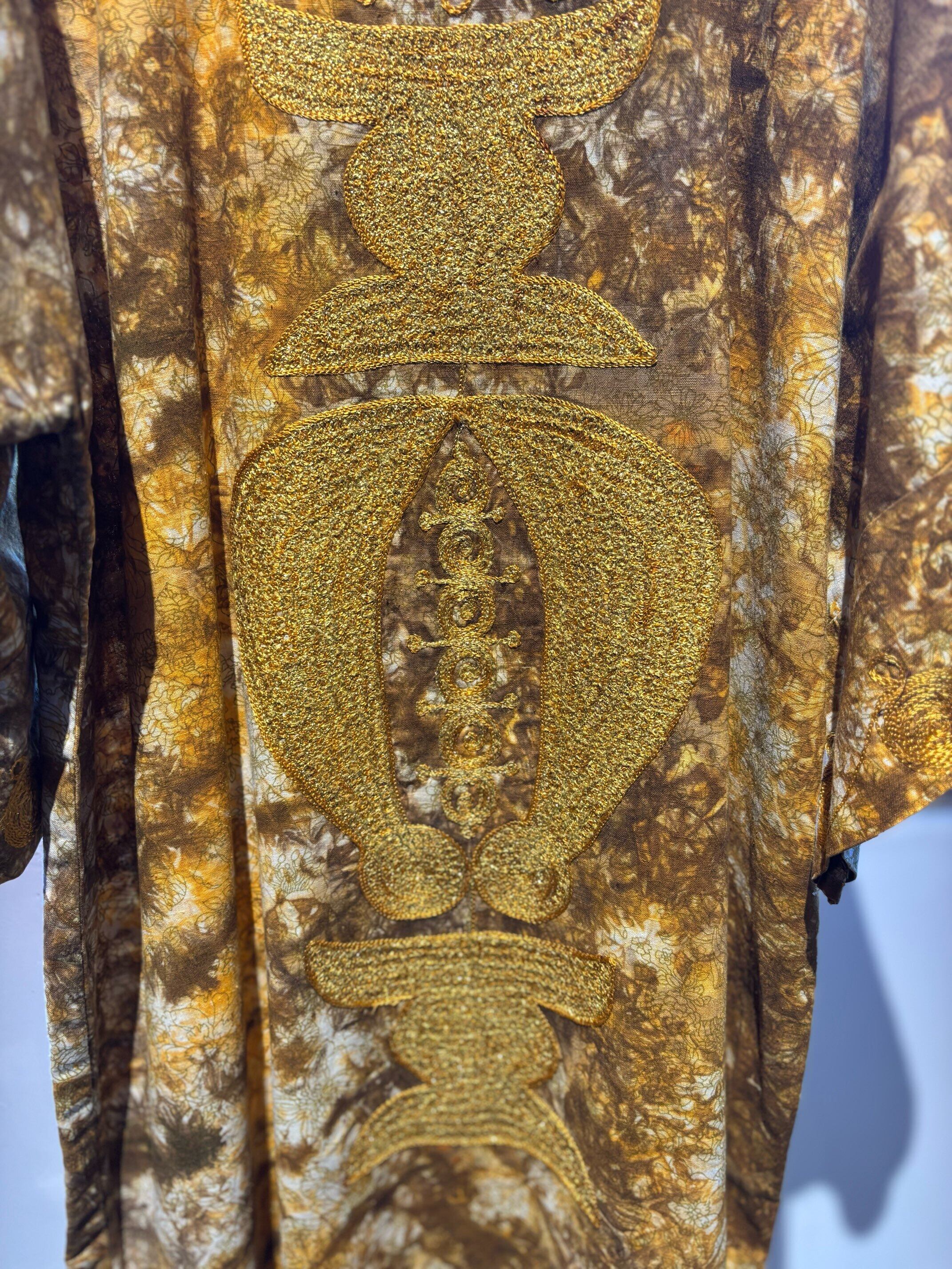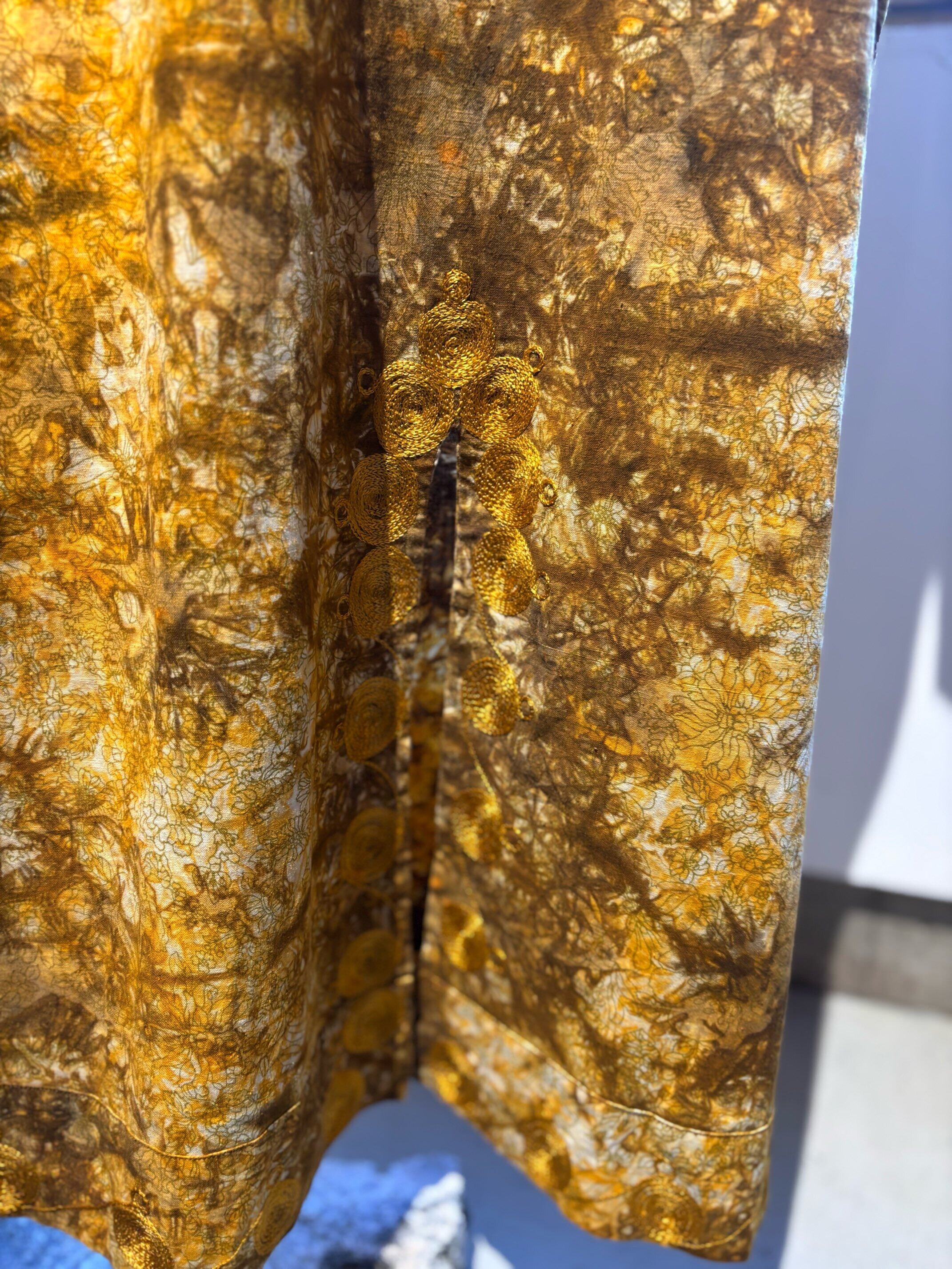パキスタンのヴィンテージドレス、圧巻の刺繍が胸や袖、裾周り、首元までびっしりと縫われています。とんでもない刺繍です。ボディはコットンだと思いますが、薄い花柄にタイダイのような色がのせられ、全体がイエロー〜ブラウンのカラーリングでとても綺麗です。