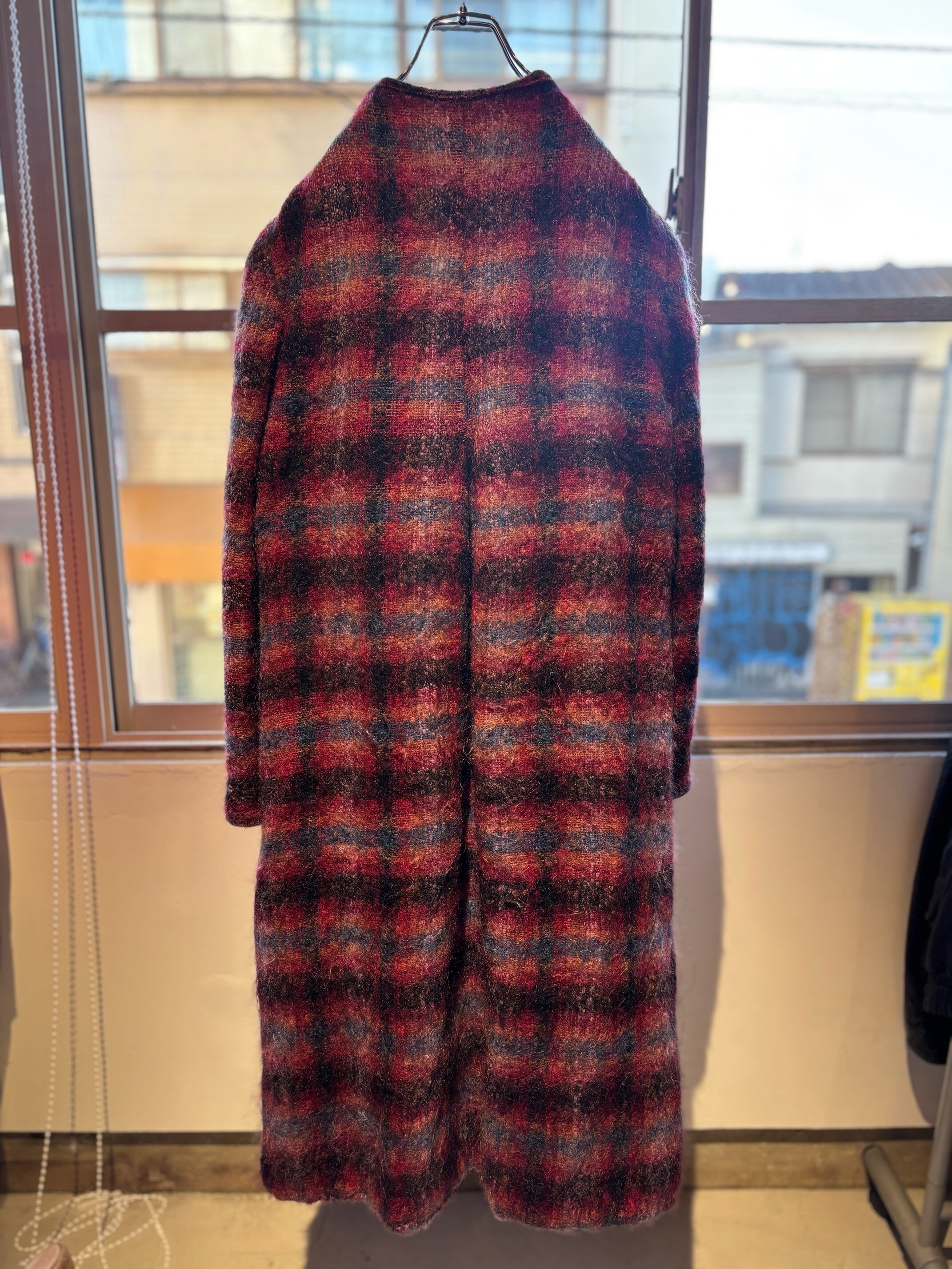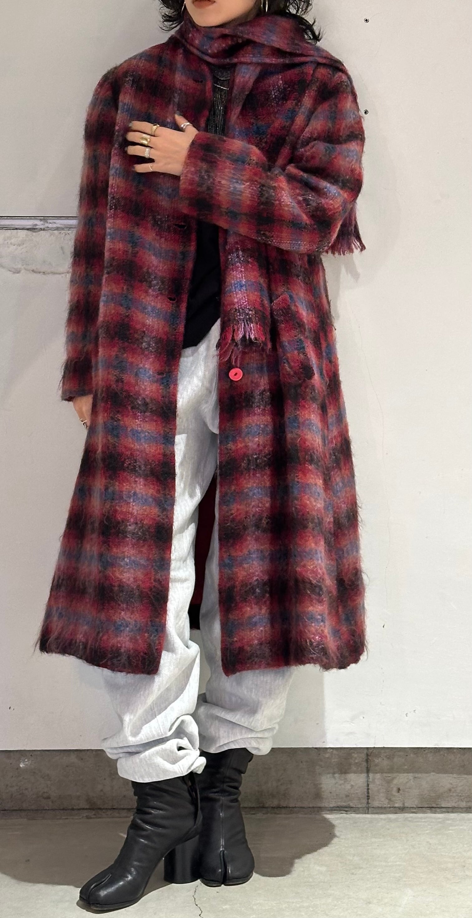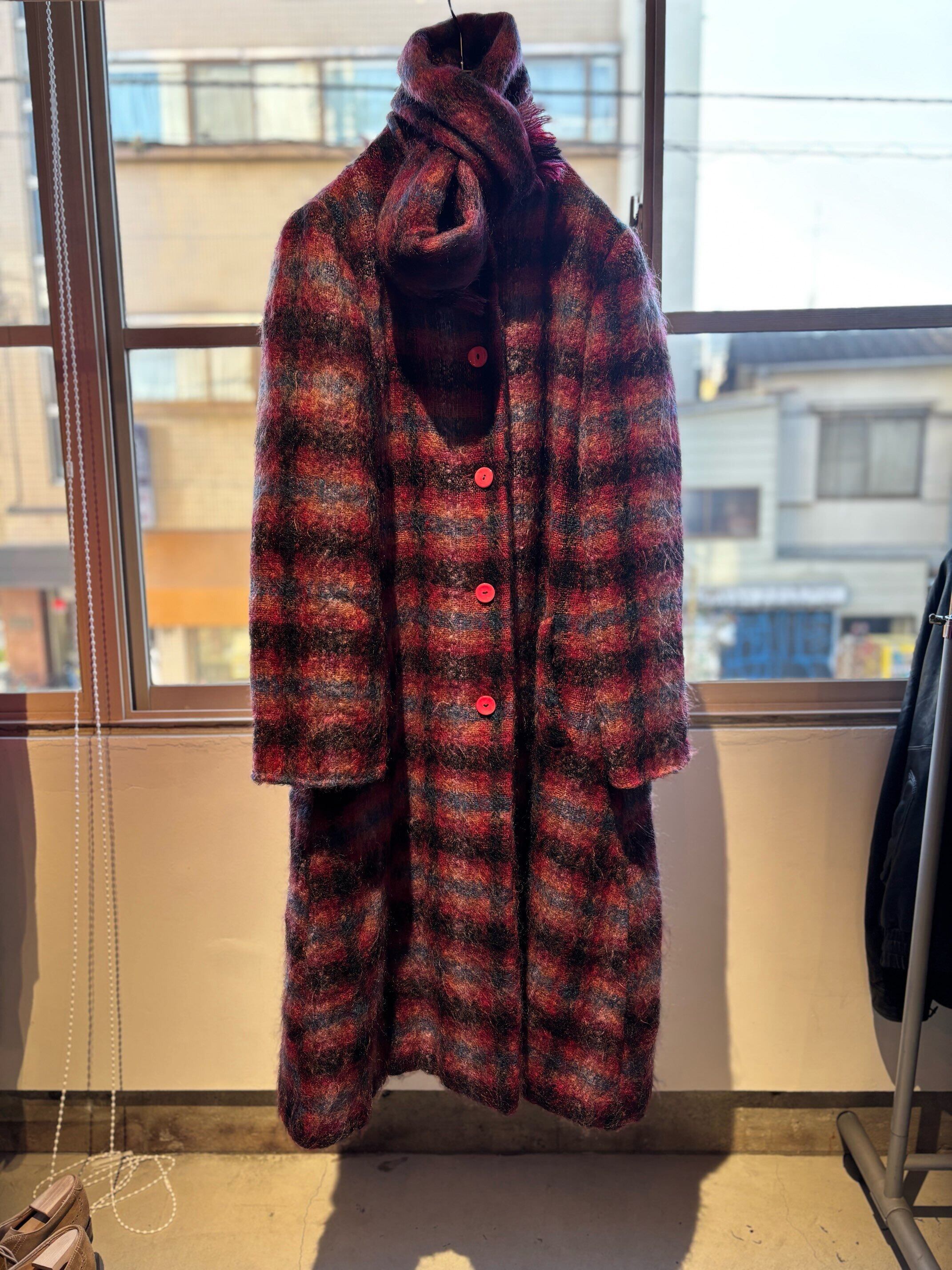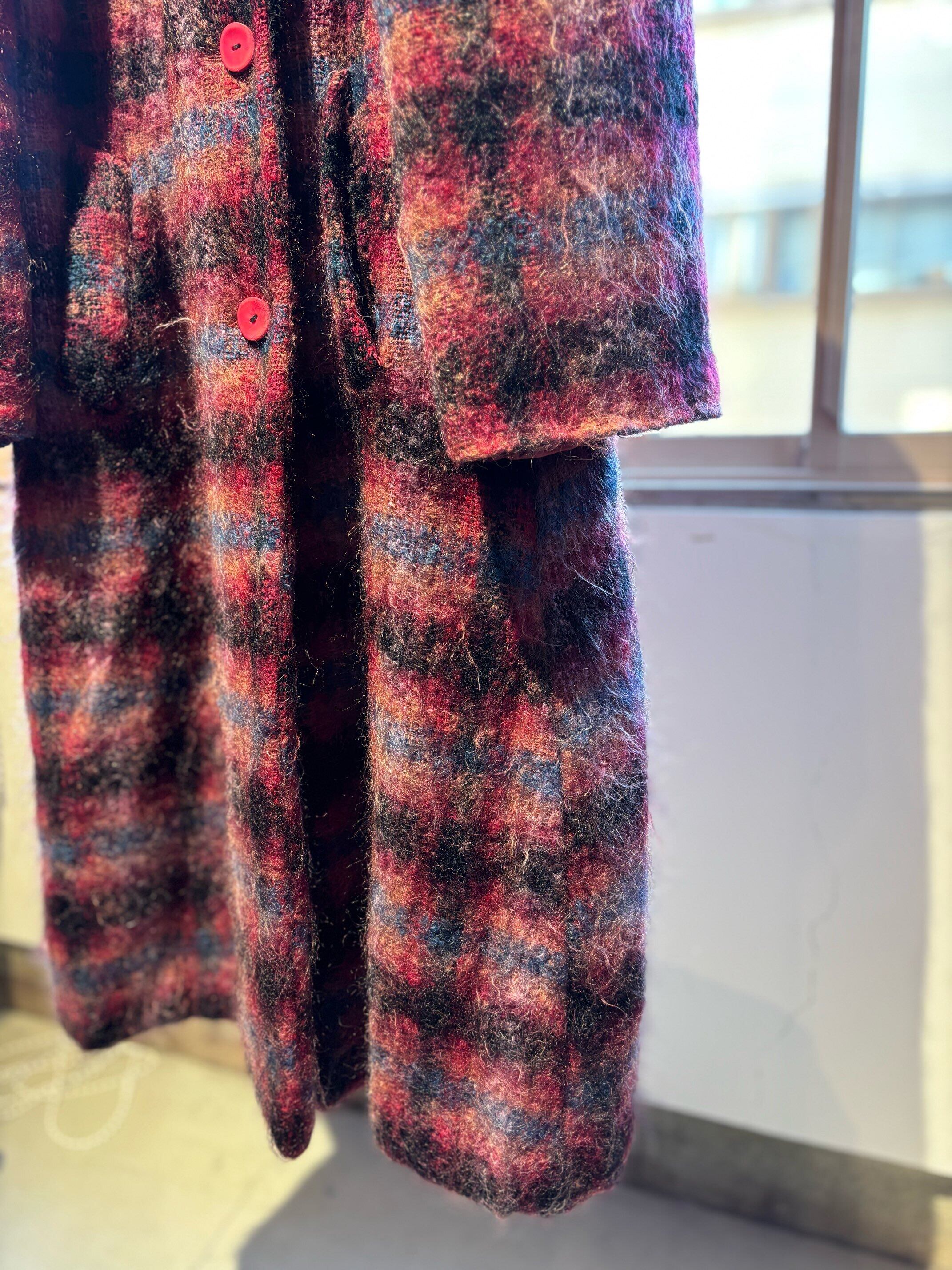 モヘア独特の綺麗な発色のコートで、ピンクとボルドーを混ぜたようなレッドにブラック、ブルーのシャドーチェックが入るロングコートです。