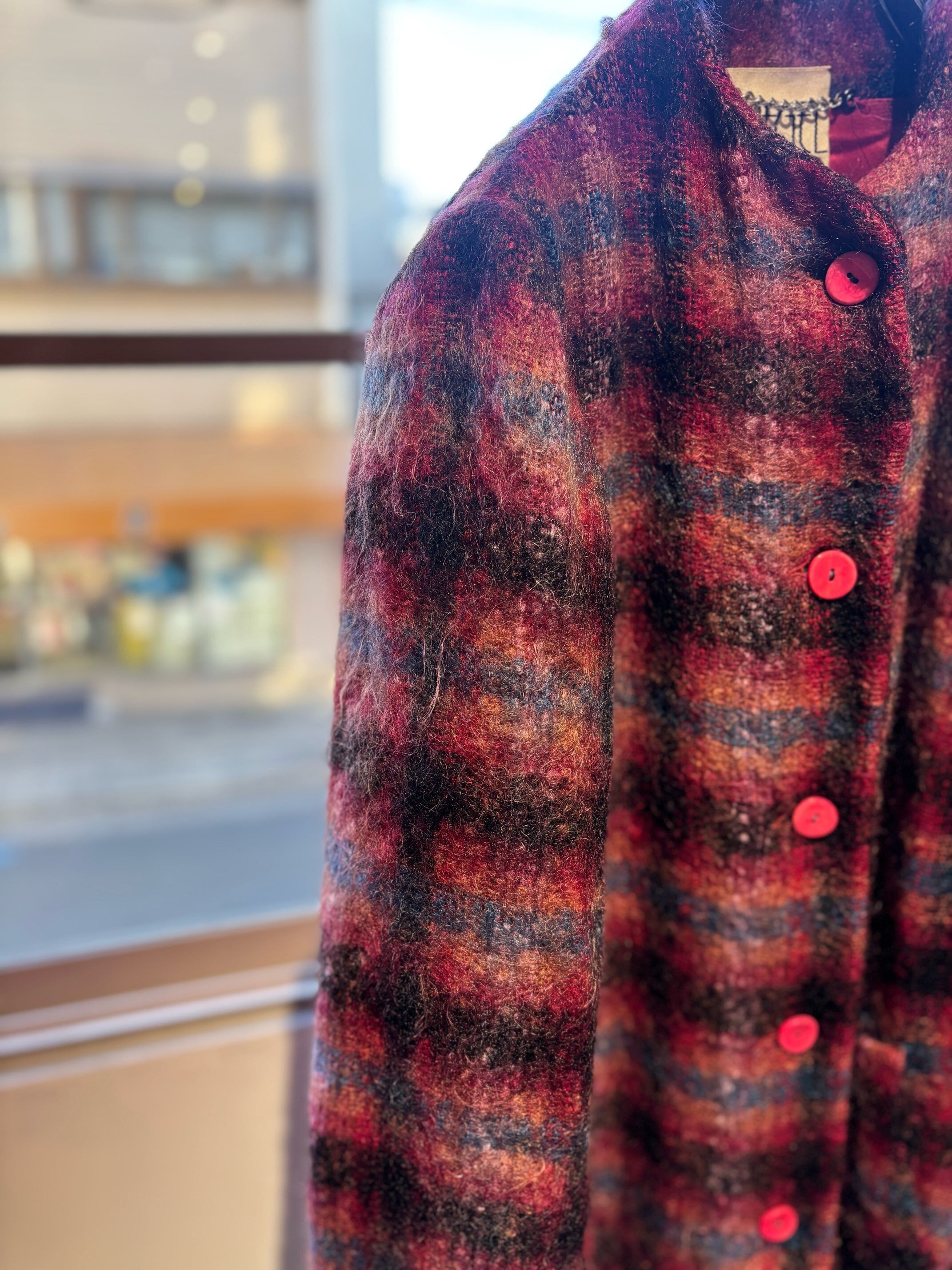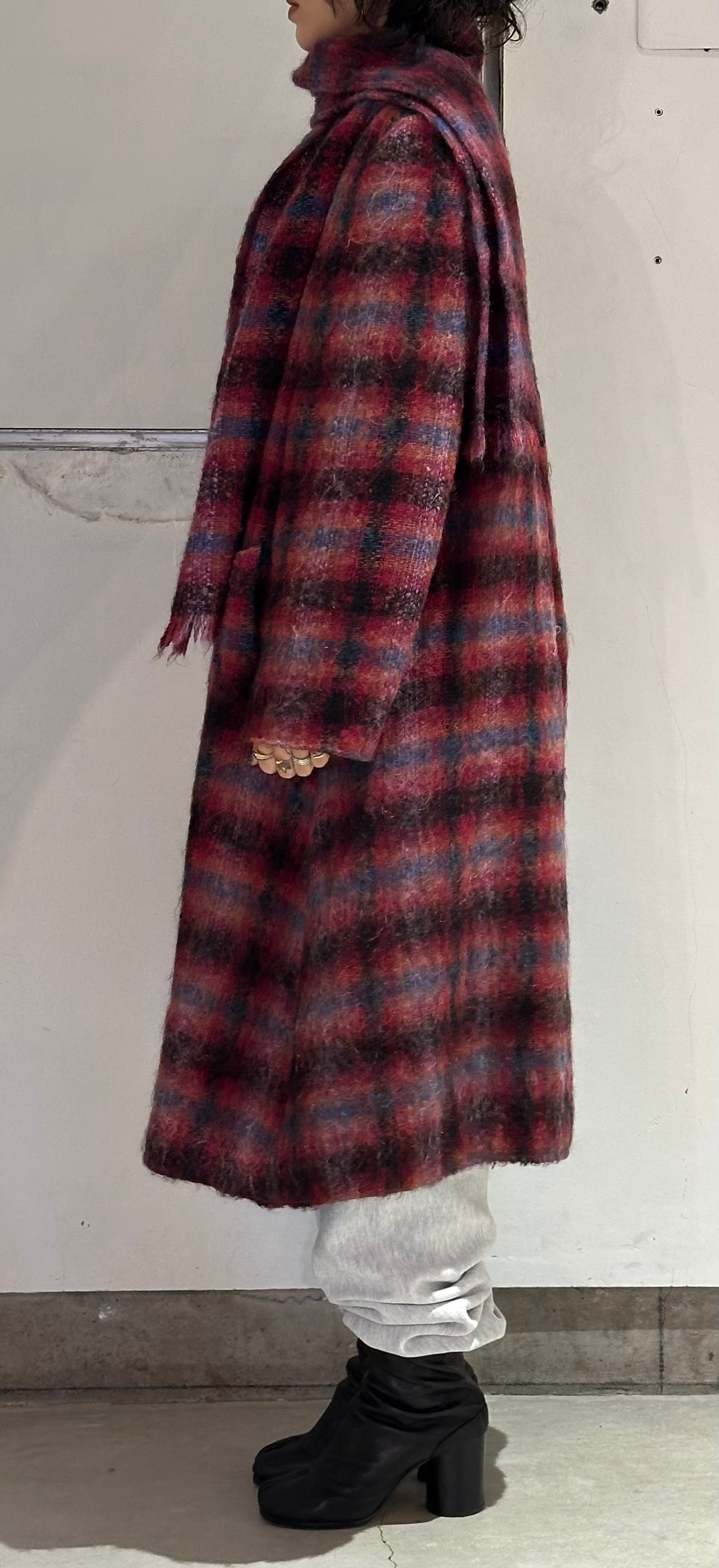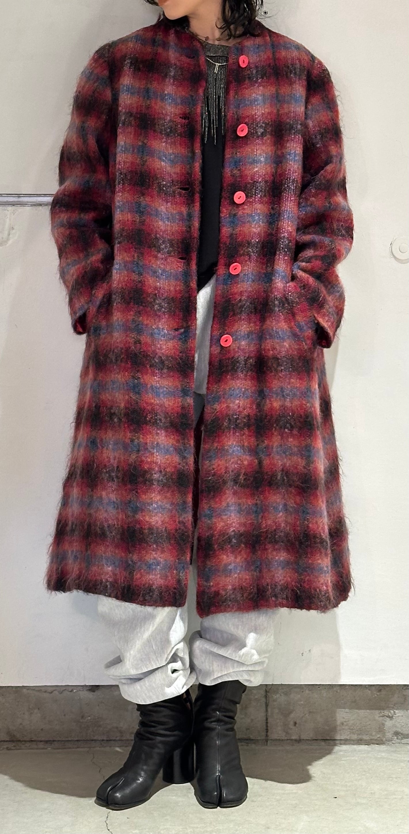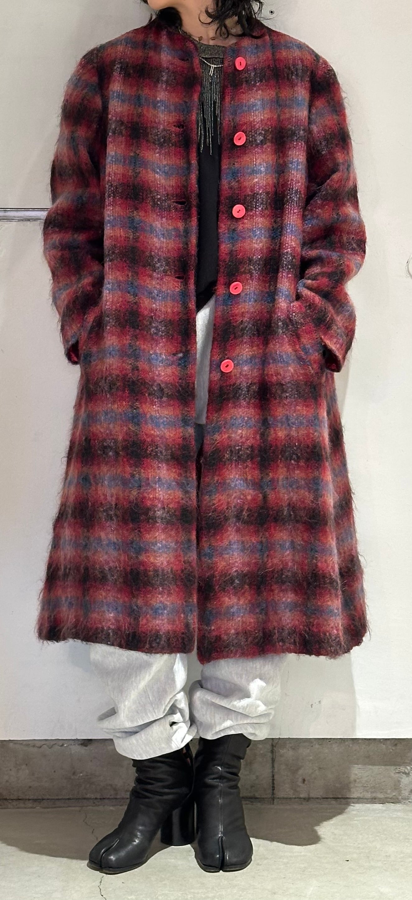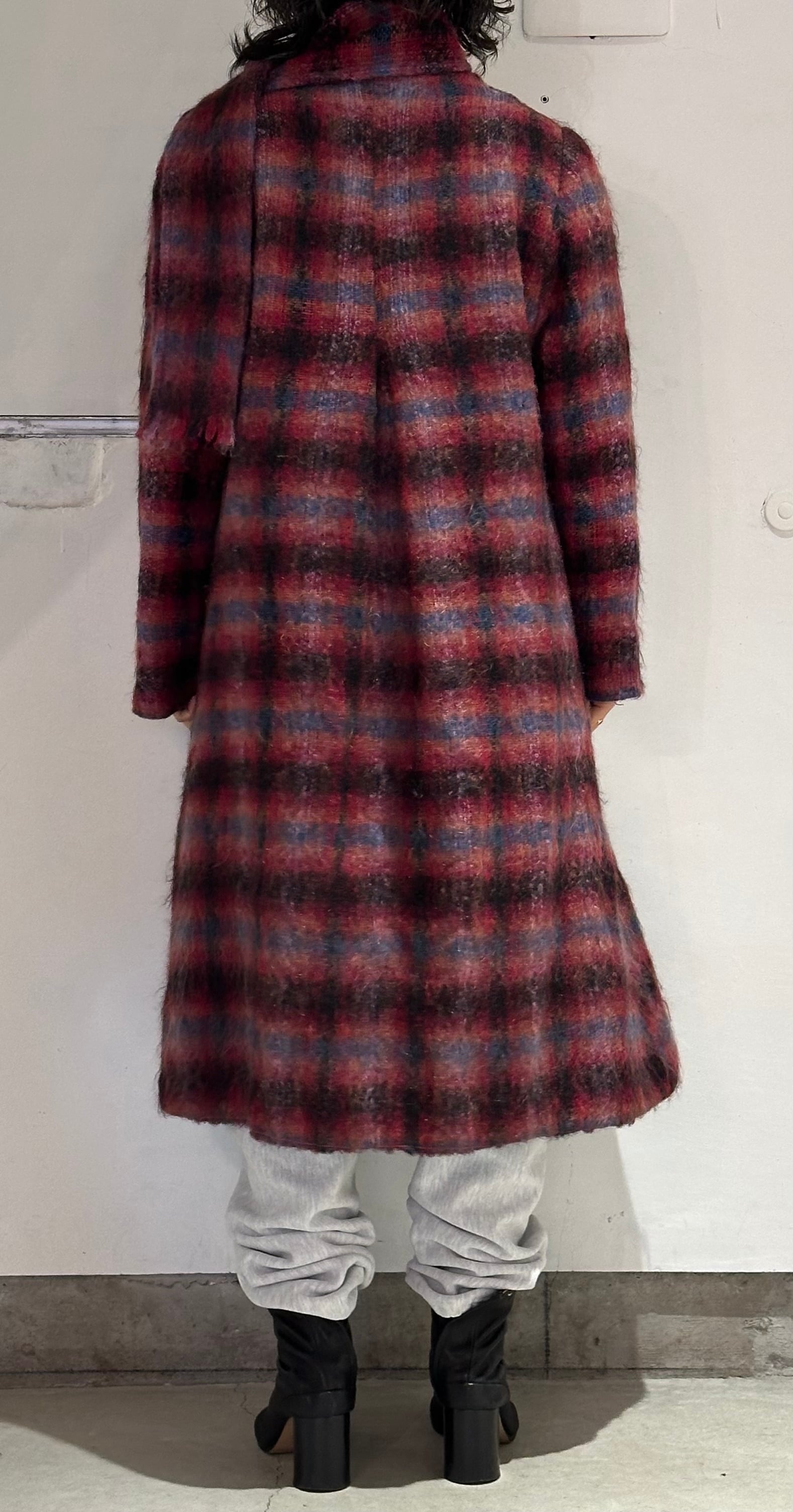 モヘア独特の綺麗な発色のコートで、ピンクとボルドーを混ぜたようなレッドにブラック、ブルーのシャドーチェックが入るロングコートです。
