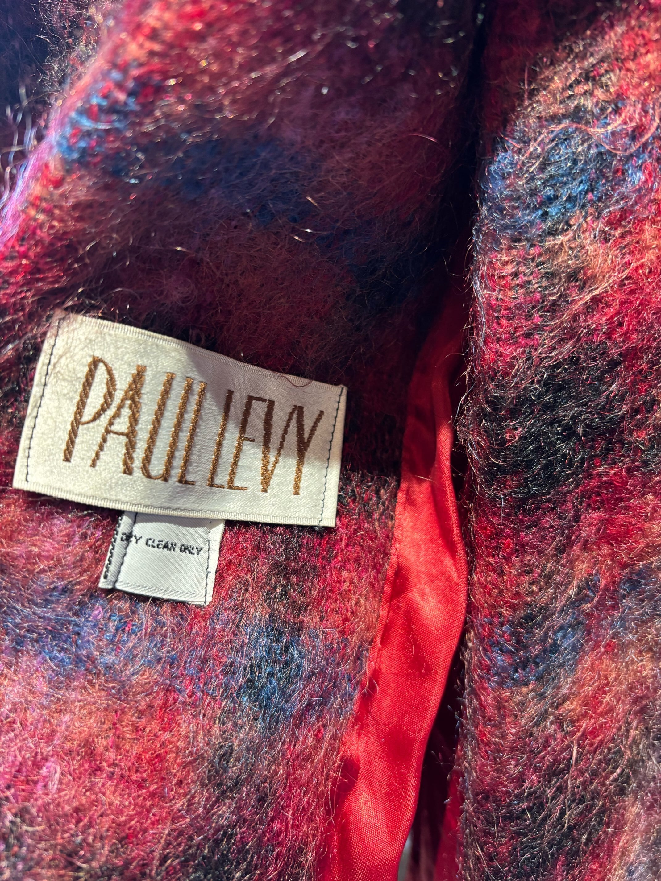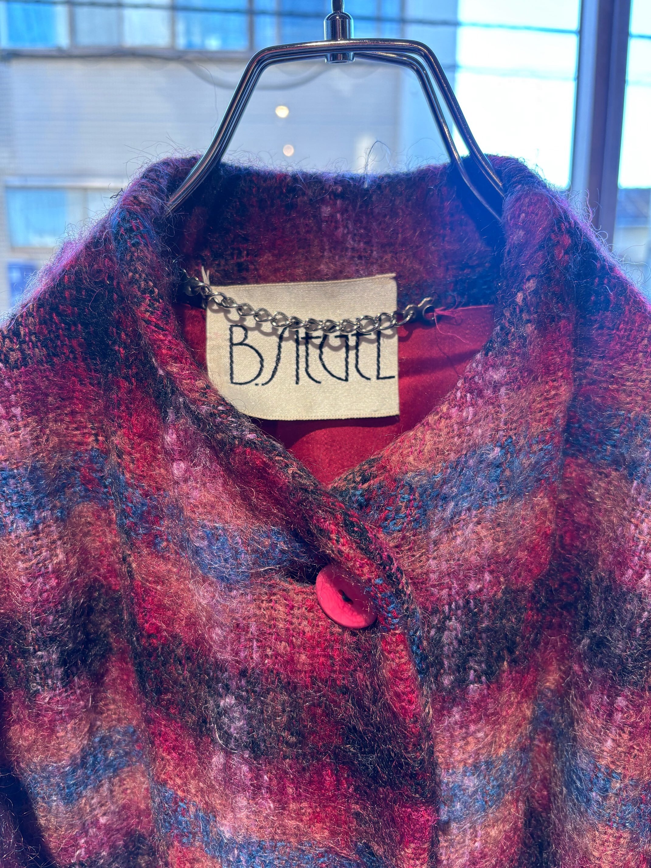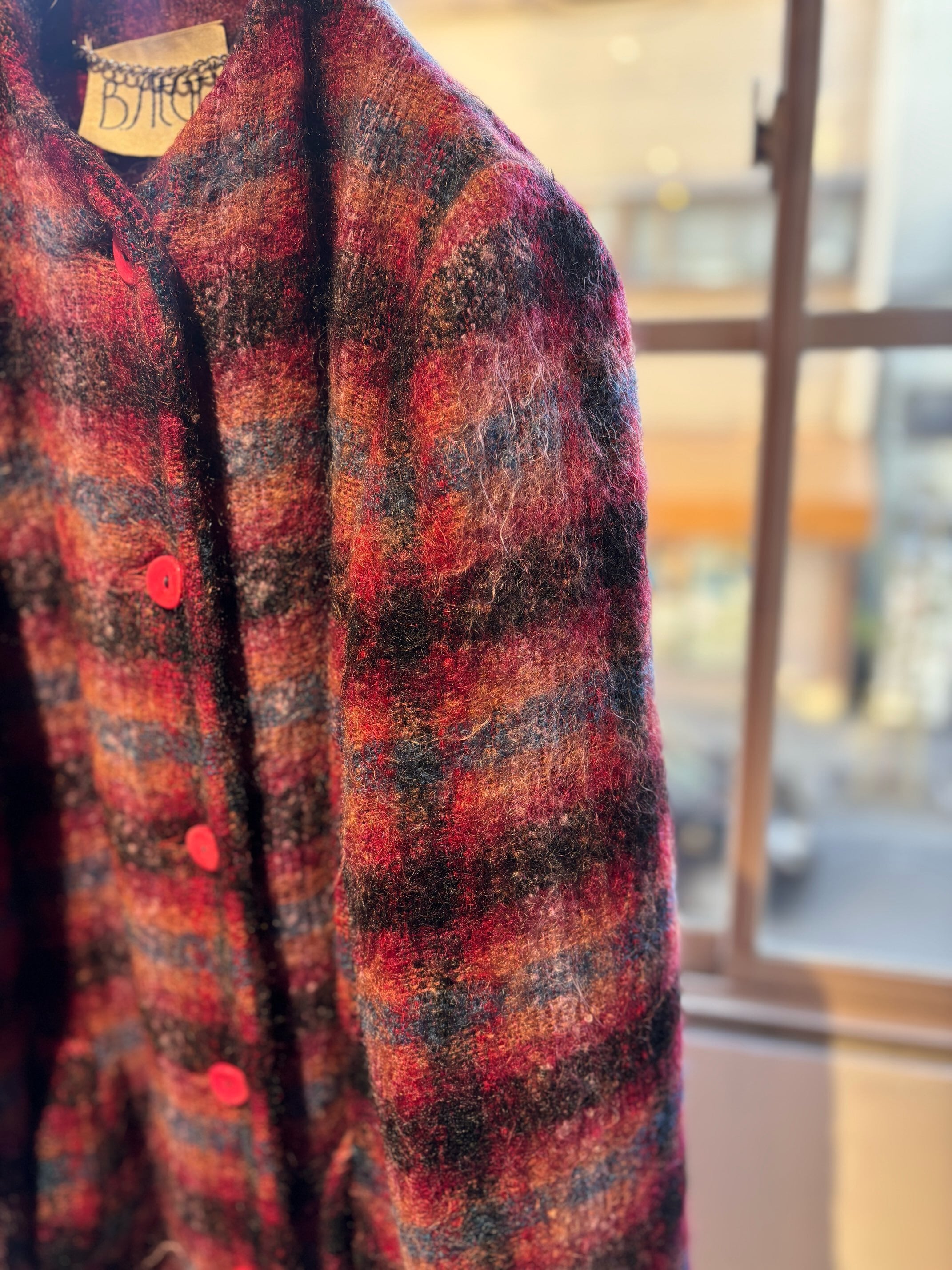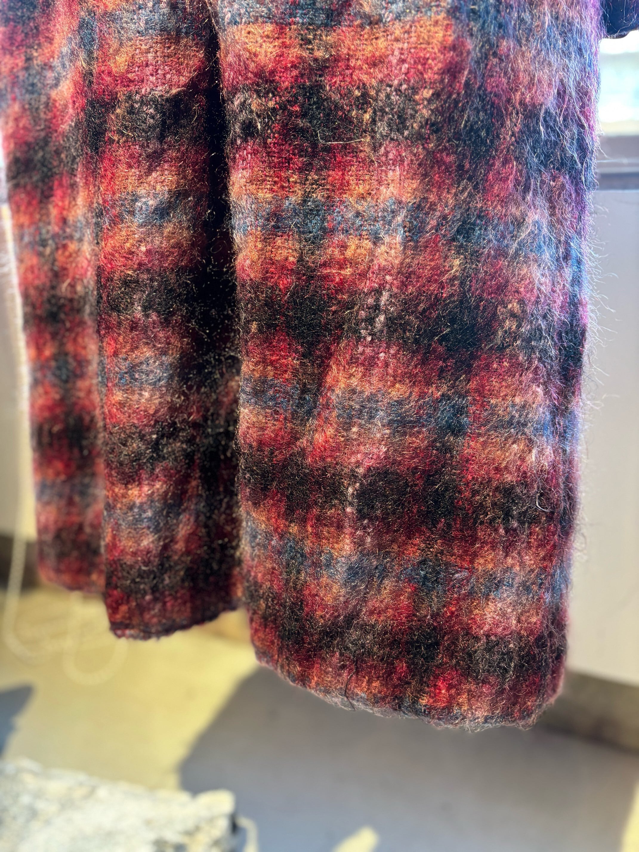 モヘア独特の綺麗な発色のコートで、ピンクとボルドーを混ぜたようなレッドにブラック、ブルーのシャドーチェックが入るロングコートです。