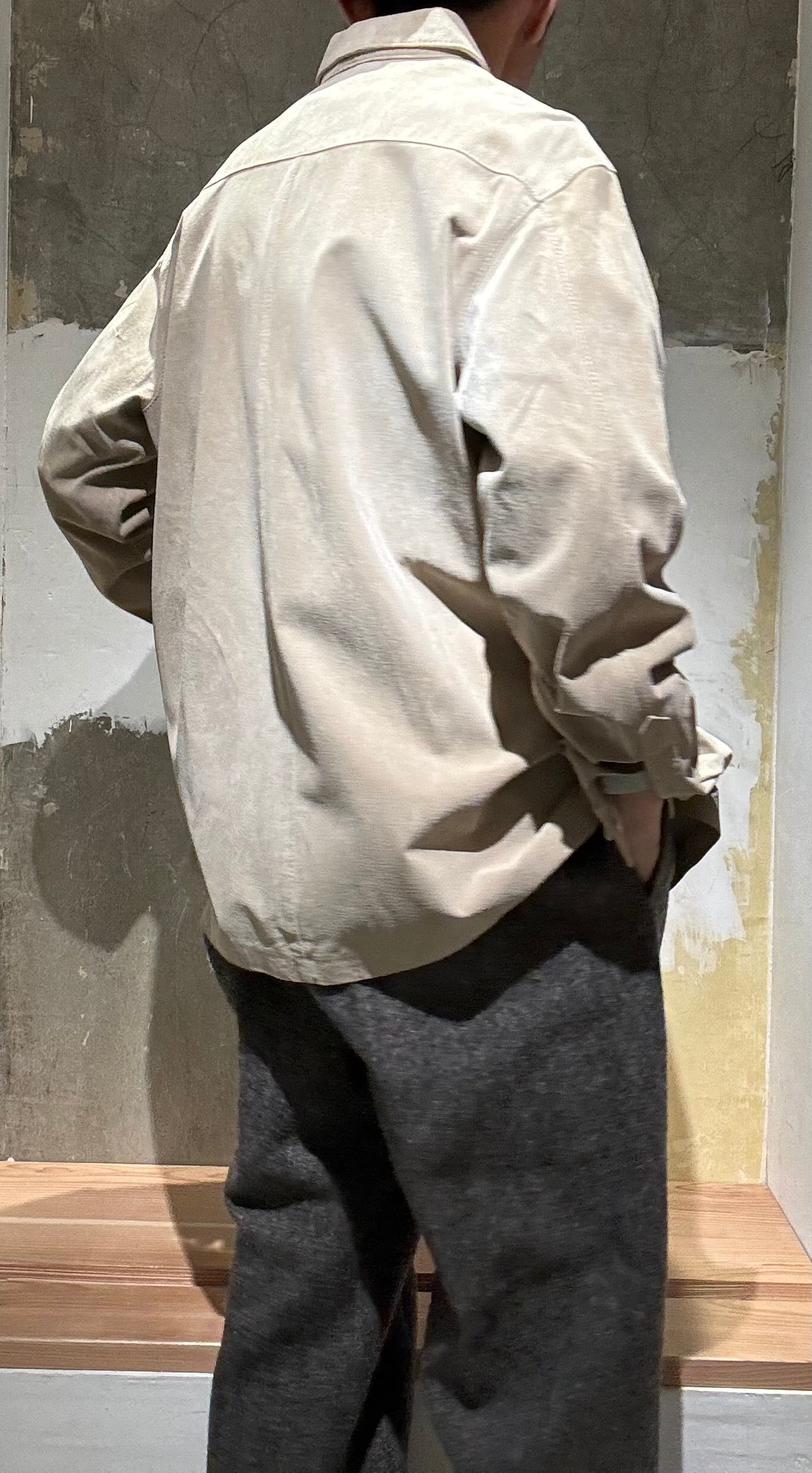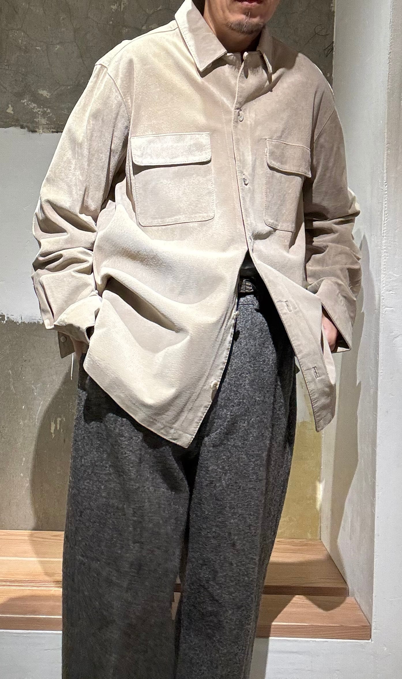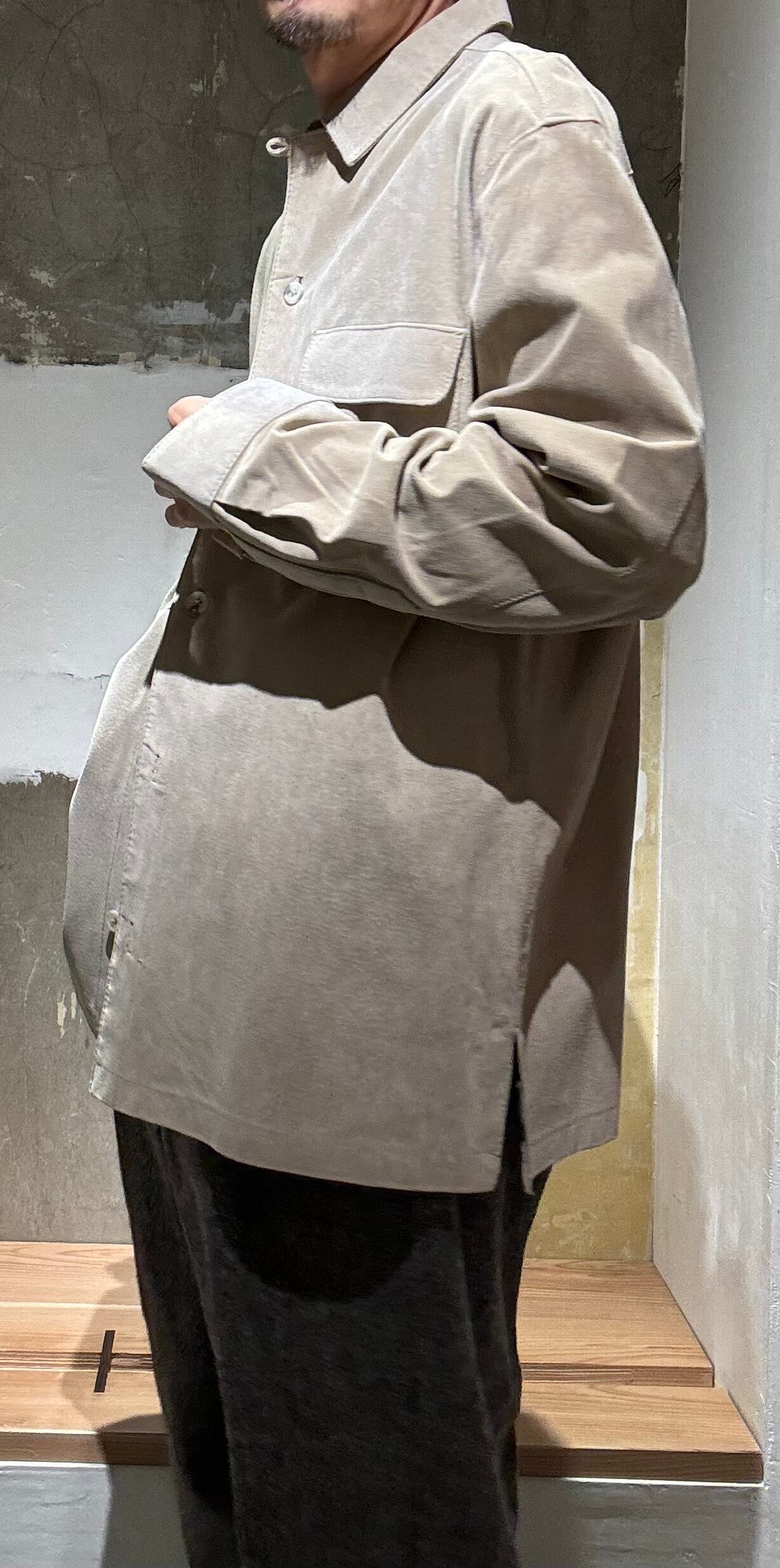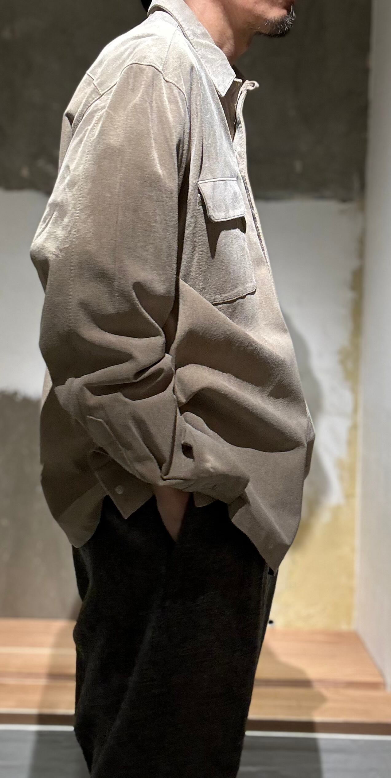 とても上品なグレージュのようなカラーのスエードと珍しいループカラーシャツタイプの感じがどこかオーラリー感のあるシャツだと思い買い付けました。