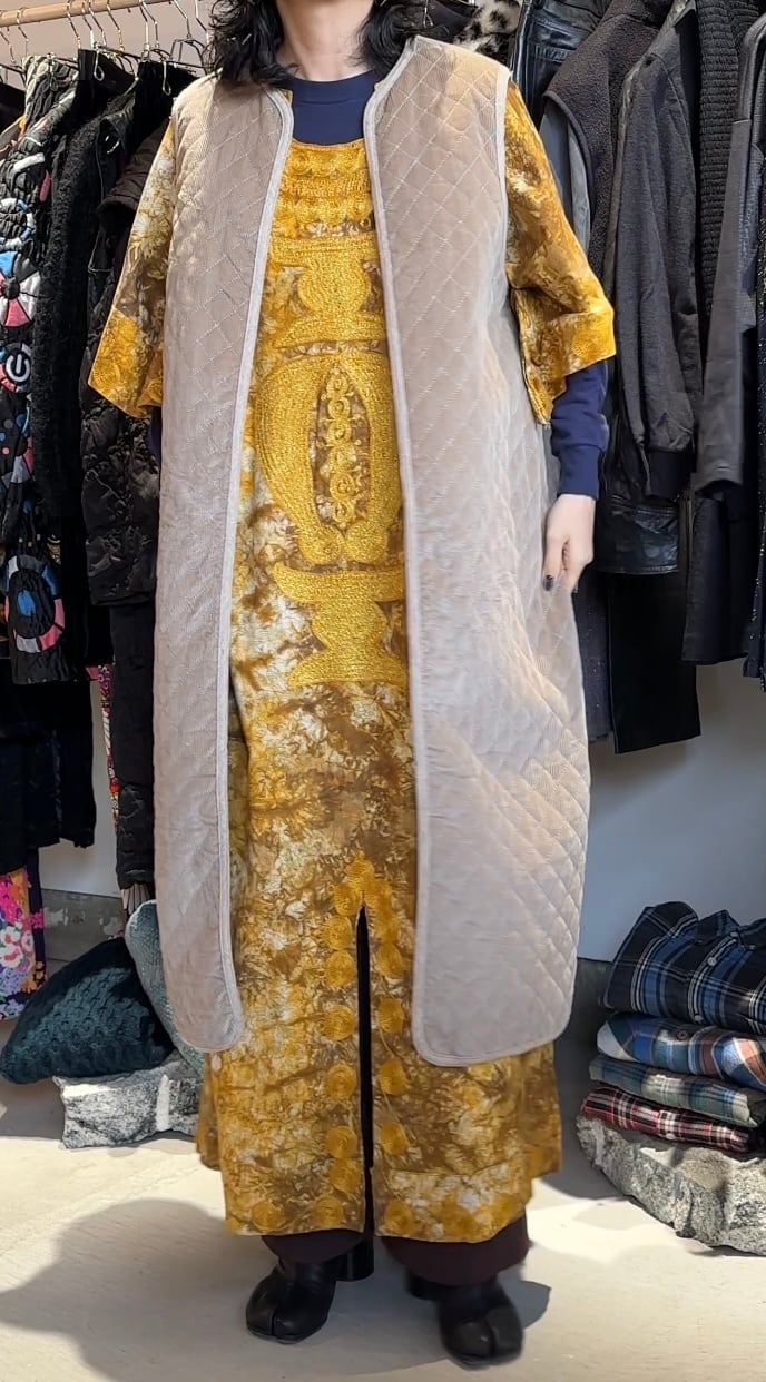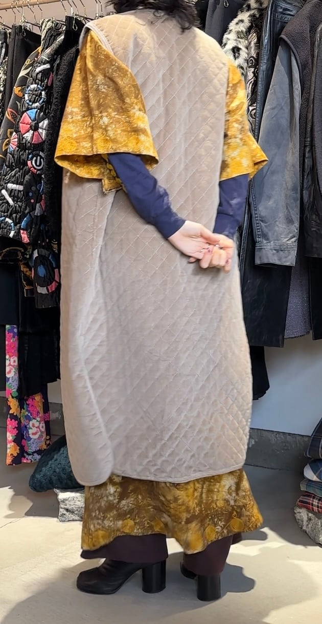 とても珍しい115㎝のロング丈のベストで脇幅も広く、オーバーベストとしても着られる設計になっています。薄手のロングコートや短丈のブルゾンなどの上から着たりする想定で着ると可愛いと思います。