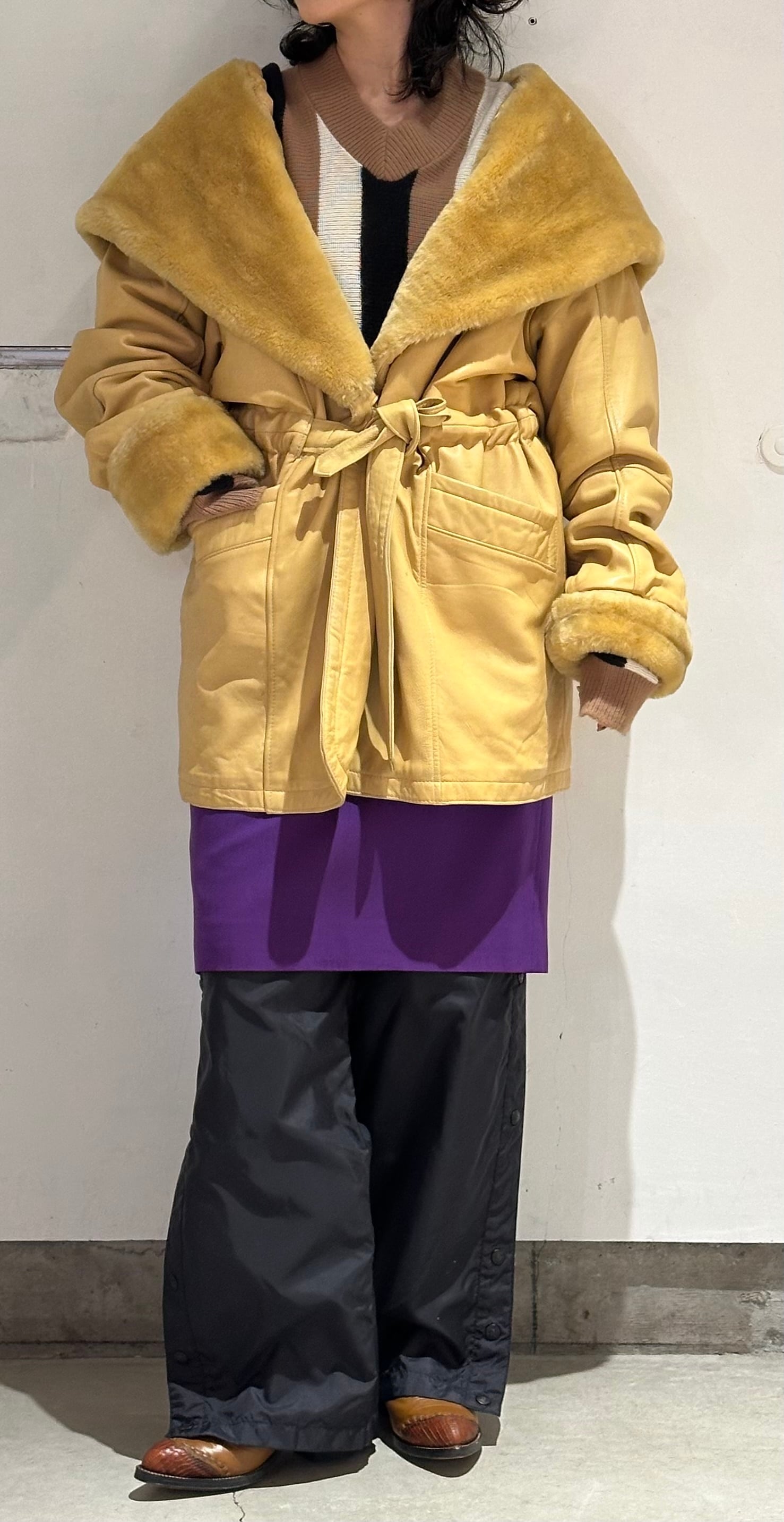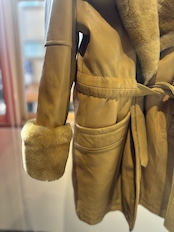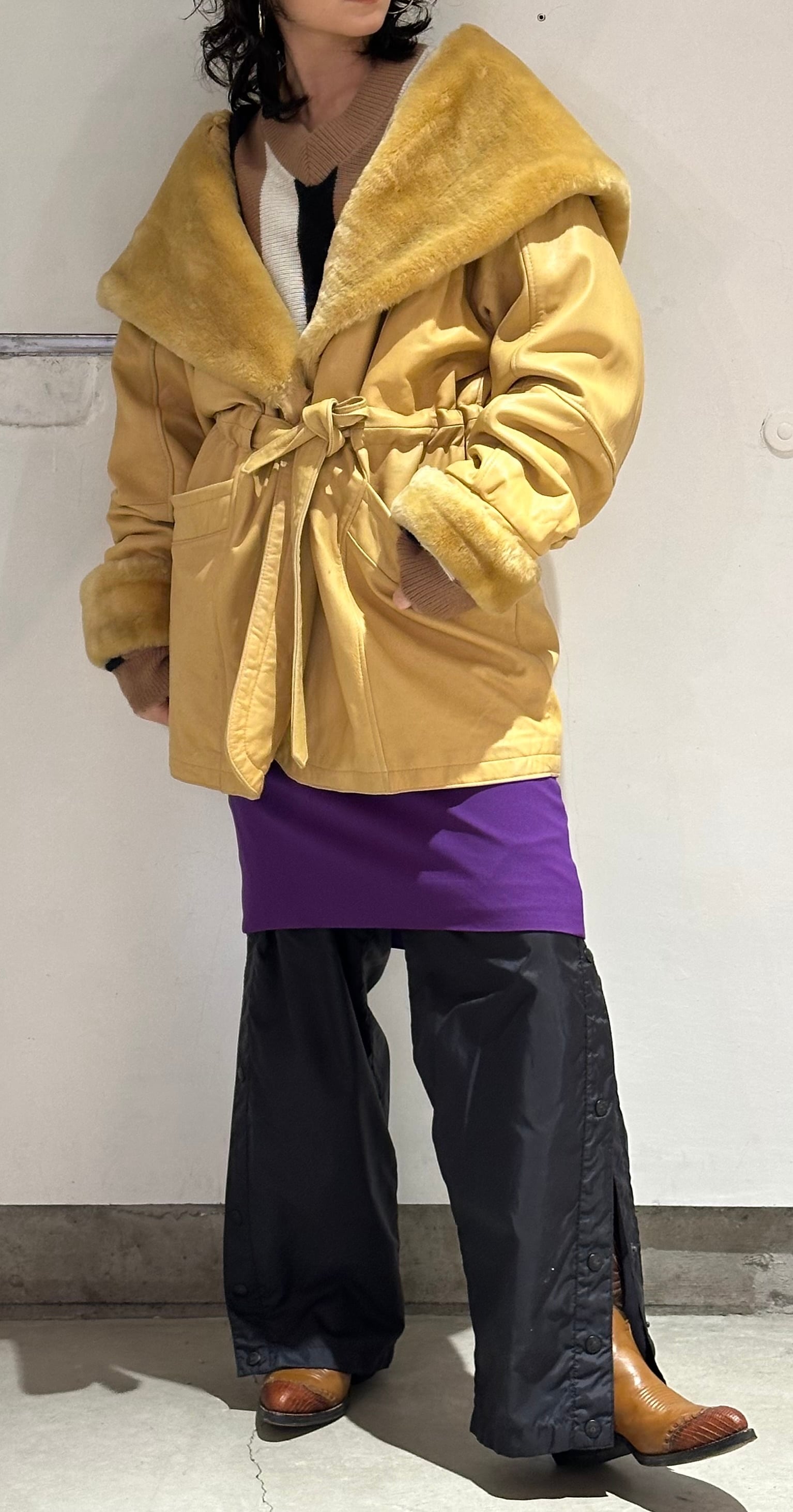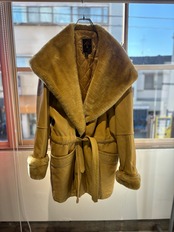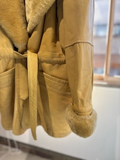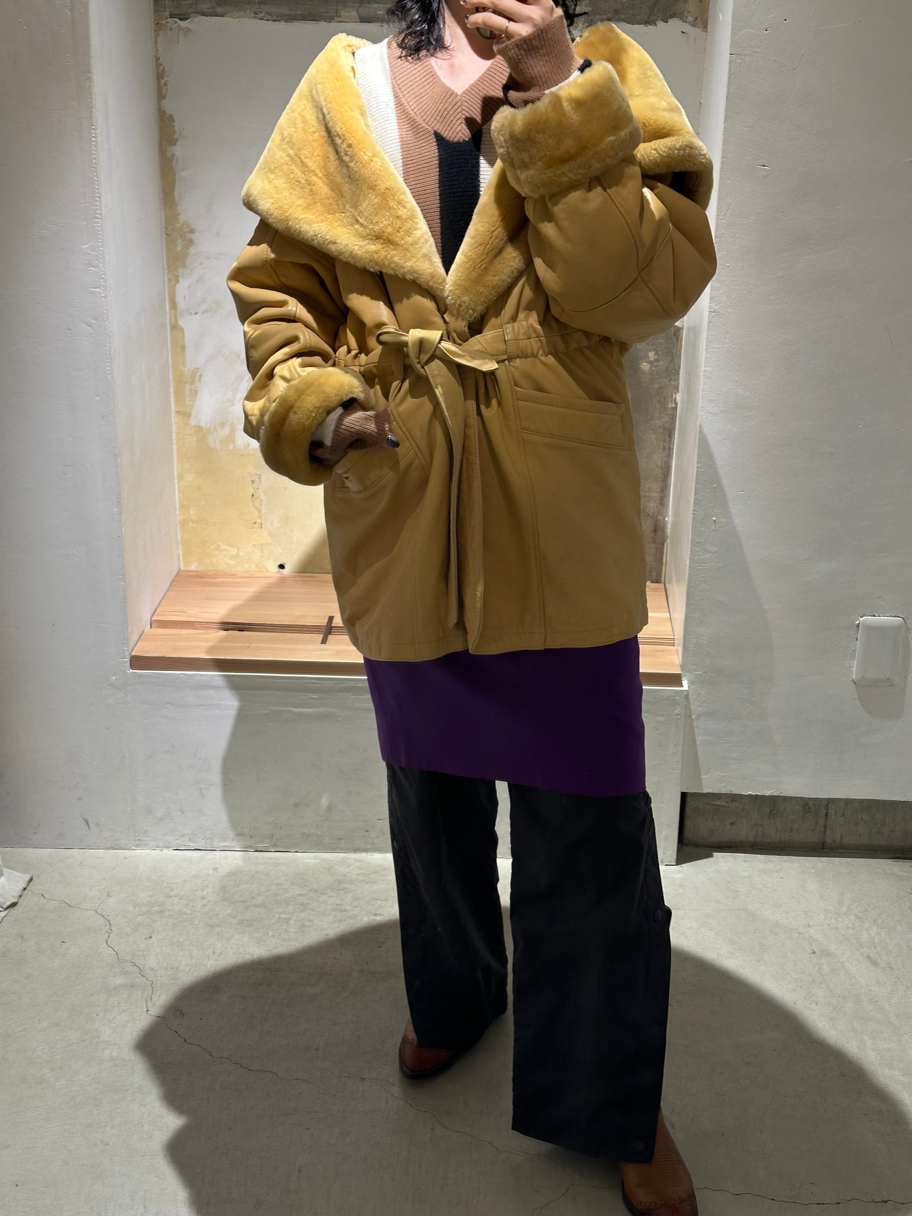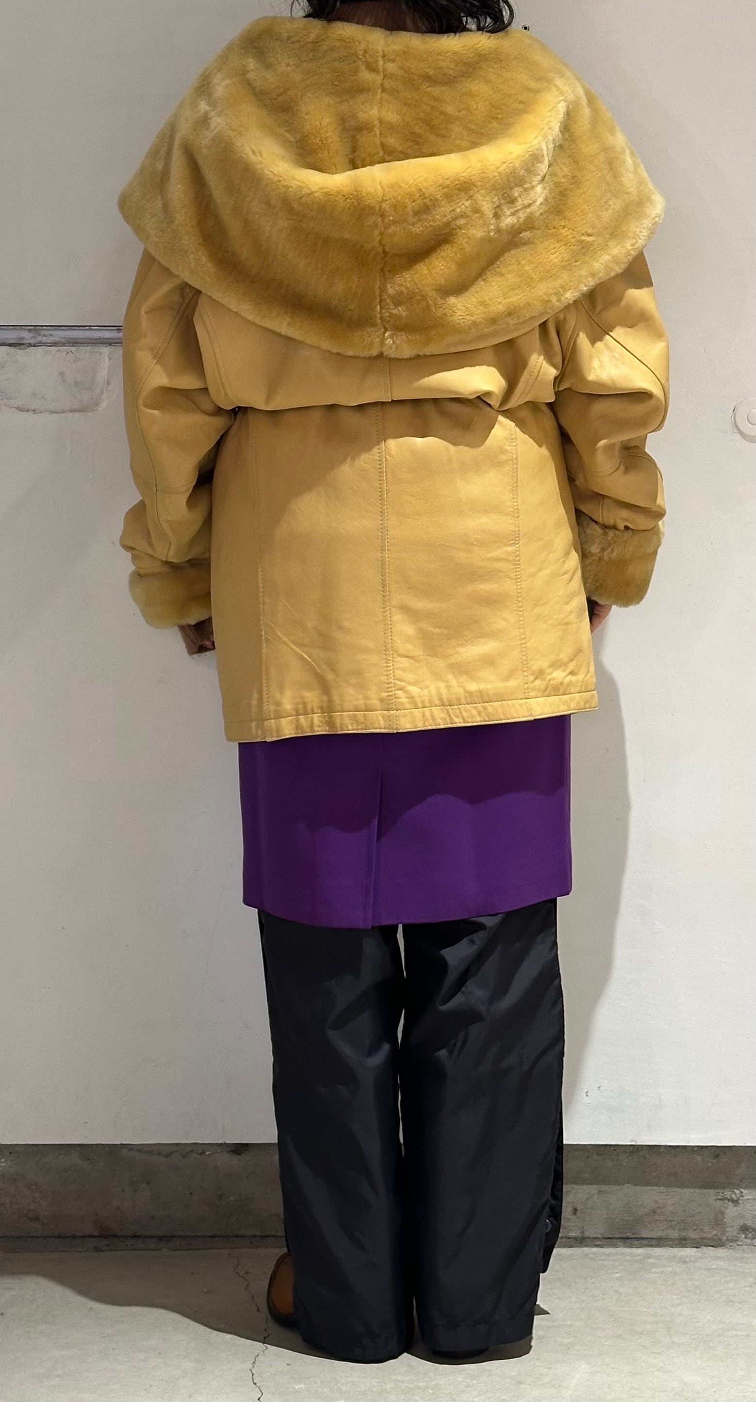 とても珍しいイエローのレザーに裏地キルティング、首元にはフェイクファーの大きなフードにもなる襟が付きとても暖かいコートです。