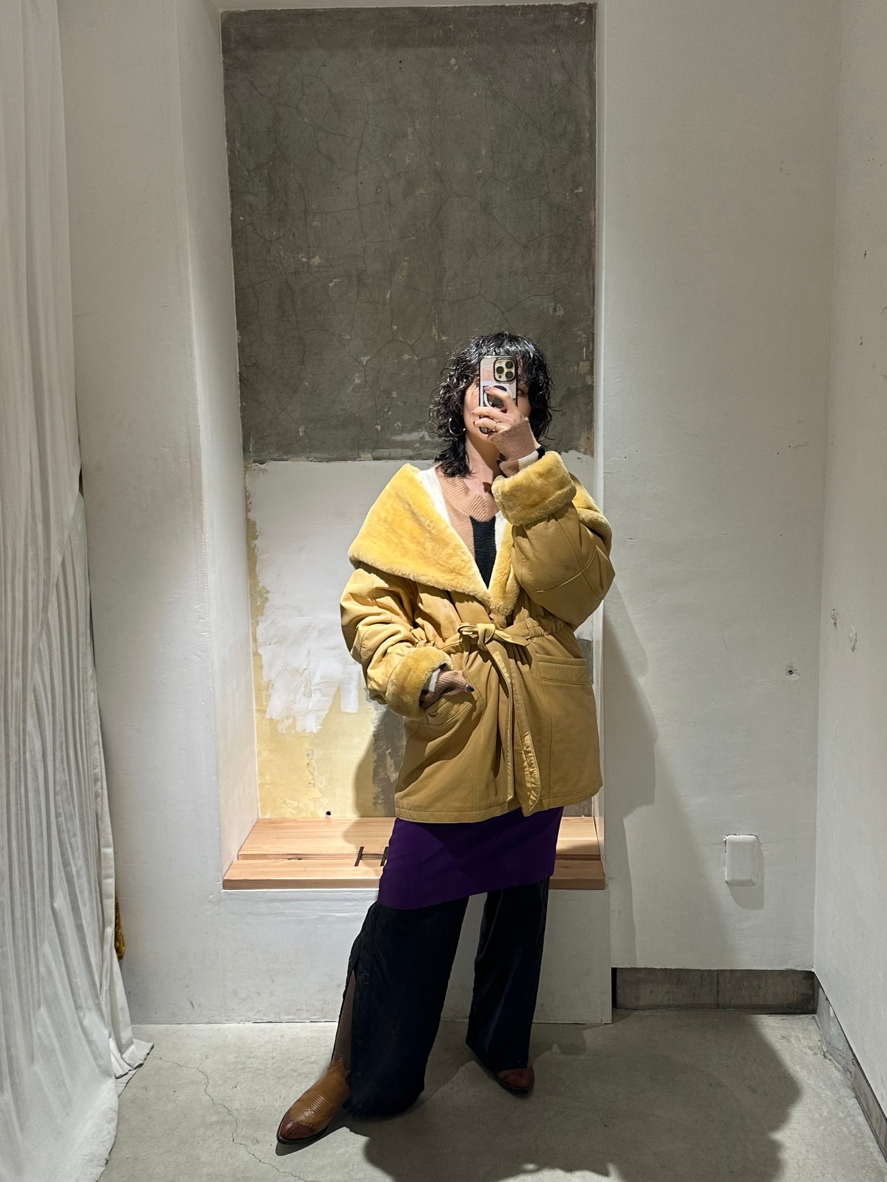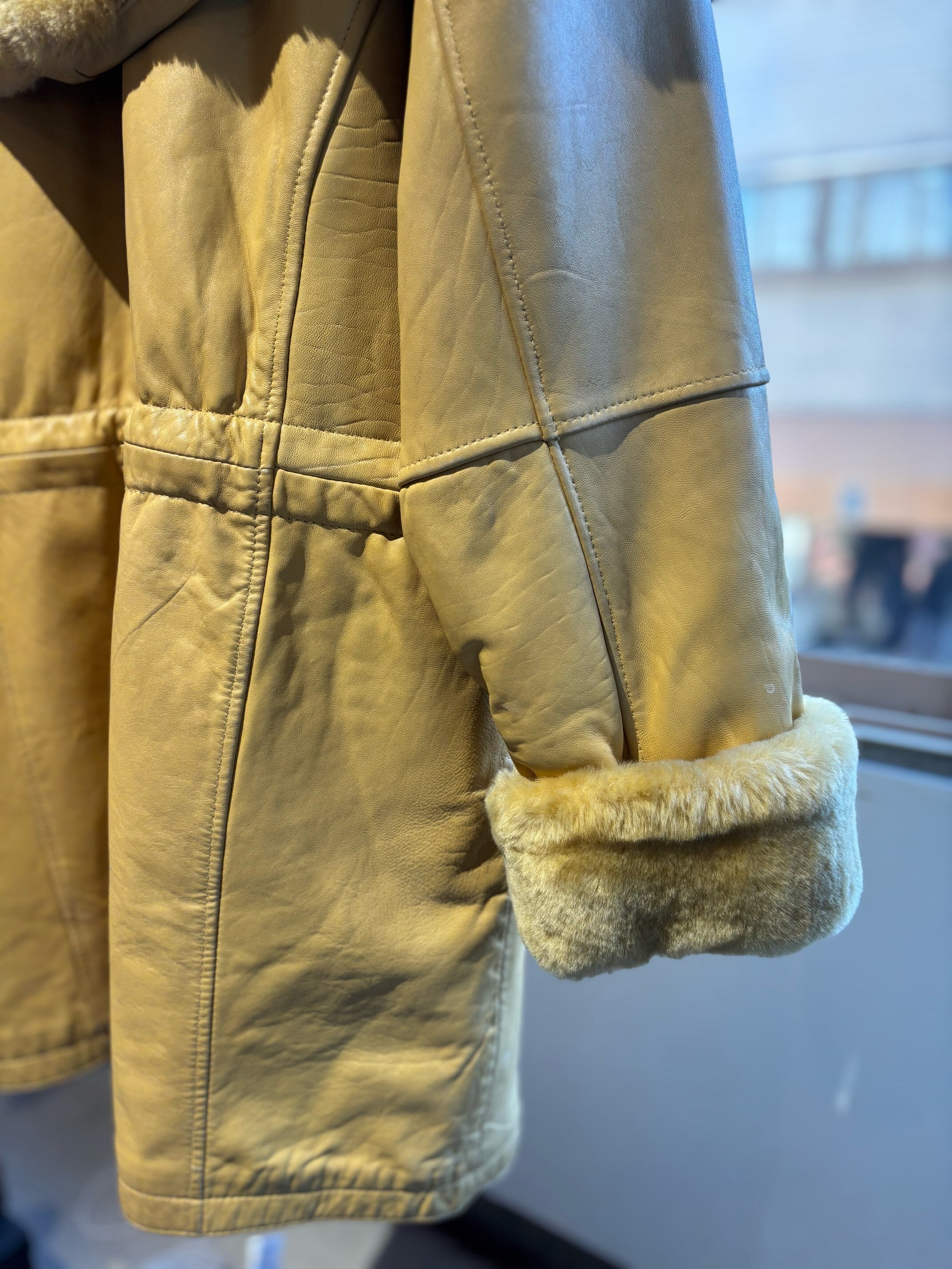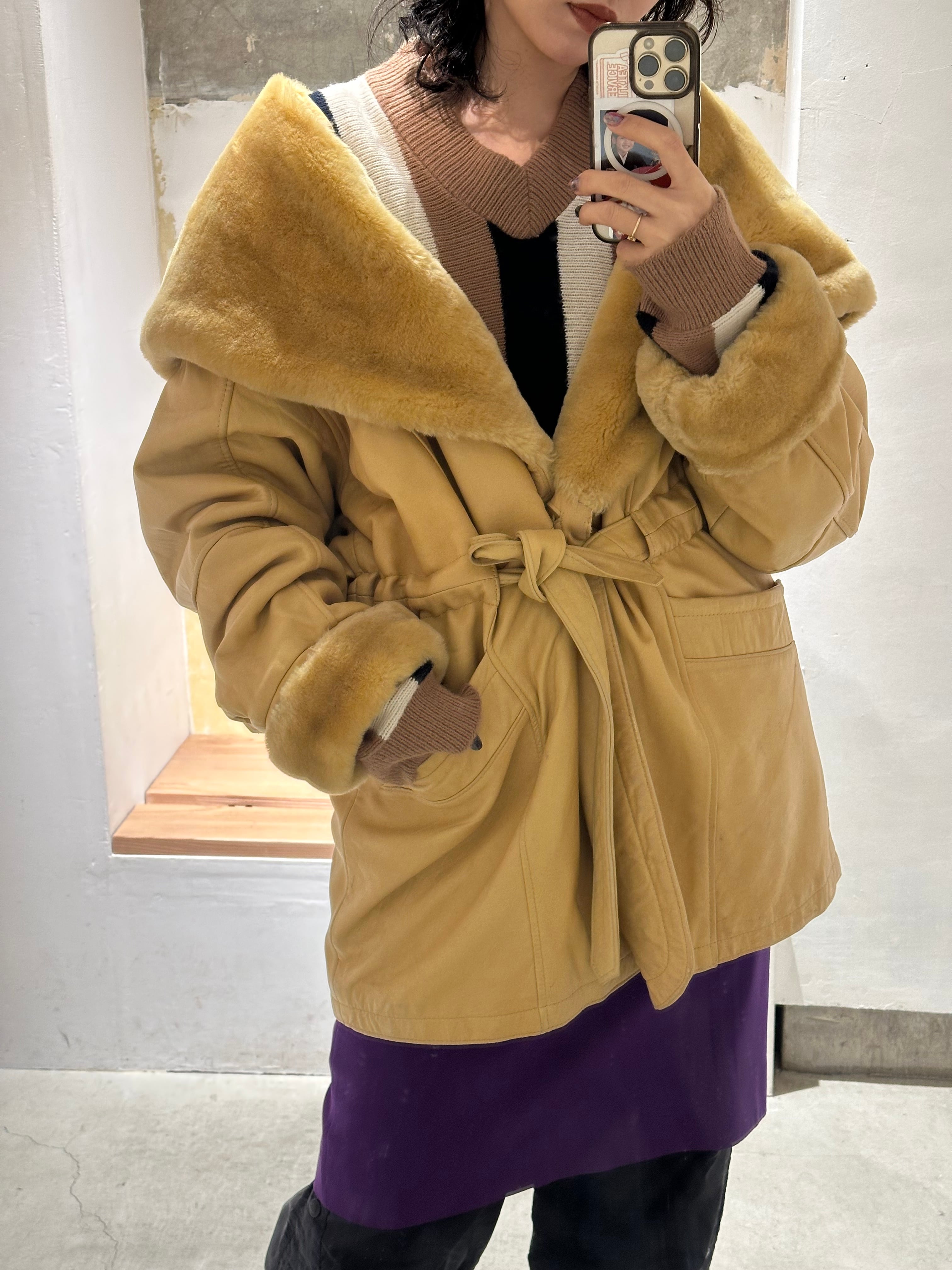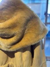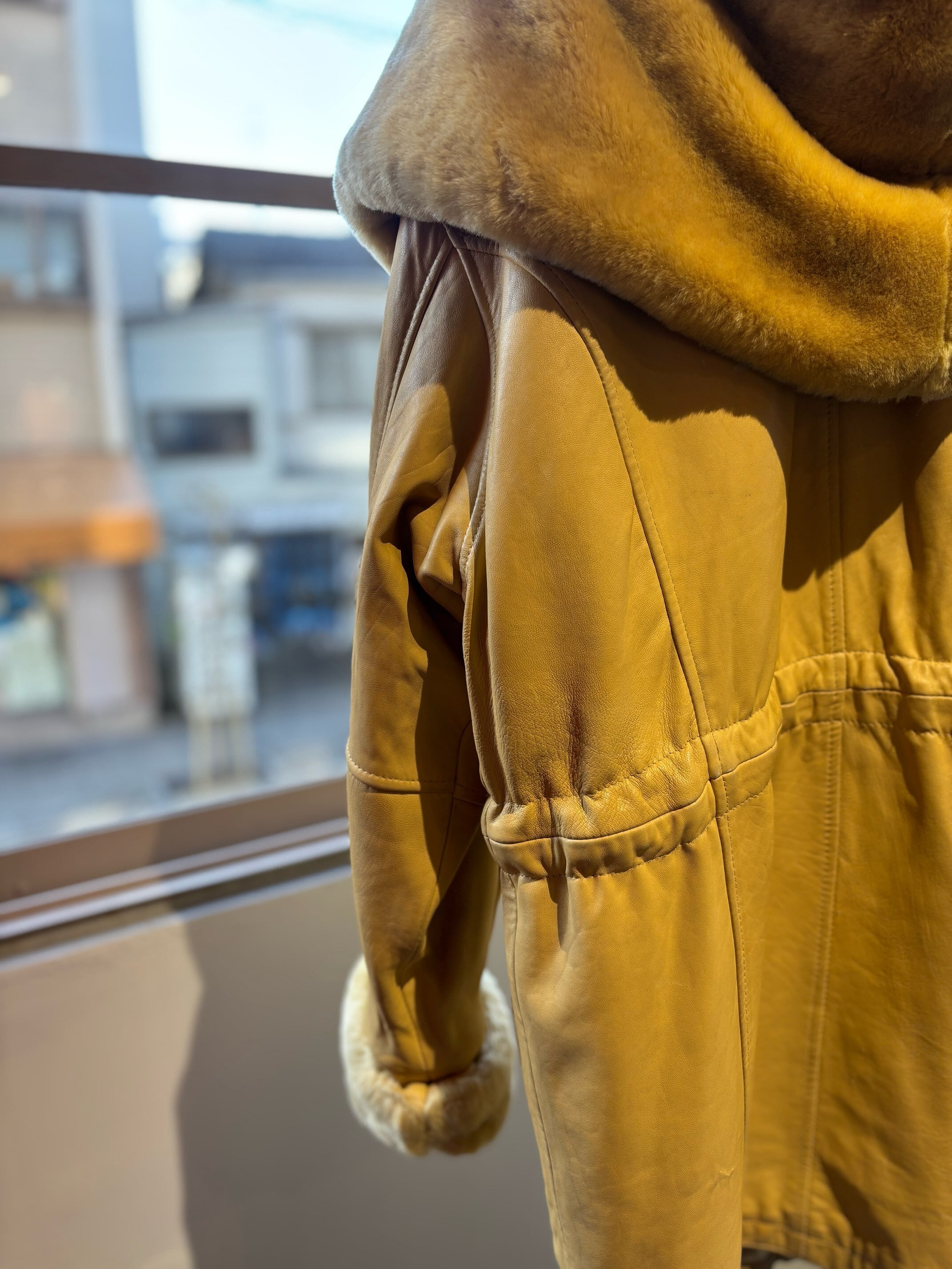とても珍しいイエローのレザーに裏地キルティング、首元にはフェイクファーの大きなフードにもなる襟が付きとても暖かいコートです。