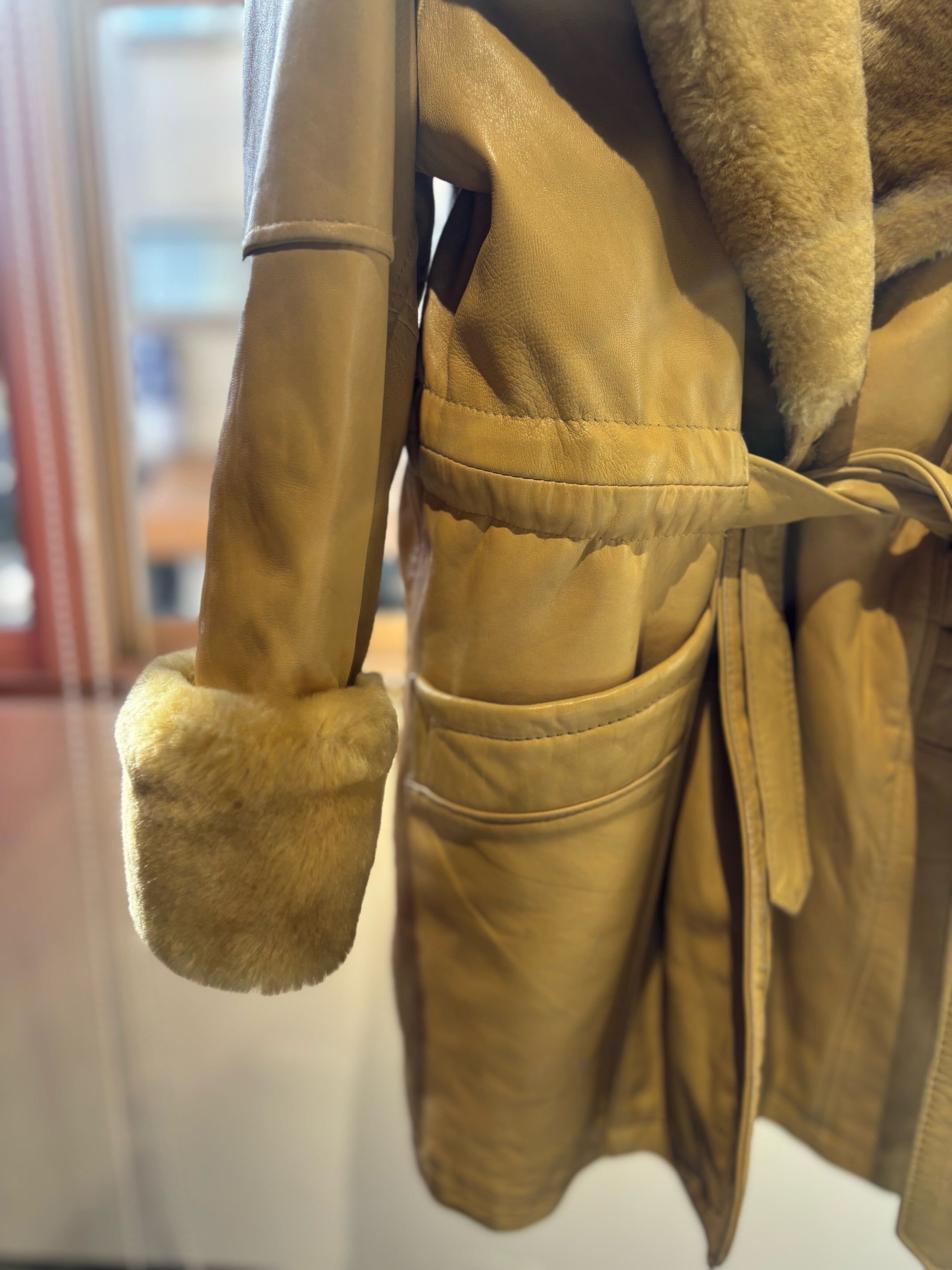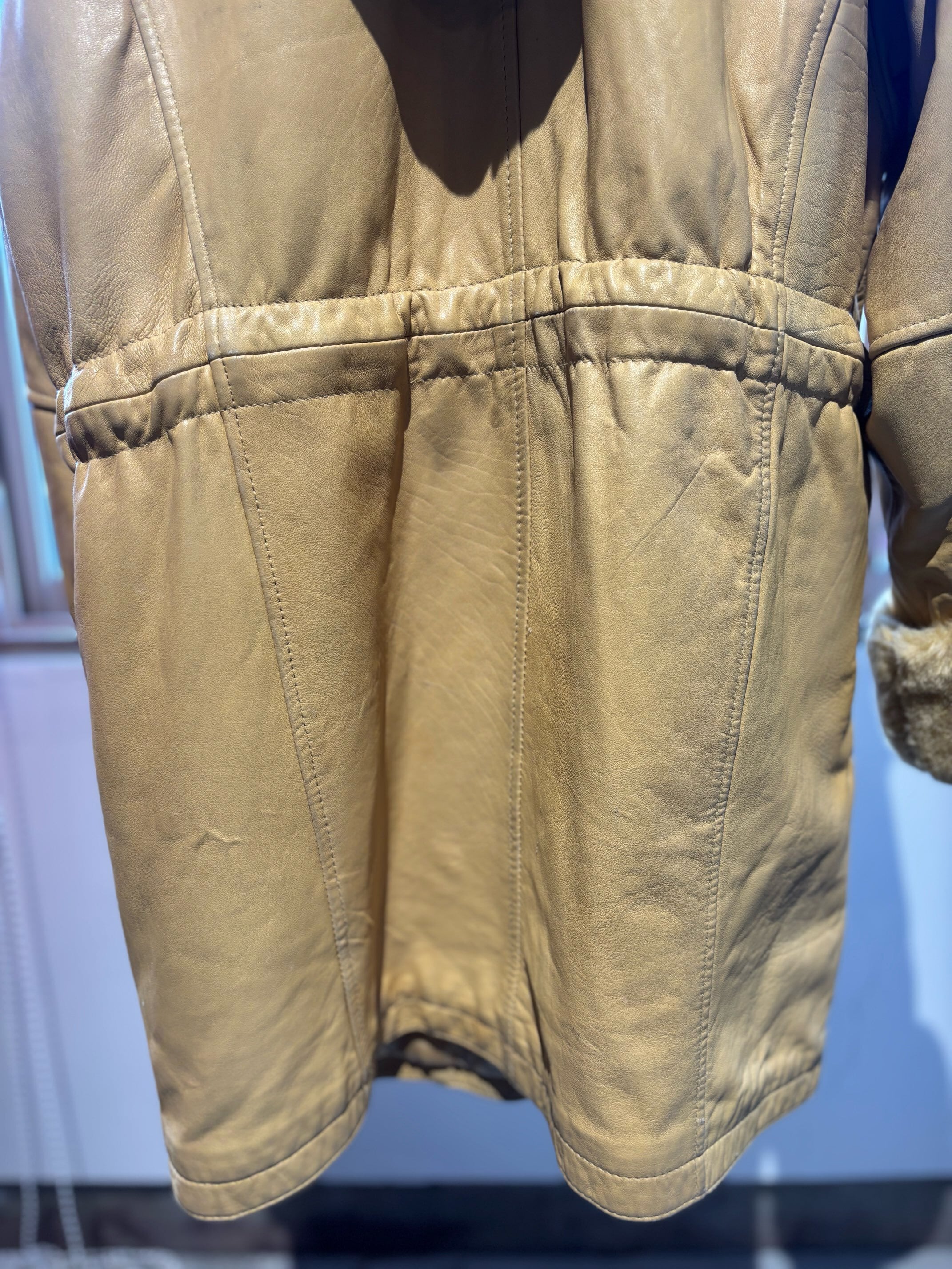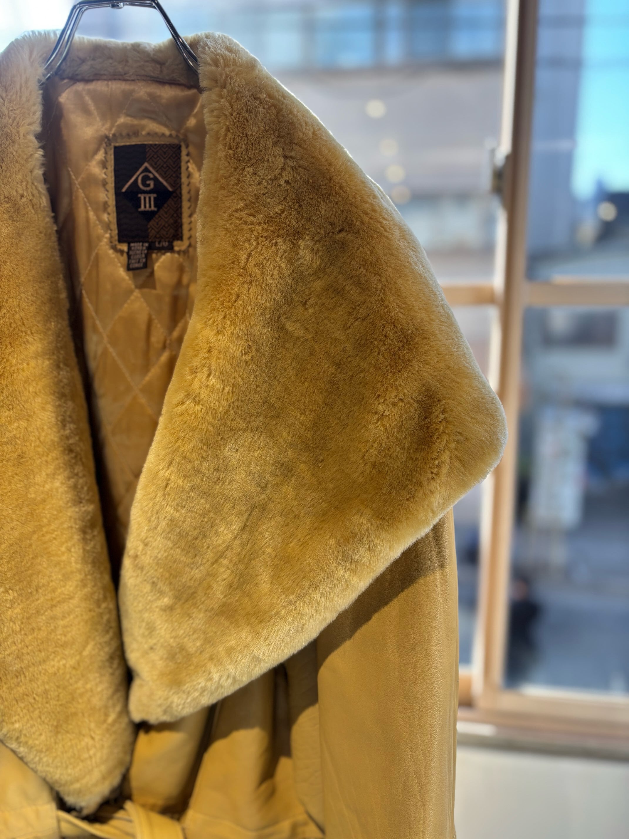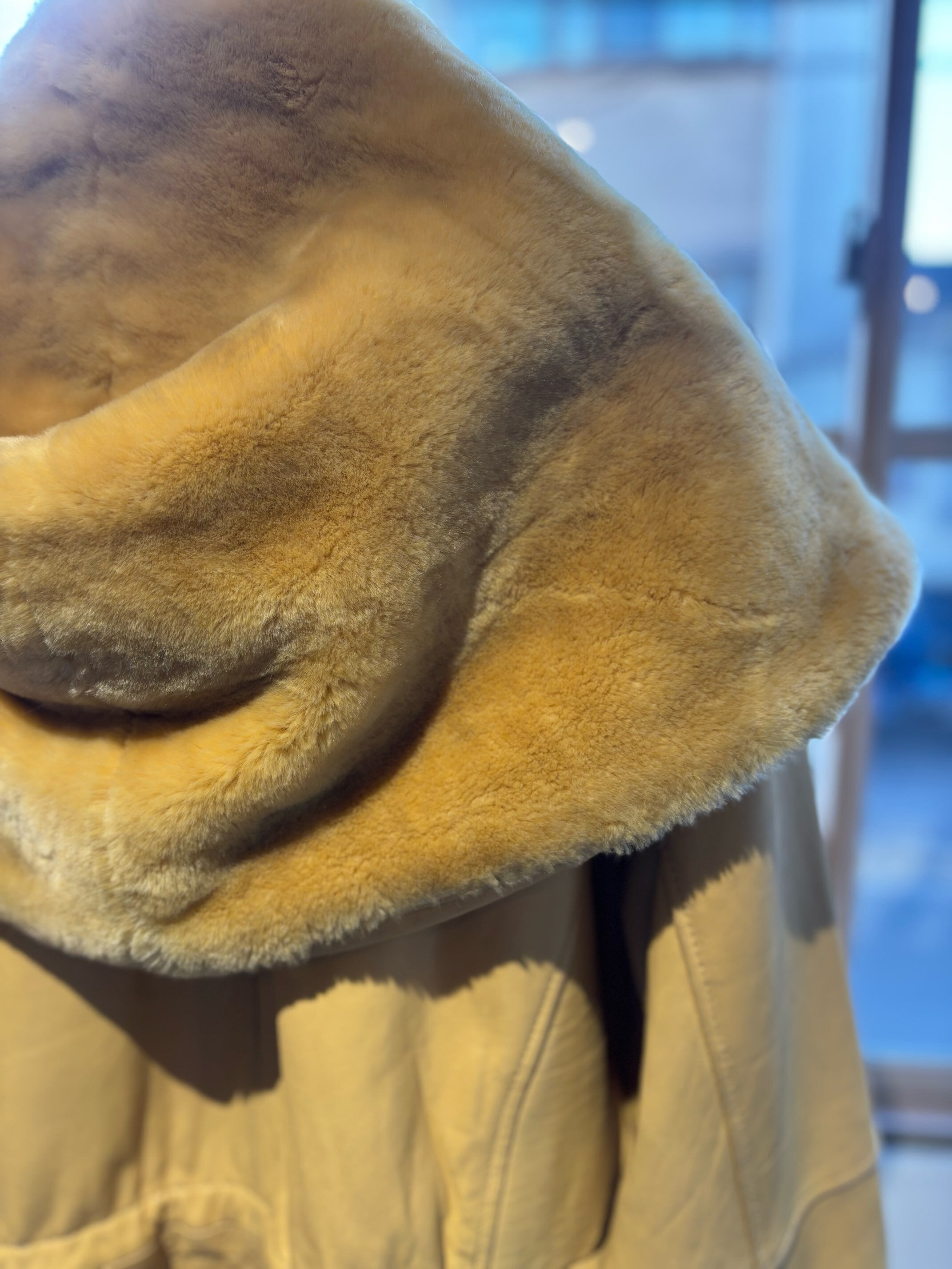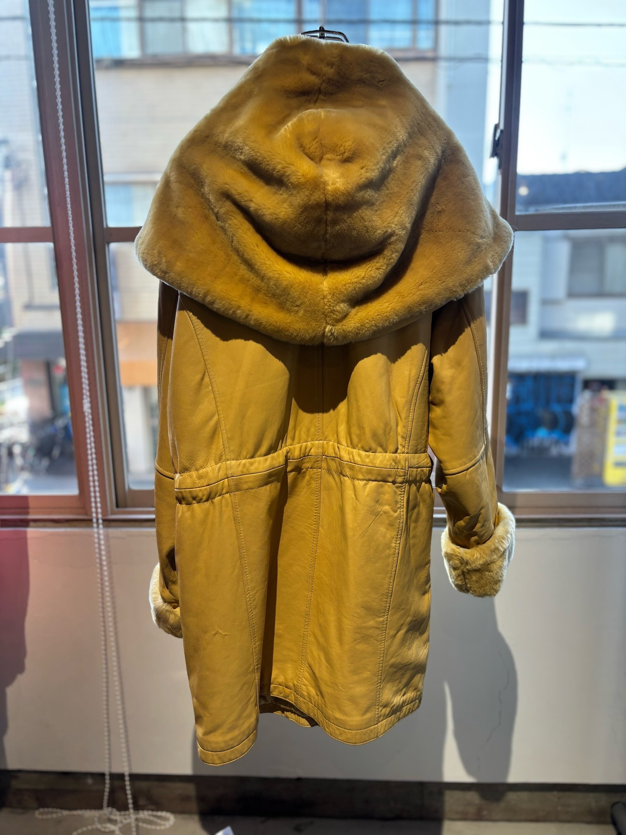 とても珍しいイエローのレザーに裏地キルティング、首元にはフェイクファーの大きなフードにもなる襟が付きとても暖かいコートです。