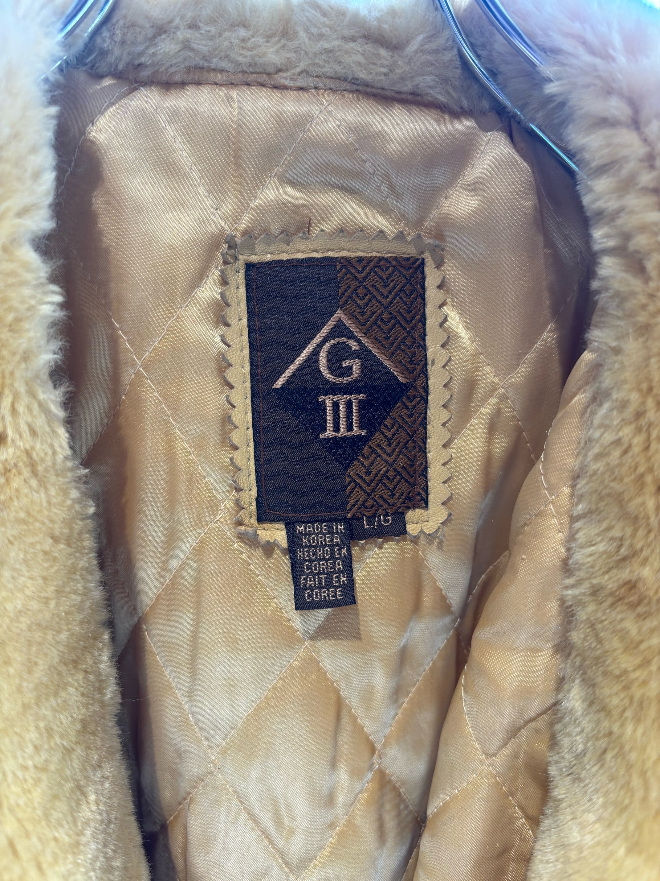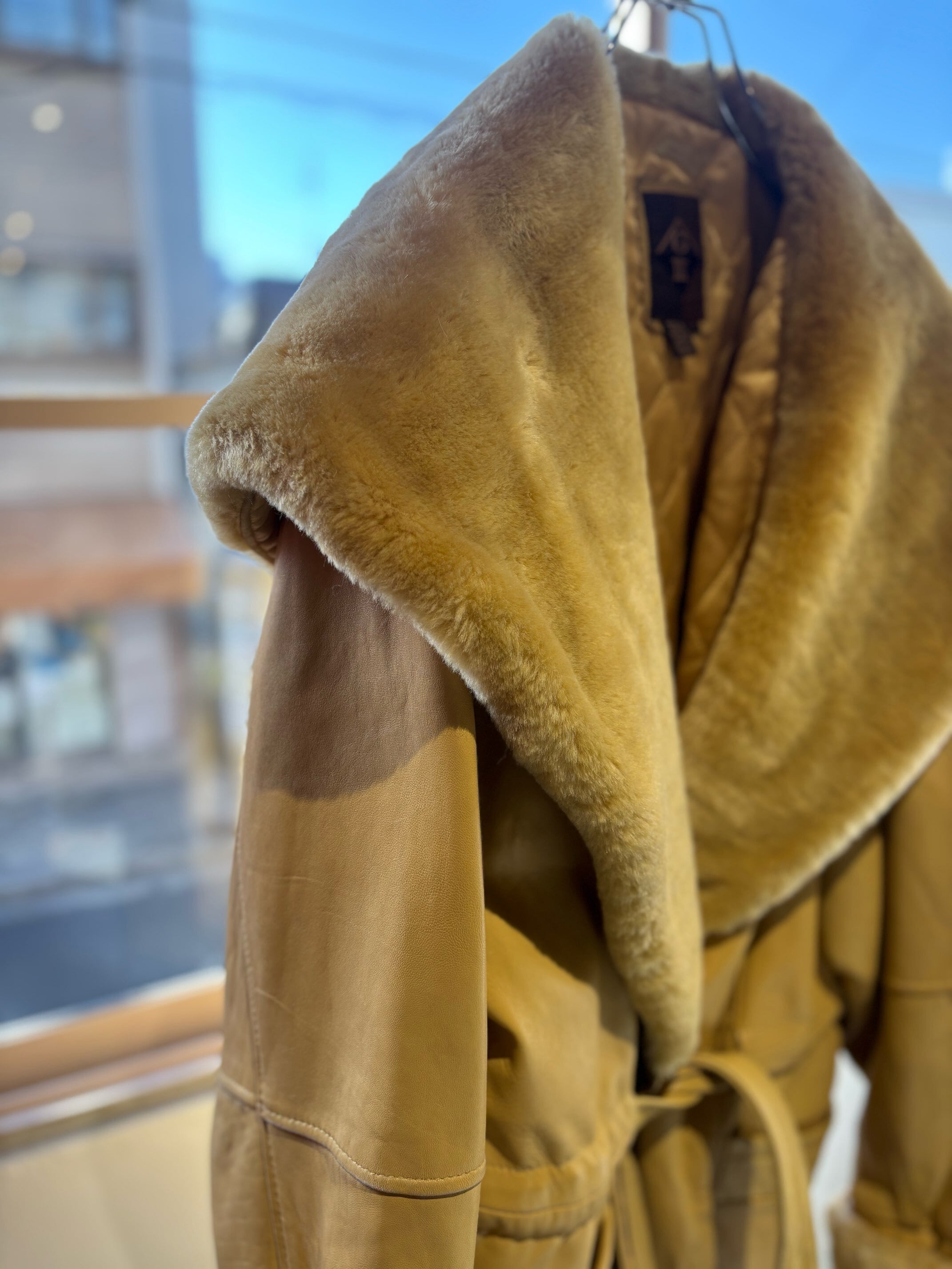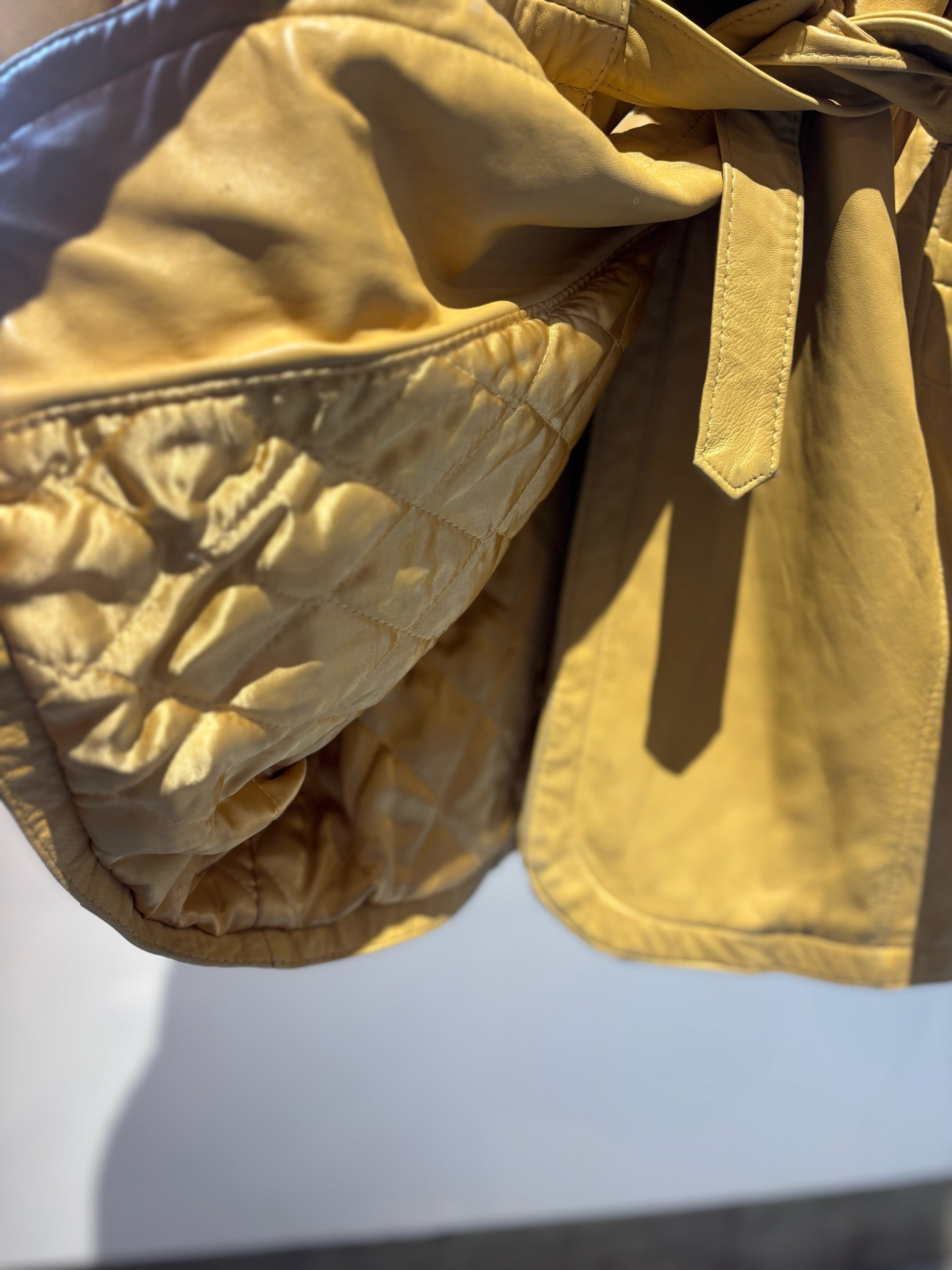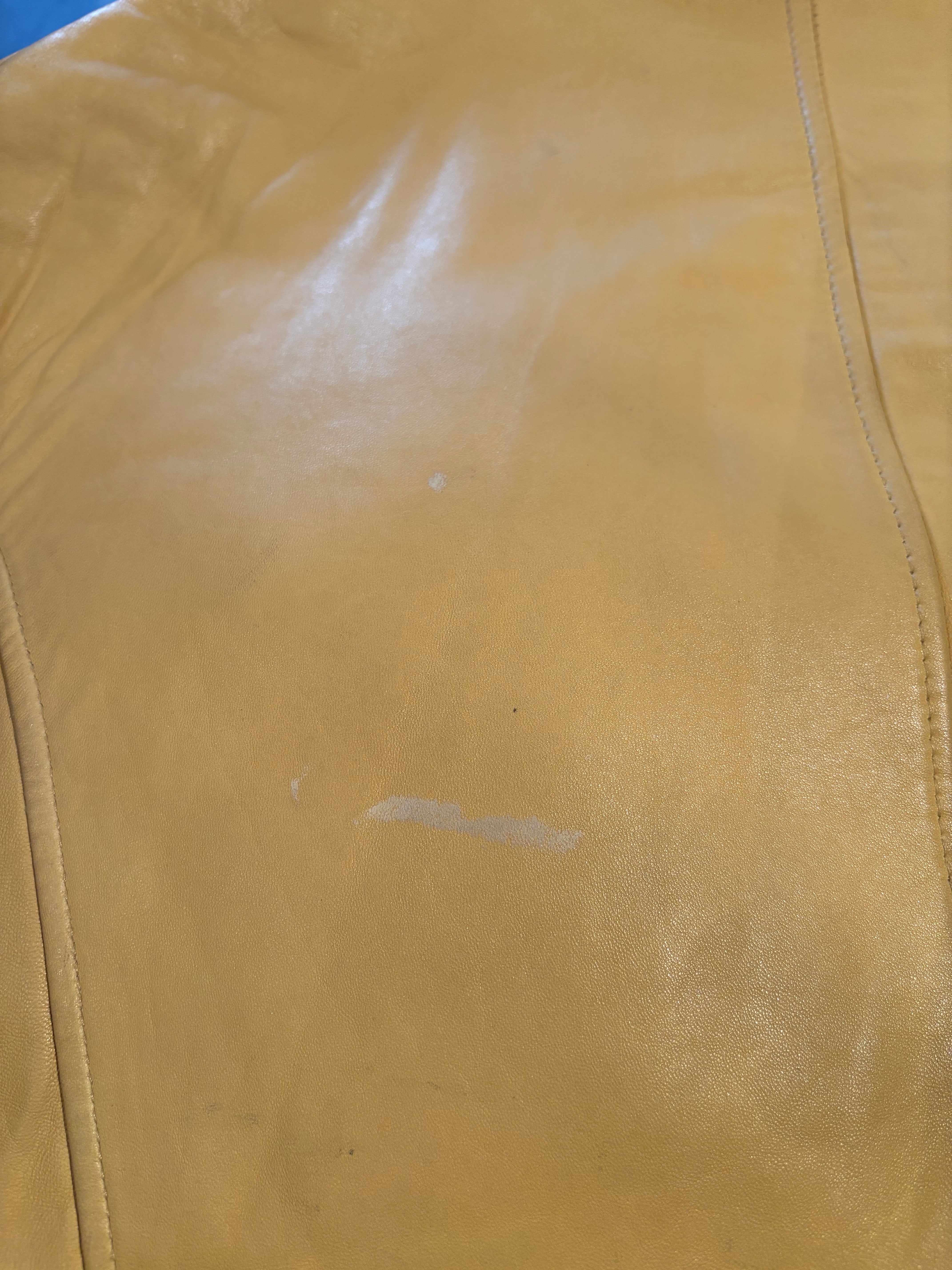 とても珍しいイエローのレザーに裏地キルティング、首元にはフェイクファーの大きなフードにもなる襟が付きとても暖かいコートです。