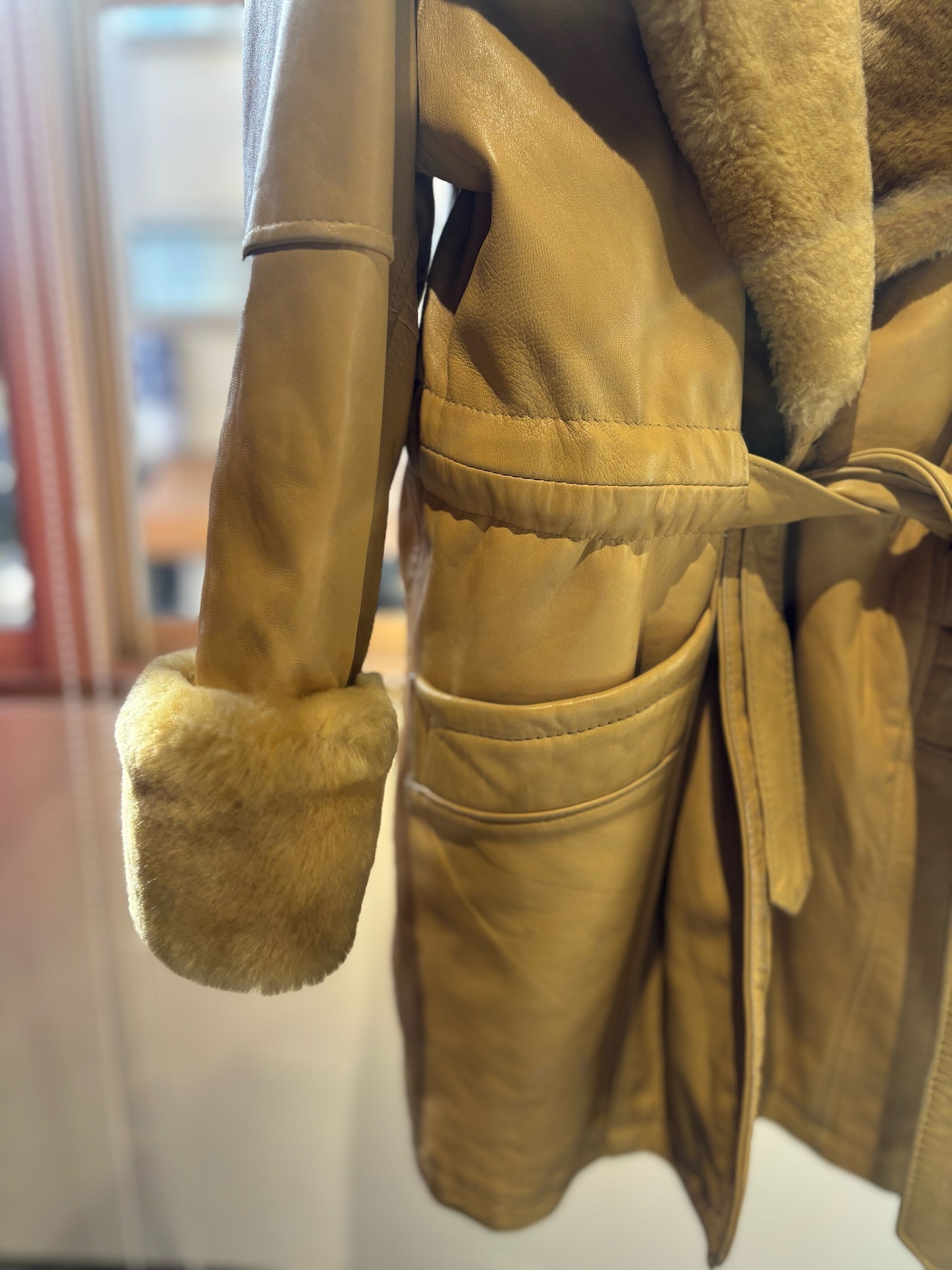 最近では短丈が主流になっていて、ハーフ丈はなかなか人気が出てませんがお尻まで隠れるシルエットで包まれてる感がありとても暖かいので、冬シーズンにはとても良いレザーコートだと思います。