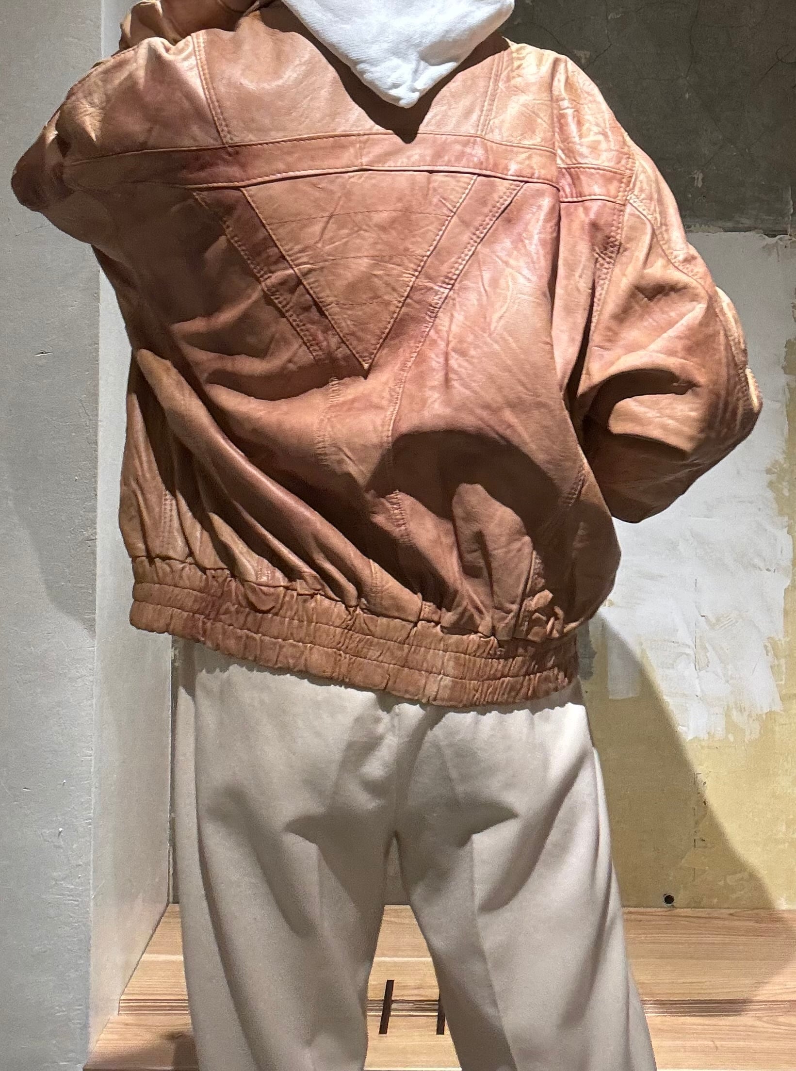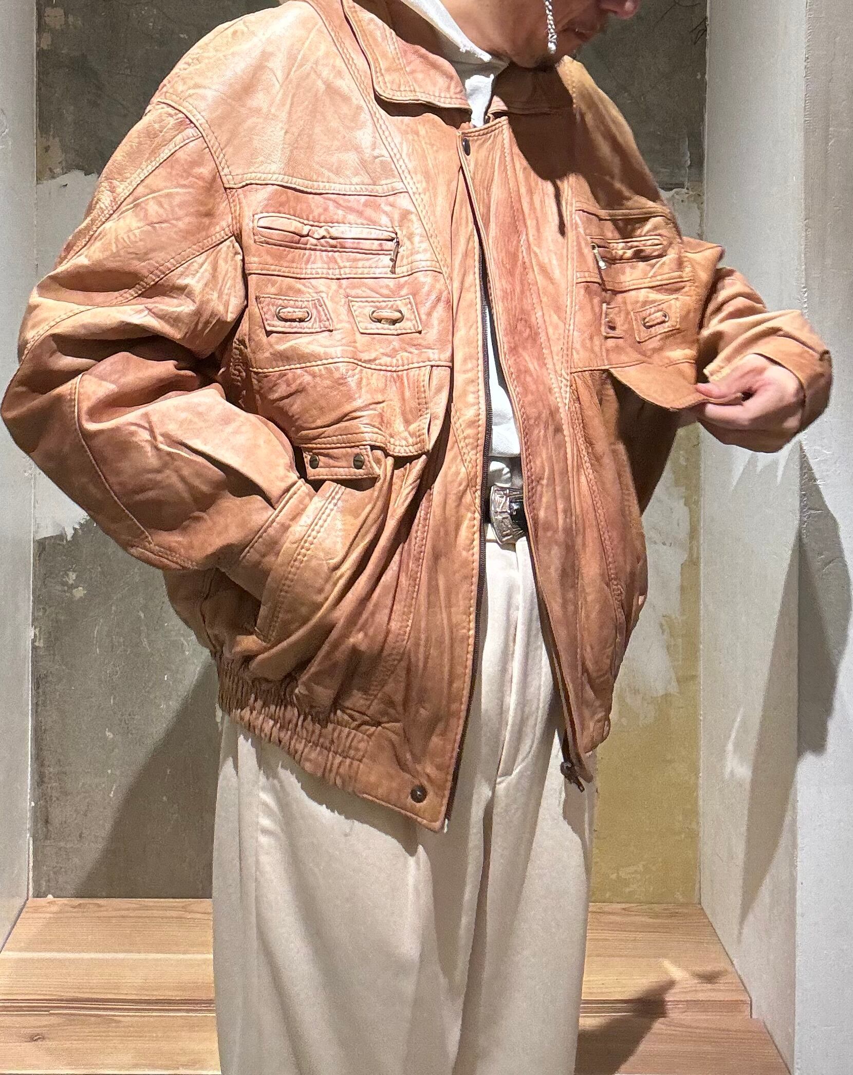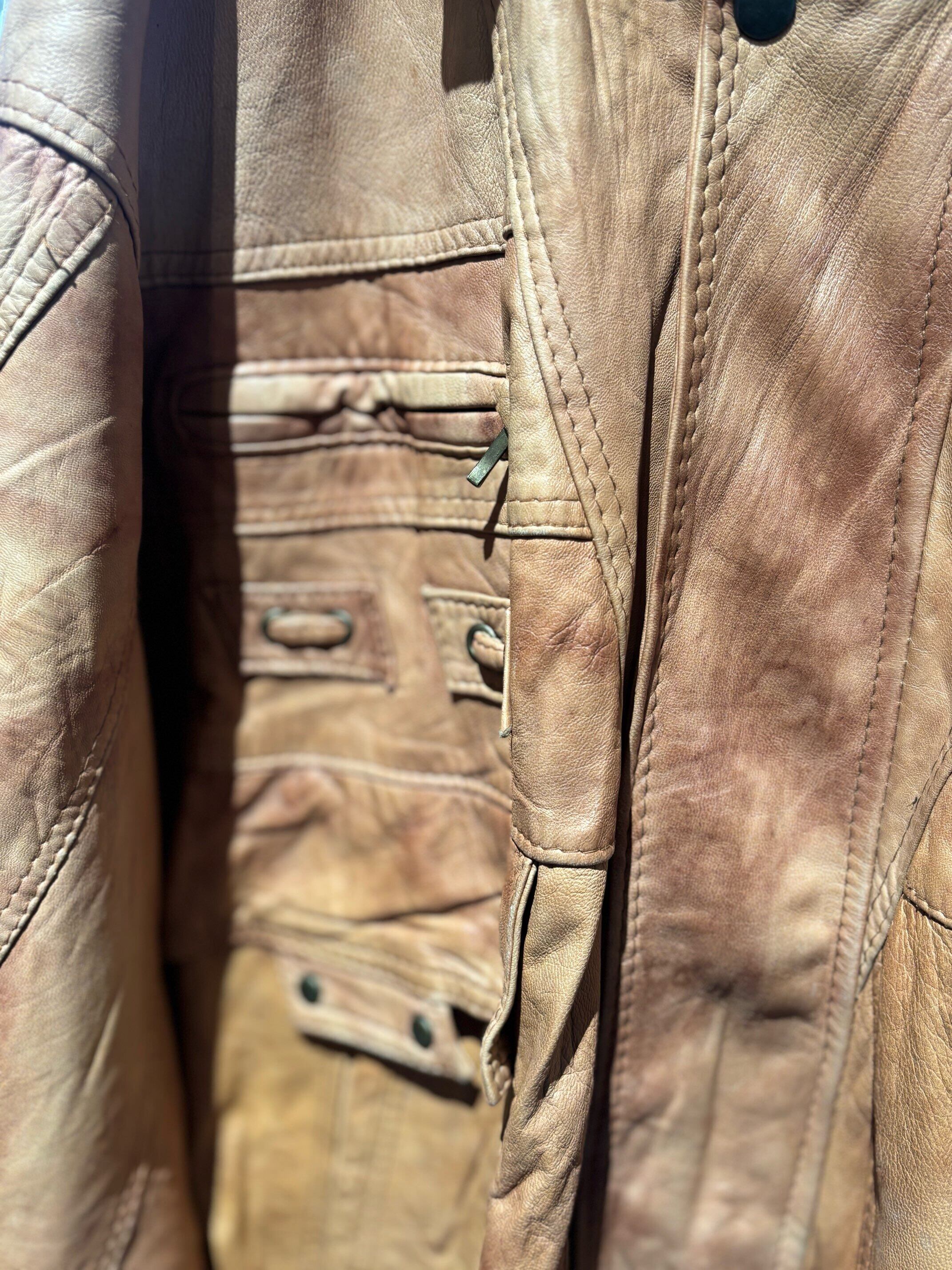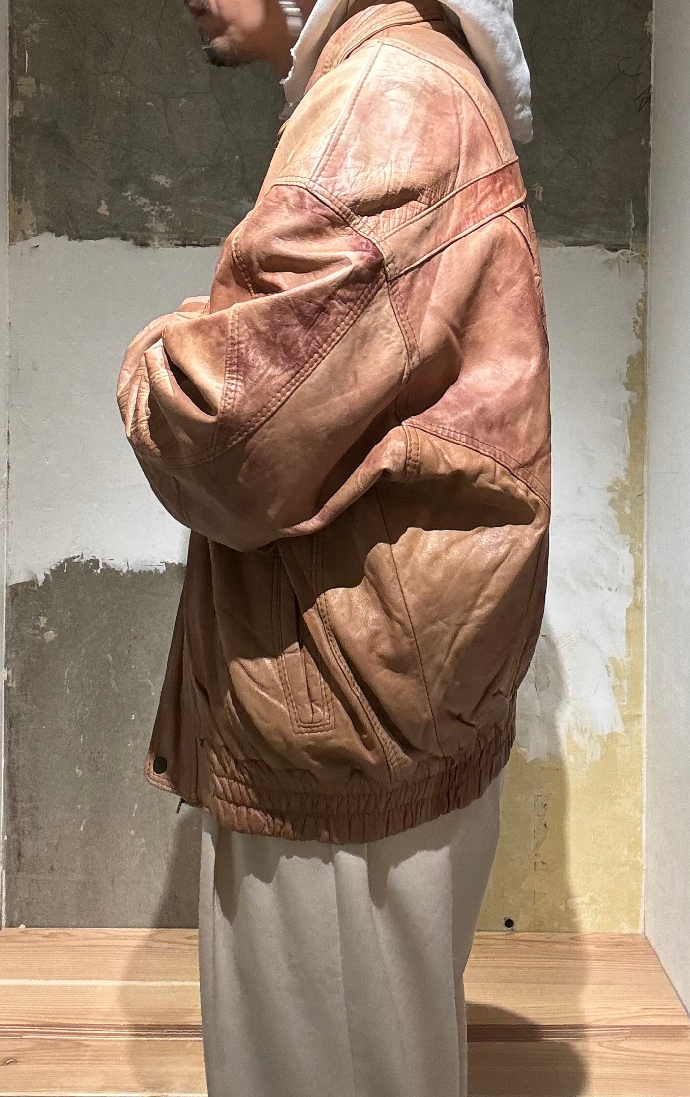 アートな染まり方をしているジャケットです。薄いベージュ系のカラーに赤のような茶色のような色が染まってタイダイのようなカラーになった雰囲気のあるレザージャケットです。