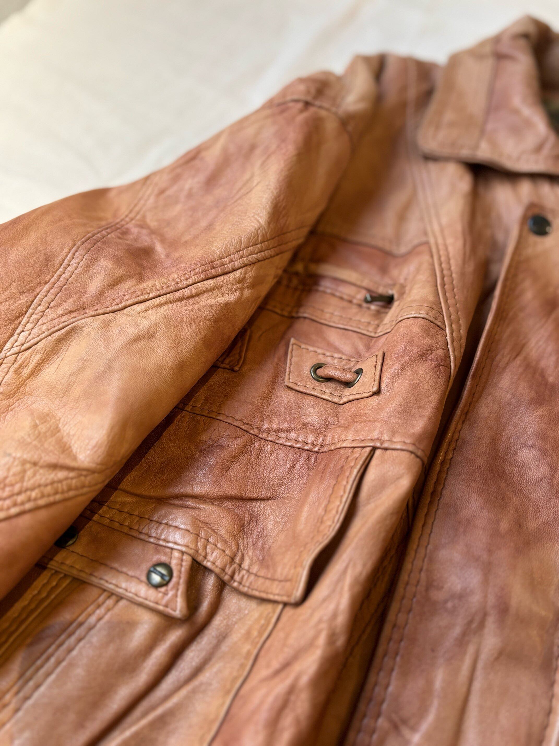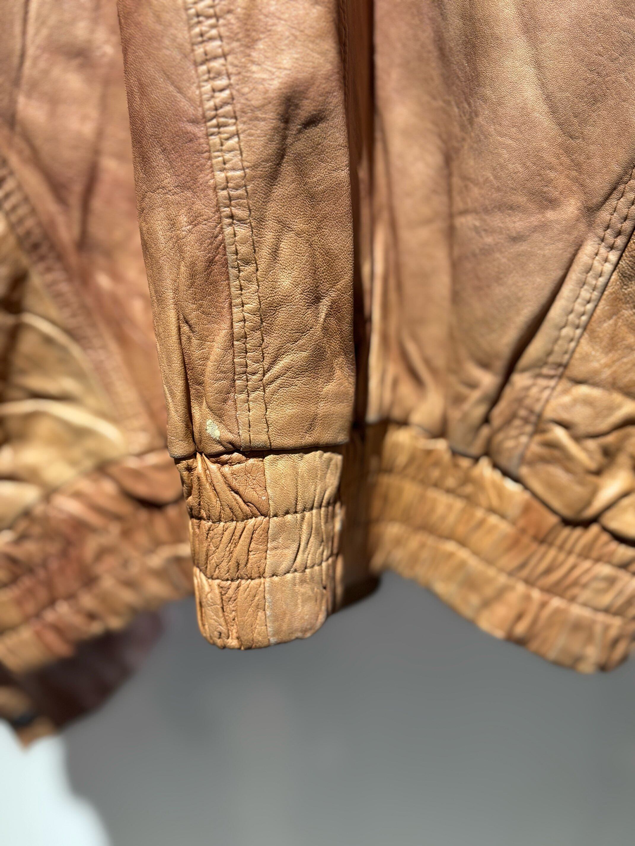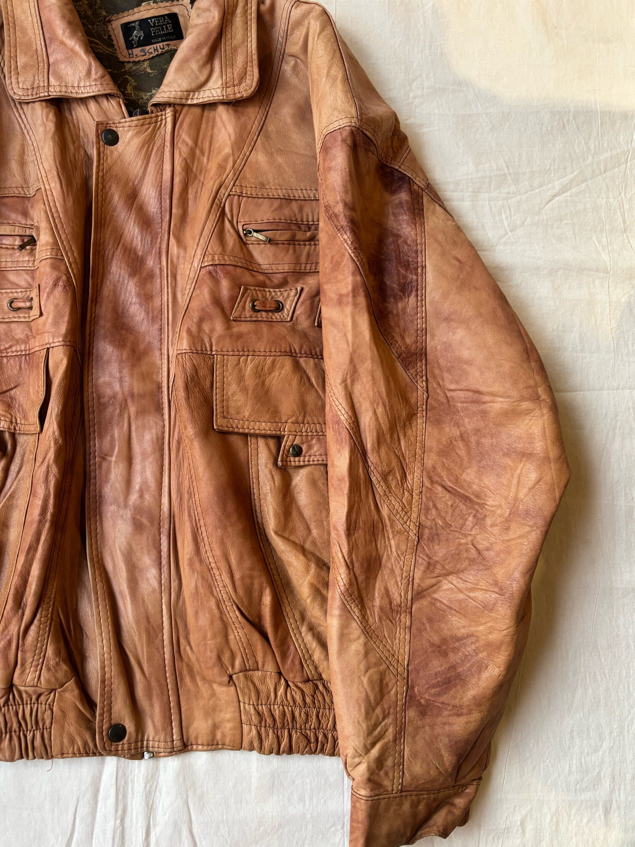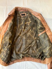 アートな染まり方をしているジャケットです。薄いベージュ系のカラーに赤のような茶色のような色が染まってタイダイのようなカラーになった雰囲気のあるレザージャケットです。