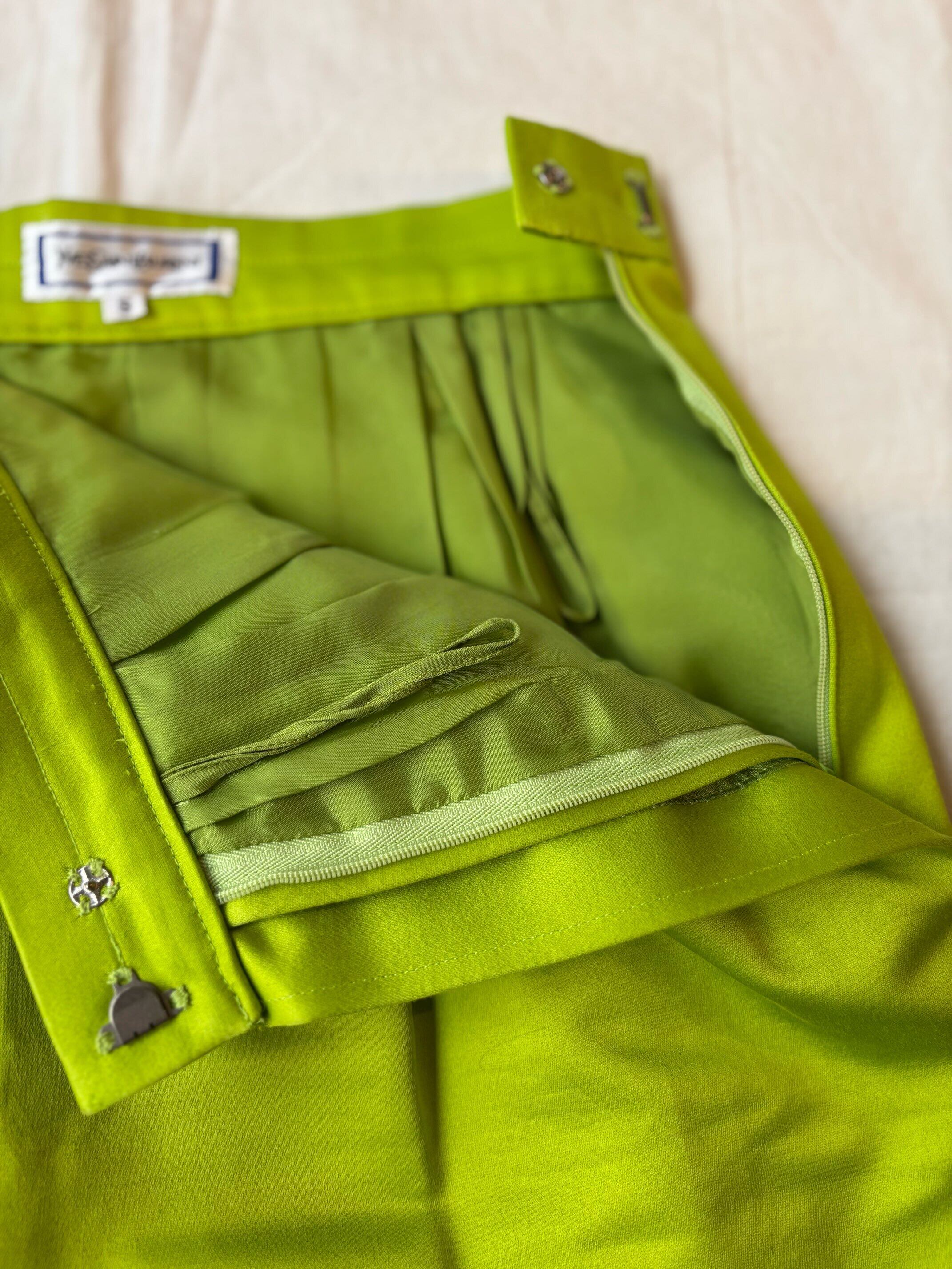 80年代から90年代に日本の企業がライセンス契約をして国産で作っていたイヴ・サンローランのスカートだと思います。所謂バブル時代には海外の様々なブランドが日本の企業とライセンス契約をして商品を販売していました。その頃の日本製のアイテムだと思いますが、さすがはジャパンメイド、とても品質や作りが良く今までも色褪せない素晴らしい作りのスカートです。