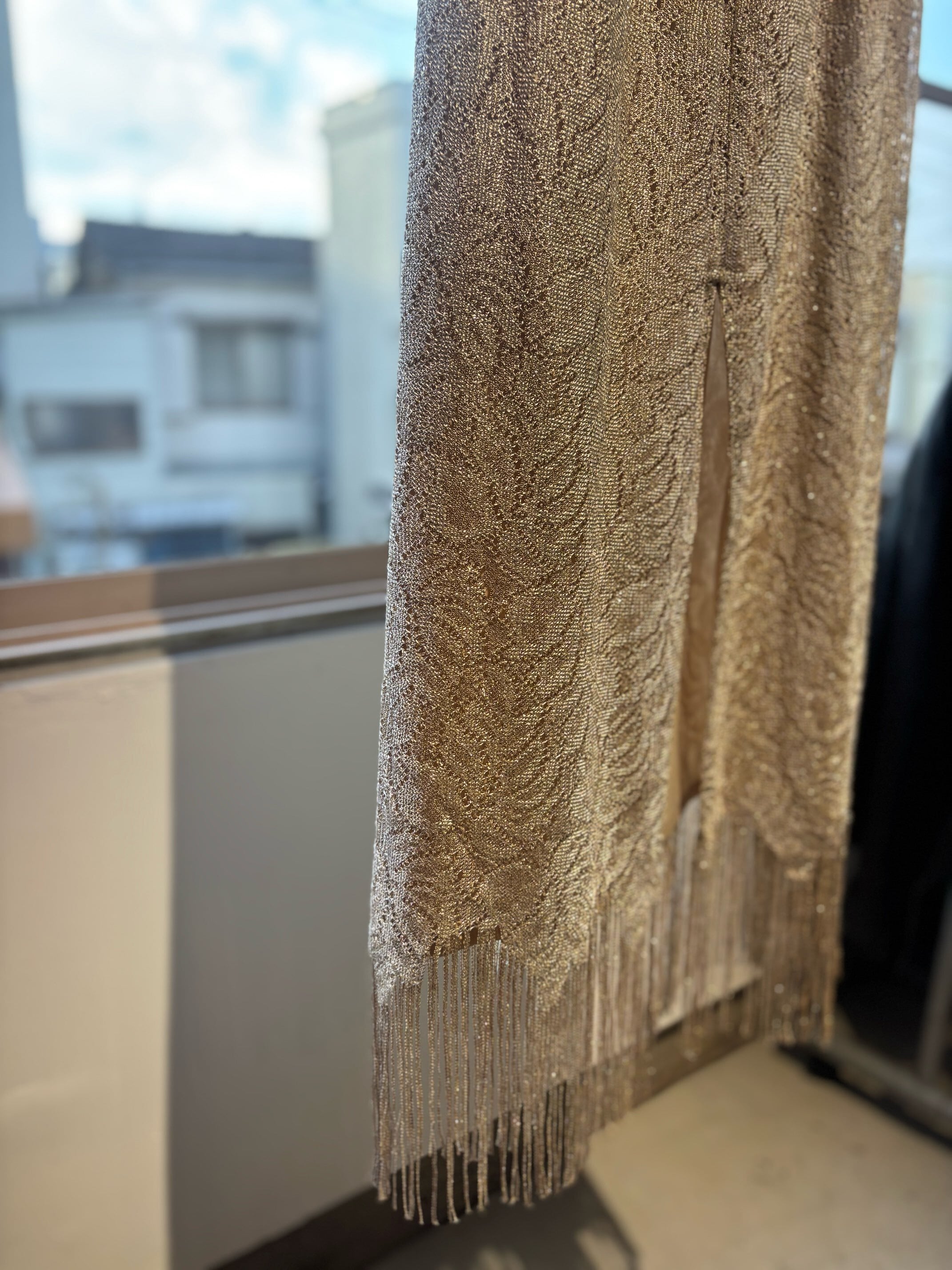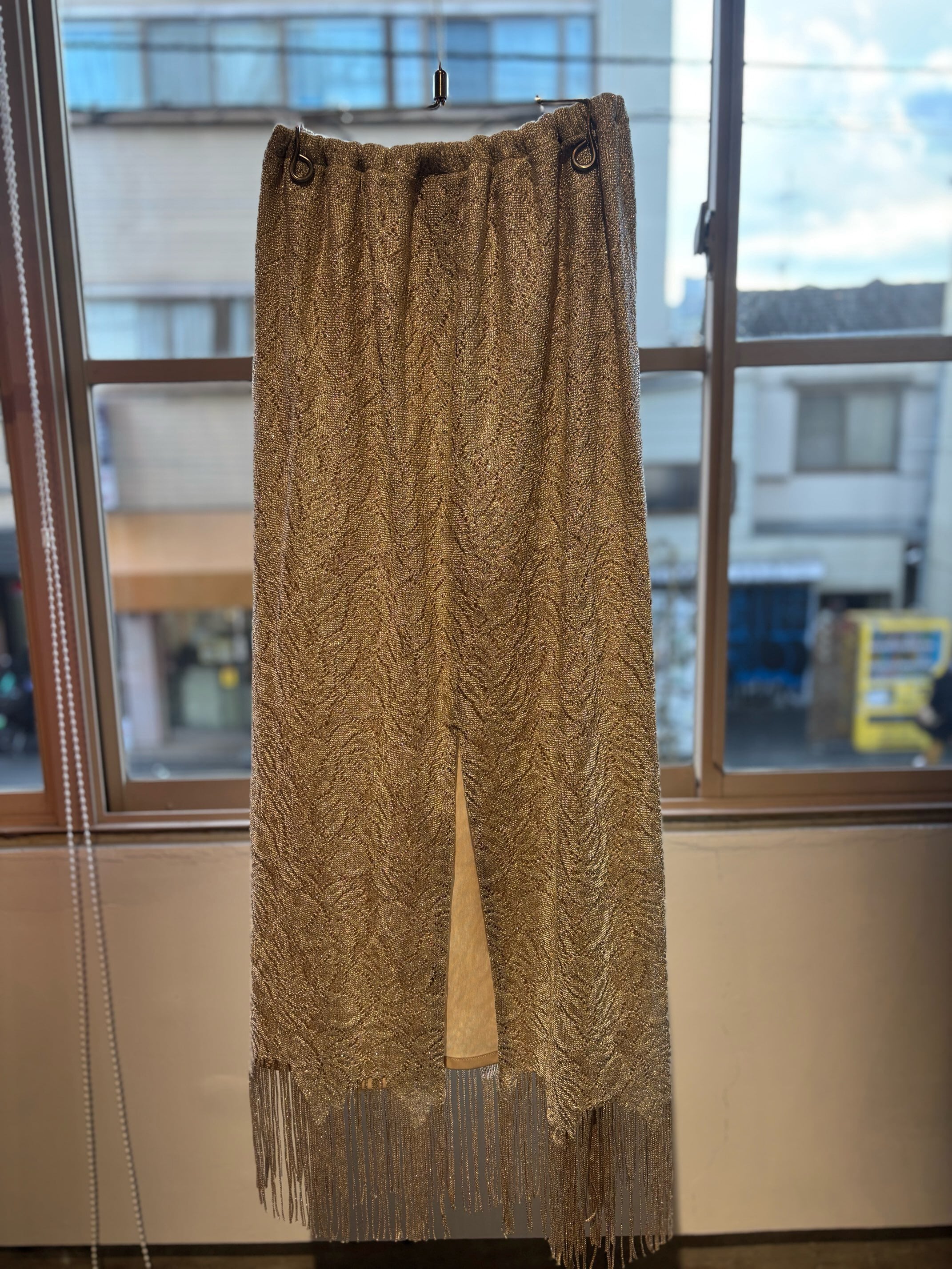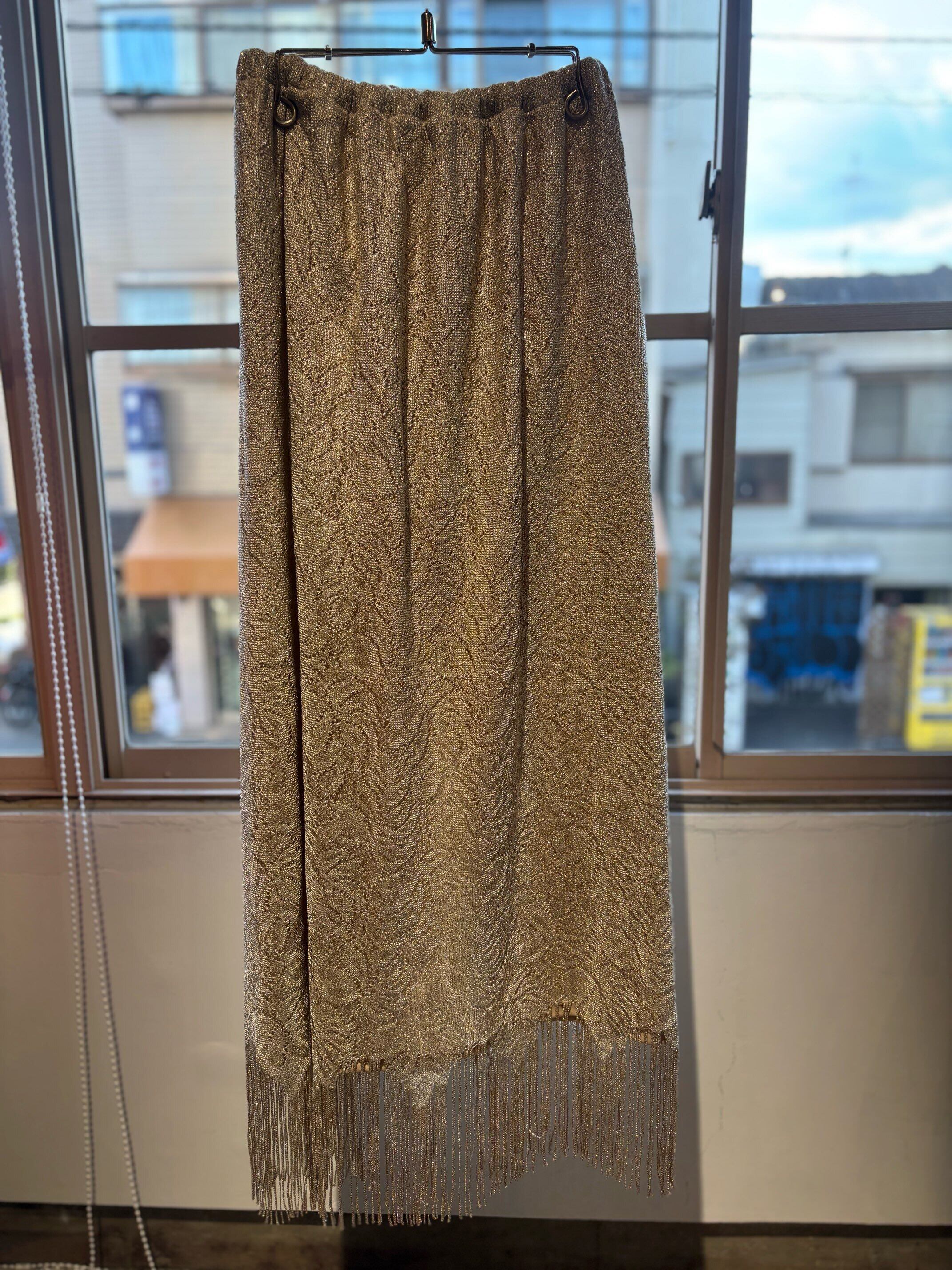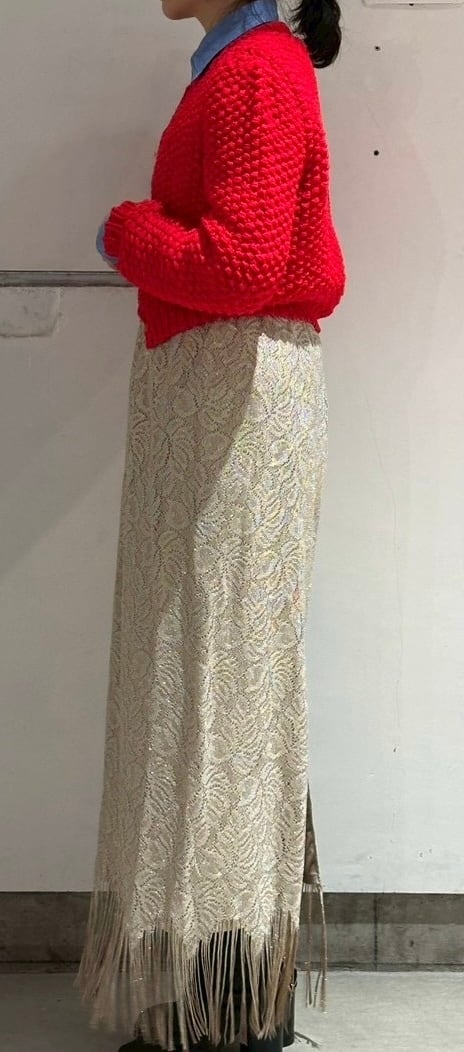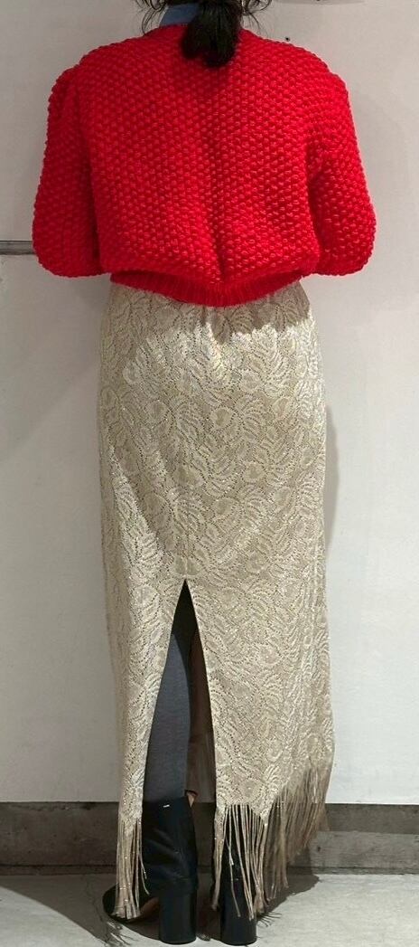 stylingしやすいフリンジスカートですね。ゴールドのようなレースの素材にラメ糸が入っていてキラキラ光るグリッター素材、ウィメンズではずっとトレンドになっているフリンジが付いたとても可愛いスカートです。