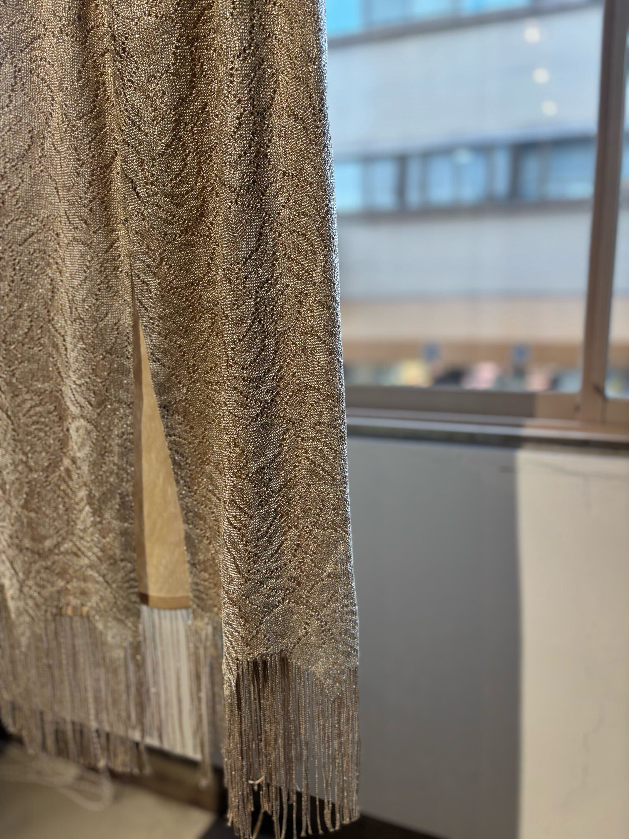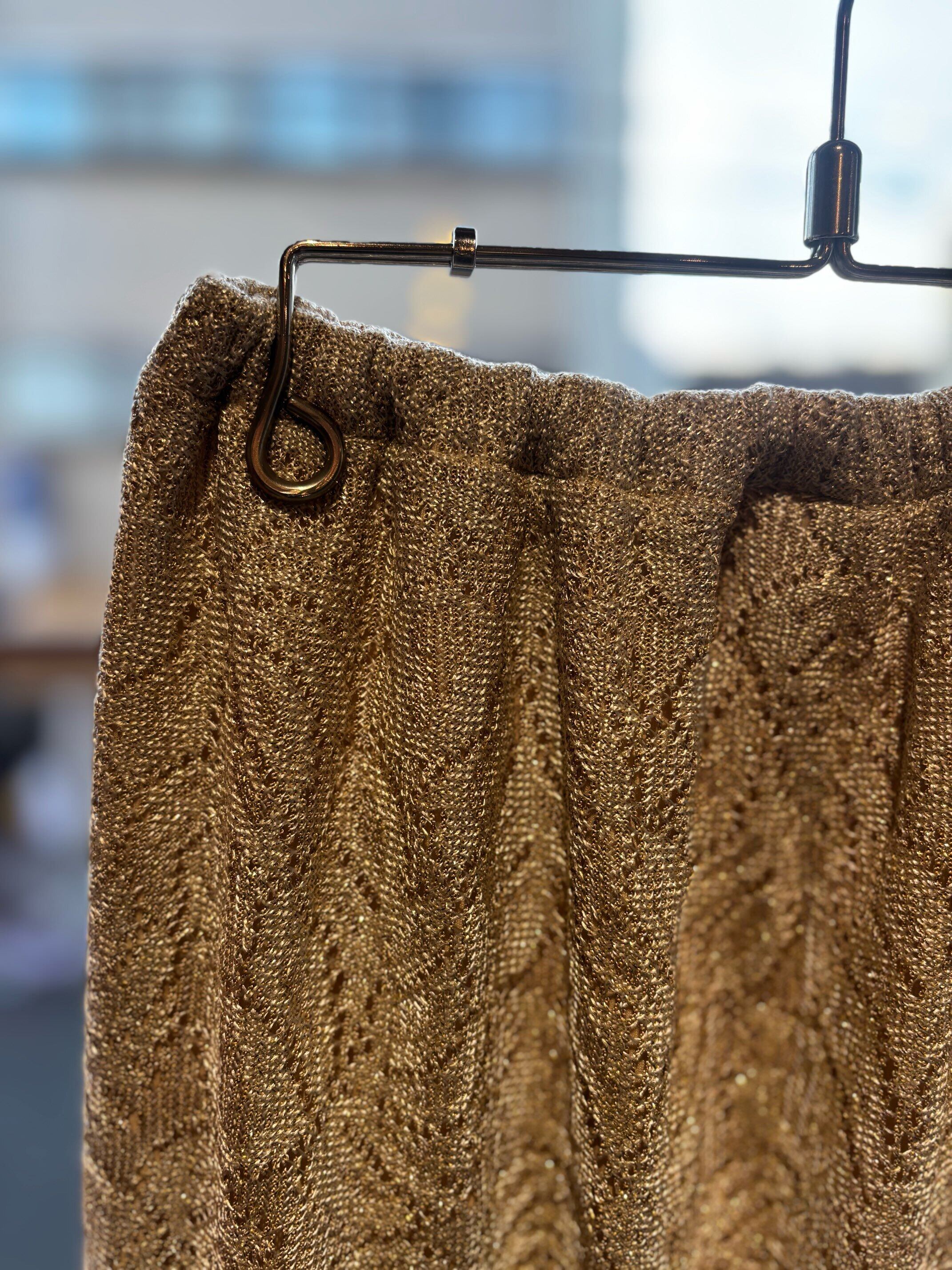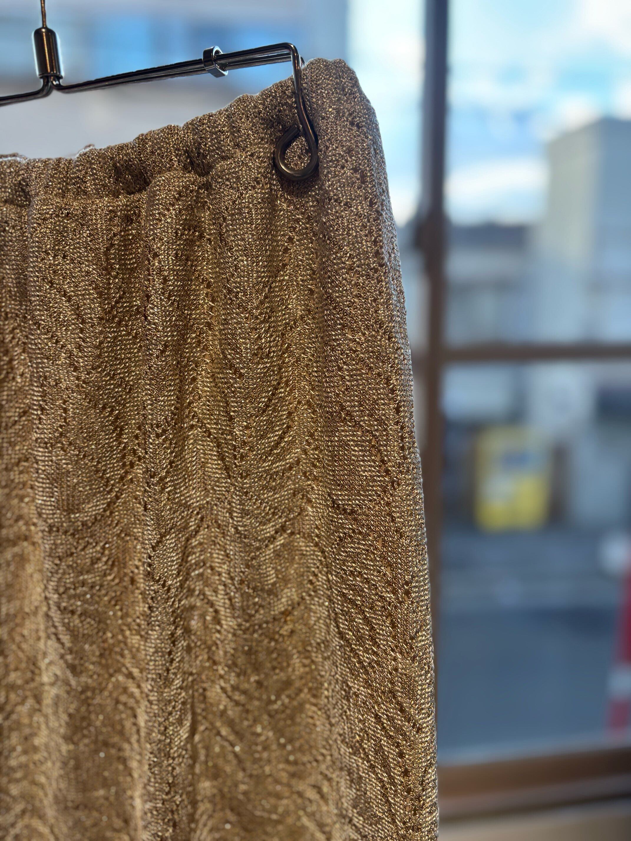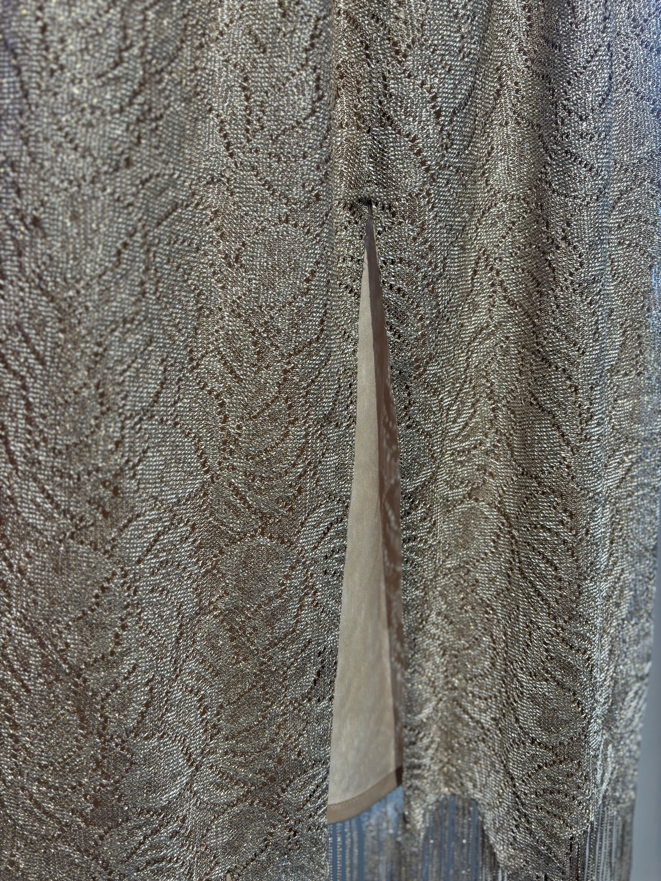 stylingしやすいフリンジスカートですね。ゴールドのようなレースの素材にラメ糸が入っていてキラキラ光るグリッター素材、ウィメンズではずっとトレンドになっているフリンジが付いたとても可愛いスカートです。