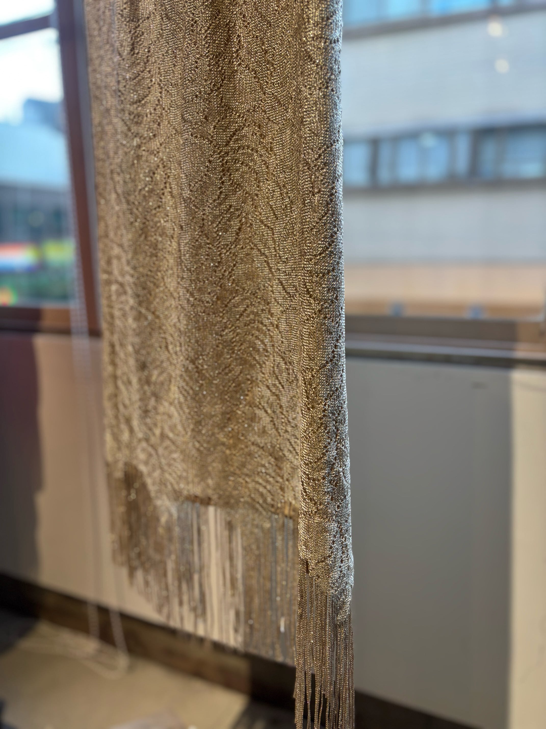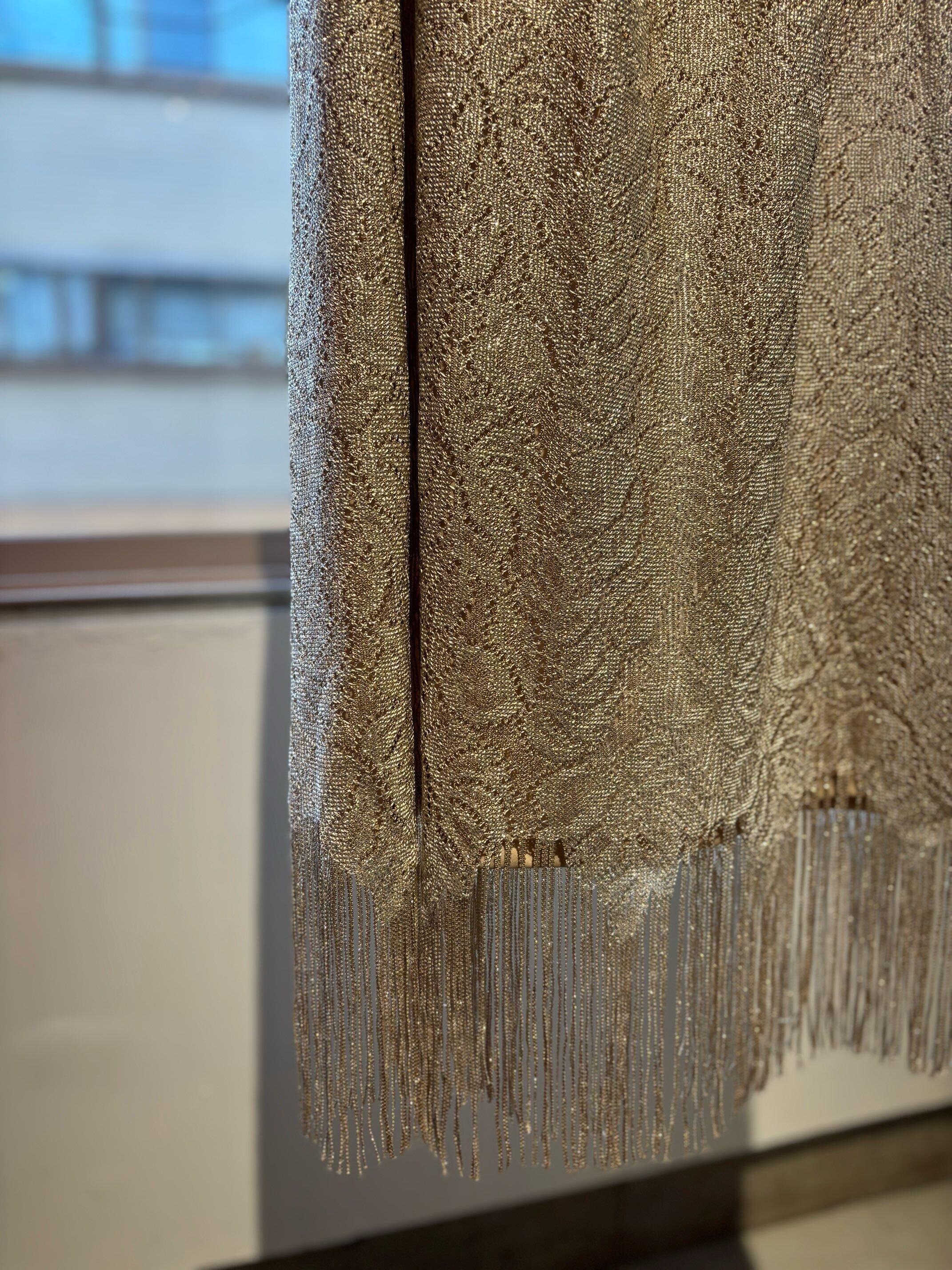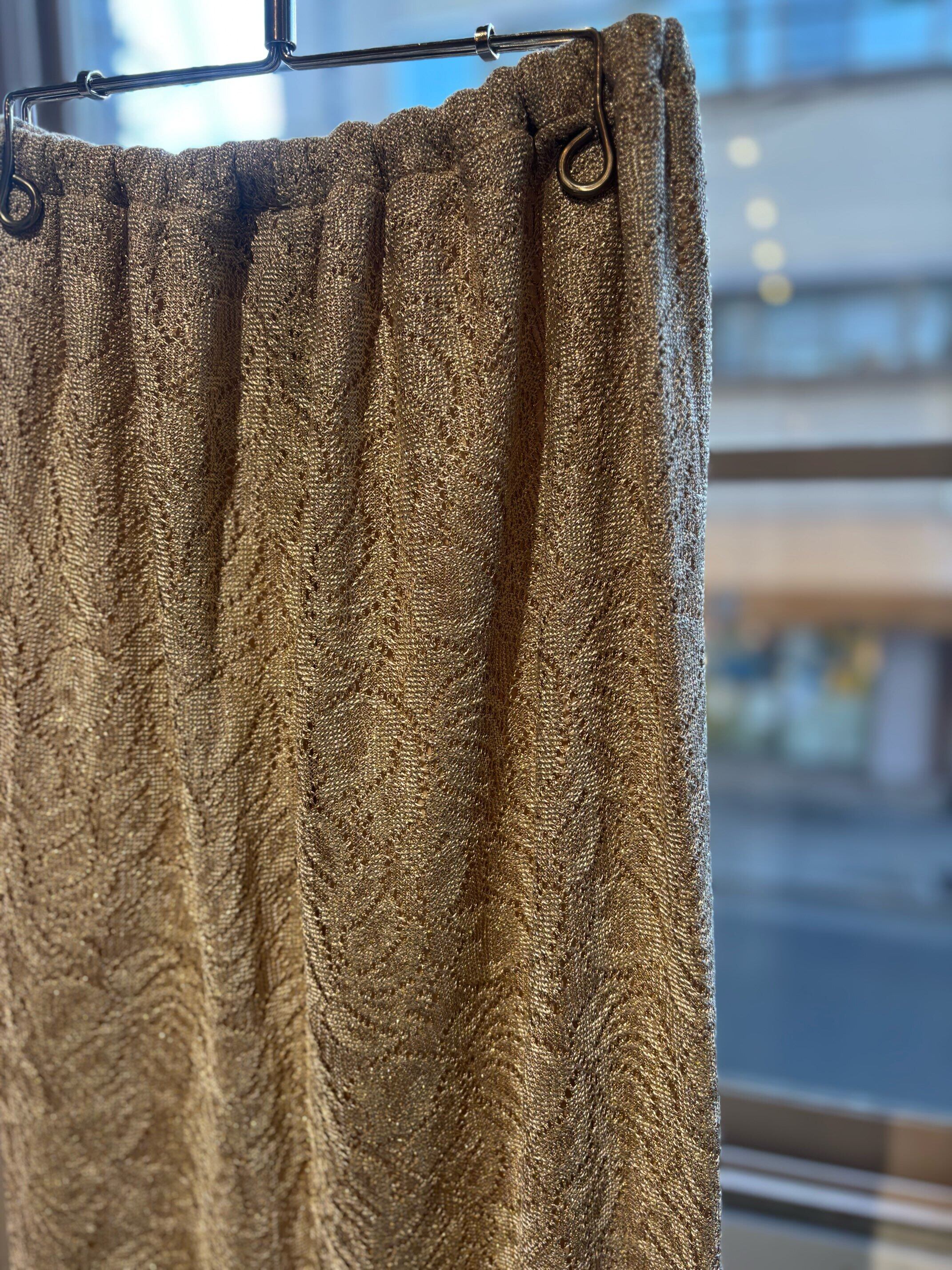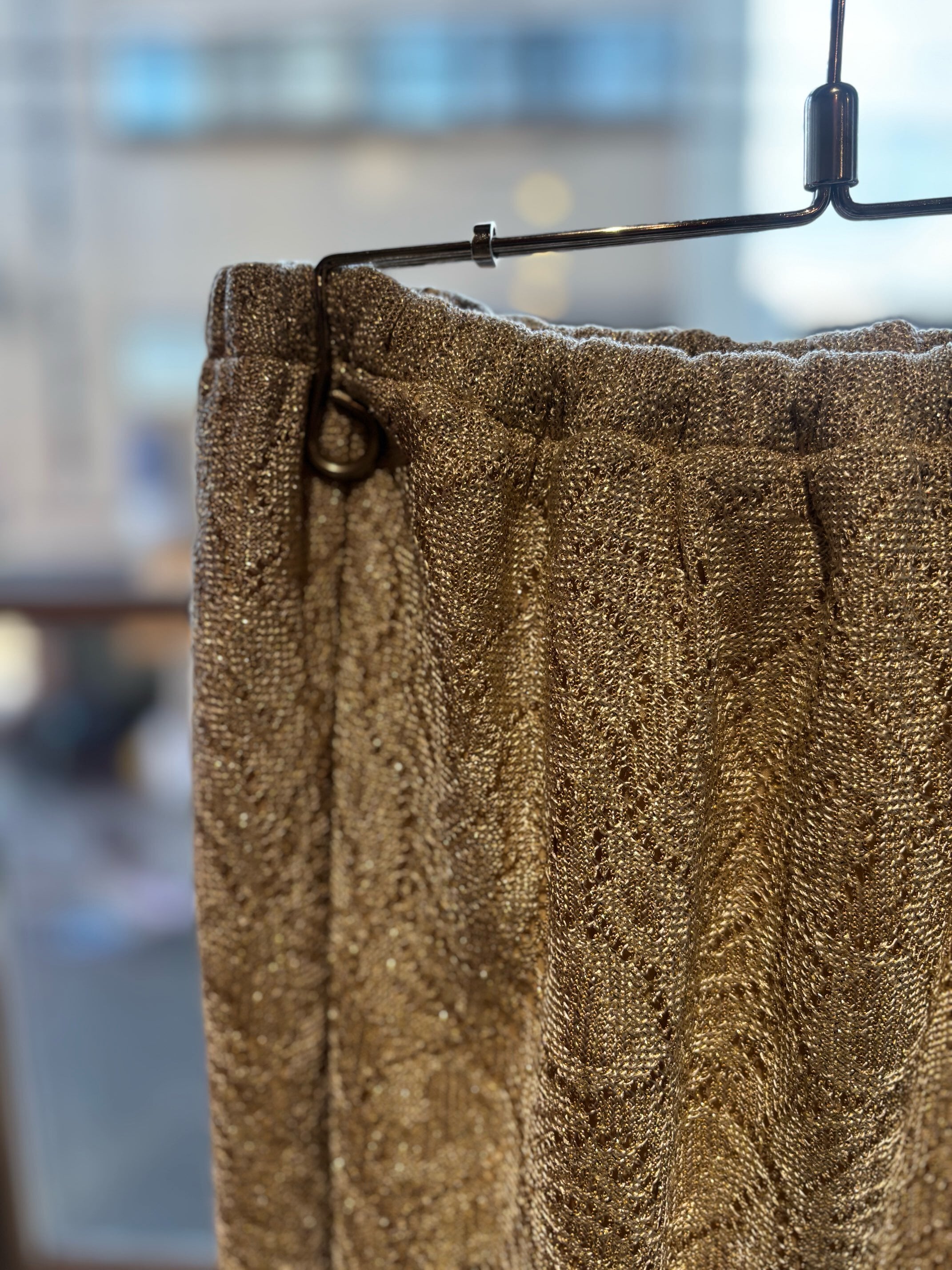 stylingしやすいフリンジスカートですね。ゴールドのようなレースの素材にラメ糸が入っていてキラキラ光るグリッター素材、ウィメンズではずっとトレンドになっているフリンジが付いたとても可愛いスカートです。