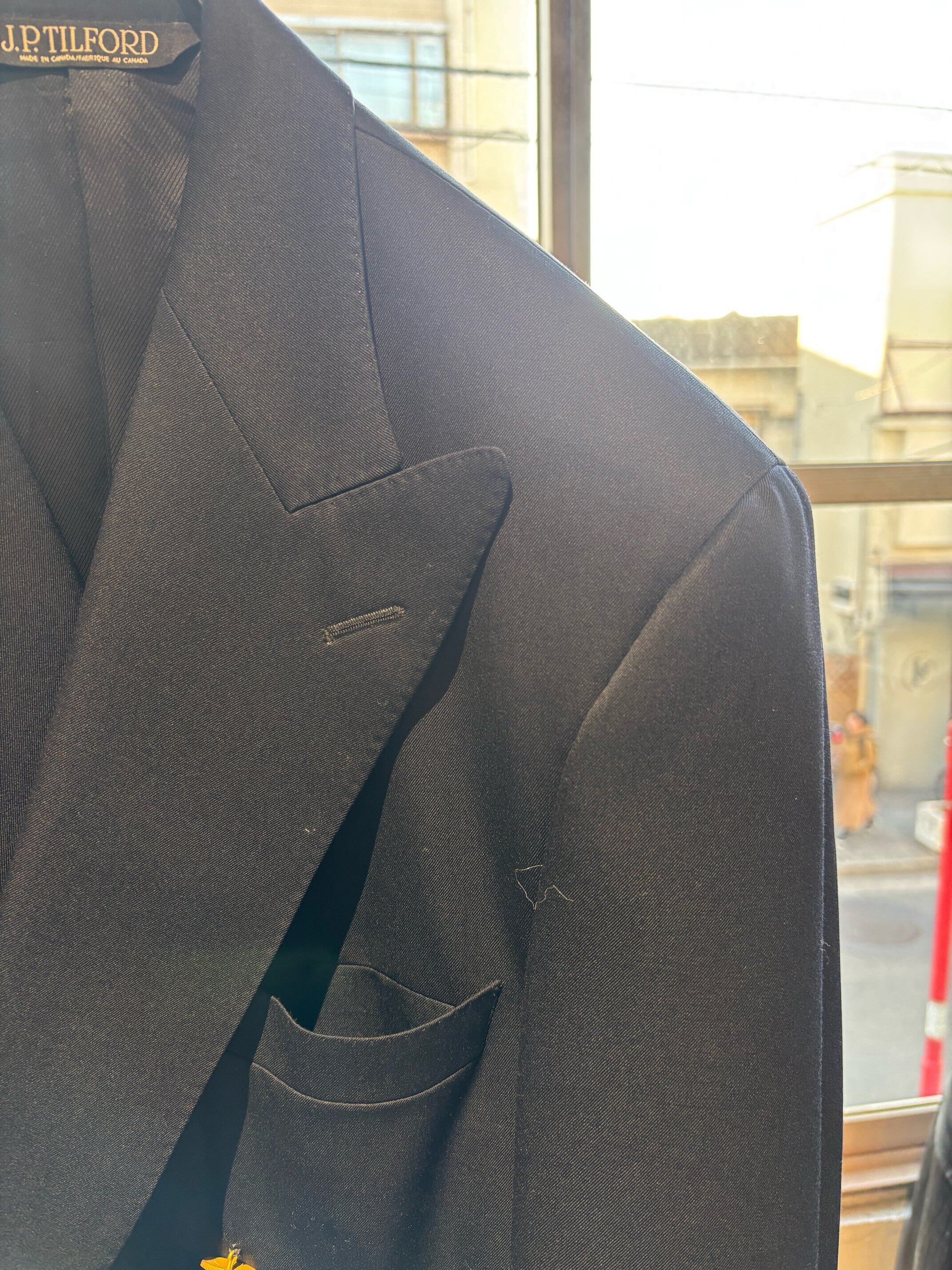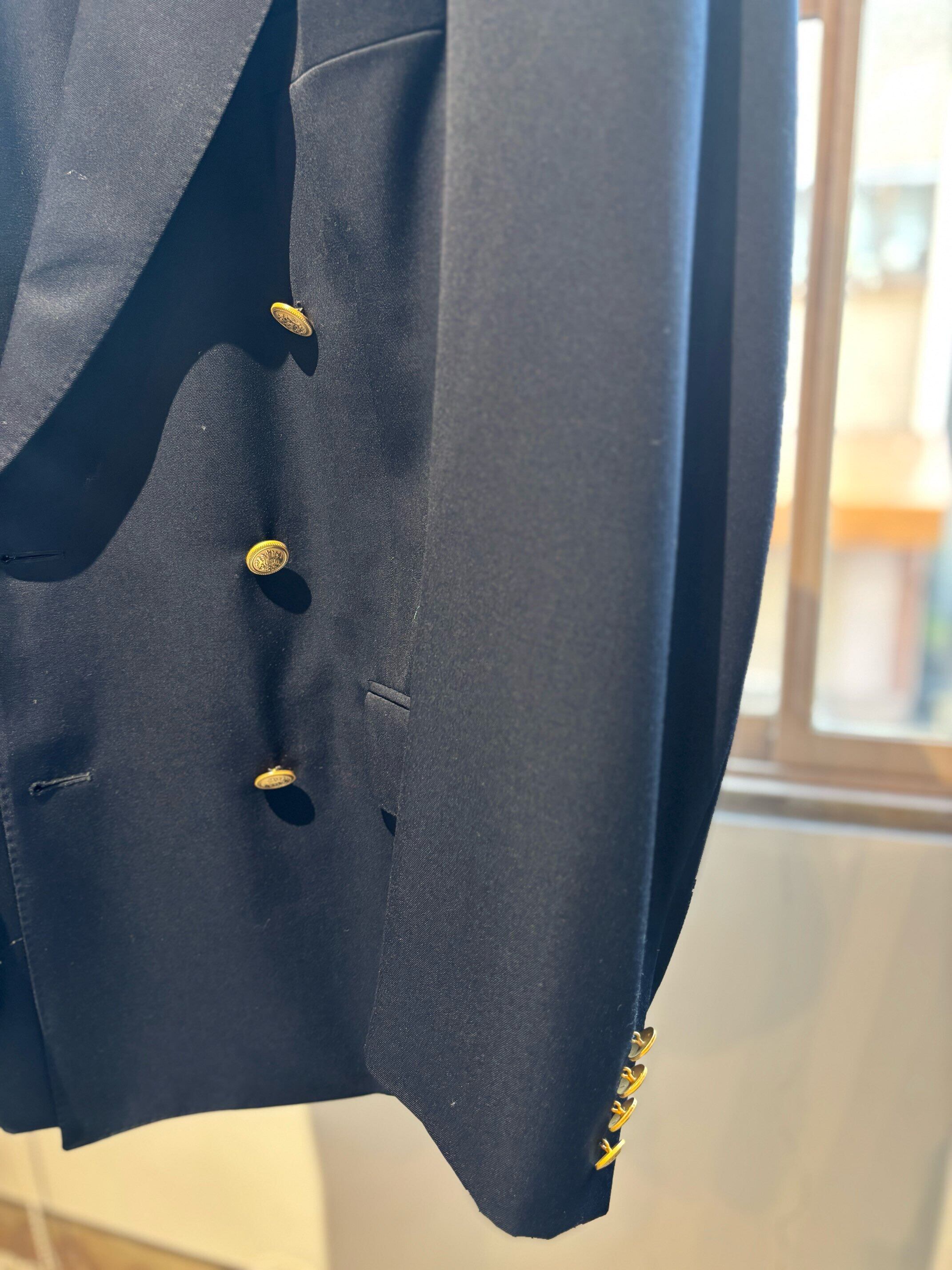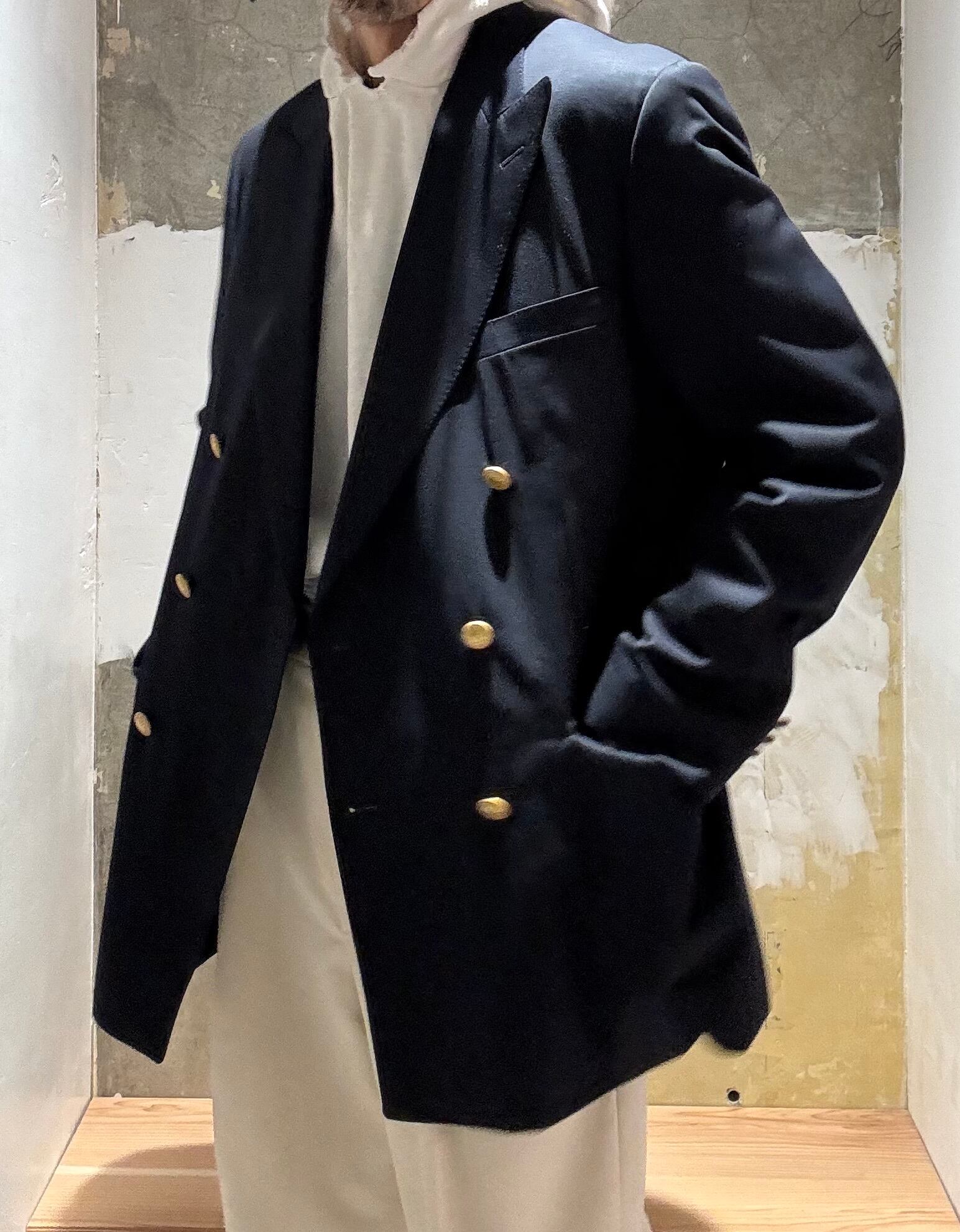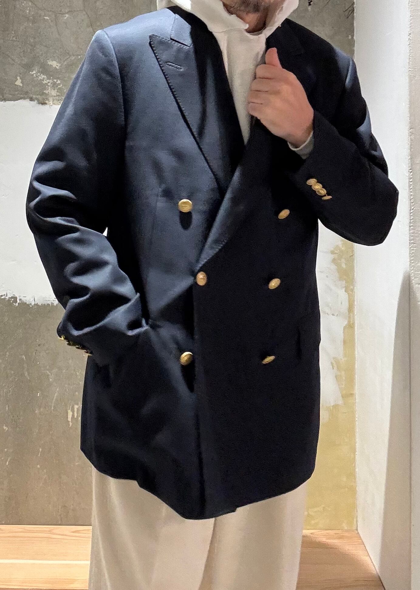 モントリオールの名門テーラーのサミュエルソンが製造したジャケットのようで、スーパー120'sの細番手の高級生地に、定番のサージ織り、クラシックな6つボタンダブルブレスト、サイドベンツ。ラペルもクラシック過ぎない良い塩梅のワイドラペル、着心地がとにかく軽く着やすいので毛芯なとの副資材もかなり良い素材のものを使っていると思います。