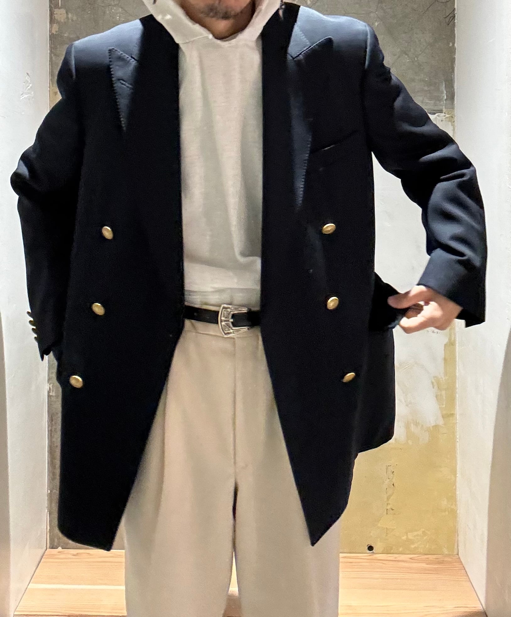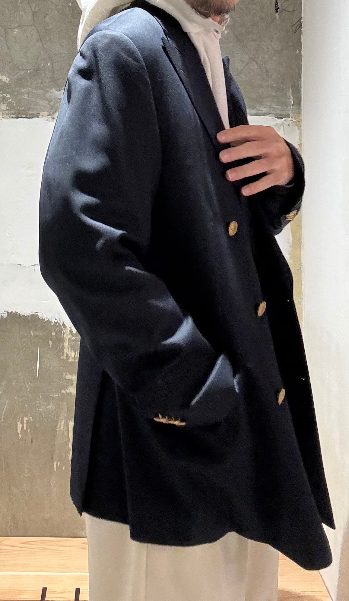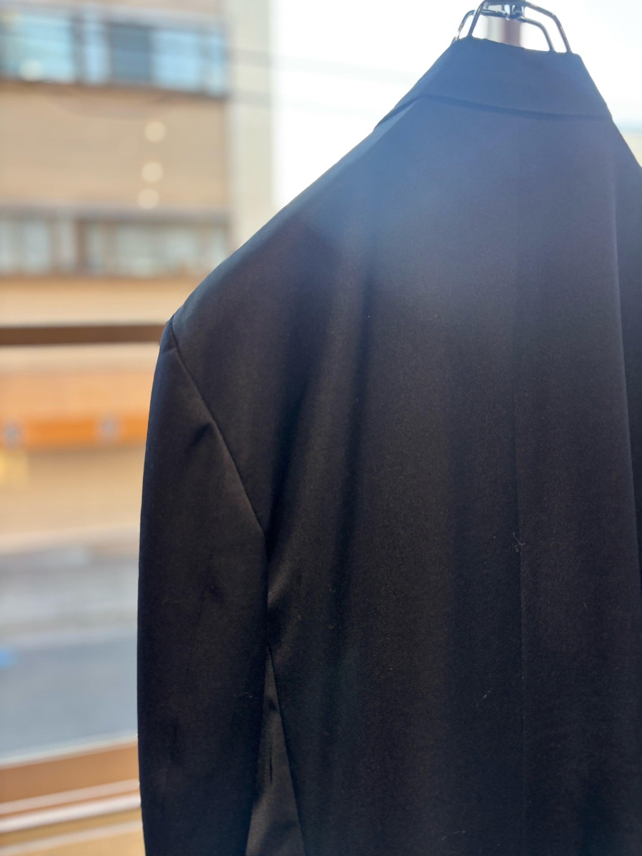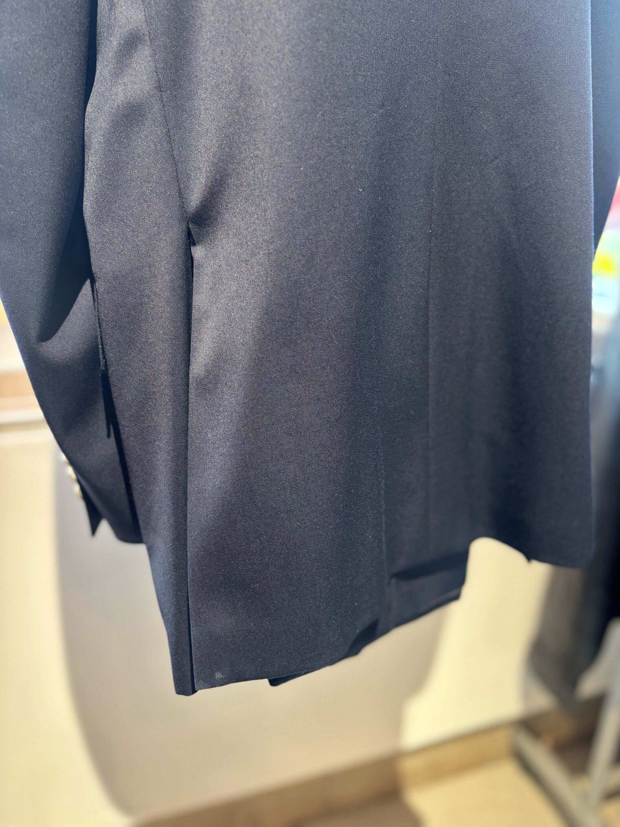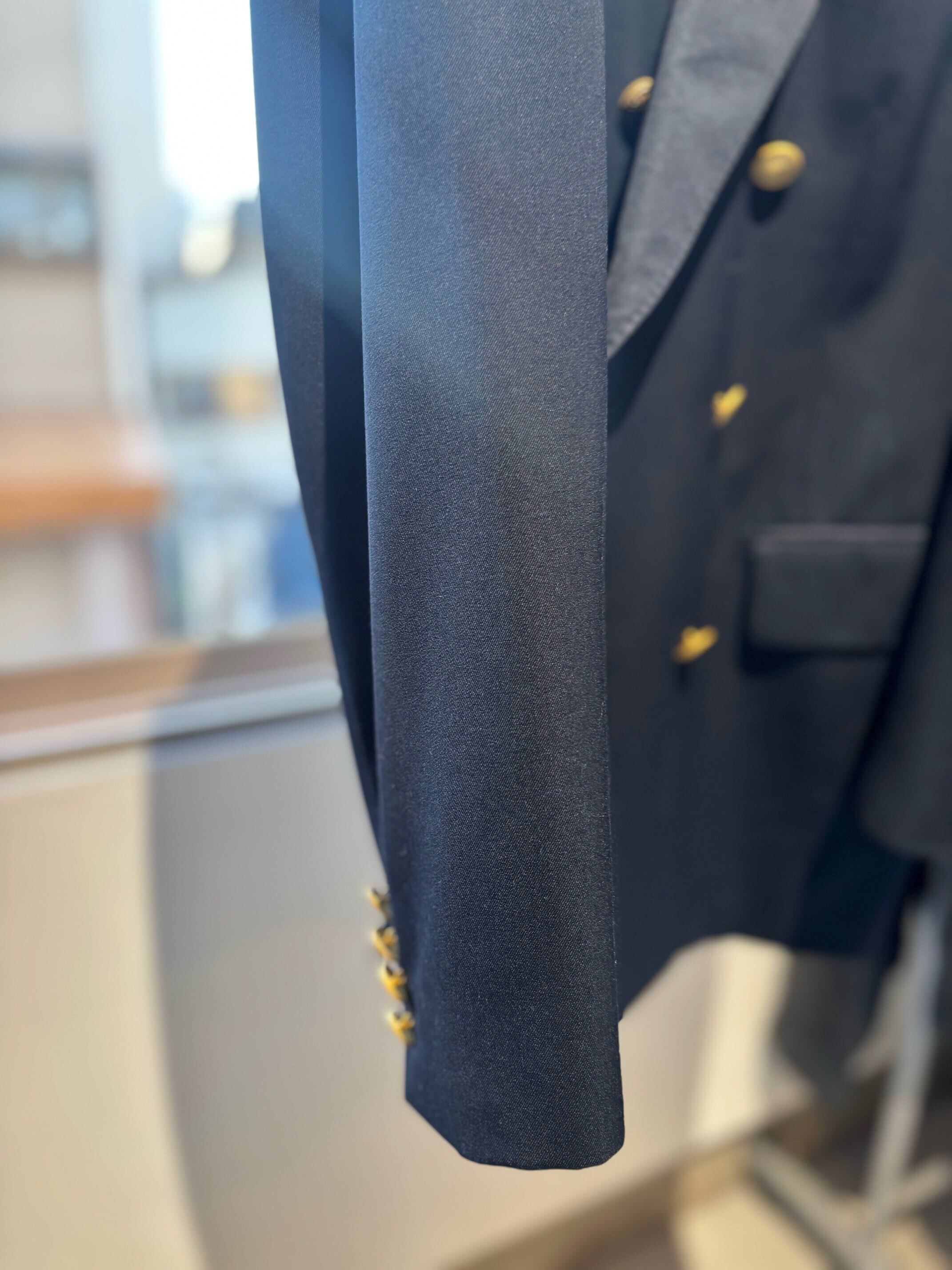 モントリオールの名門テーラーのサミュエルソンが製造したジャケットのようで、スーパー120'sの細番手の高級生地に、定番のサージ織り、クラシックな6つボタンダブルブレスト、サイドベンツ。ラペルもクラシック過ぎない良い塩梅のワイドラペル、着心地がとにかく軽く着やすいので毛芯なとの副資材もかなり良い素材のものを使っていると思います。