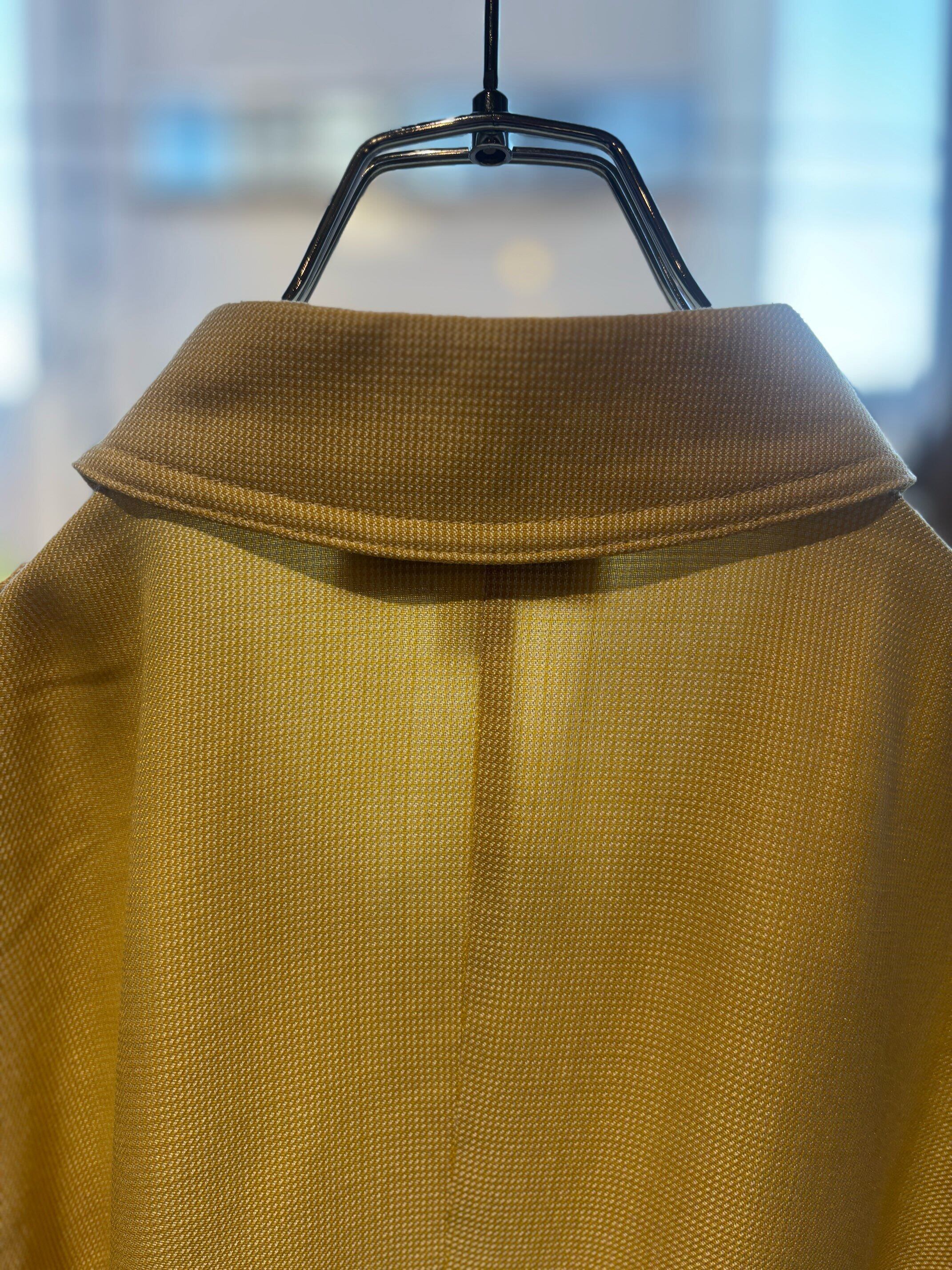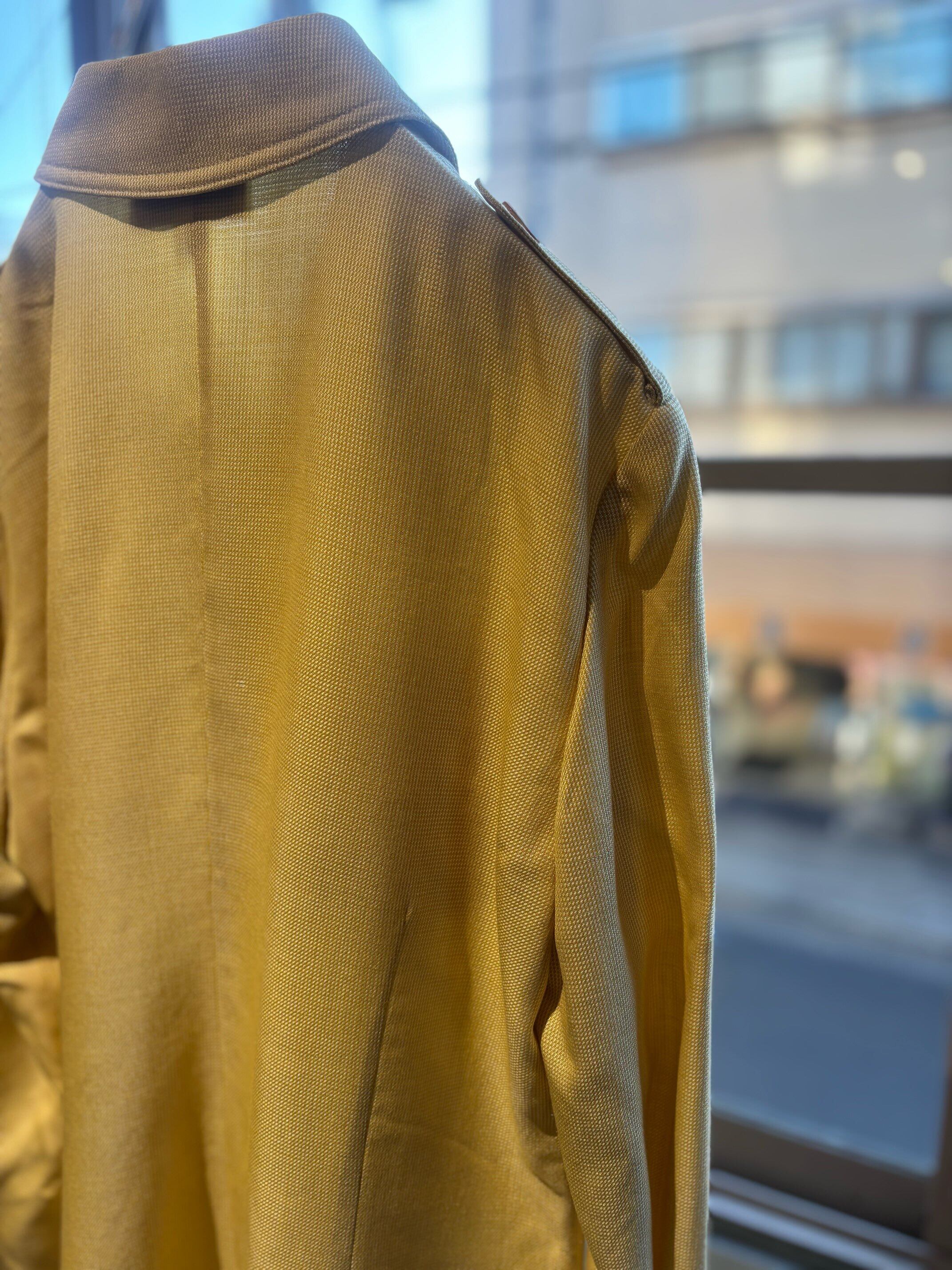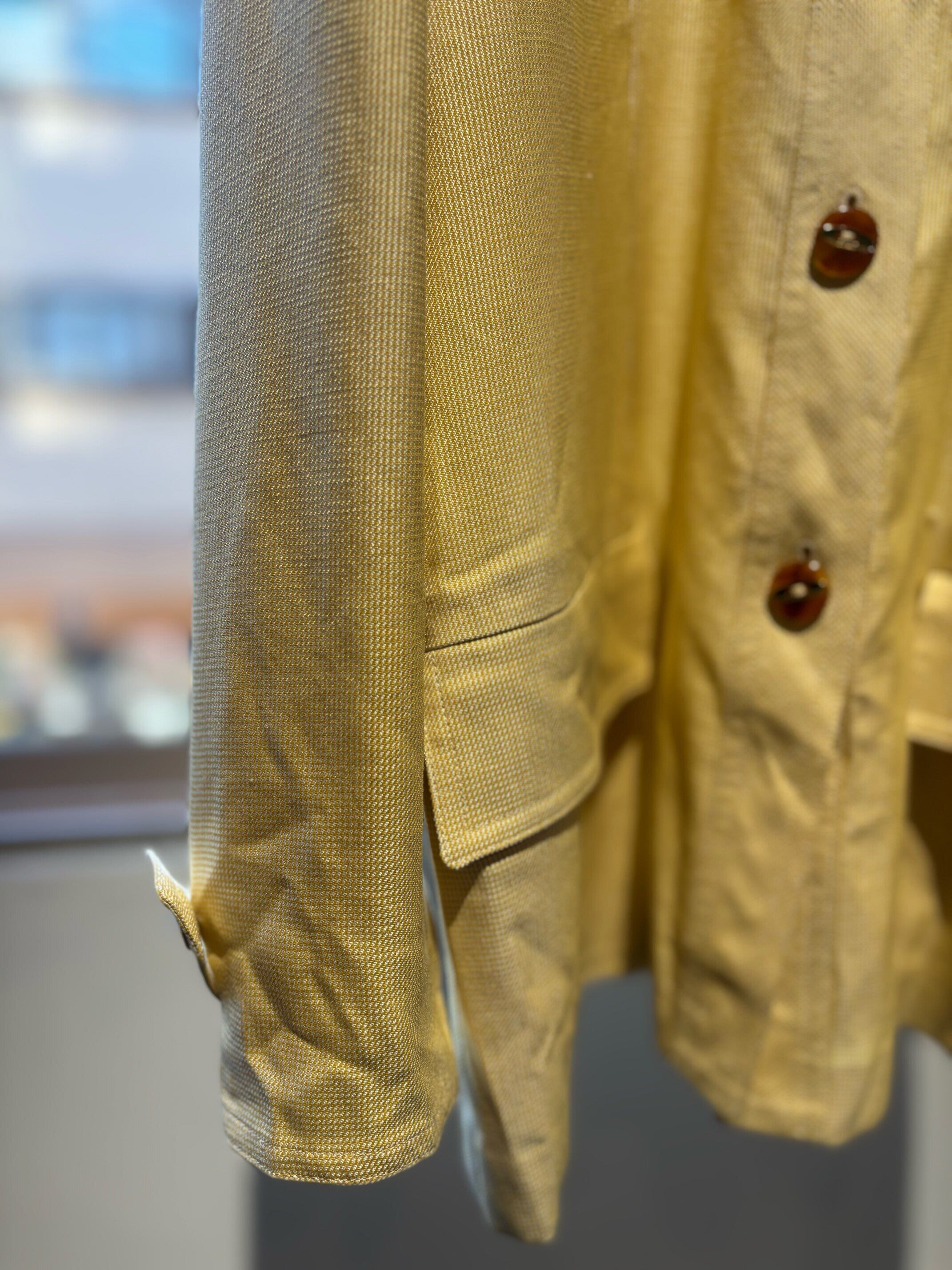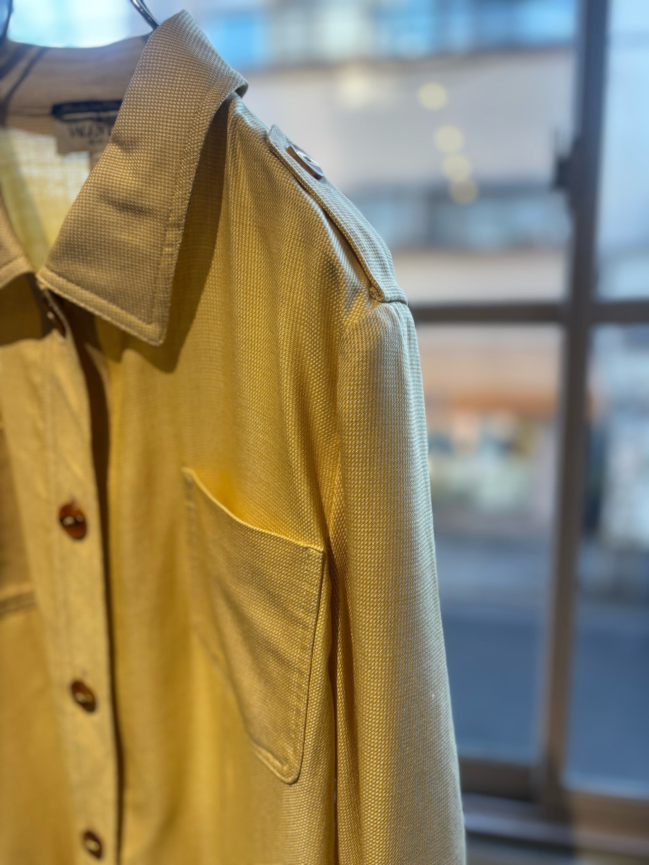 記載が無いので定かでは無いですが、生地はシルクだと思います。今期のトレンドカラーの一つでもあるイエローのサファリシャツジャケットをシルク素材と可愛いボタンで上品に仕上げています。