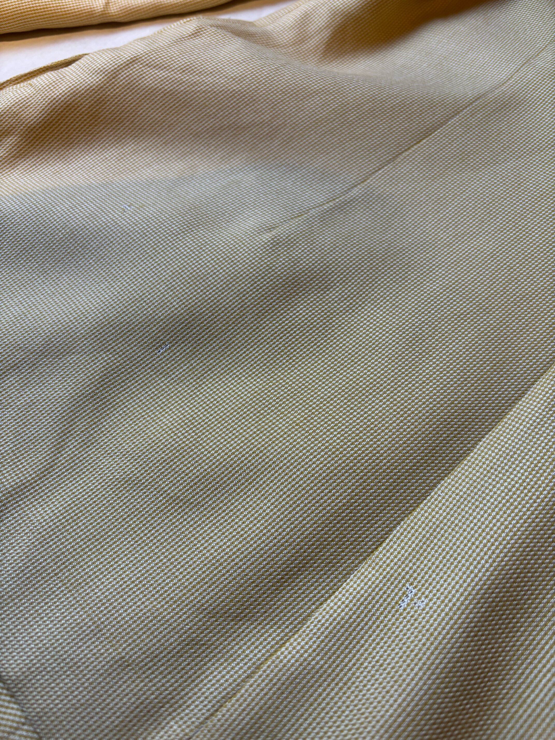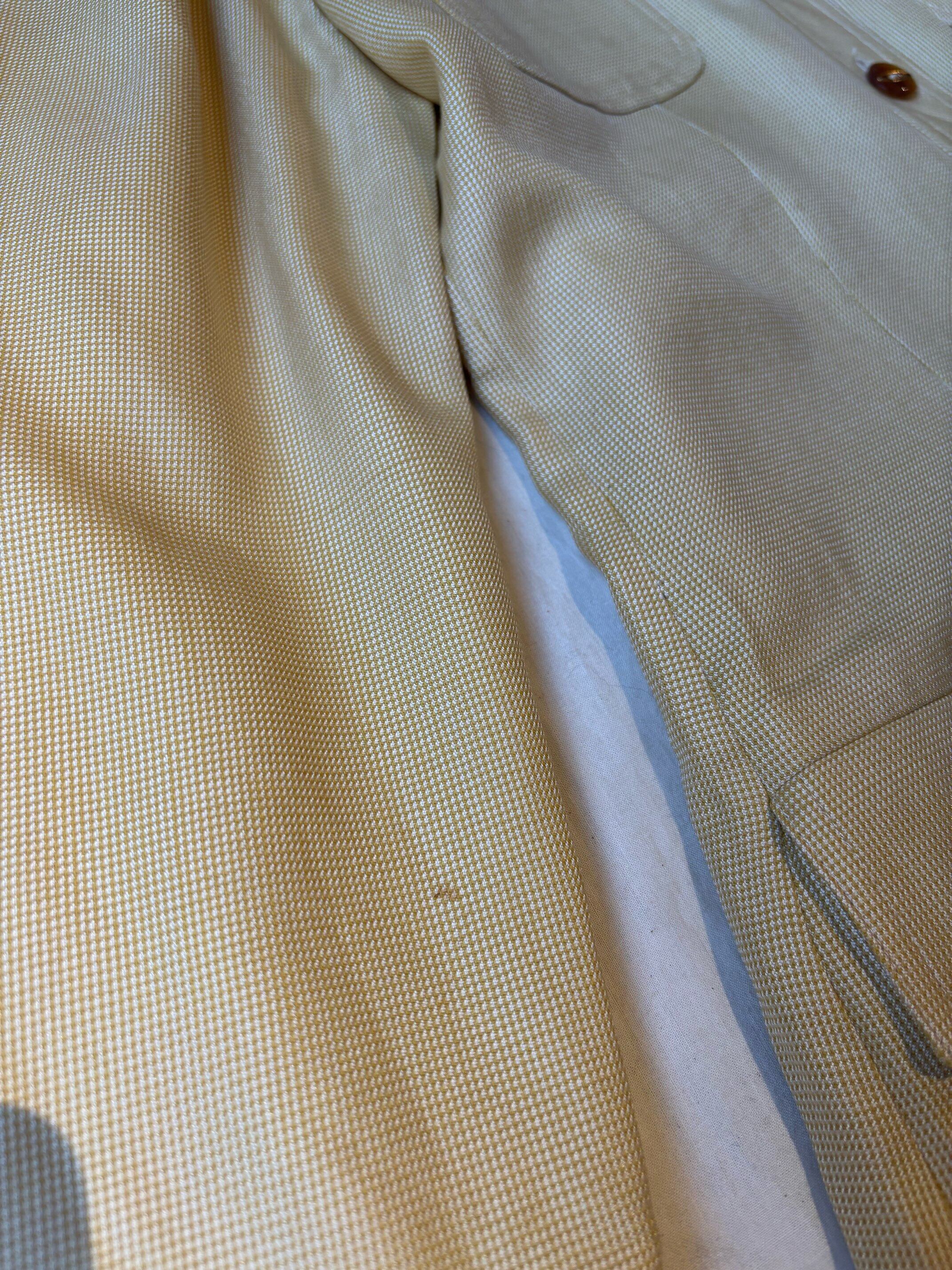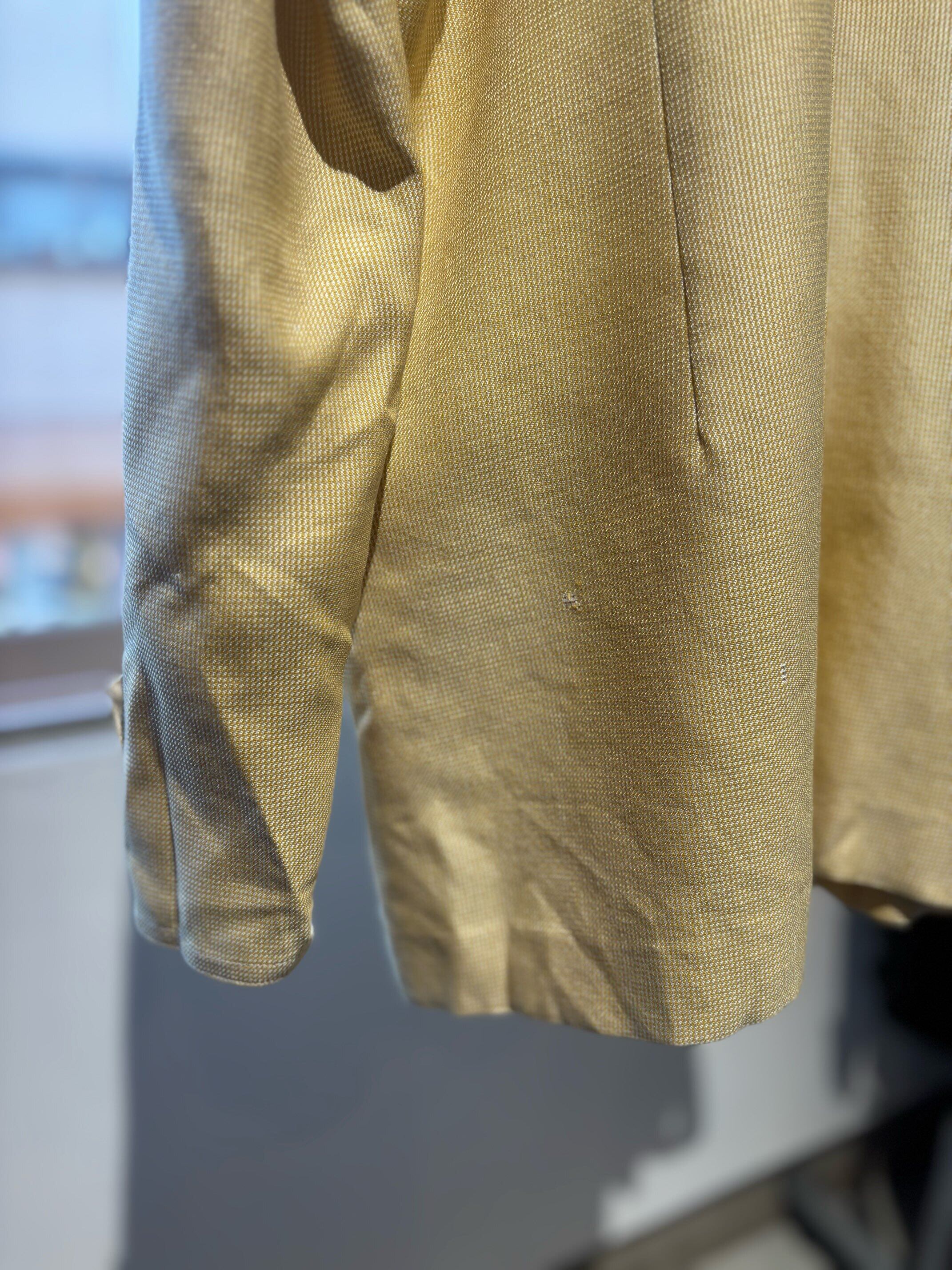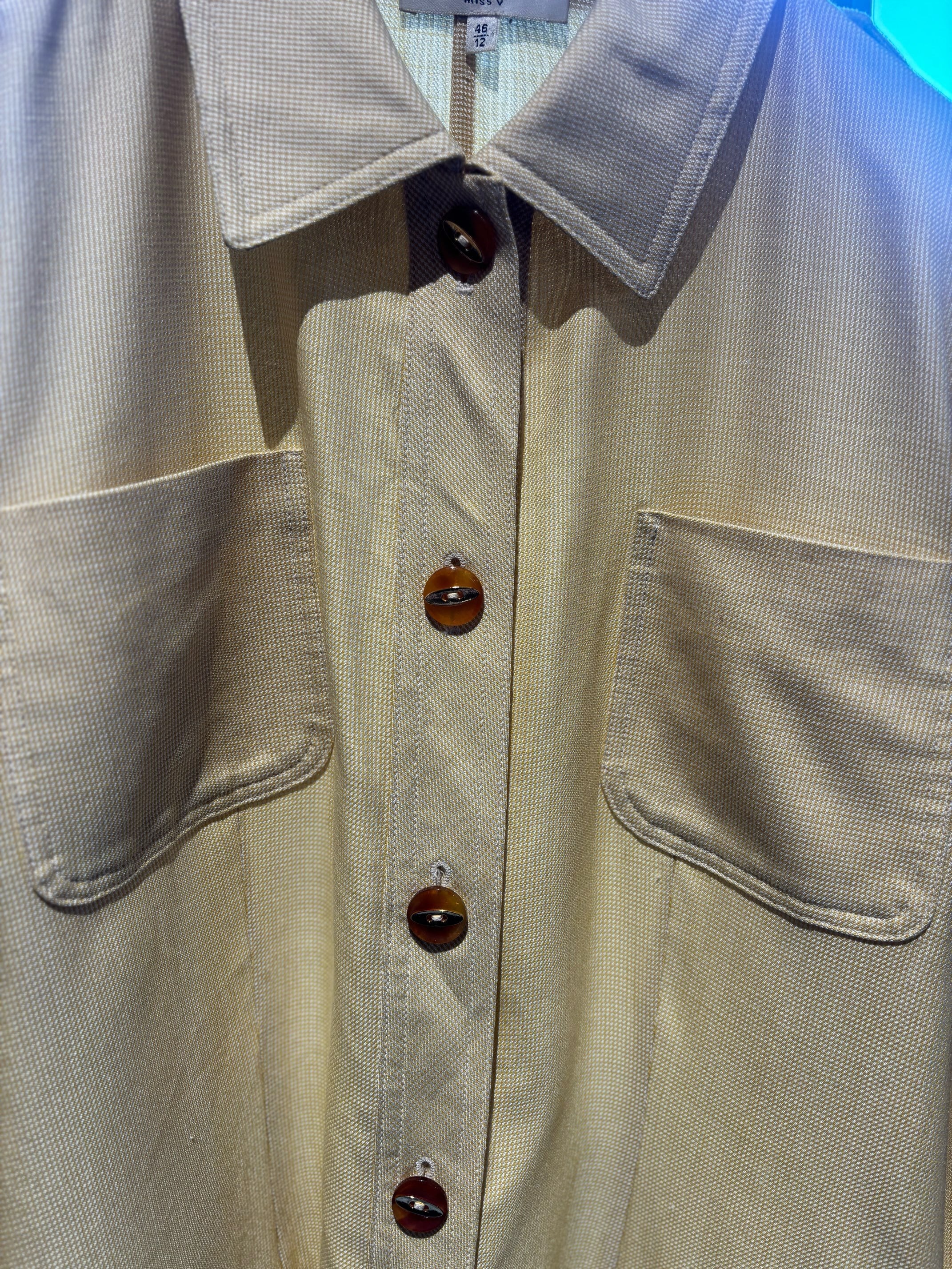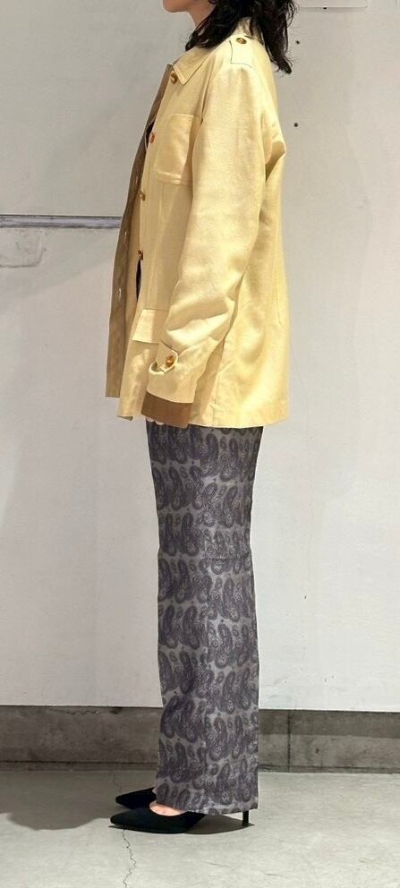 記載が無いので定かでは無いですが、生地はシルクだと思います。今期のトレンドカラーの一つでもあるイエローのサファリシャツジャケットをシルク素材と可愛いボタンで上品に仕上げています。