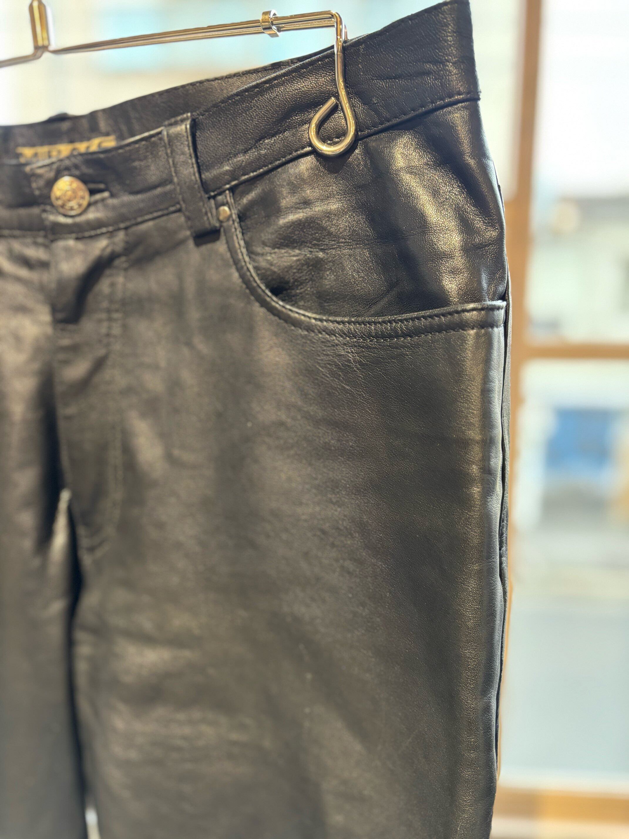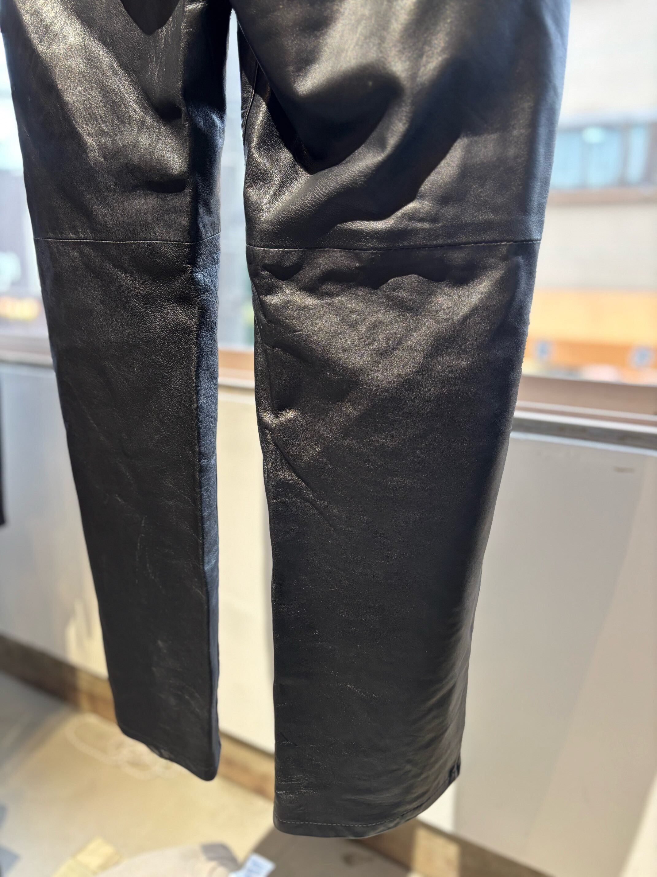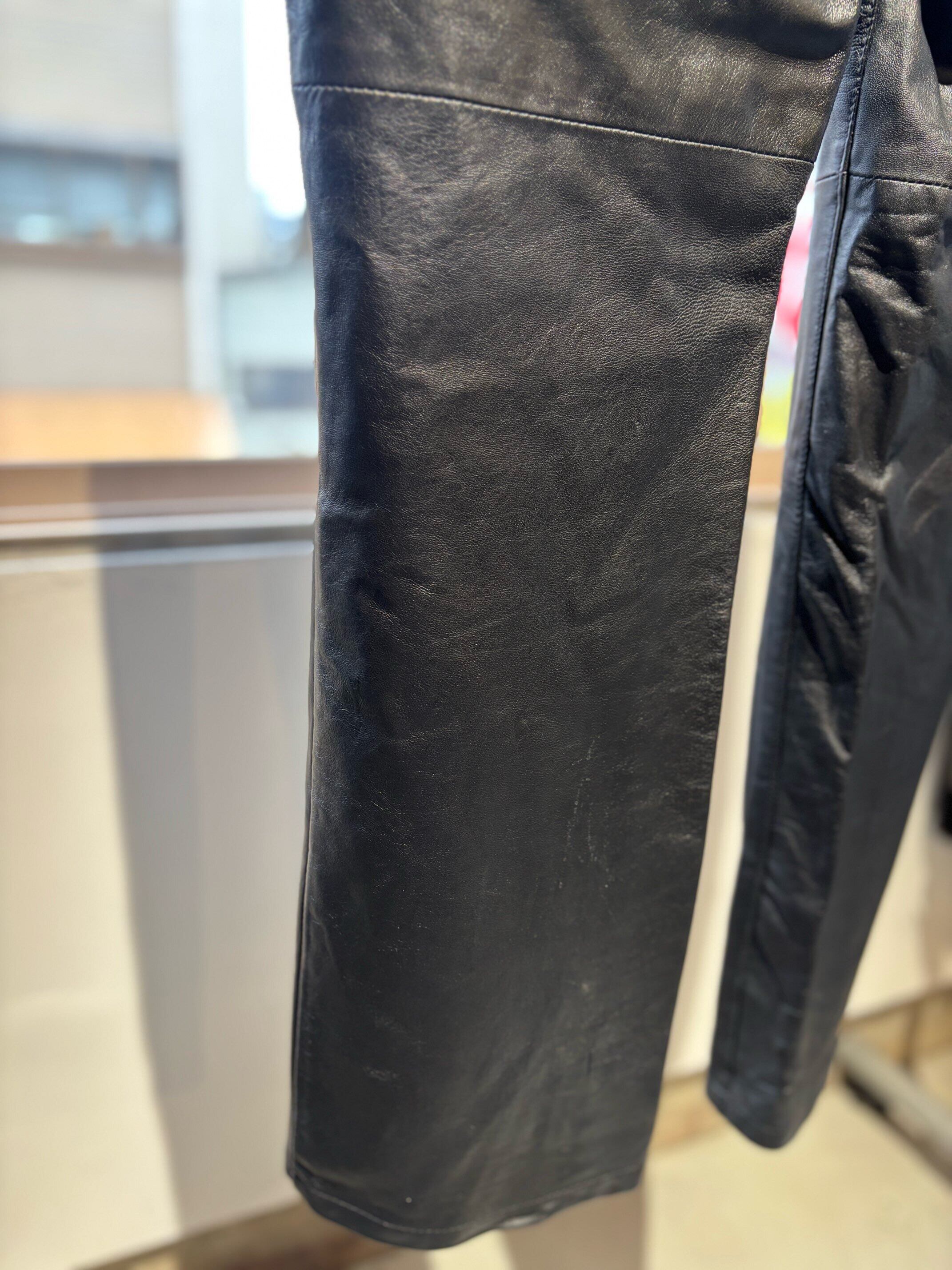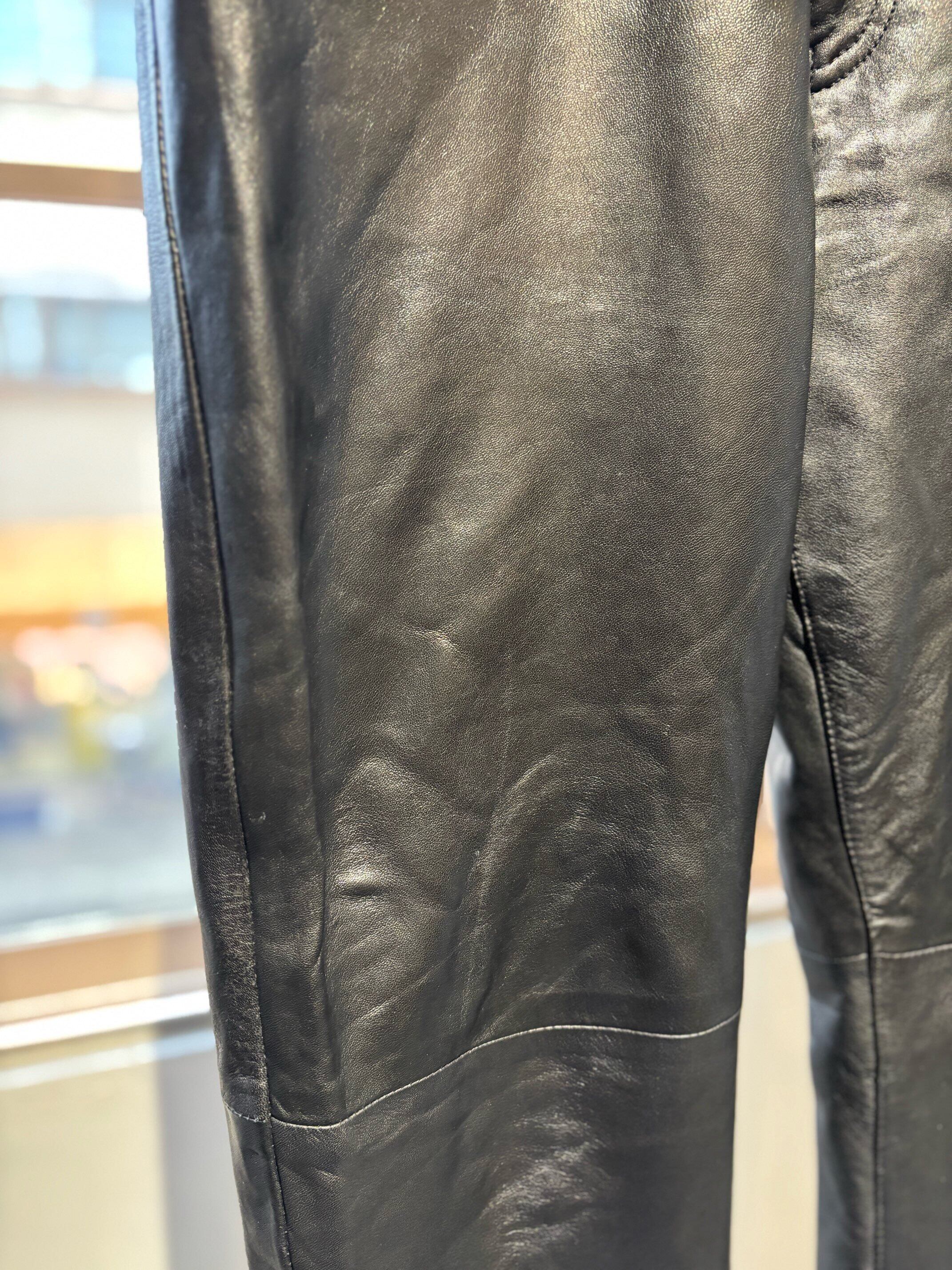個人的なイメージかもしれませんが、古着屋さんのレザーパンツは革がガチガチに固いものや、テーパードが効きすぎて細すぎるものが多い印象ですが、こちらは綺麗なシルエットで若干のゆとりも持って履ける、履きやすいレザーパンツだと思います。