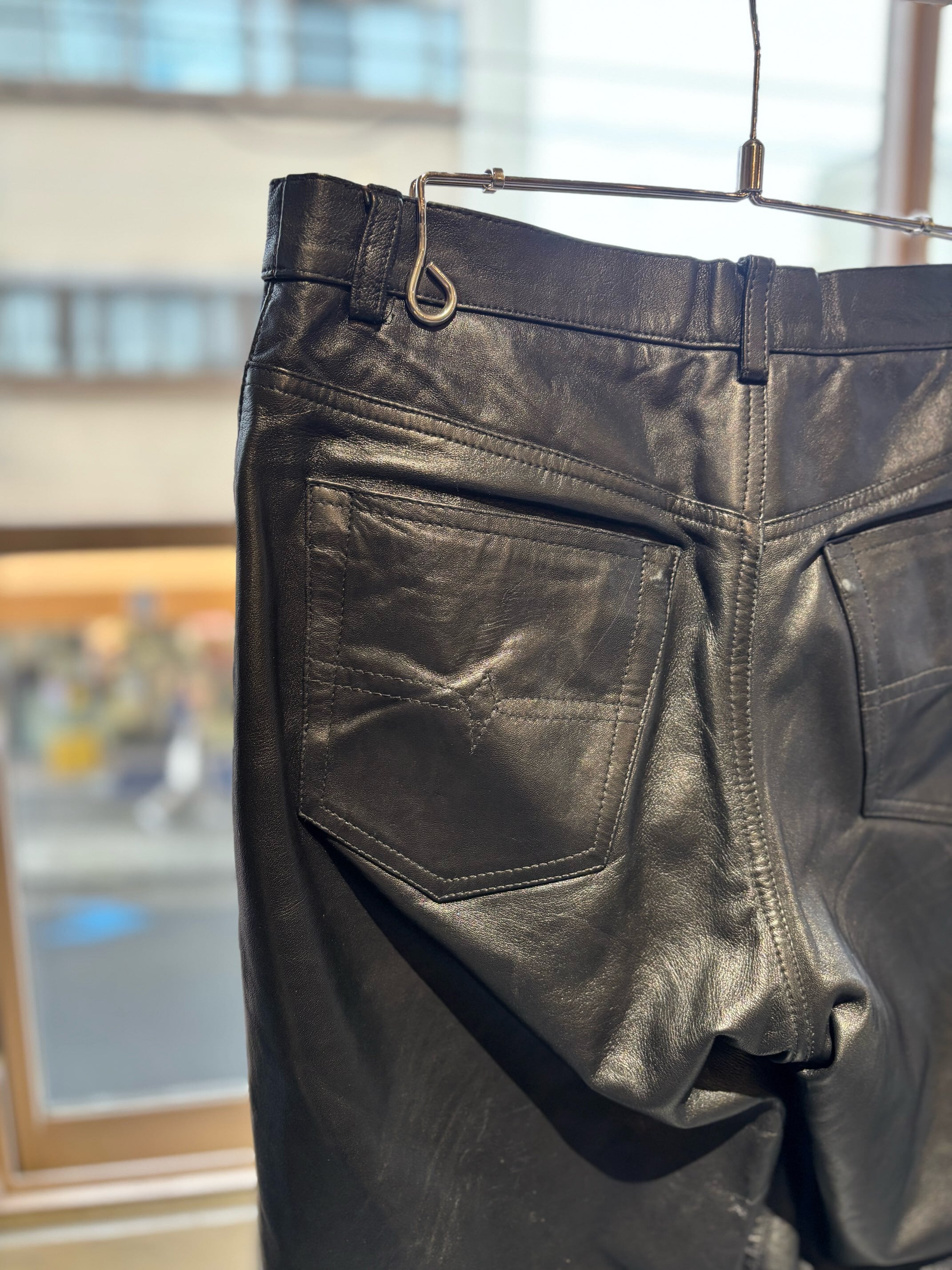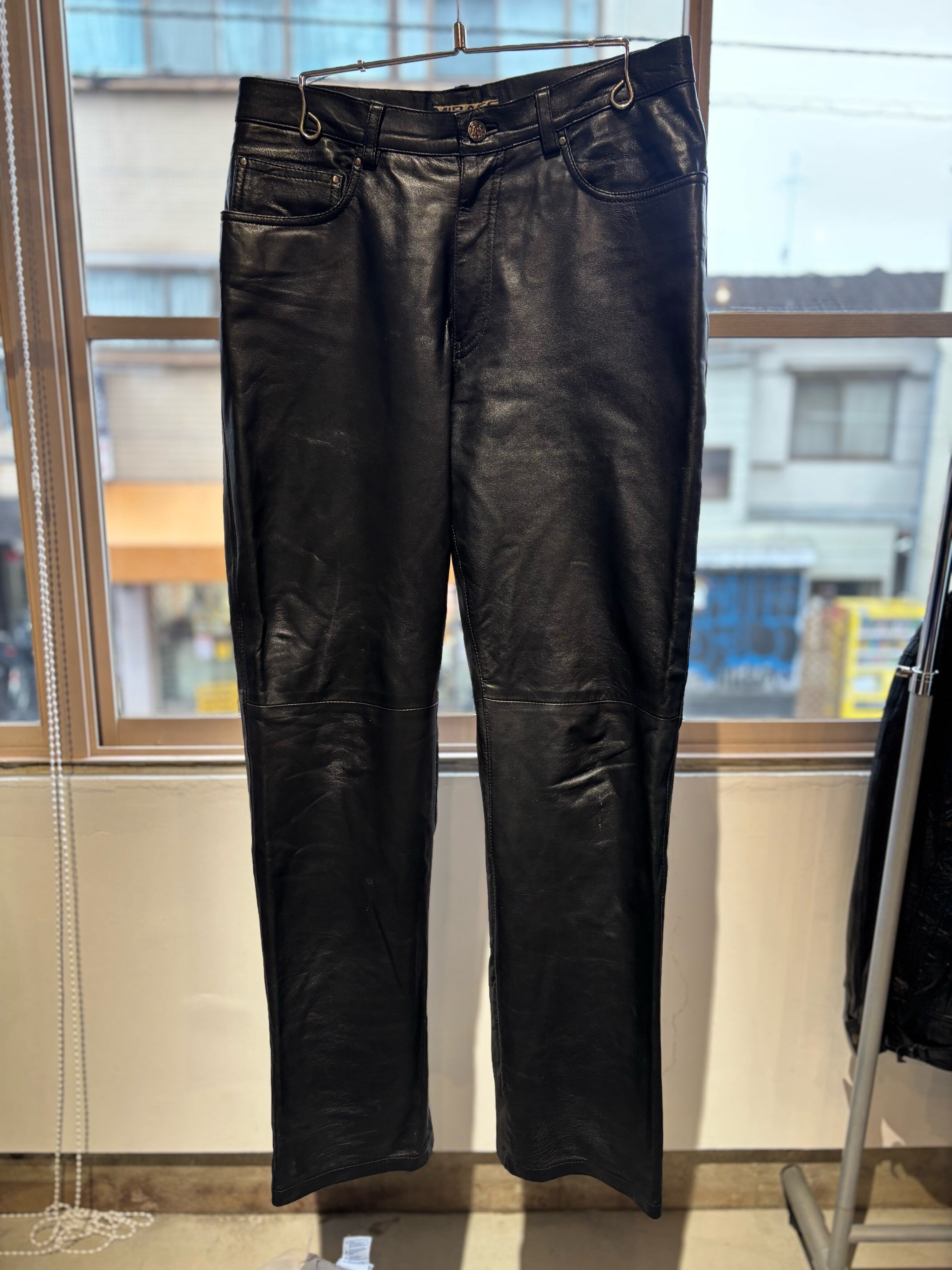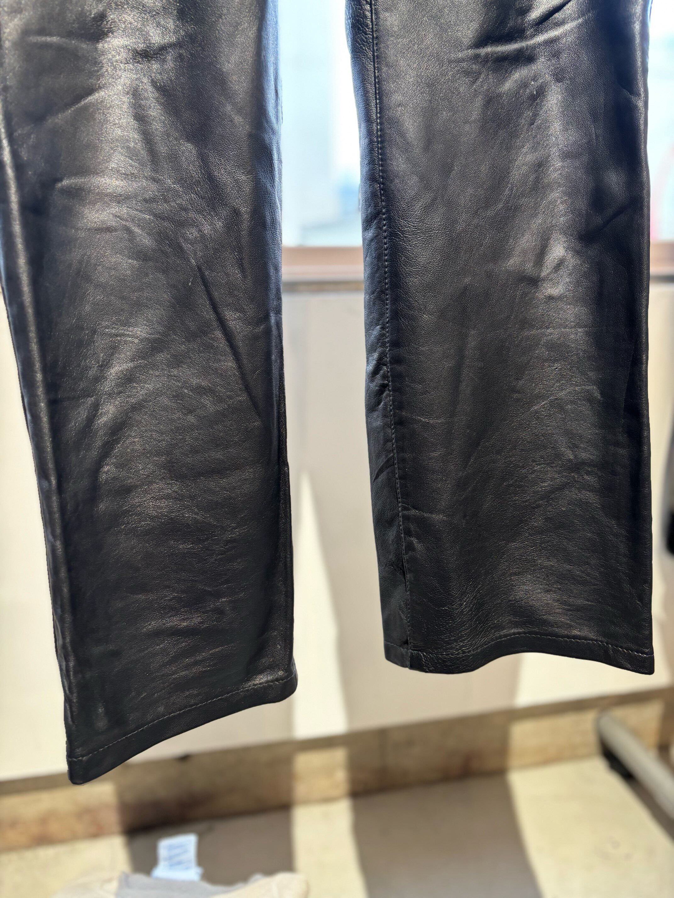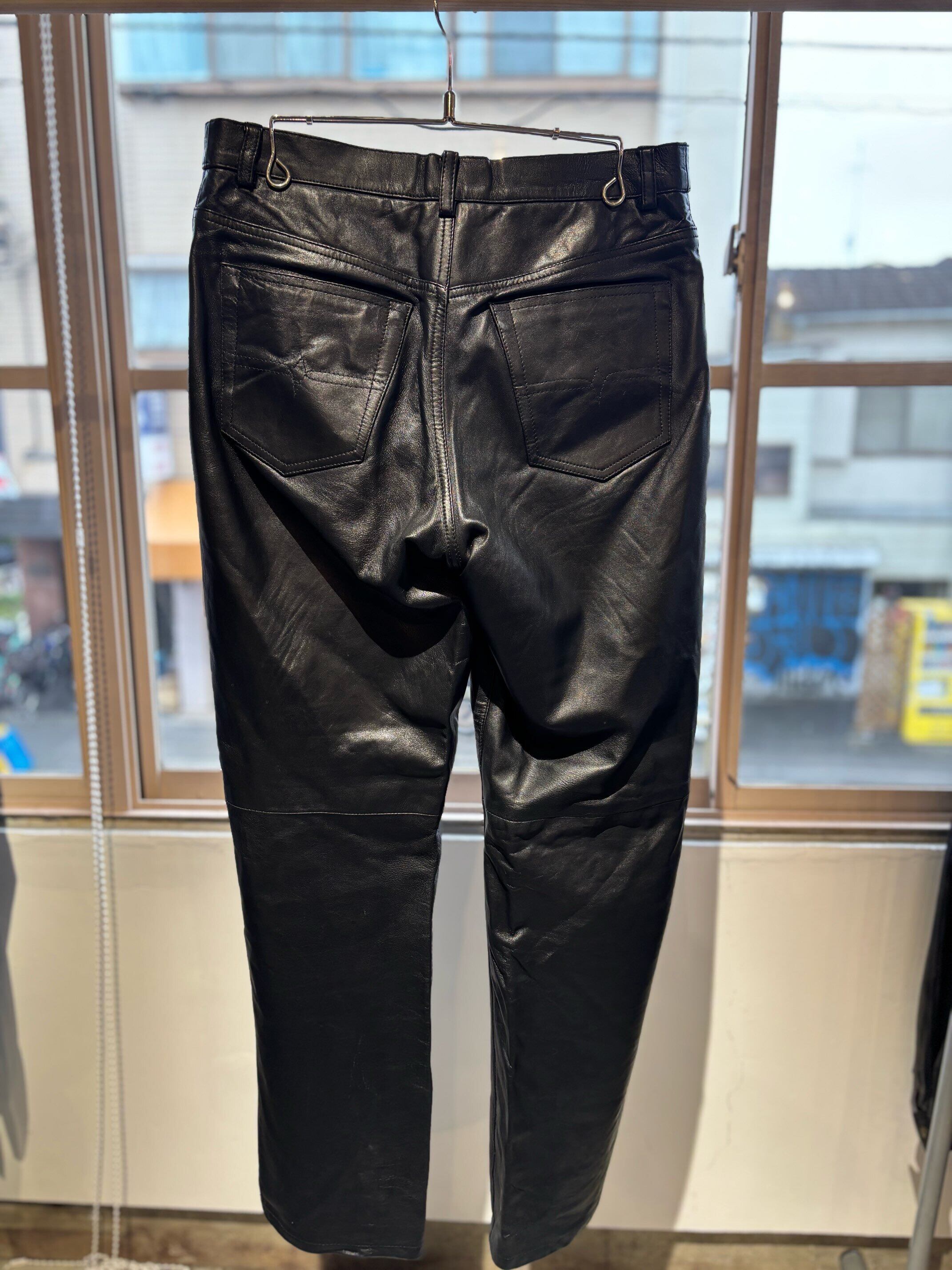 個人的なイメージかもしれませんが、古着屋さんのレザーパンツは革がガチガチに固いものや、テーパードが効きすぎて細すぎるものが多い印象ですが、こちらは綺麗なシルエットで若干のゆとりも持って履ける、履きやすいレザーパンツだと思います。