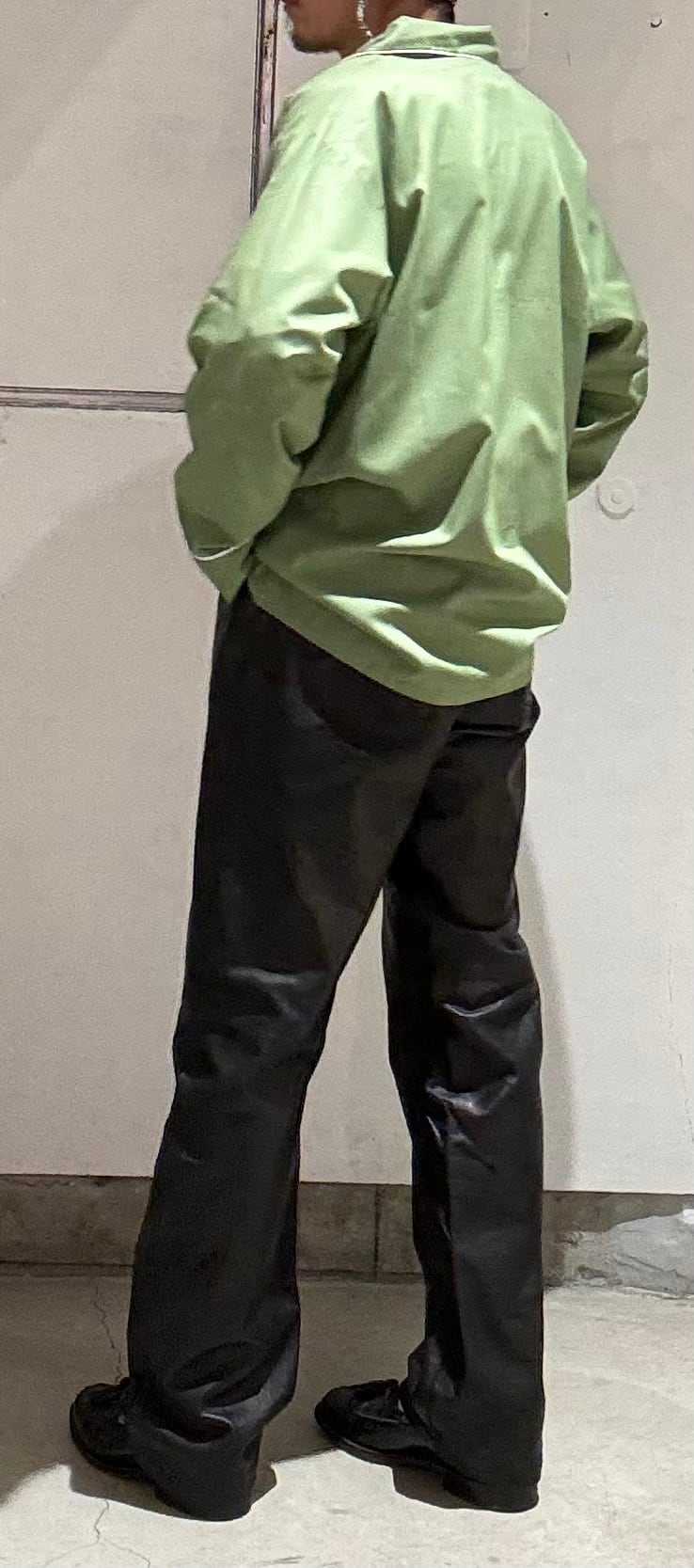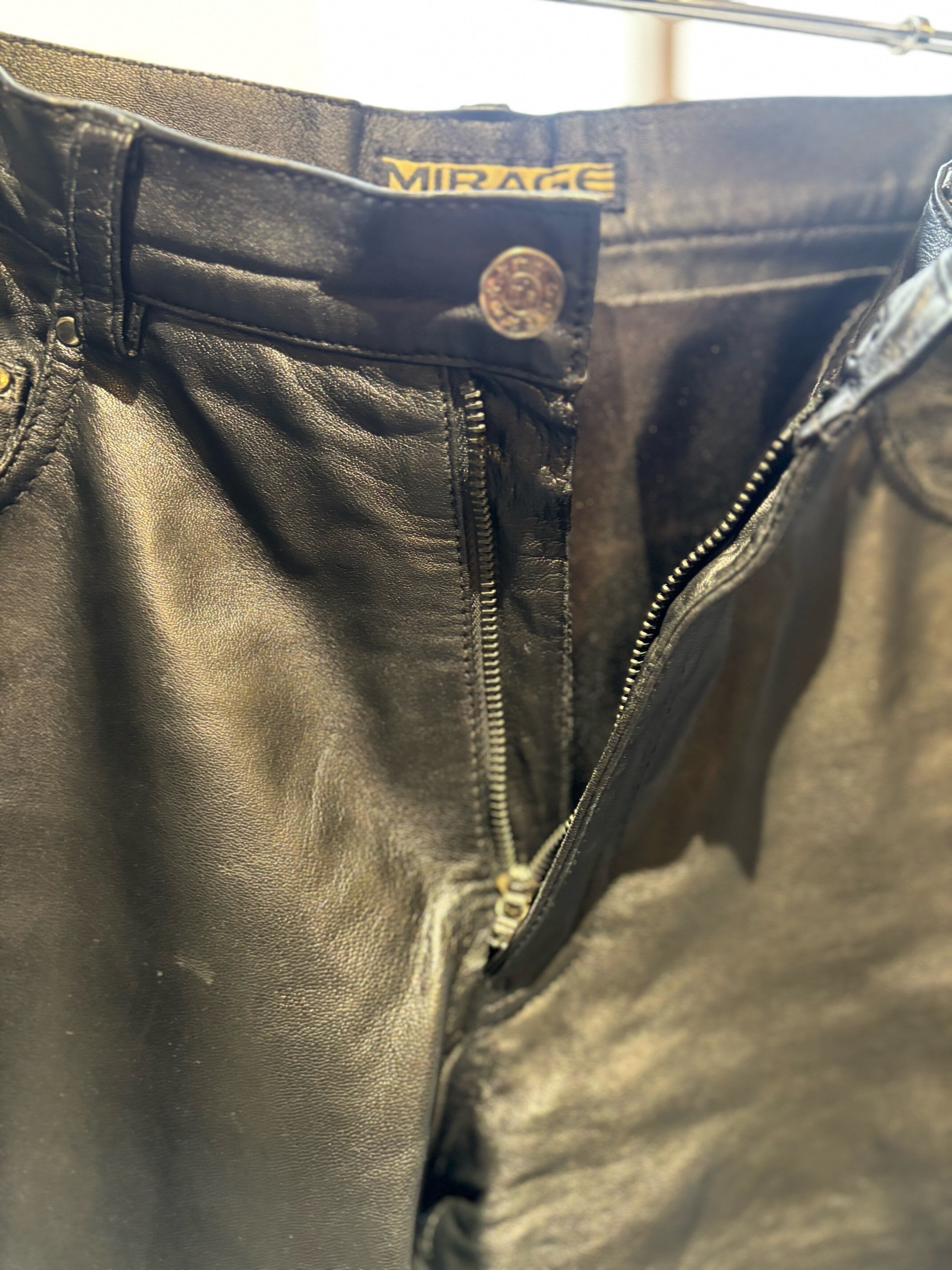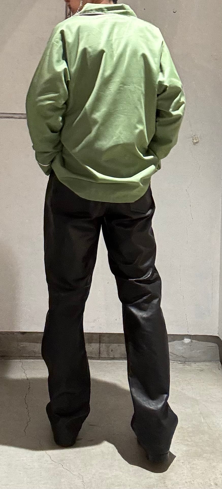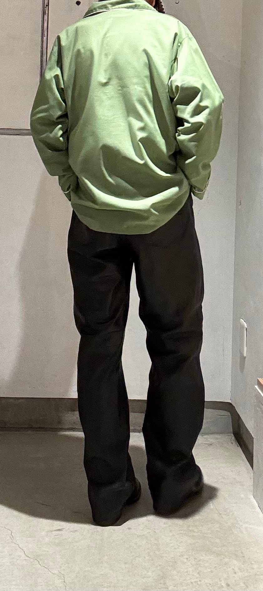 個人的なイメージかもしれませんが、古着屋さんのレザーパンツは革がガチガチに固いものや、テーパードが効きすぎて細すぎるものが多い印象ですが、こちらは綺麗なシルエットで若干のゆとりも持って履ける、履きやすいレザーパンツだと思います。
