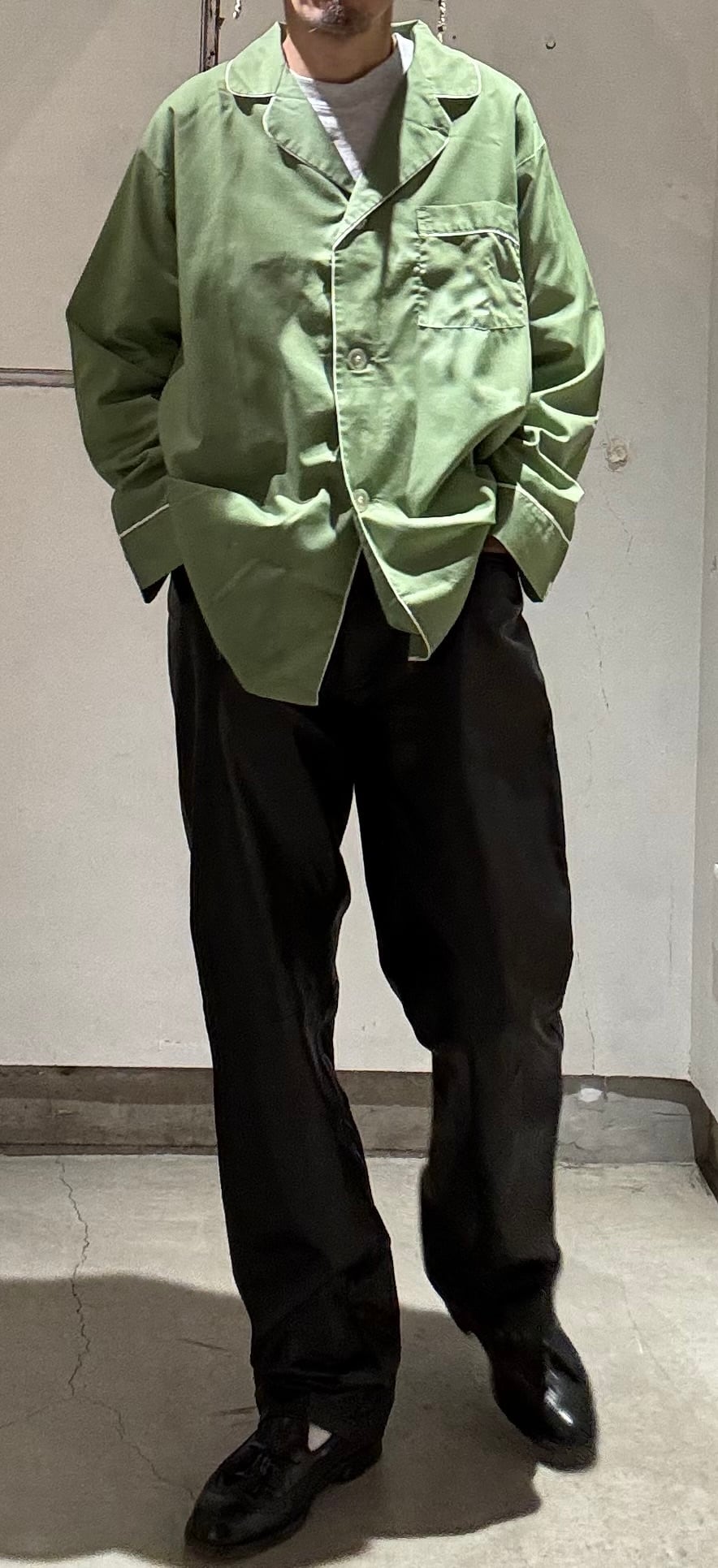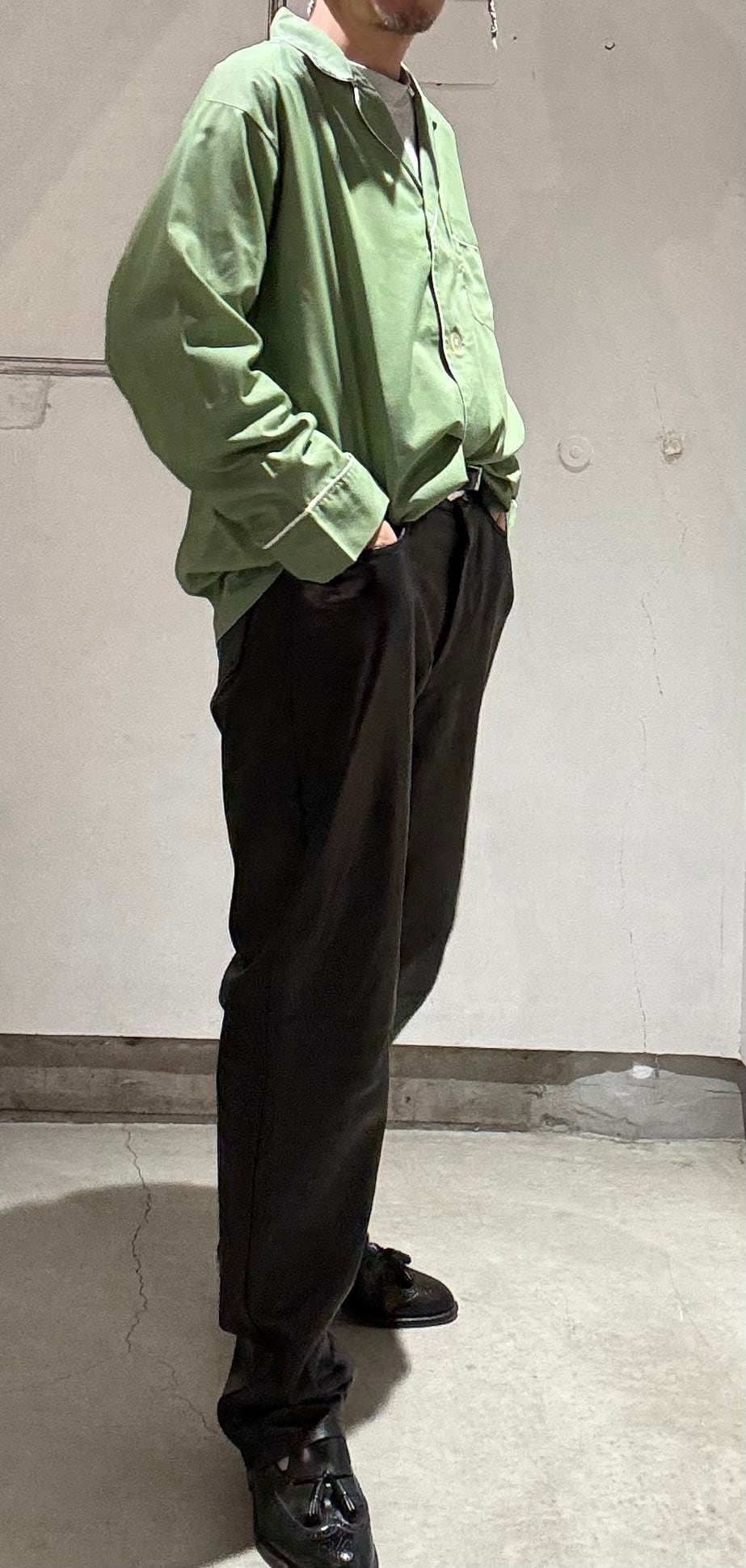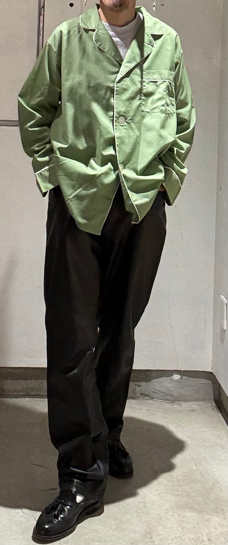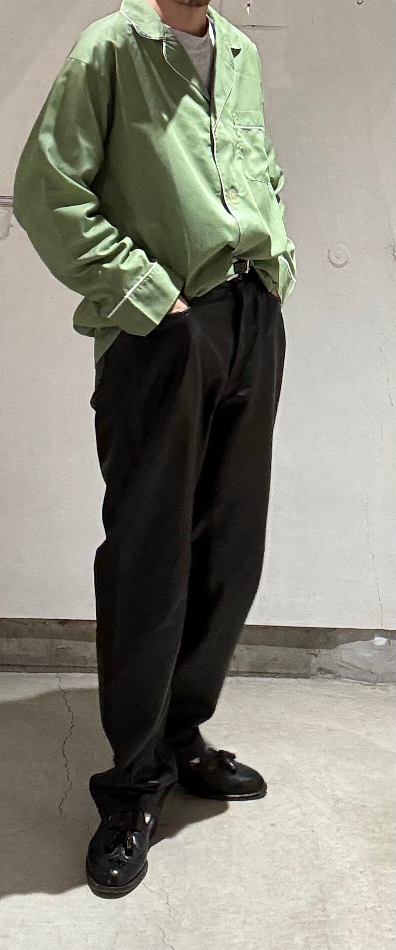 個人的なイメージかもしれませんが、古着屋さんのレザーパンツは革がガチガチに固いものや、テーパードが効きすぎて細すぎるものが多い印象ですが、こちらは綺麗なシルエットで若干のゆとりも持って履ける、履きやすいレザーパンツだと思います。