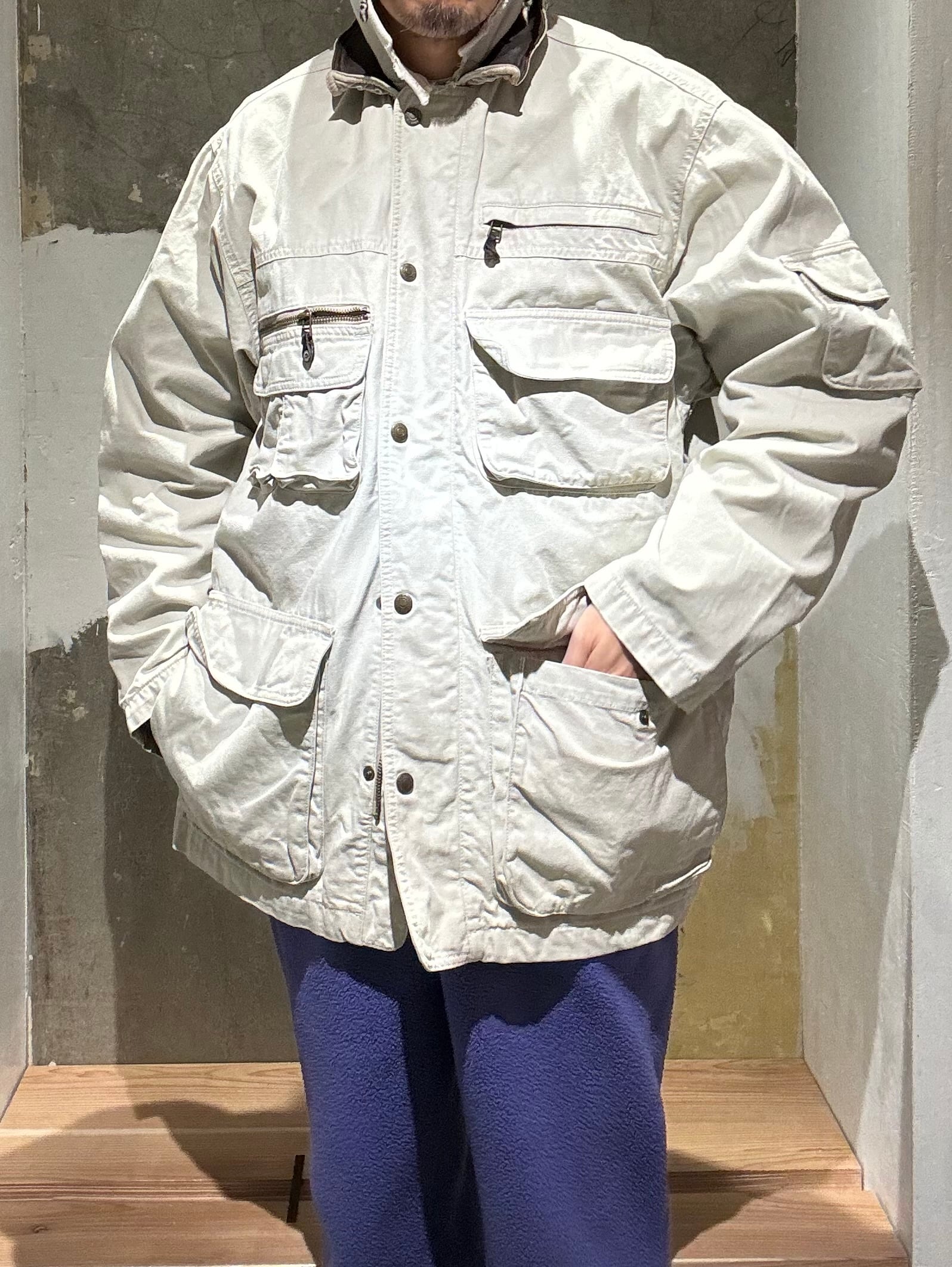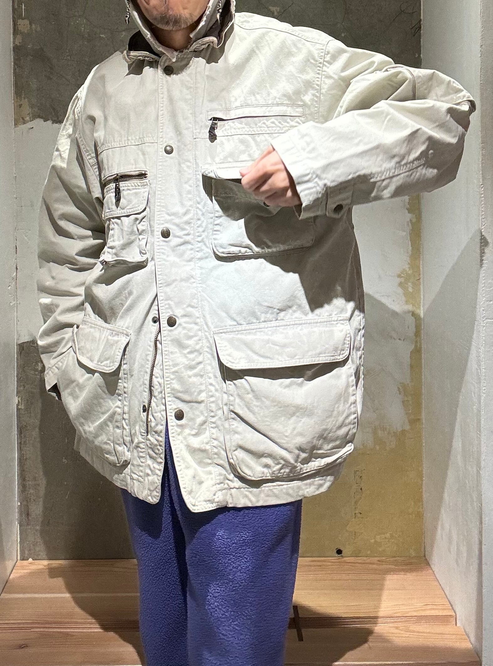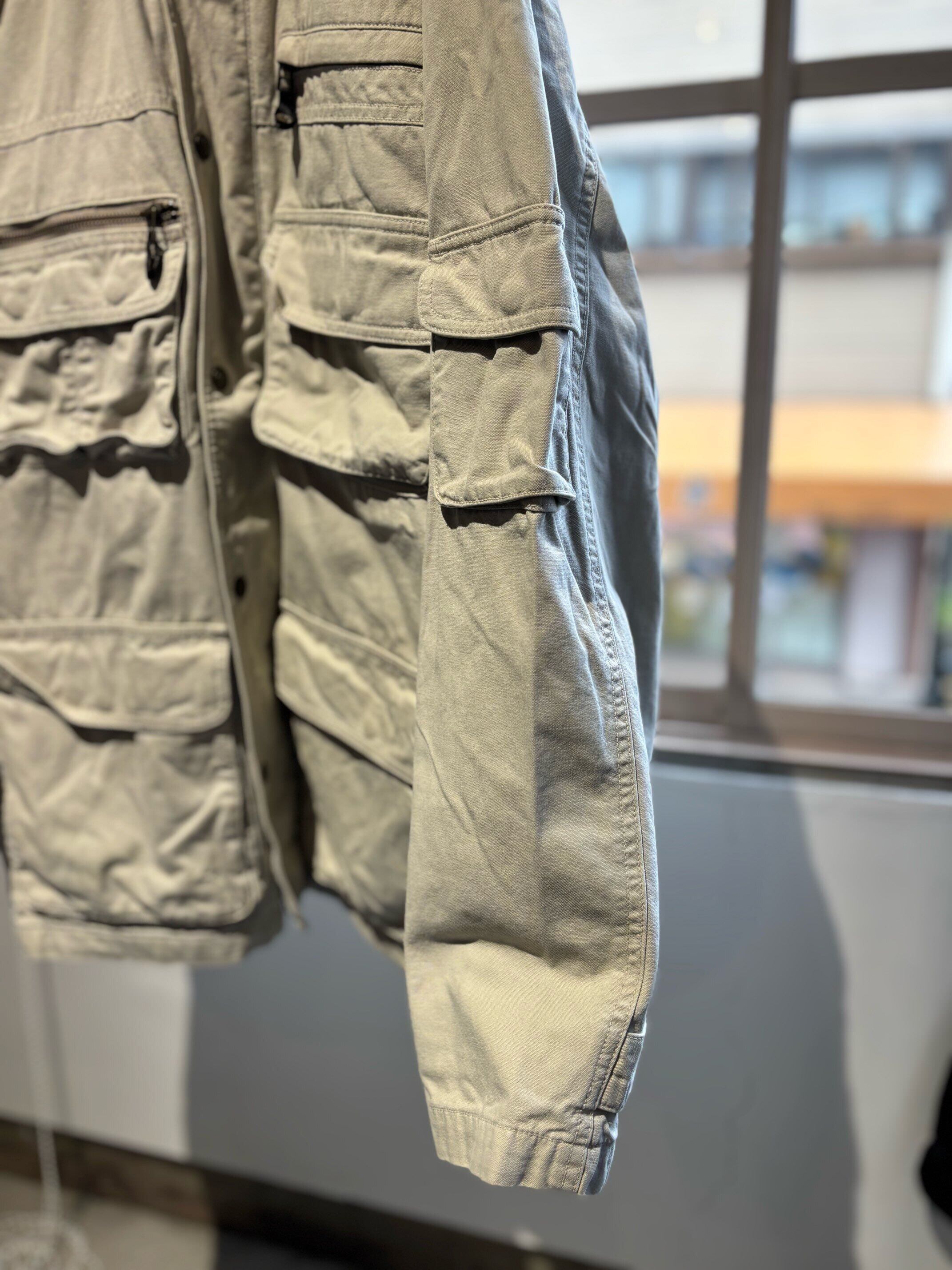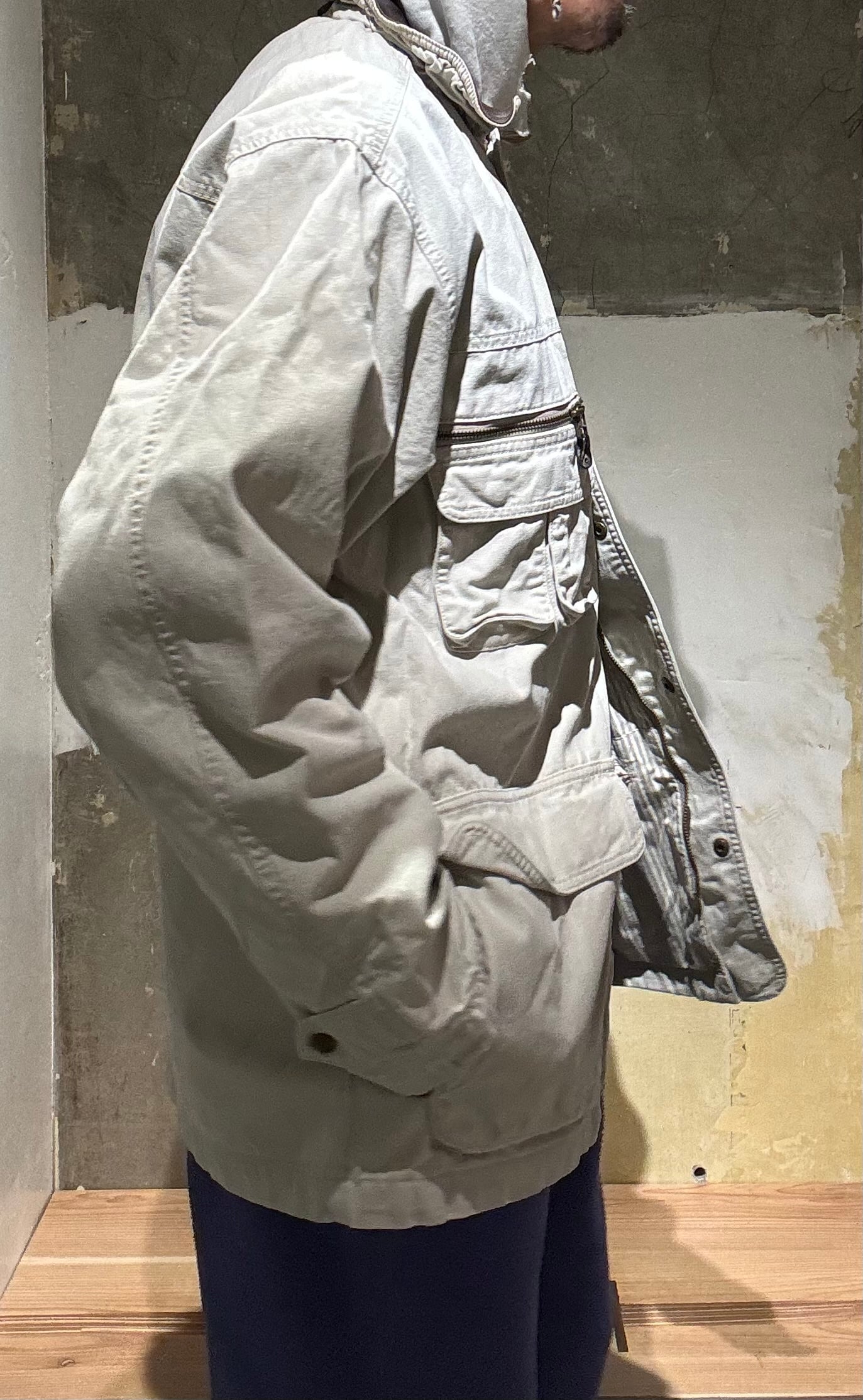 レザー襟にivoryカラー、ポケットが沢山付いた街着用のハンティングジャケット。めちゃくちゃ作りが良いです。しかも珍しいダブルジップで形のバランスを変えながら着る事が出来ます。また下から開けると座ったり立ったりと動きやすいので何かと便利だと思います。