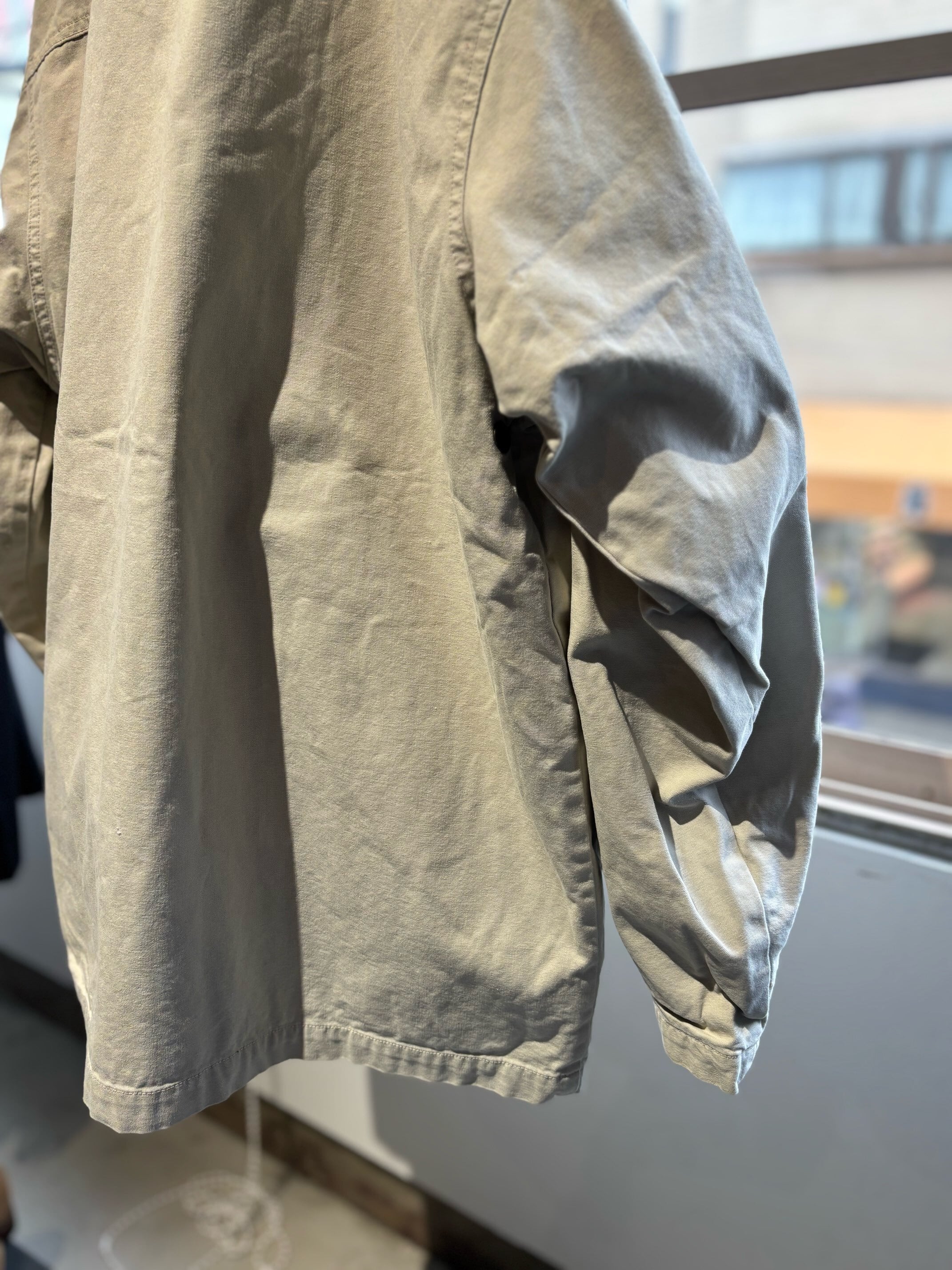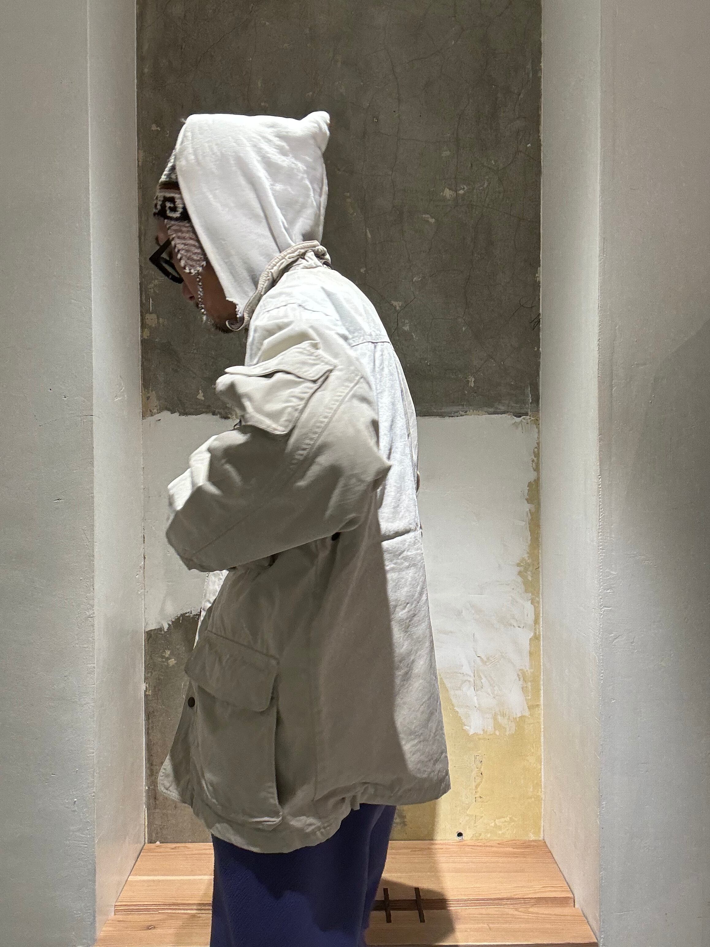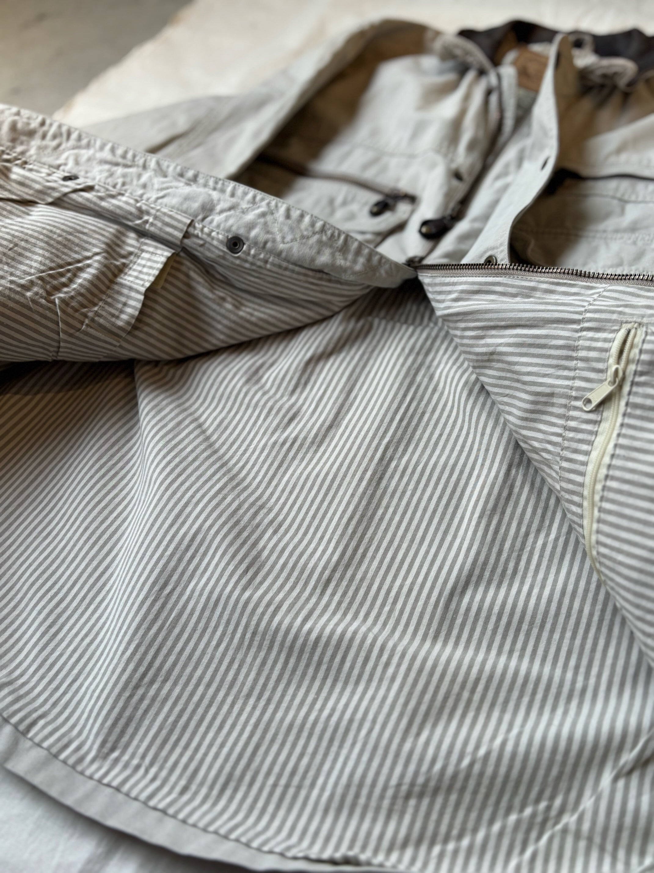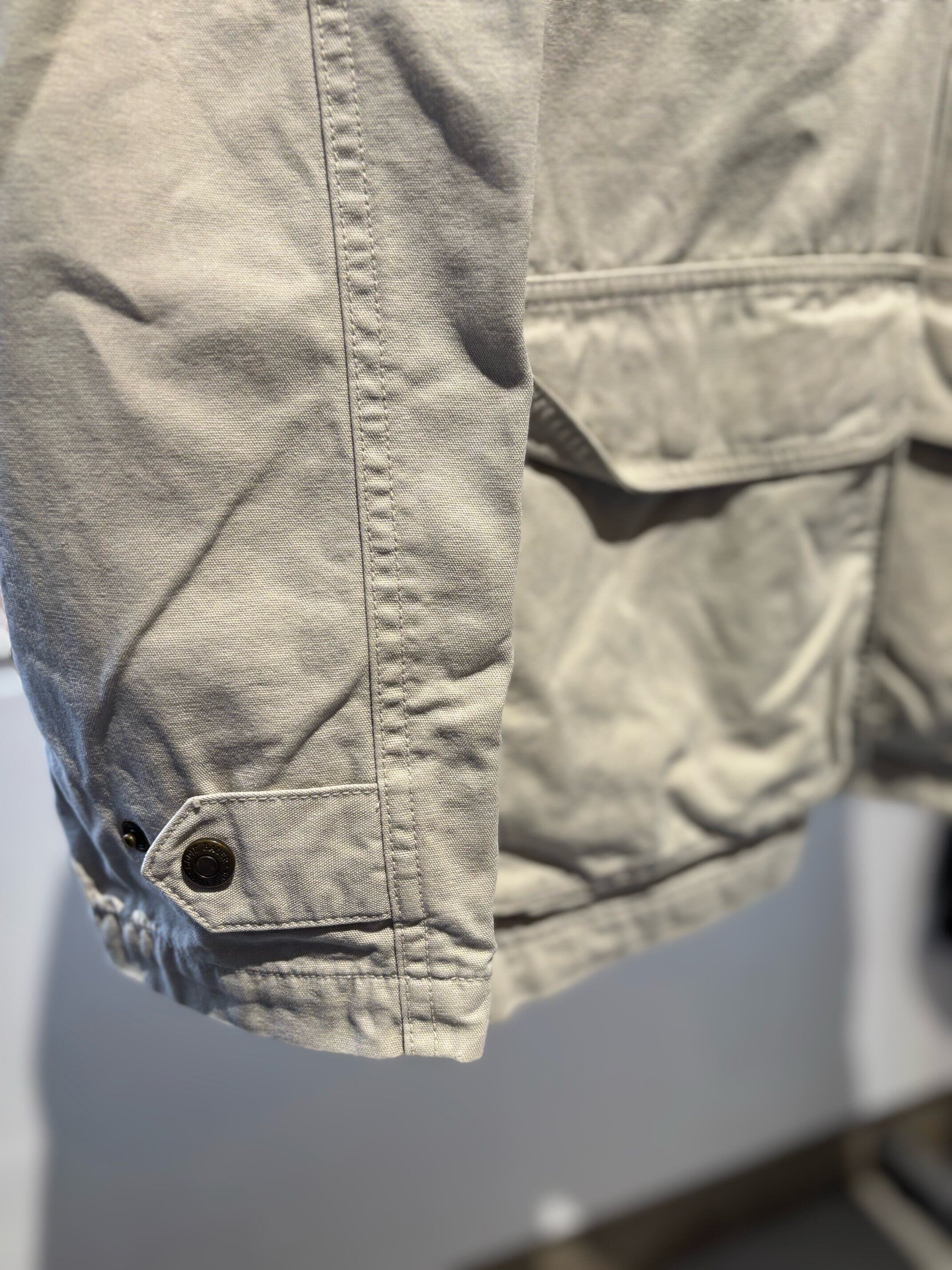 レザー襟にivoryカラー、ポケットが沢山付いた街着用のハンティングジャケット。めちゃくちゃ作りが良いです。しかも珍しいダブルジップで形のバランスを変えながら着る事が出来ます。また下から開けると座ったり立ったりと動きやすいので何かと便利だと思います。