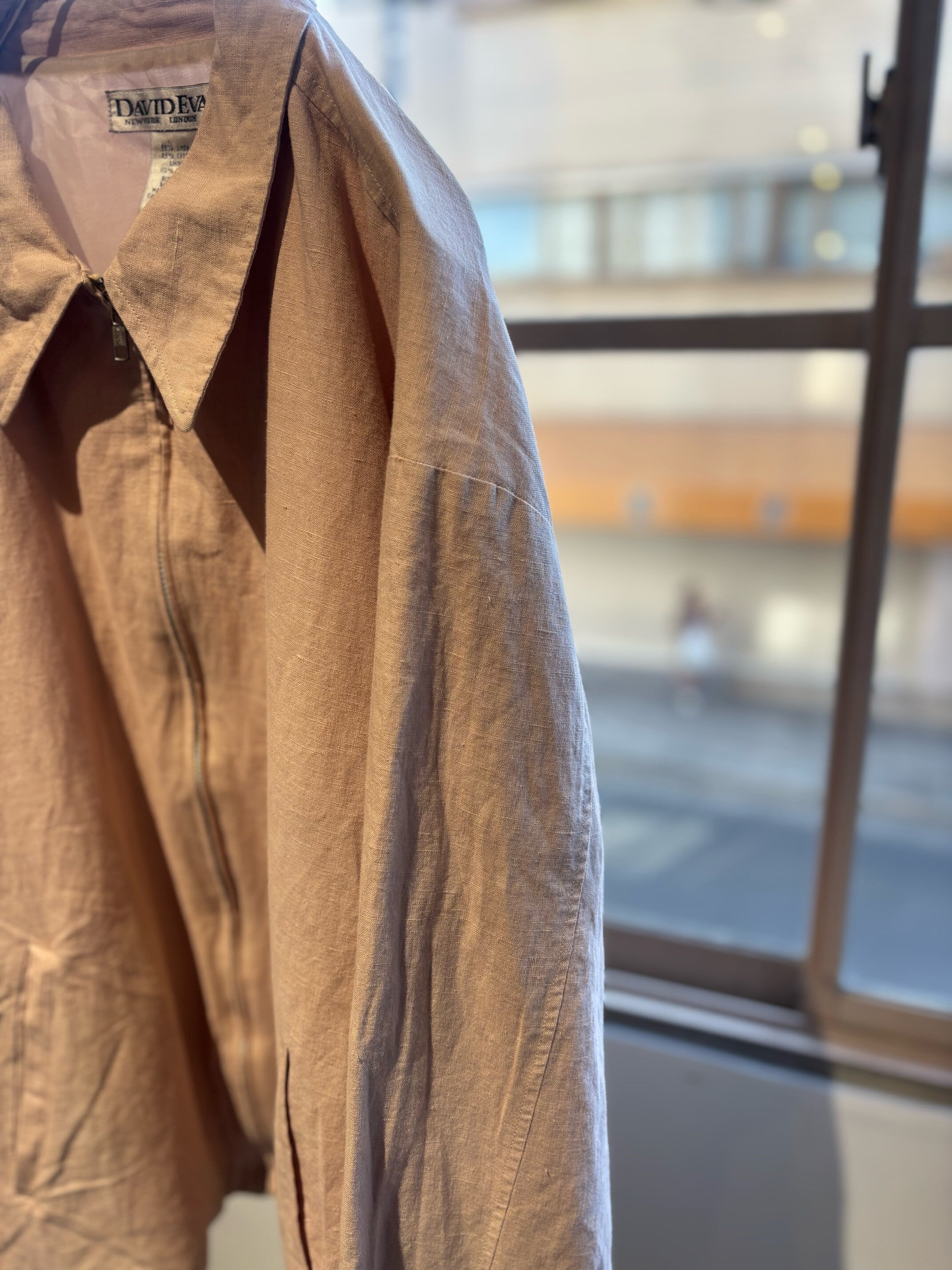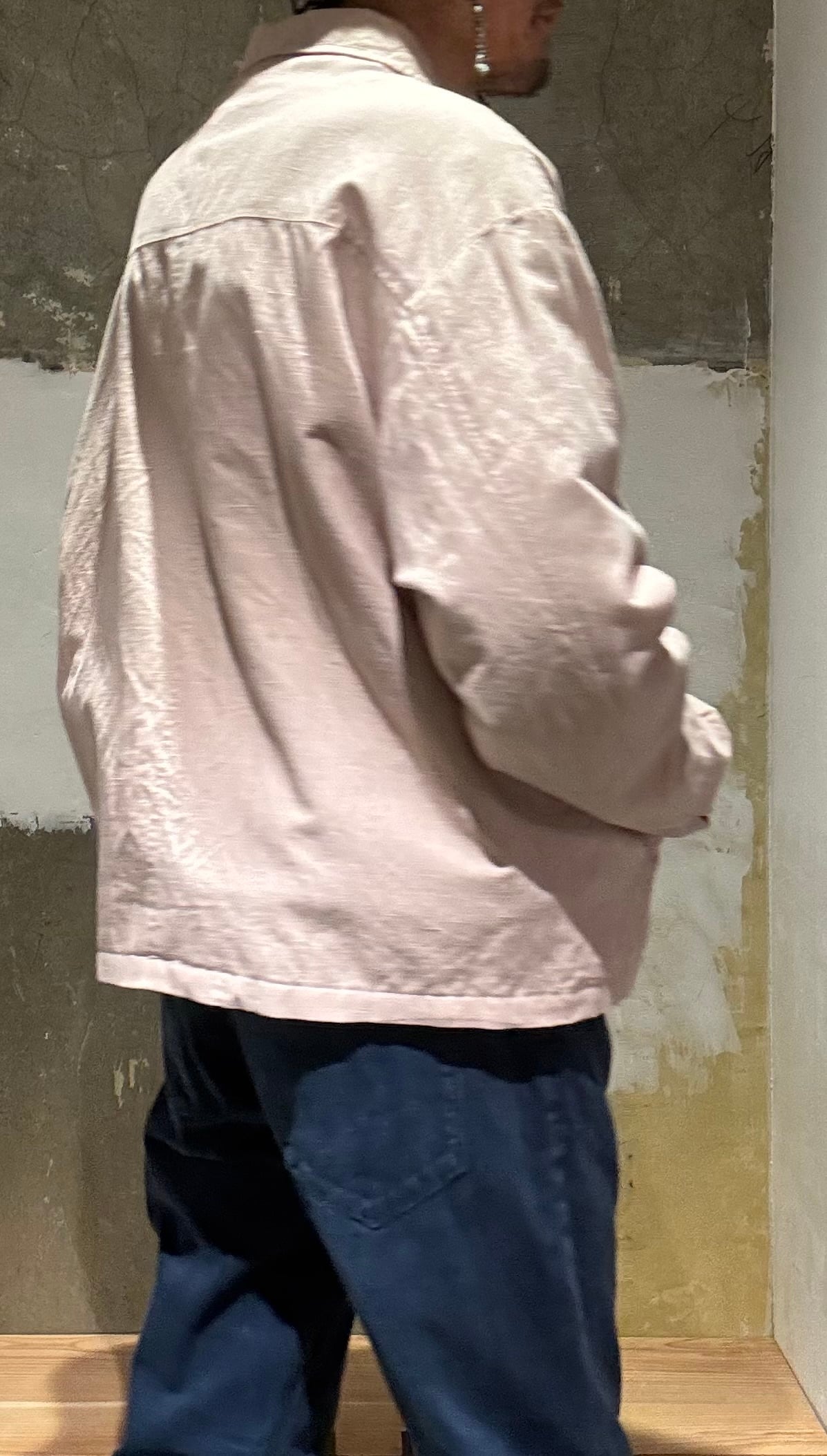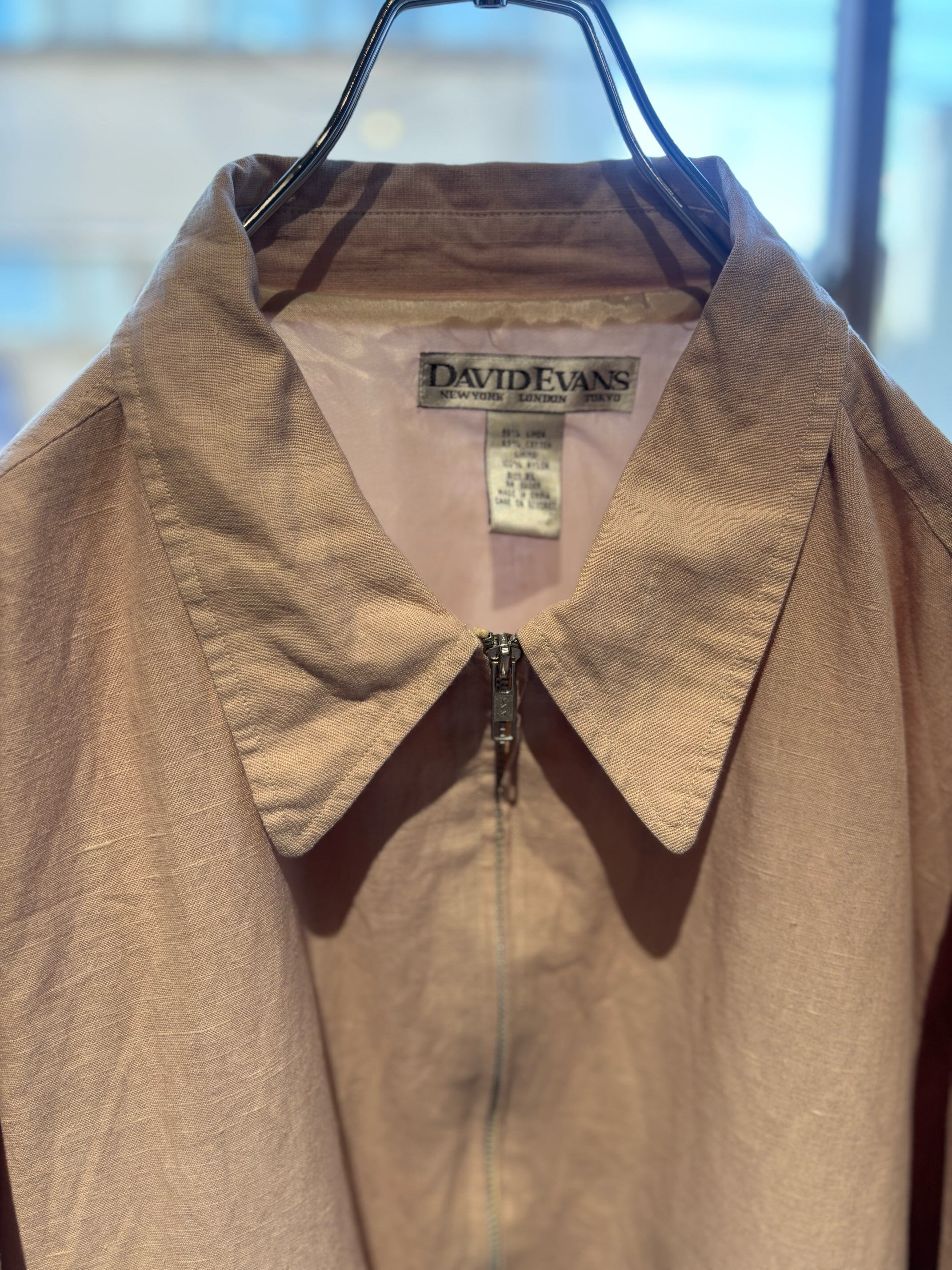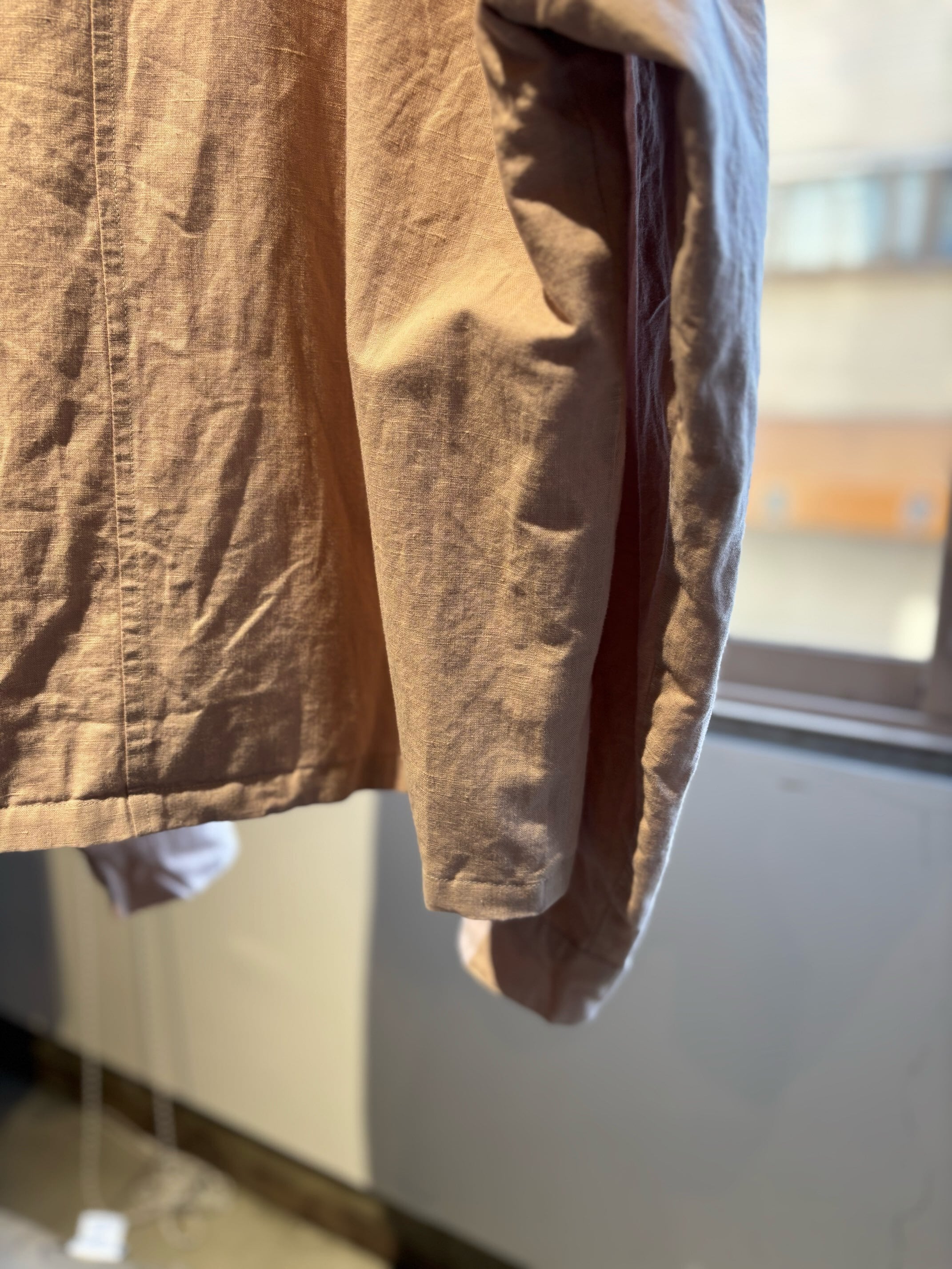 50年代頃のギャバジンのブルゾンなどにはたまにある色ですが、そもそも男性のアイテムでこのような優しい色が少なくなかなか出てきません。しかも素材がリネンとなるとより出てこないので、デザインはシンプルですが探すとなかなか無いアイテムだと思います。