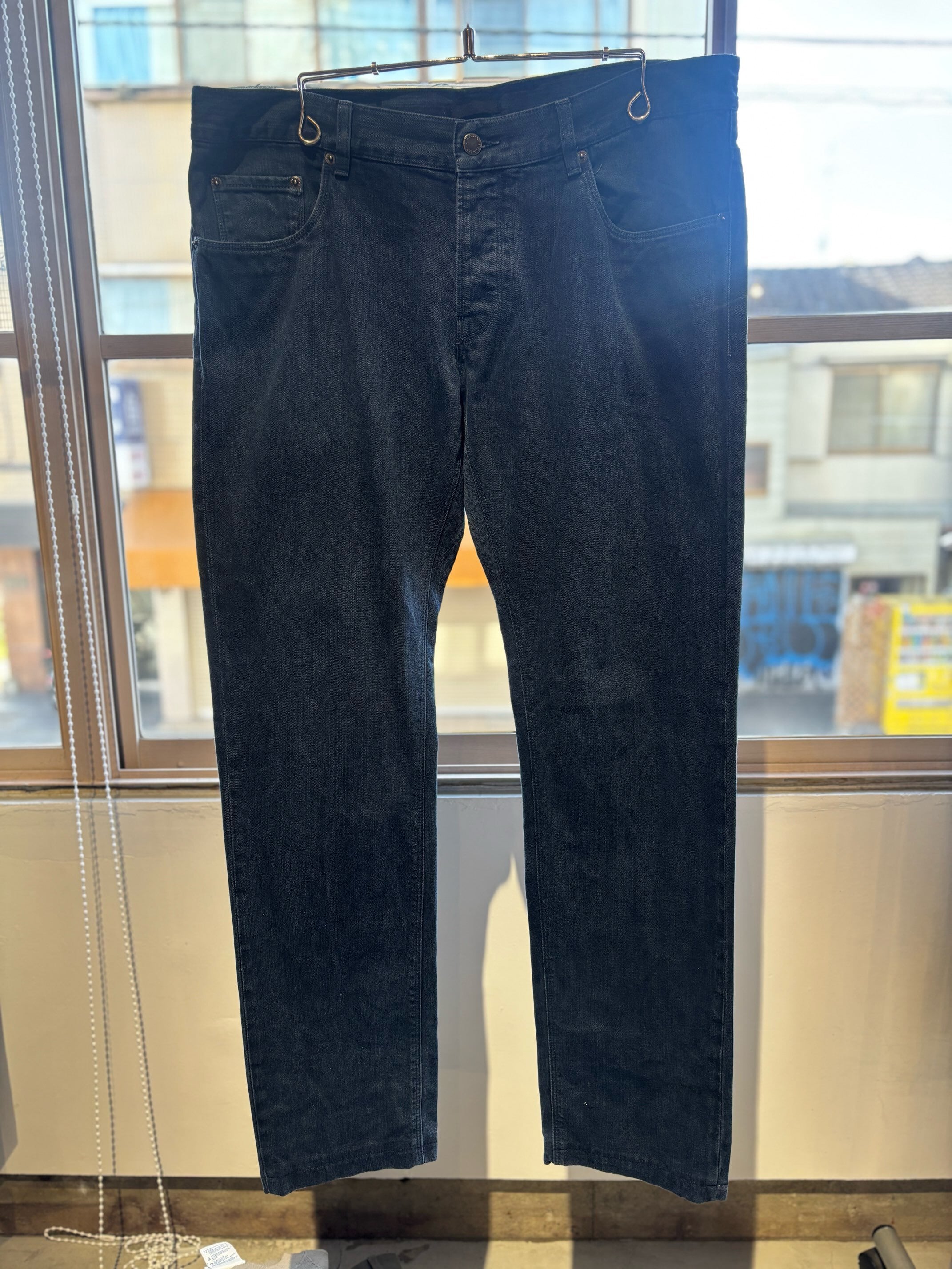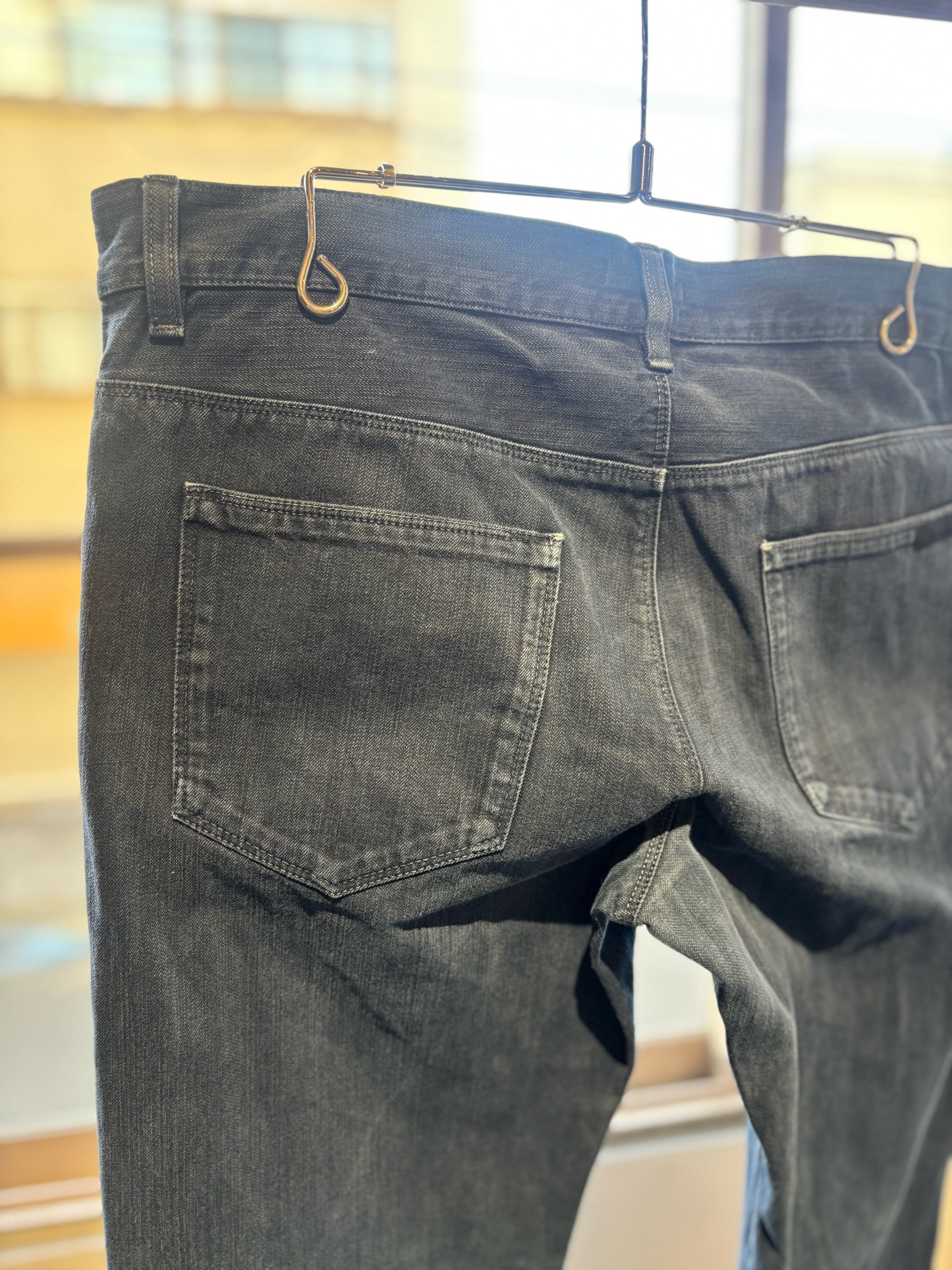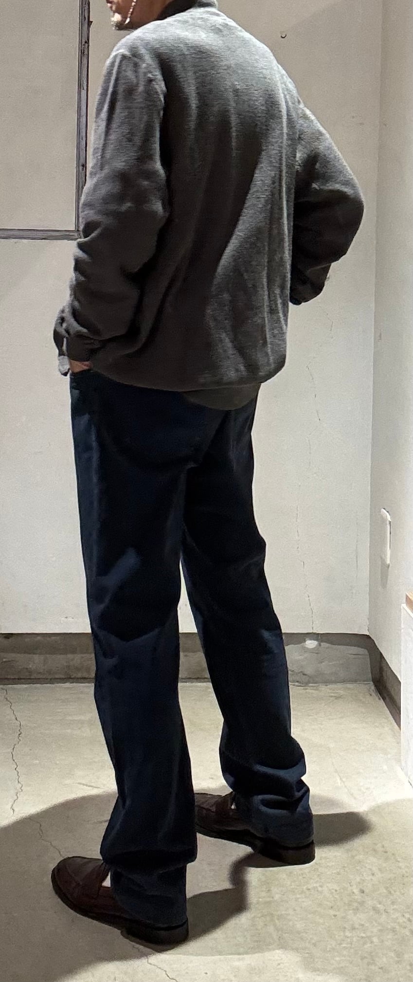 私にはとても懐かしいシルエットのコットンパンツです。ボタンフライは3つでローライズ、コインポケットの付く5ポケット仕様でリーバイスのデニムと同じディテールです。スキニーほどは細くありませんが、かなりタイトめなシルエットなので、ウエストをこの位大きめで履いた方が極端に細すぎず良い塩梅のシルエットになると思います。