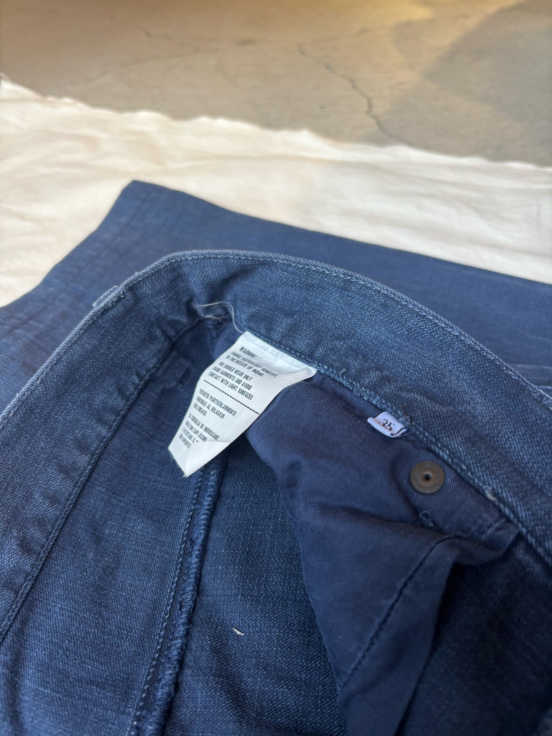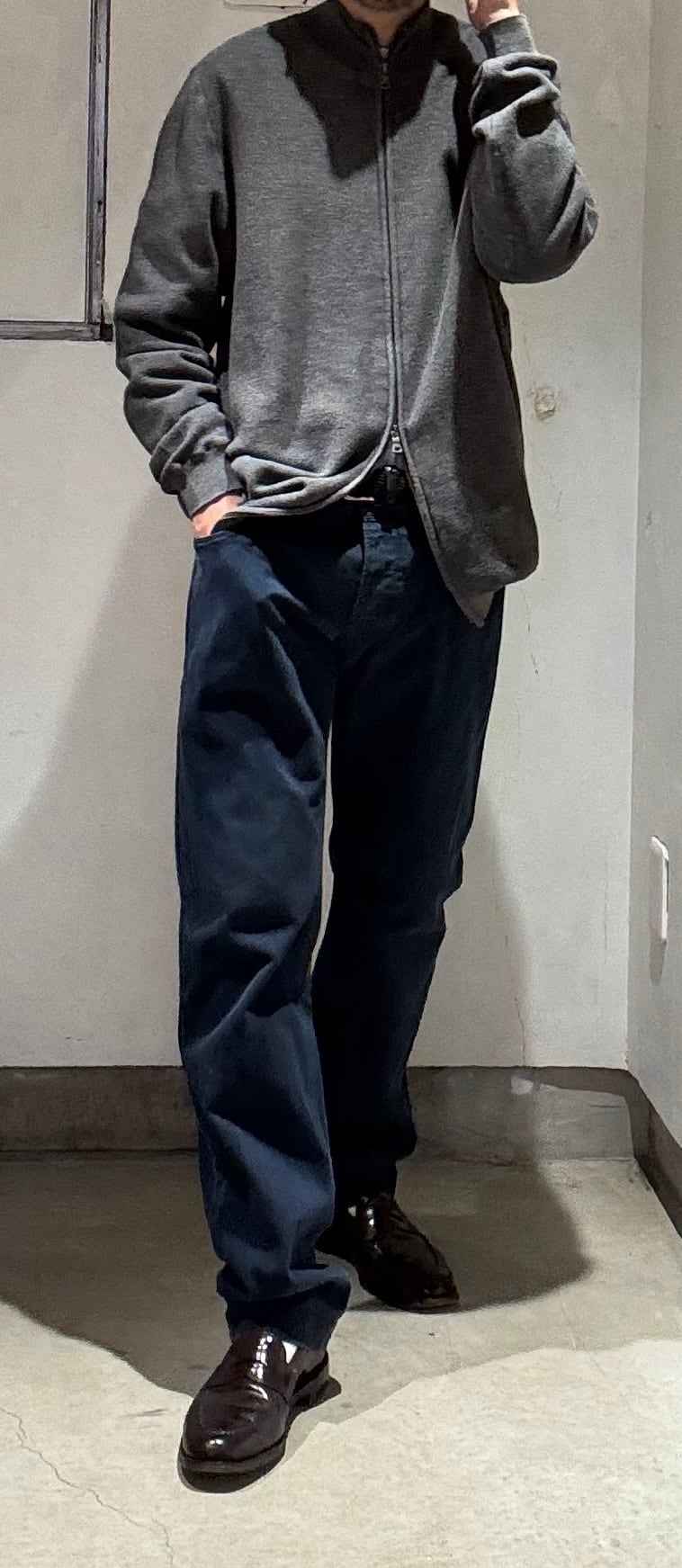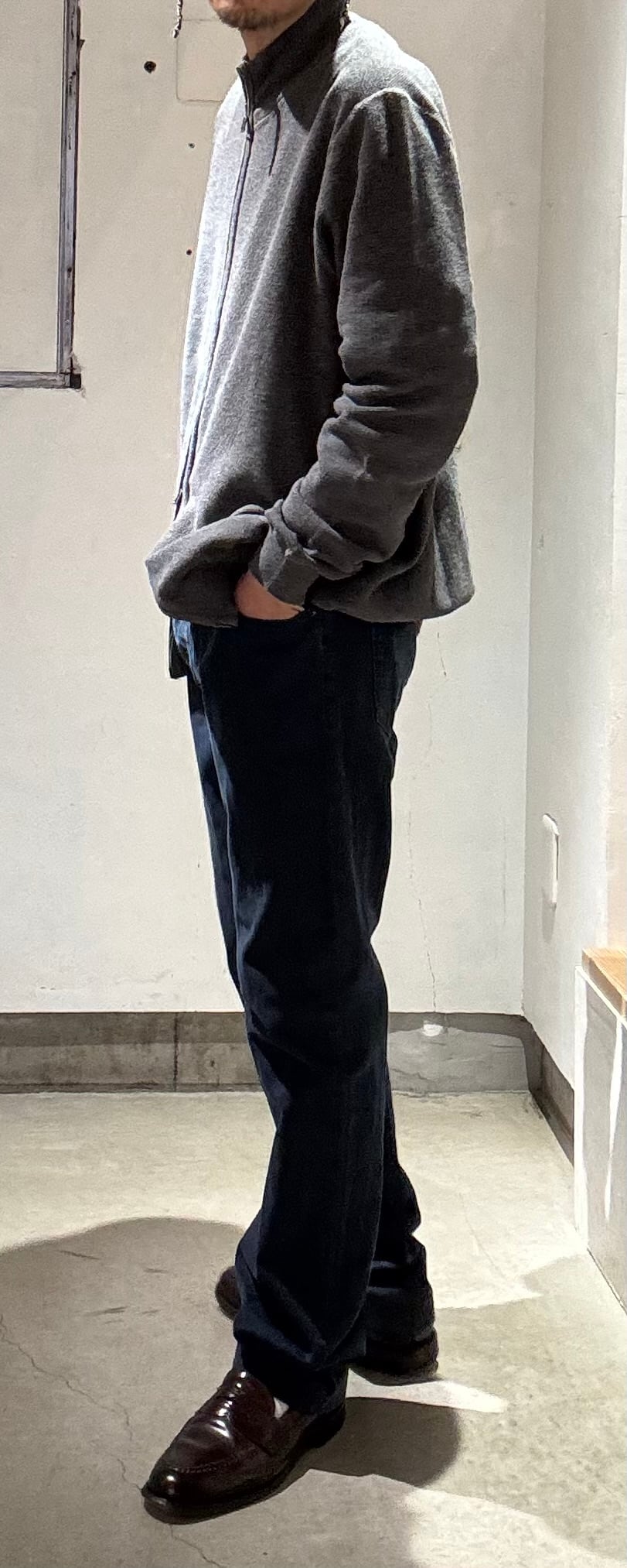 私にはとても懐かしいシルエットのコットンパンツです。ボタンフライは3つでローライズ、コインポケットの付く5ポケット仕様でリーバイスのデニムと同じディテールです。スキニーほどは細くありませんが、かなりタイトめなシルエットなので、ウエストをこの位大きめで履いた方が極端に細すぎず良い塩梅のシルエットになると思います。