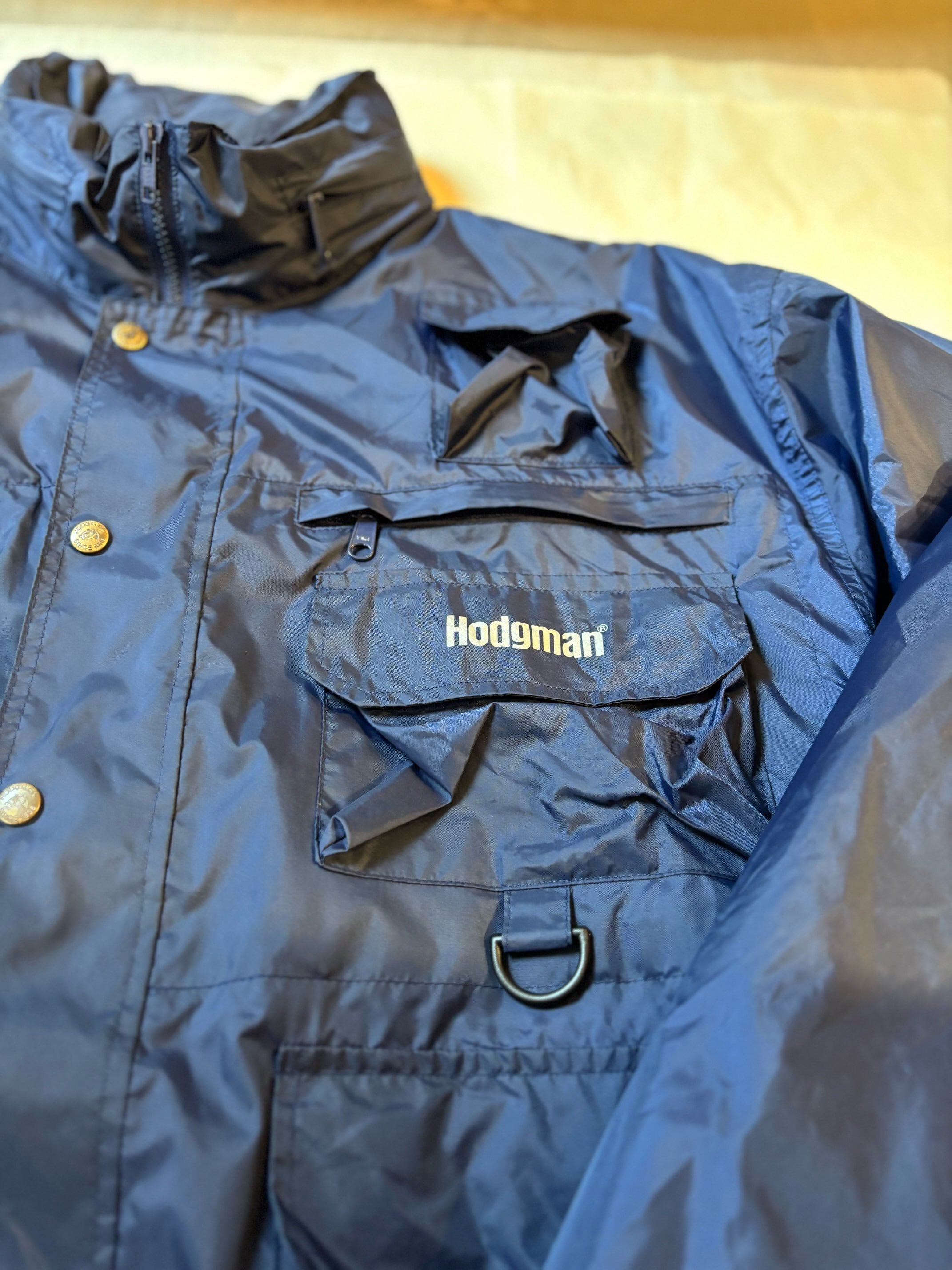 そのホッジマンのフィッシングジャケット。ナイロン100%に様々な用途に使うポケット、フィッシングの道具を吊り下げるdカンなど、本格的なフィッシング用途のジャケットになっています。裏地も付くので雨に濡れても染みてこない構造になっているのも、本格的なアウトドアギアという感じがします。