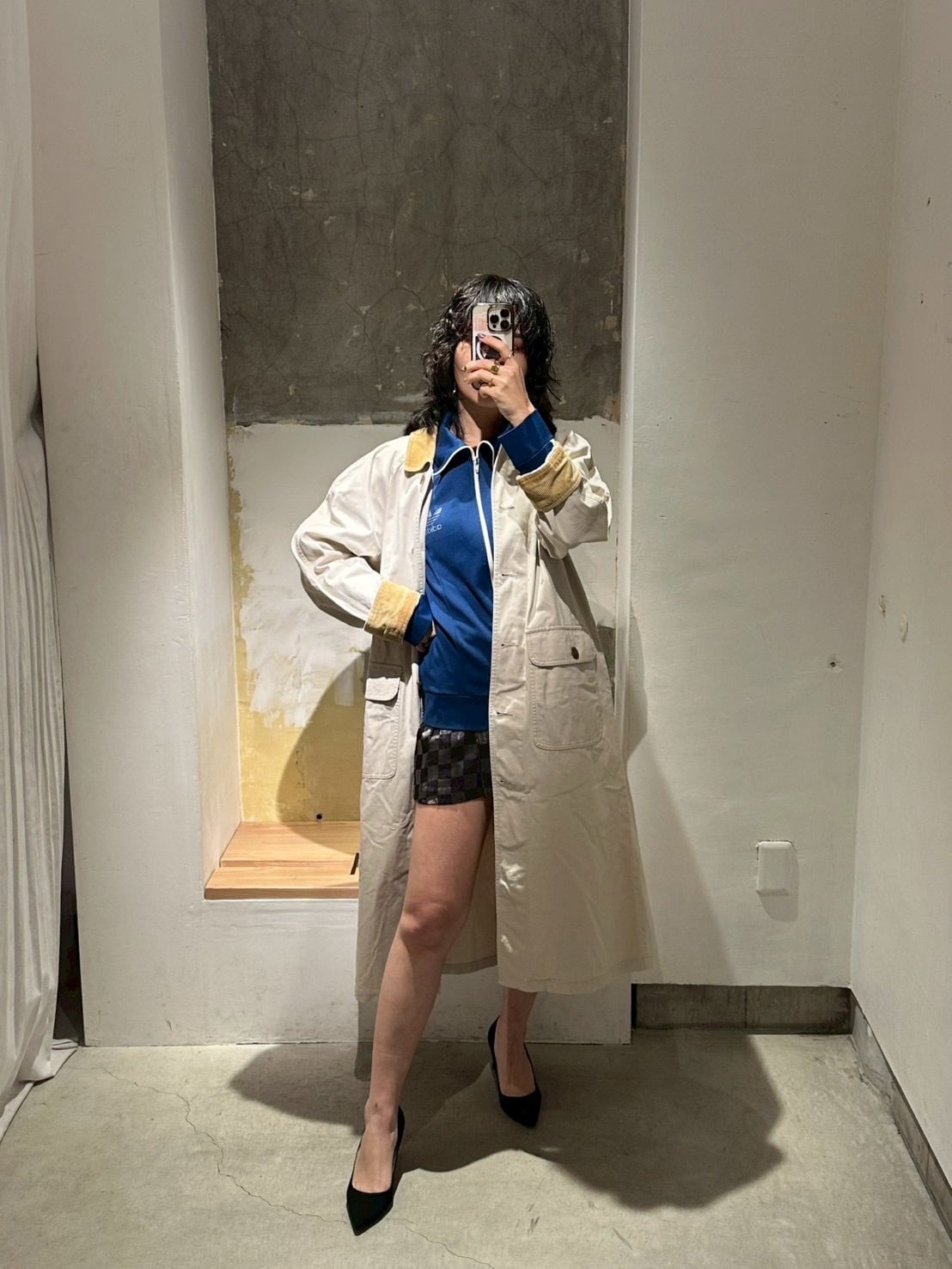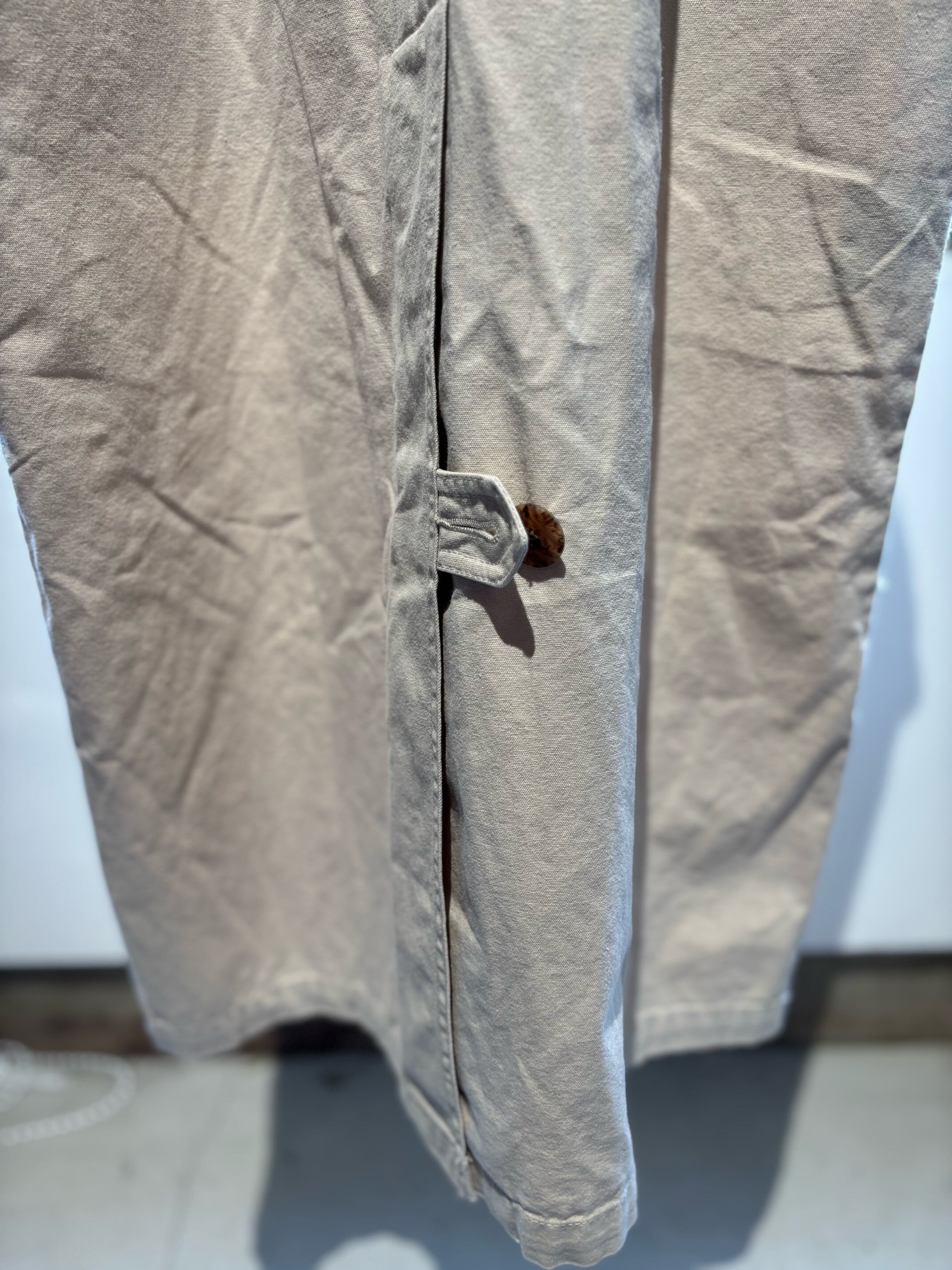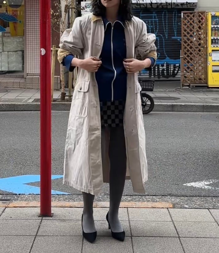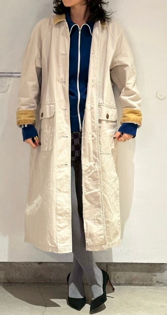 元々は土臭いコートながら全体の色目とボタンの雰囲気もありそこまで土臭い印象は無いのですが、この手のアイテムには真逆のテイストのアイテムを合わせた方が可愛いと思うので、レースのドレスやディアードのアイテムなど少し甘めなものを持ってきても可愛くスタイリングできると思います。