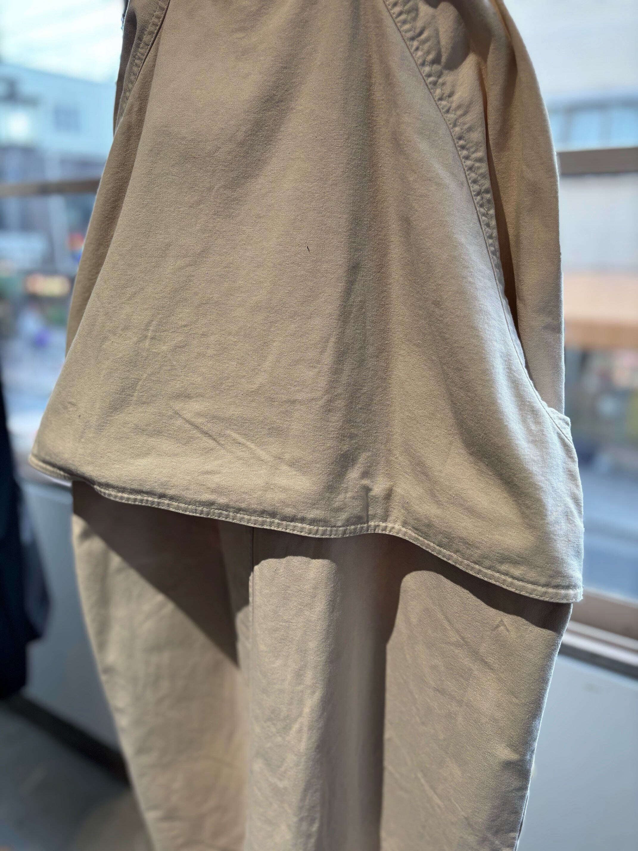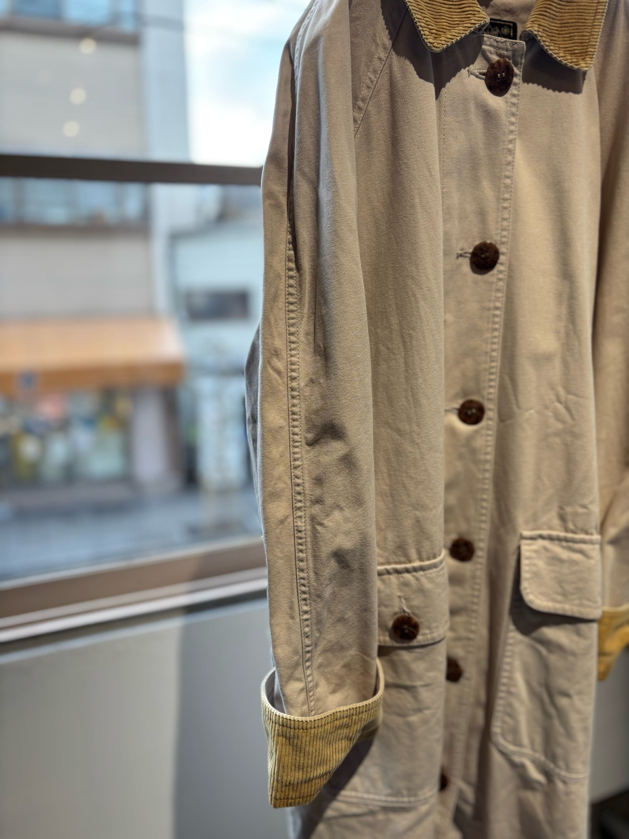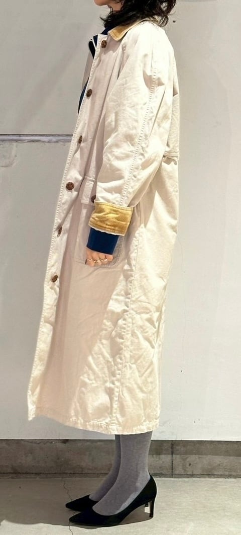 女性用に作られているだけあり、素材もそこまで固くなく重さも軽いワークコート。安心のエディバウアーのもので襟がコーデュロイの切り替えになっているのがとても可愛いですね。カラーも白に近いアイボリーでとても合わせやすいカラーだと思います。