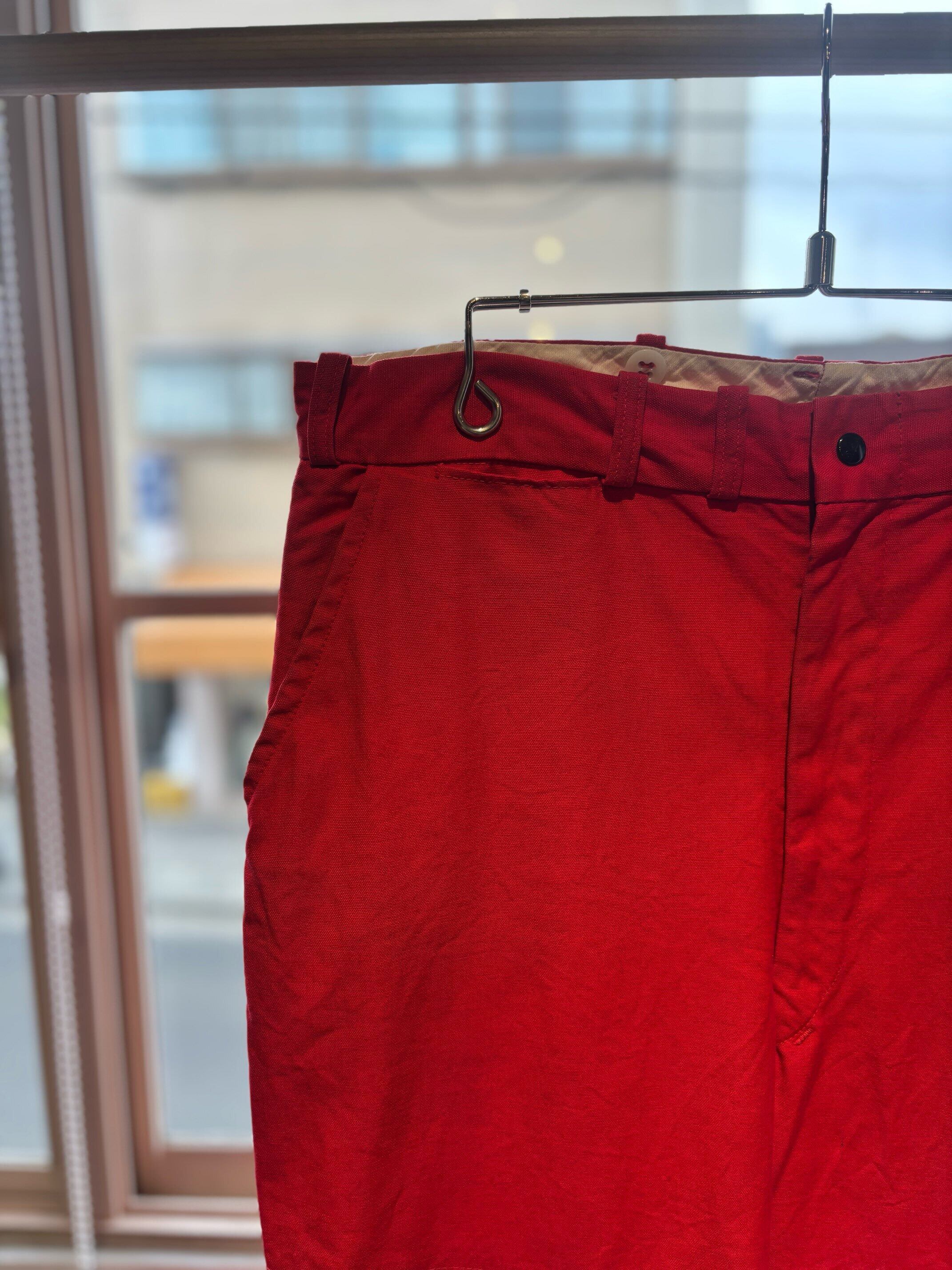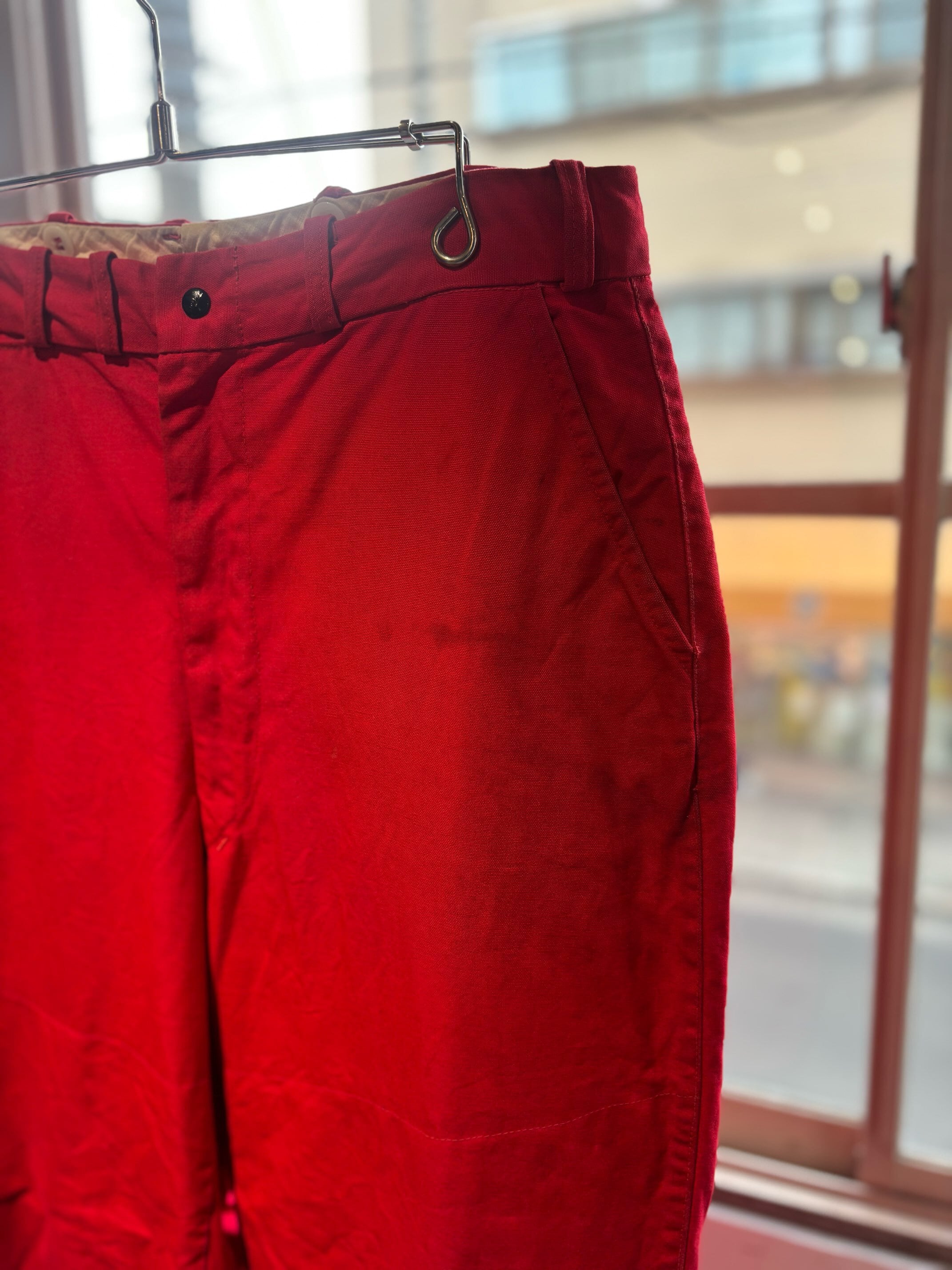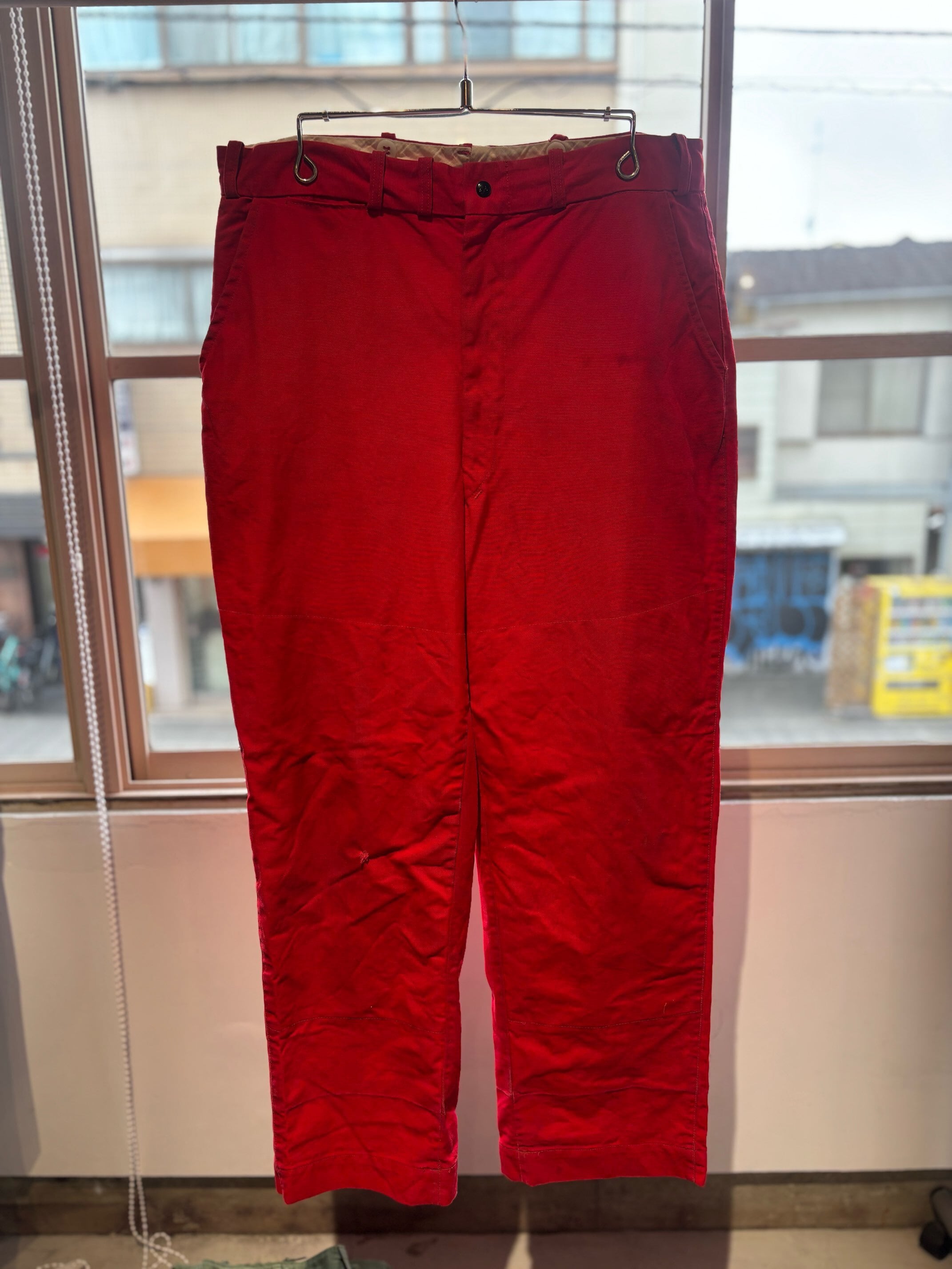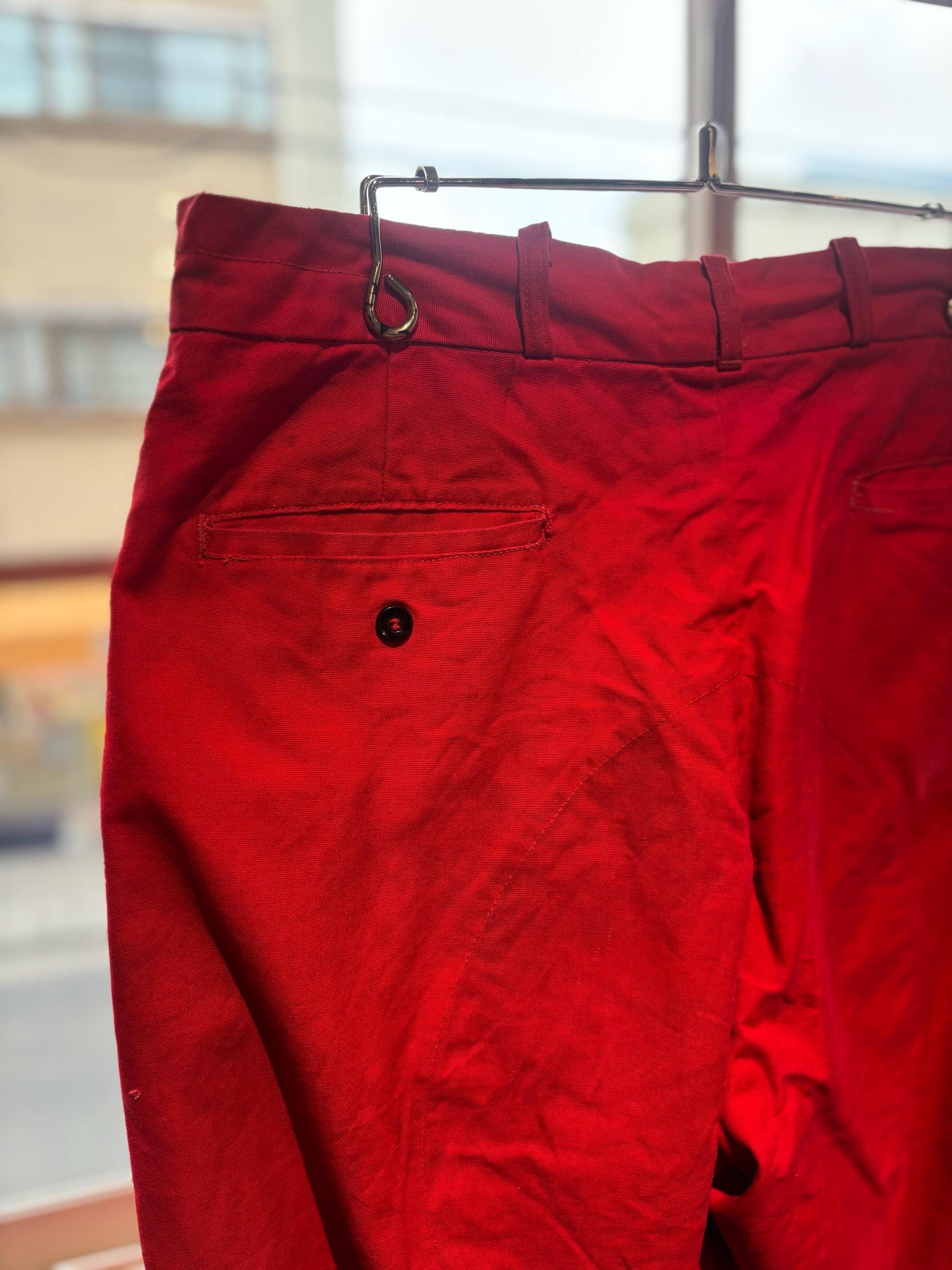 かっこいいですねー。アメリカの老舗アウトドアブランドduxbackの真っ赤なカラーのハンティングトラウザーズ、古いボトムスによく見られるサスペンダーボタン、ダブルニーやダブルシート仕様で、膝立ちや座ってもすぐに破けないように生地が2重になっています。