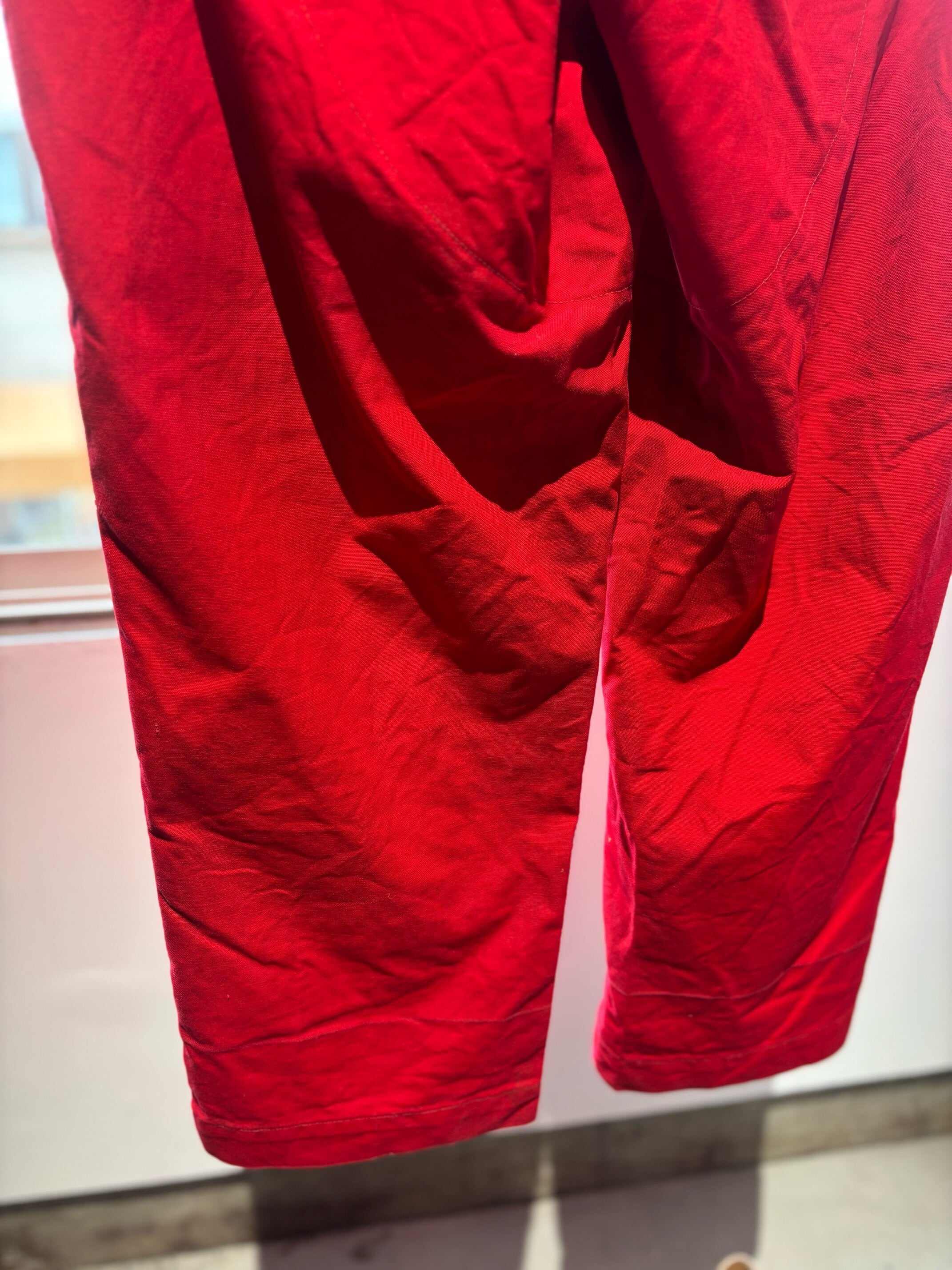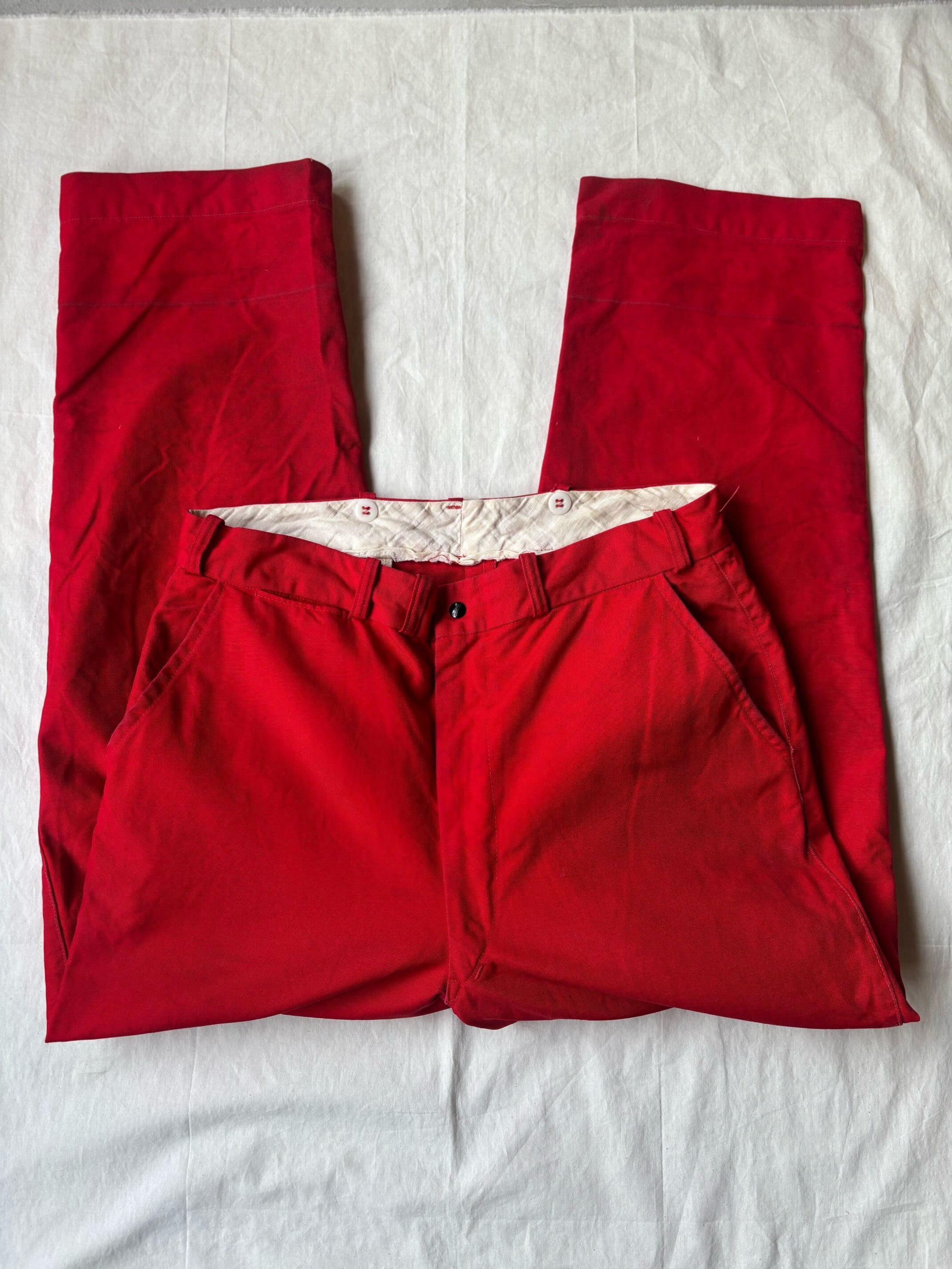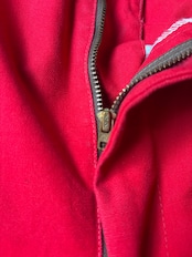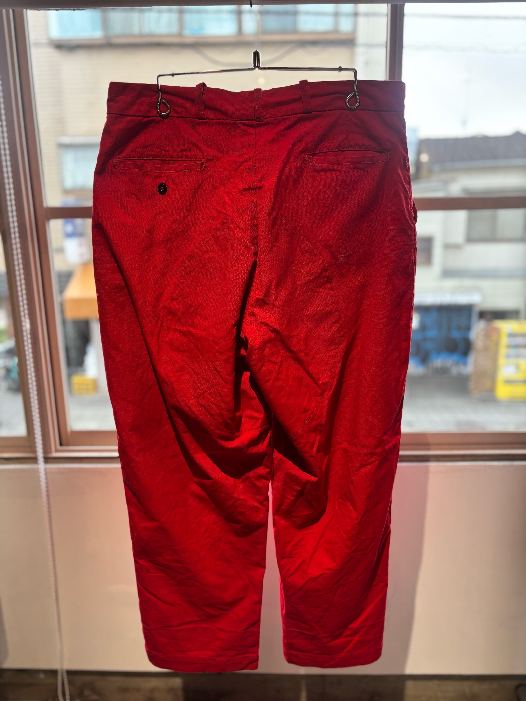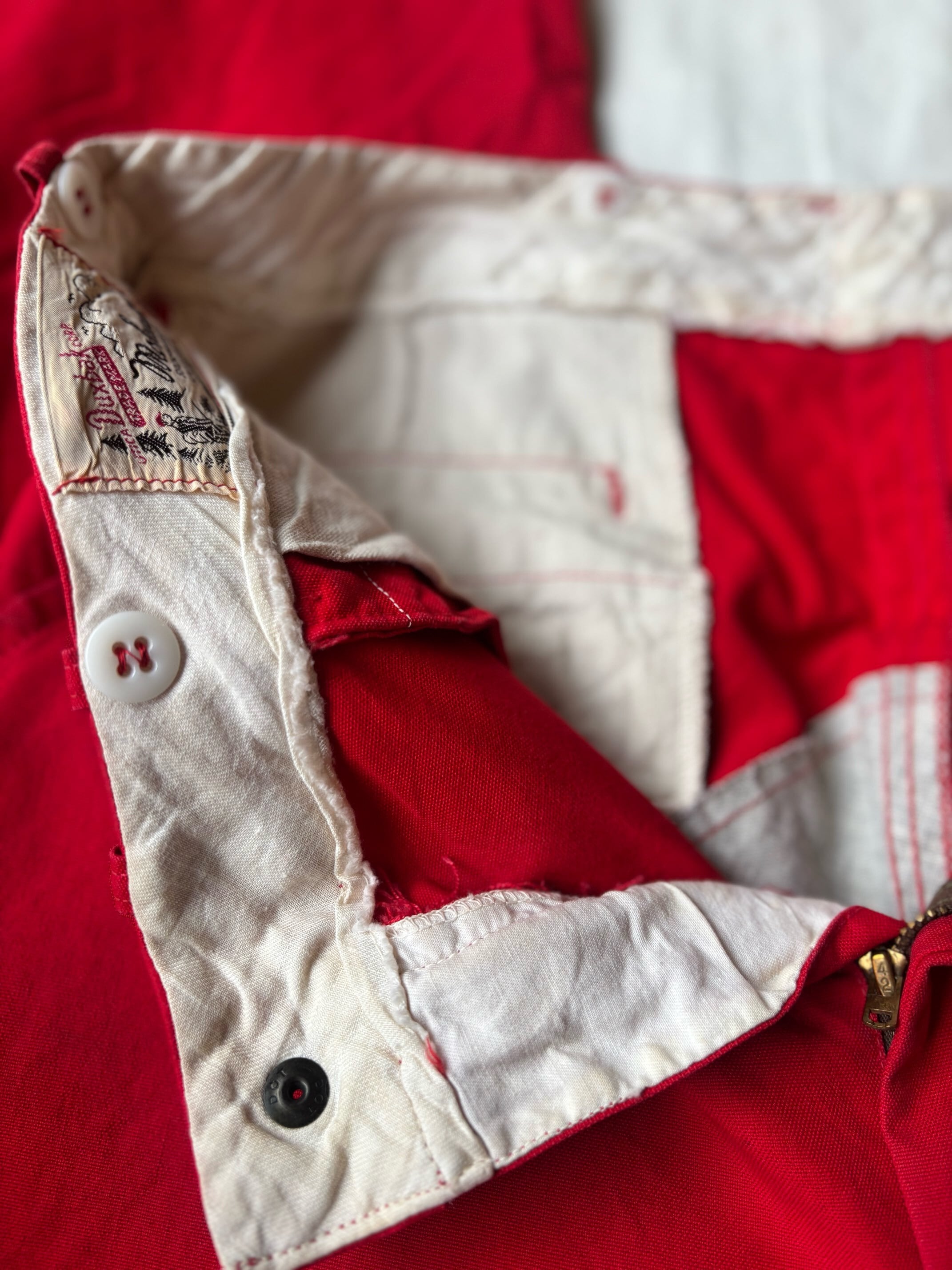 かっこいいですねー。アメリカの老舗アウトドアブランドduxbackの真っ赤なカラーのハンティングトラウザーズ、古いボトムスによく見られるサスペンダーボタン、ダブルニーやダブルシート仕様で、膝立ちや座ってもすぐに破けないように生地が2重になっています。