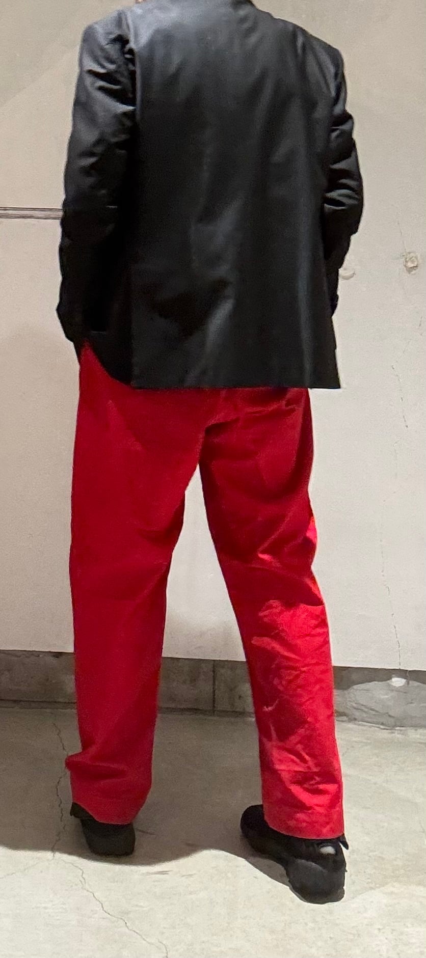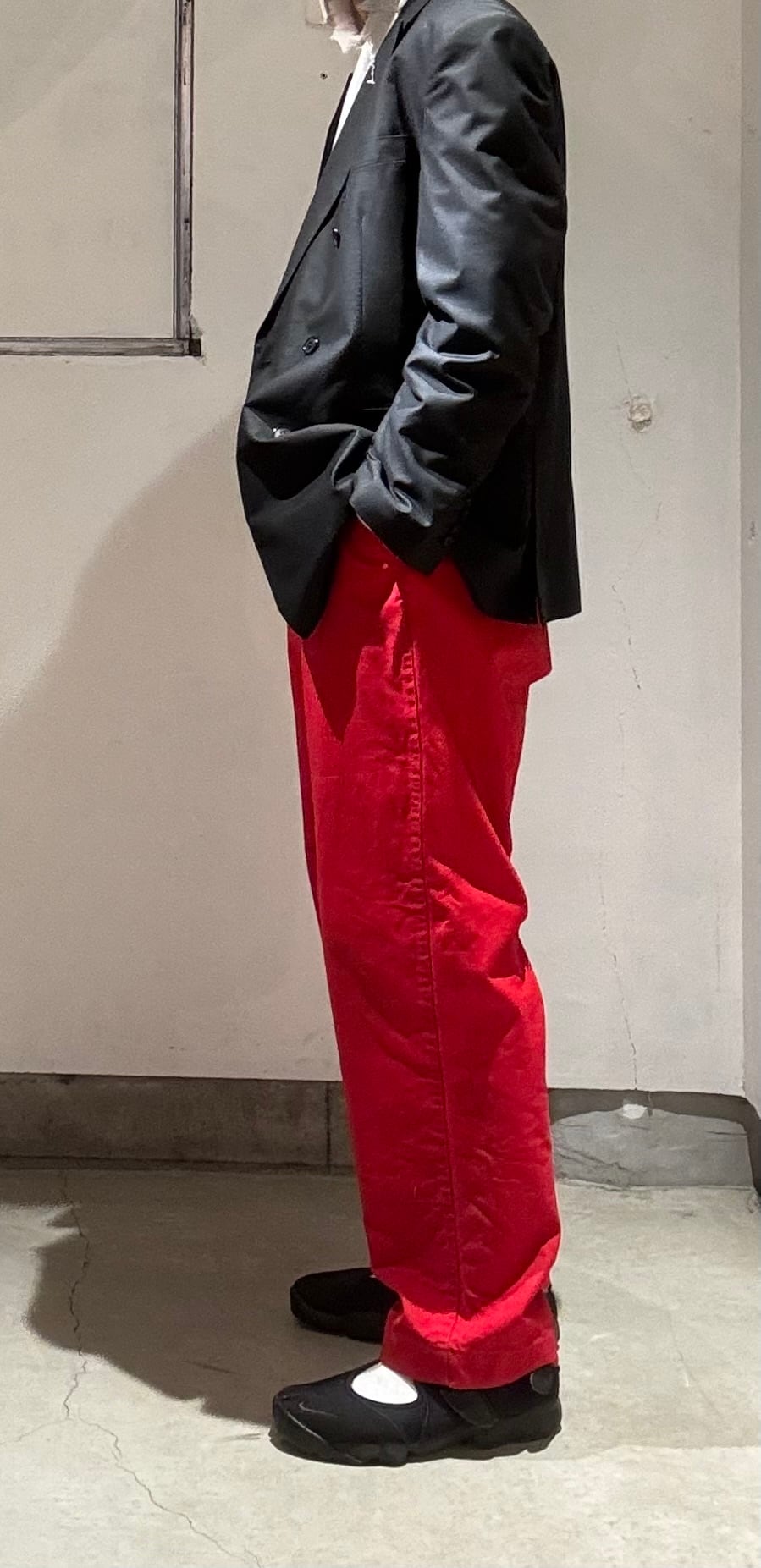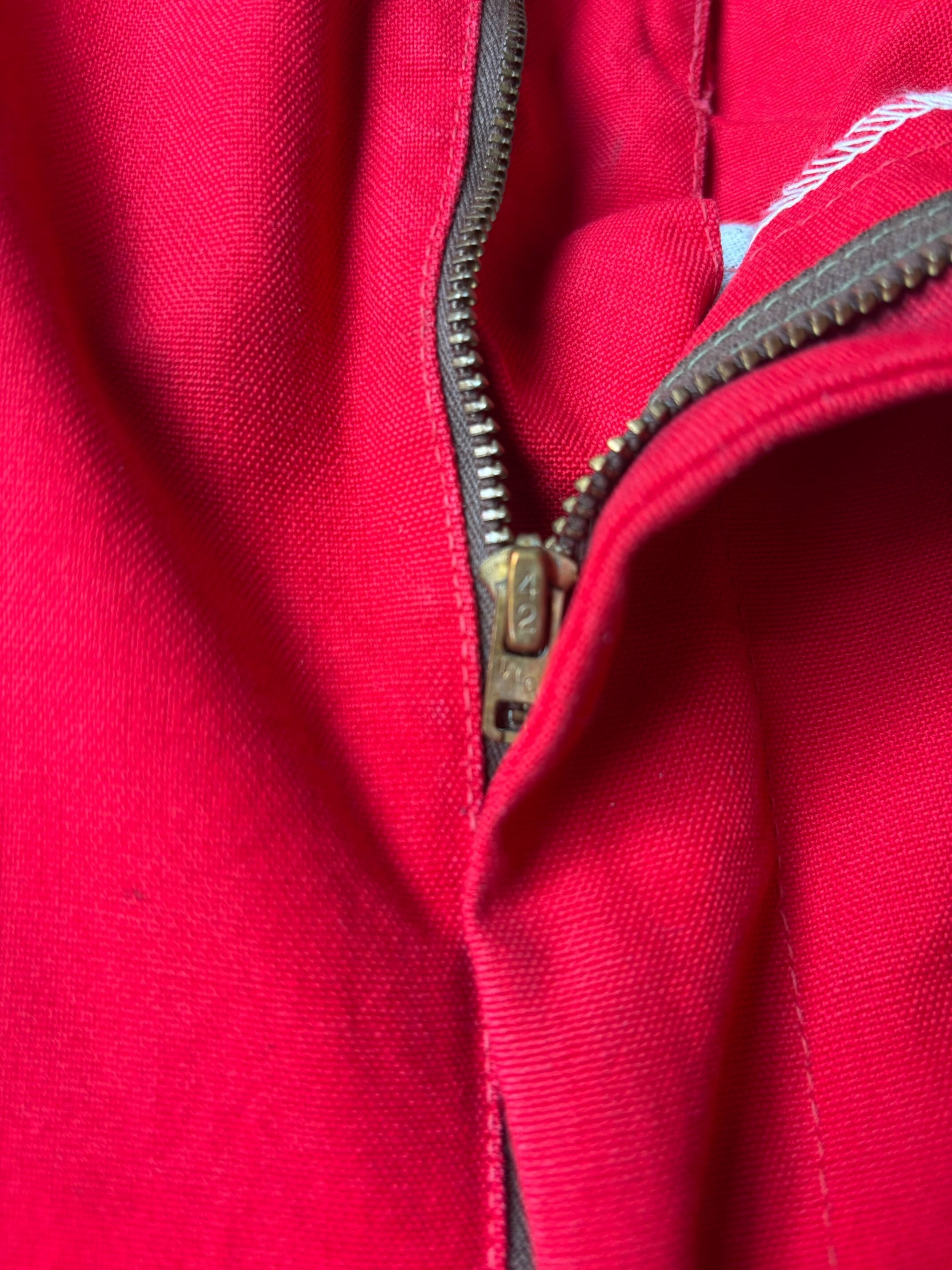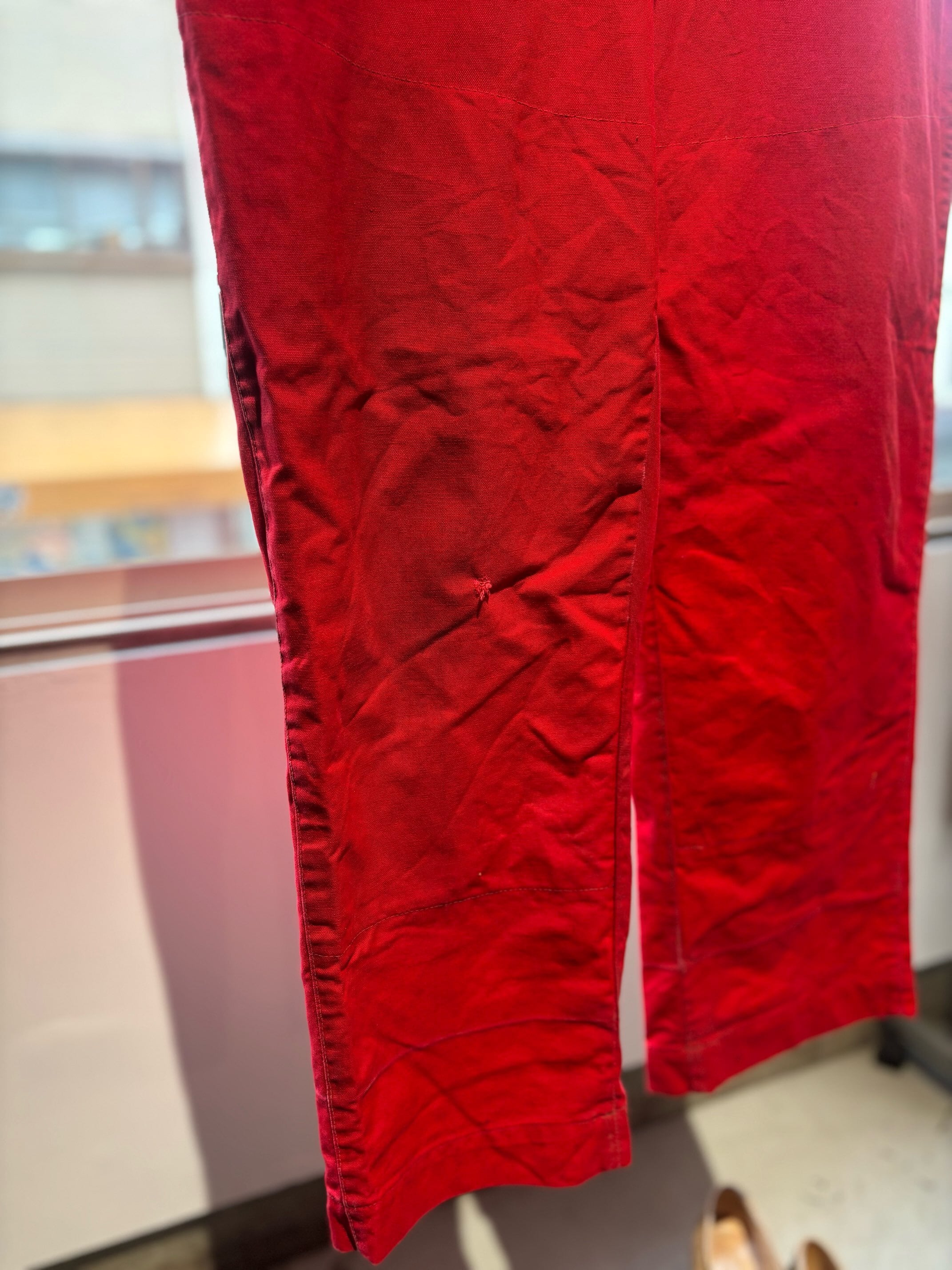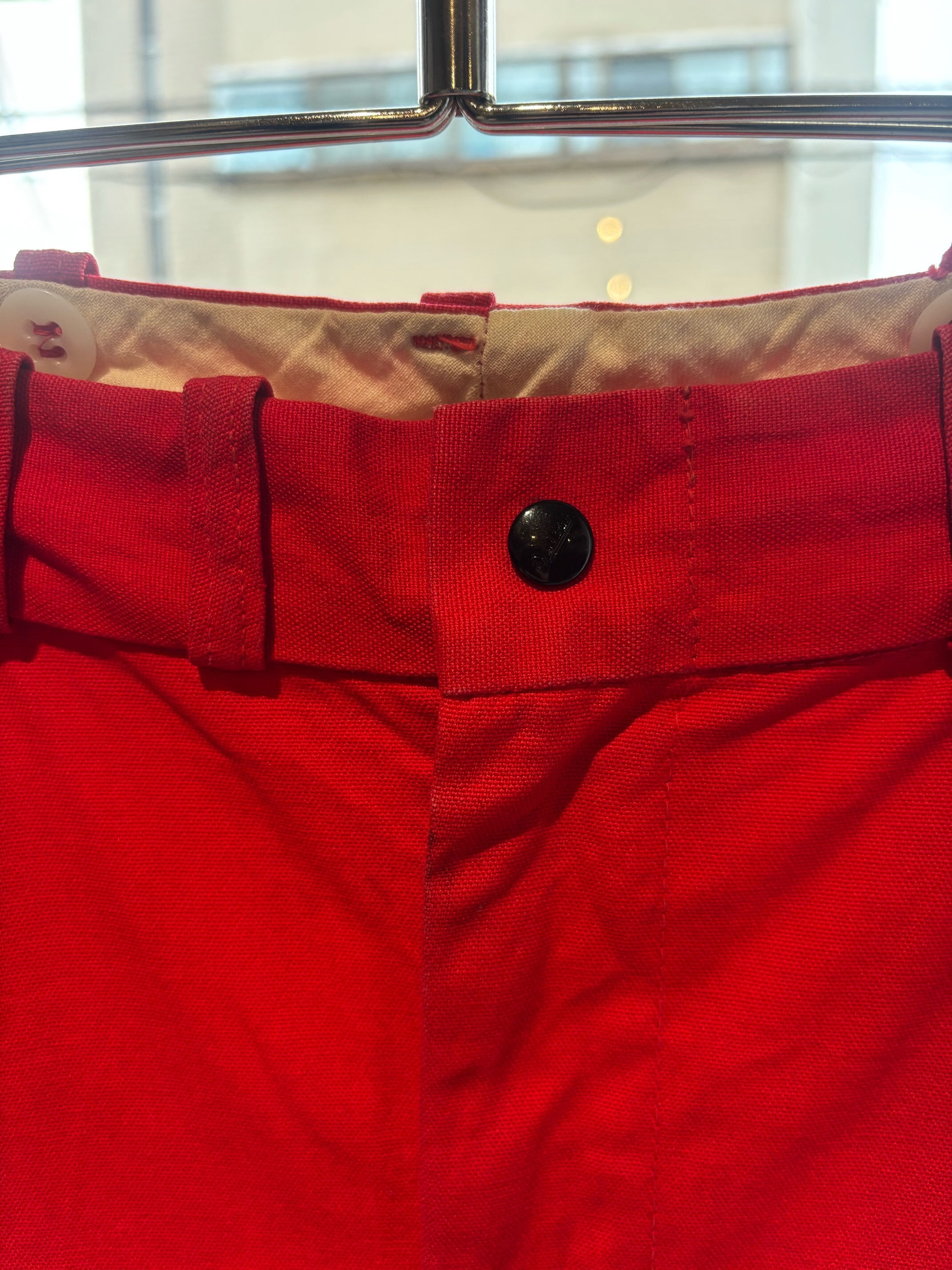 かっこいいですねー。アメリカの老舗アウトドアブランドduxbackの真っ赤なカラーのハンティングトラウザーズ、古いボトムスによく見られるサスペンダーボタン、ダブルニーやダブルシート仕様で、膝立ちや座ってもすぐに破けないように生地が2重になっています。