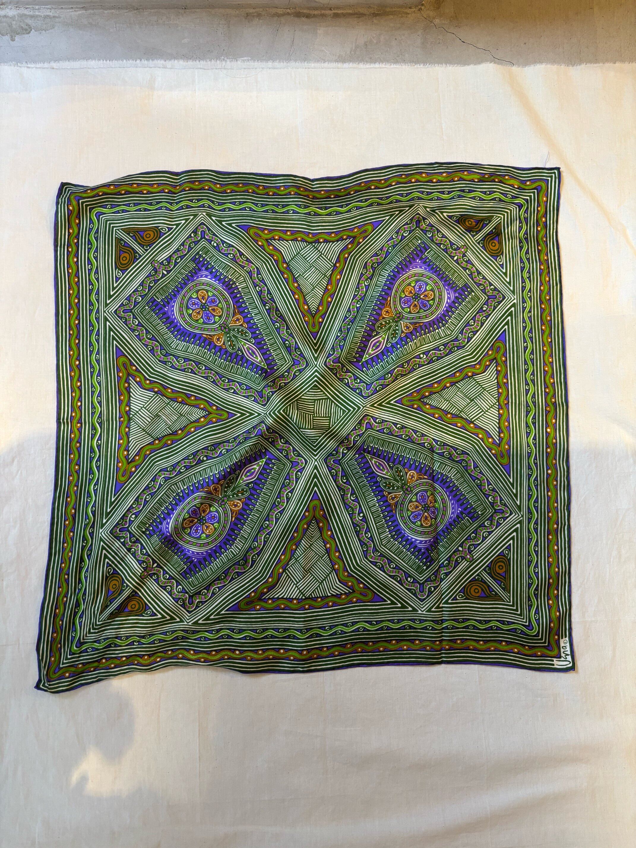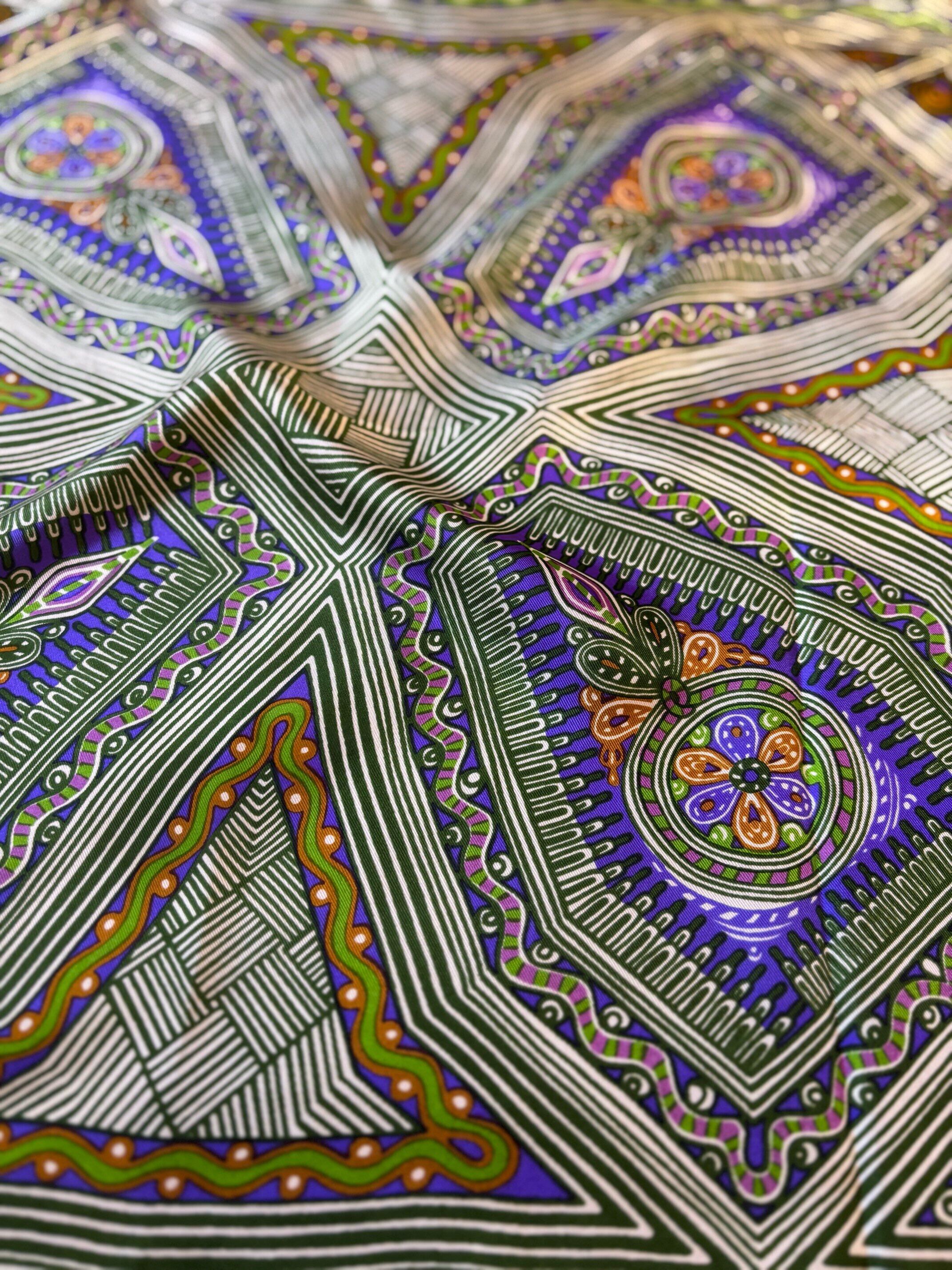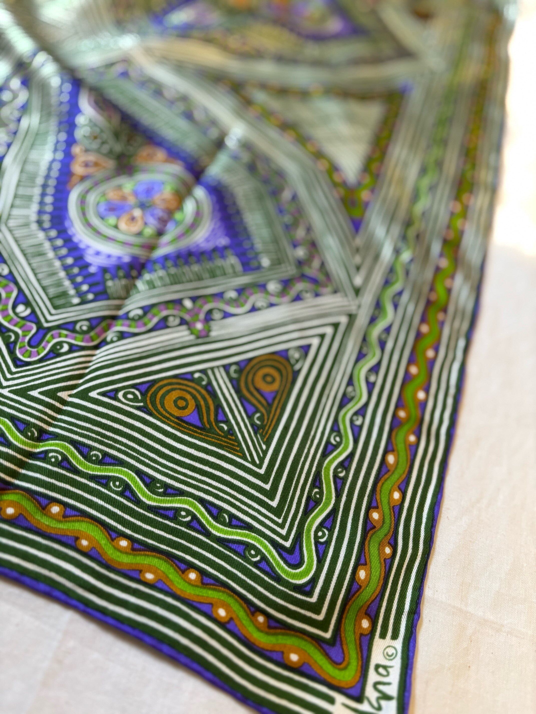パープルとグリーンの好配色のシルクスカーフ。昨今めちゃくちゃトレンドになっていますが、80年代の日本製のシルクでとても品質が良いスカーフです。
