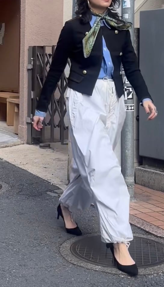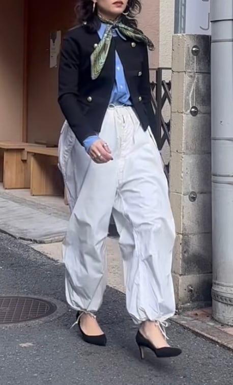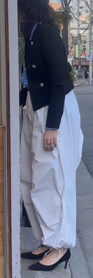 元々ボリュームが出るパンツなのでトップスはなるべくコンパクトにした方がバランスは良く見えると思います。もしくは着丈の長いIラインをトップスで作ると良いと思います。