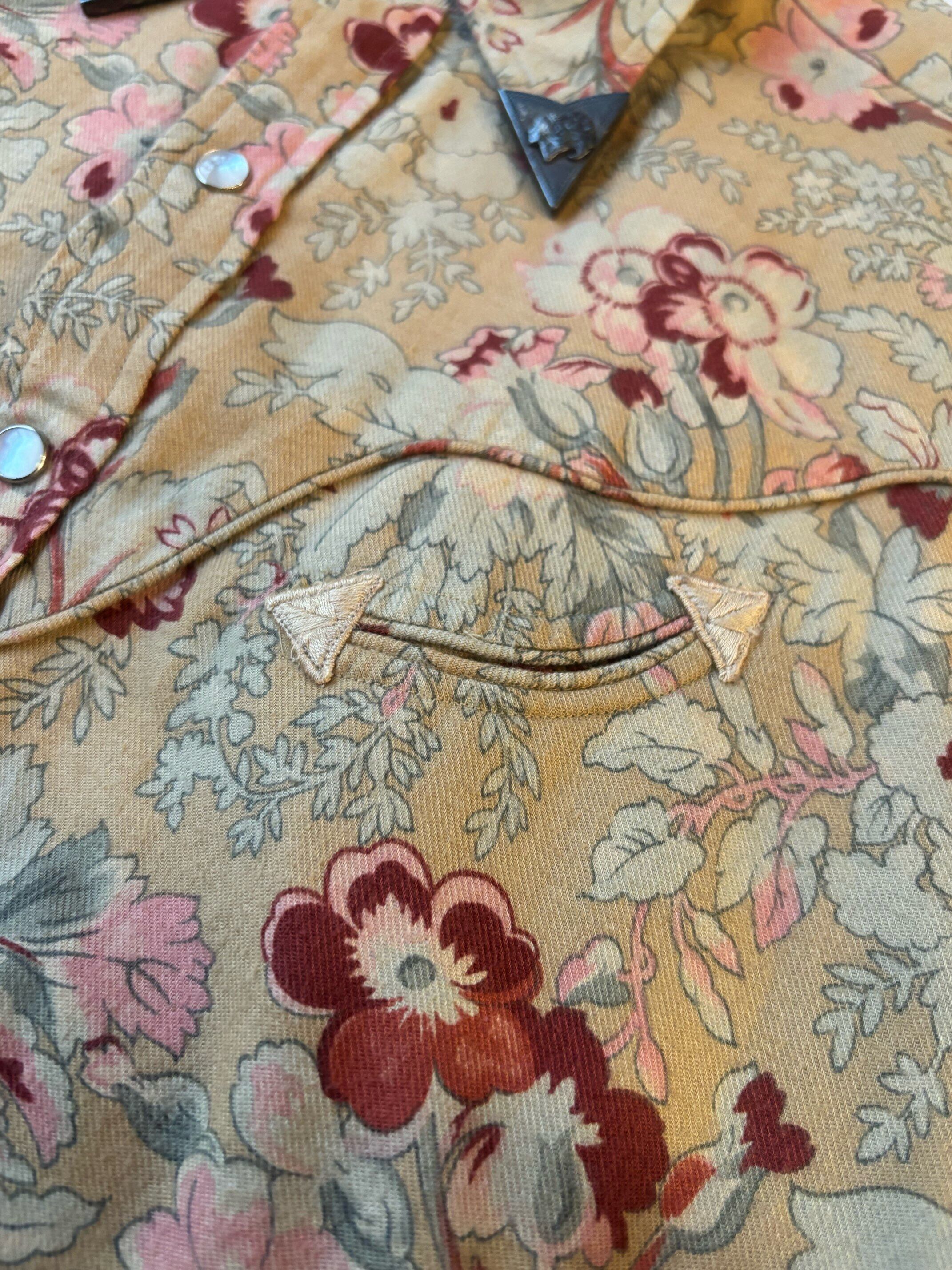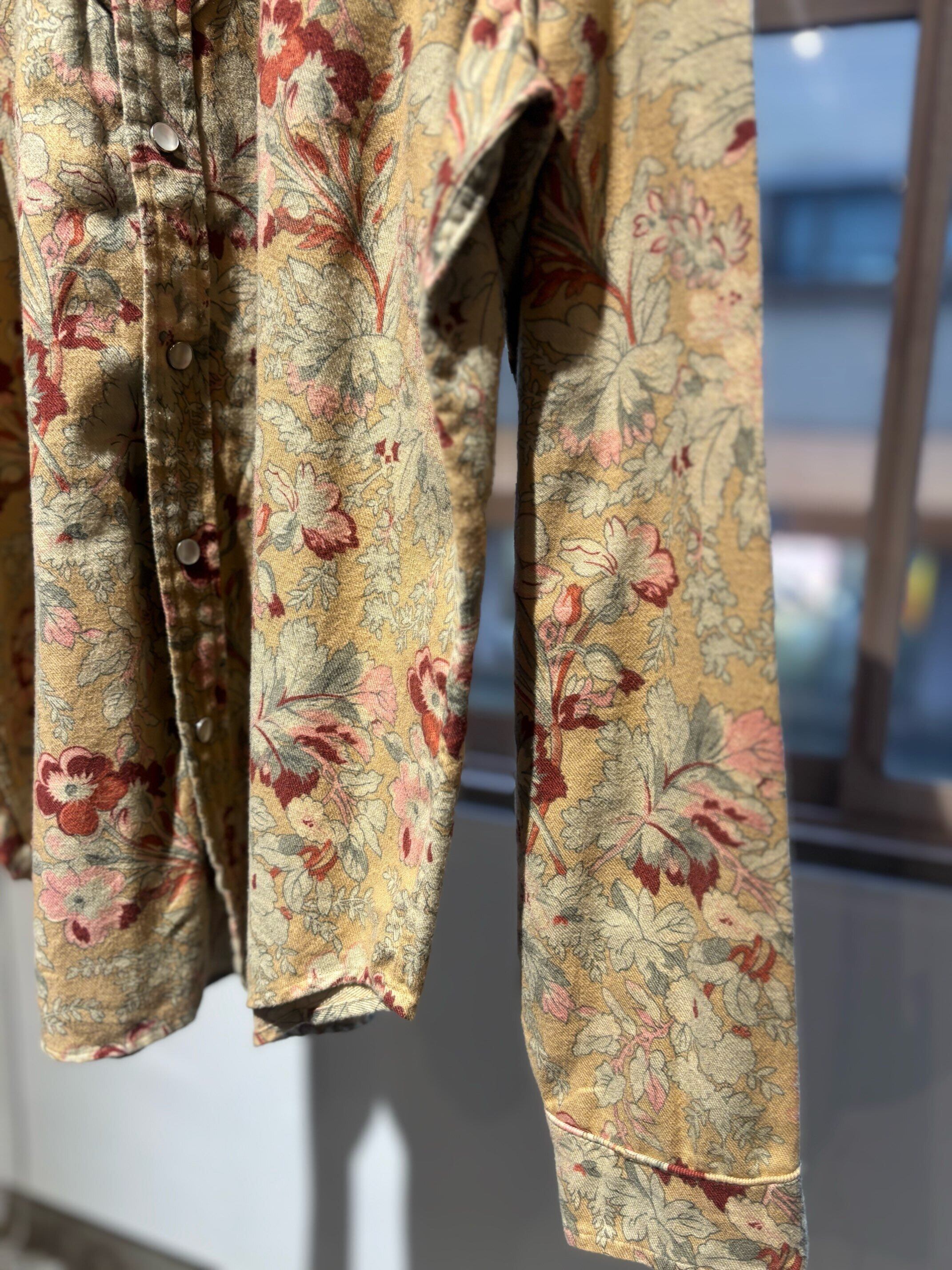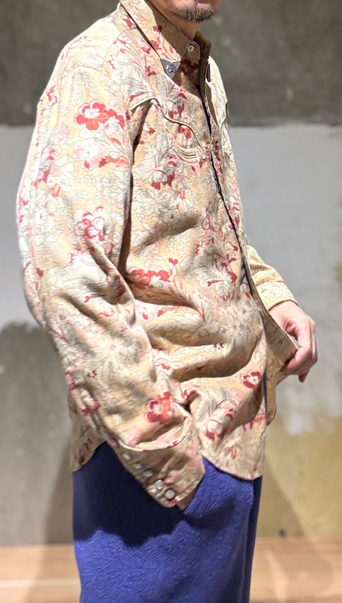 かなり珍しいウエスタンシャツですね。襟先にスチールの金具が付いていてインディアンの刻印が付いています。それだけでもかなり珍しいのですが、花柄のコットン生地で少しだけ起毛感のあるビエラ素材になります。