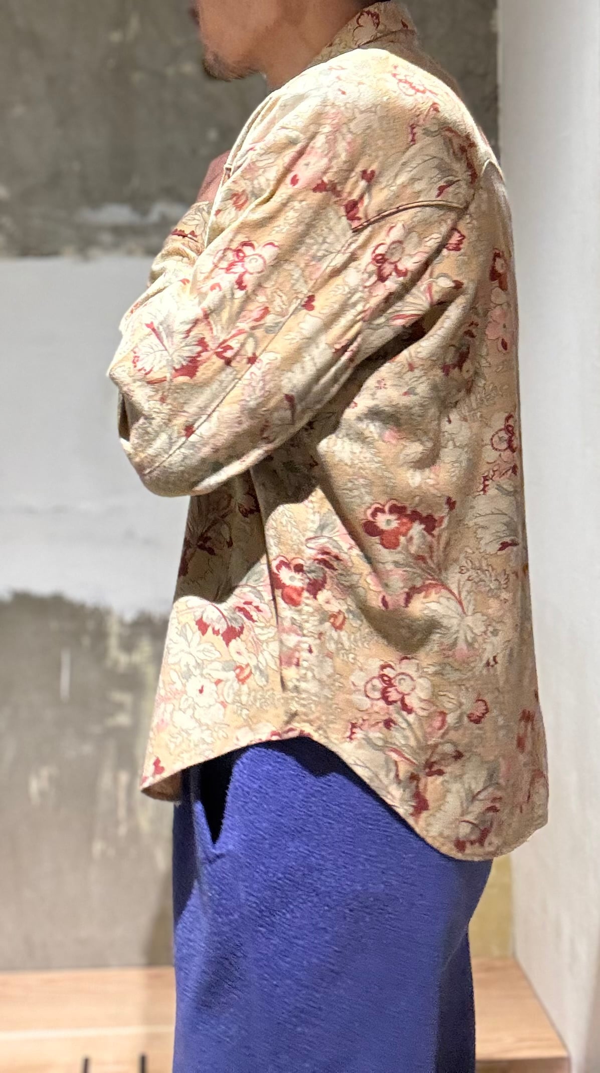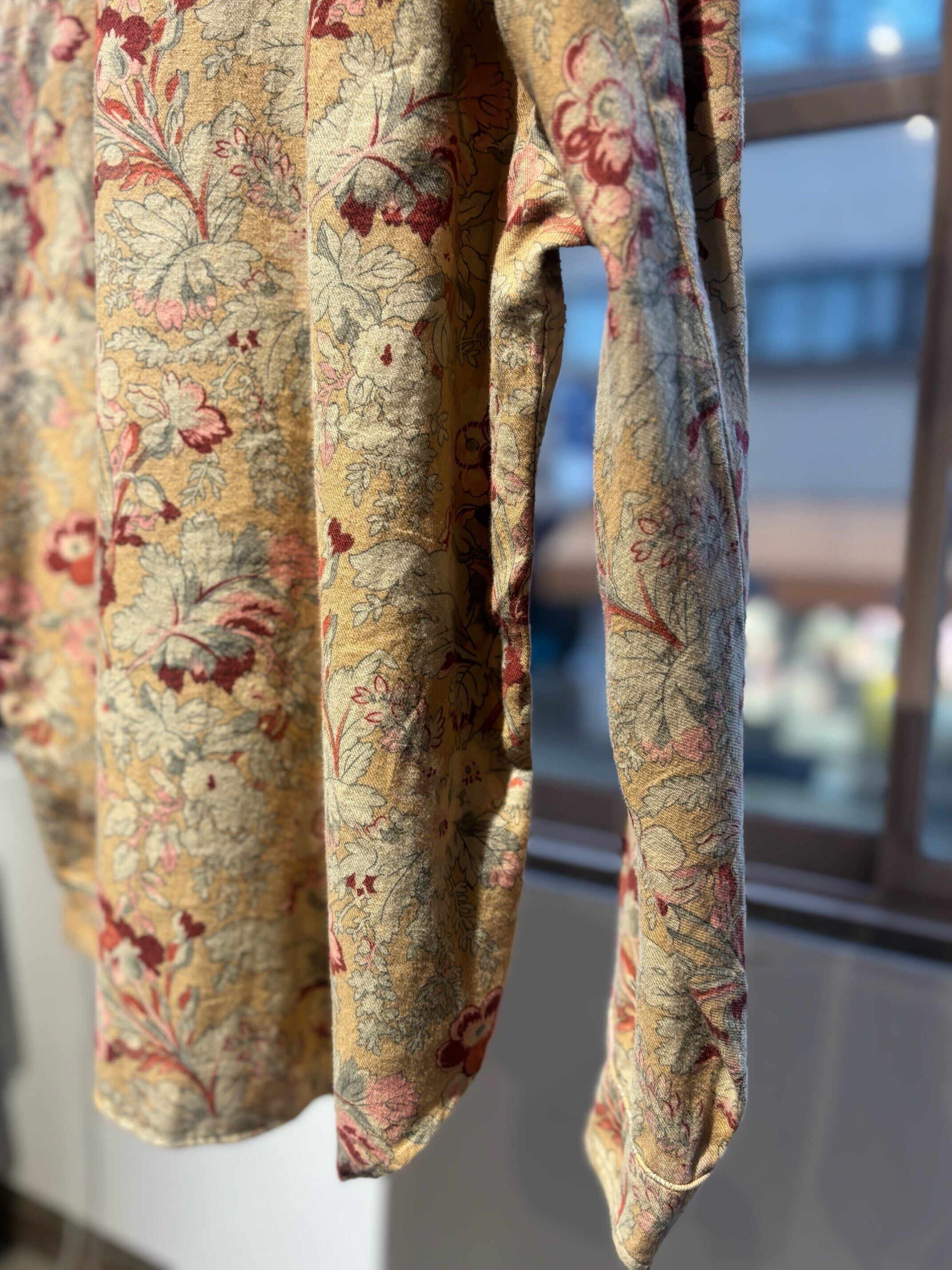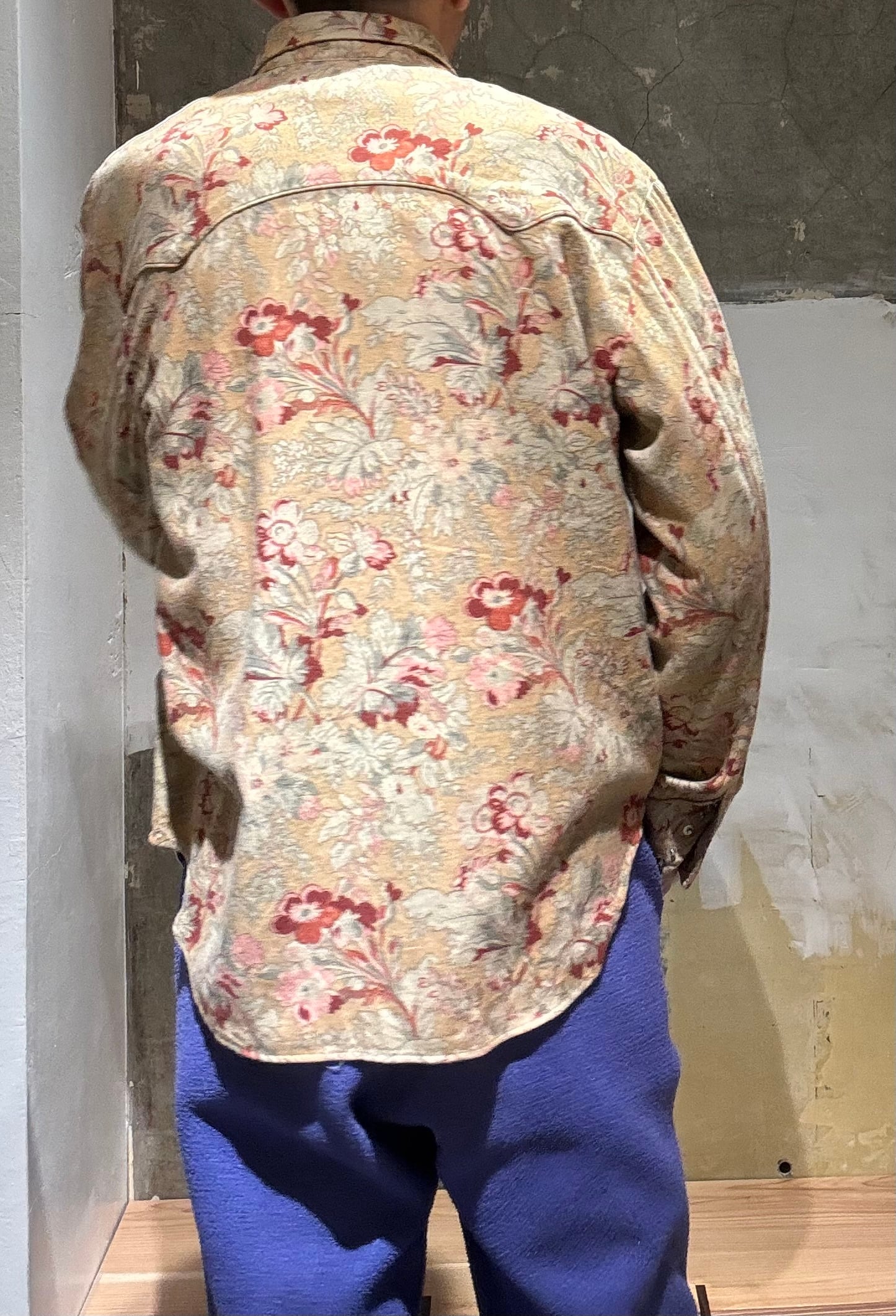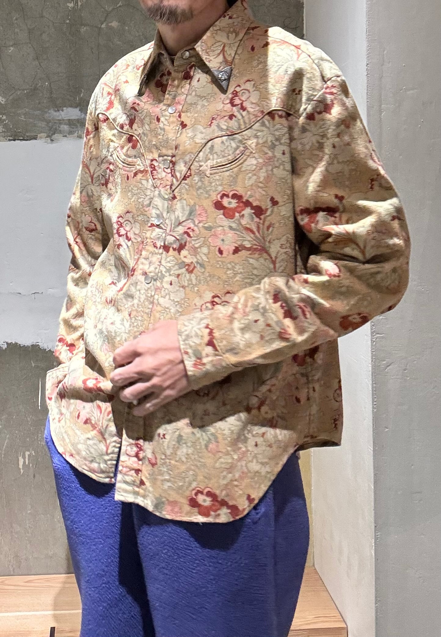 かなり珍しいウエスタンシャツですね。襟先にスチールの金具が付いていてインディアンの刻印が付いています。それだけでもかなり珍しいのですが、花柄のコットン生地で少しだけ起毛感のあるビエラ素材になります。