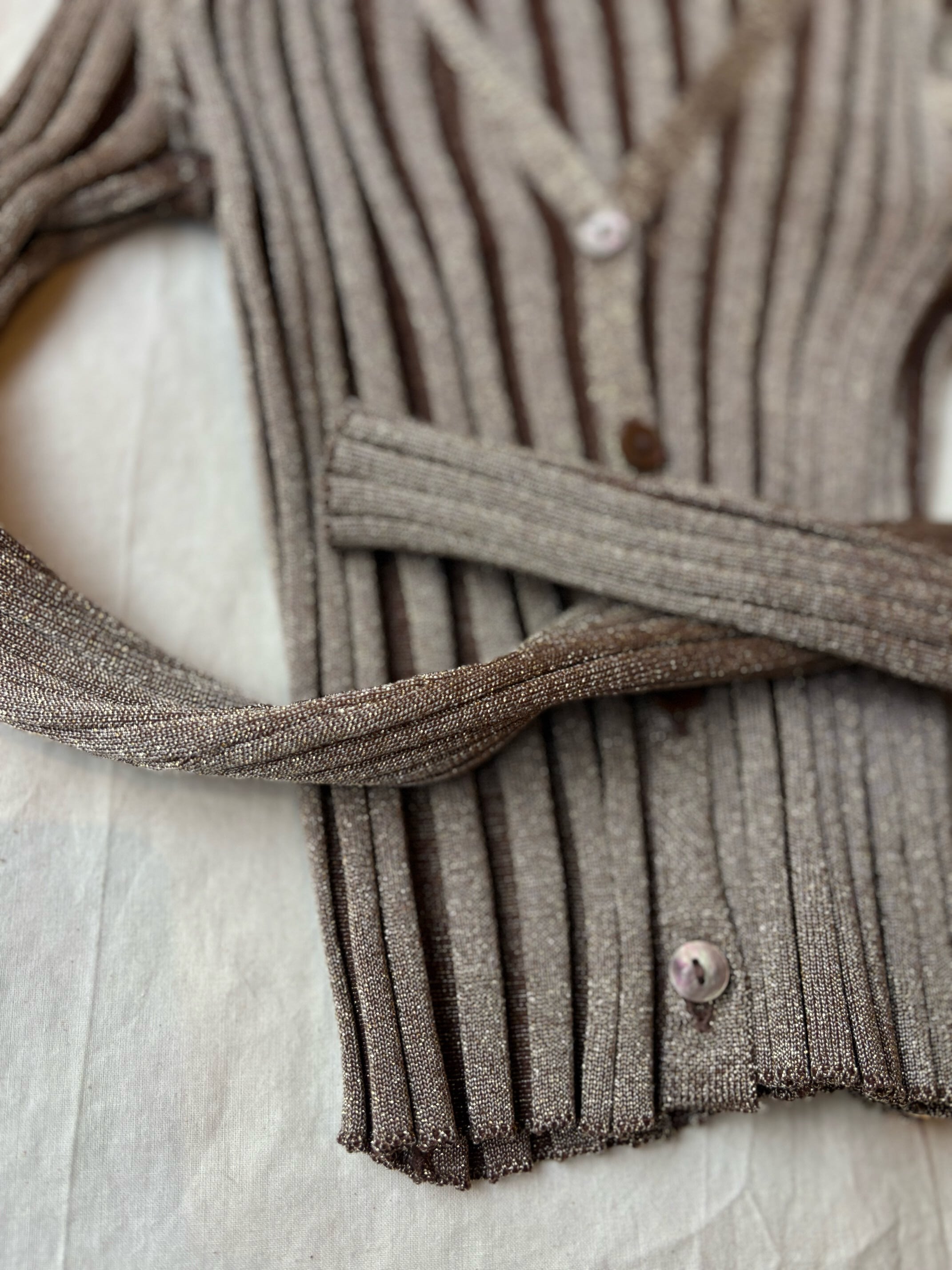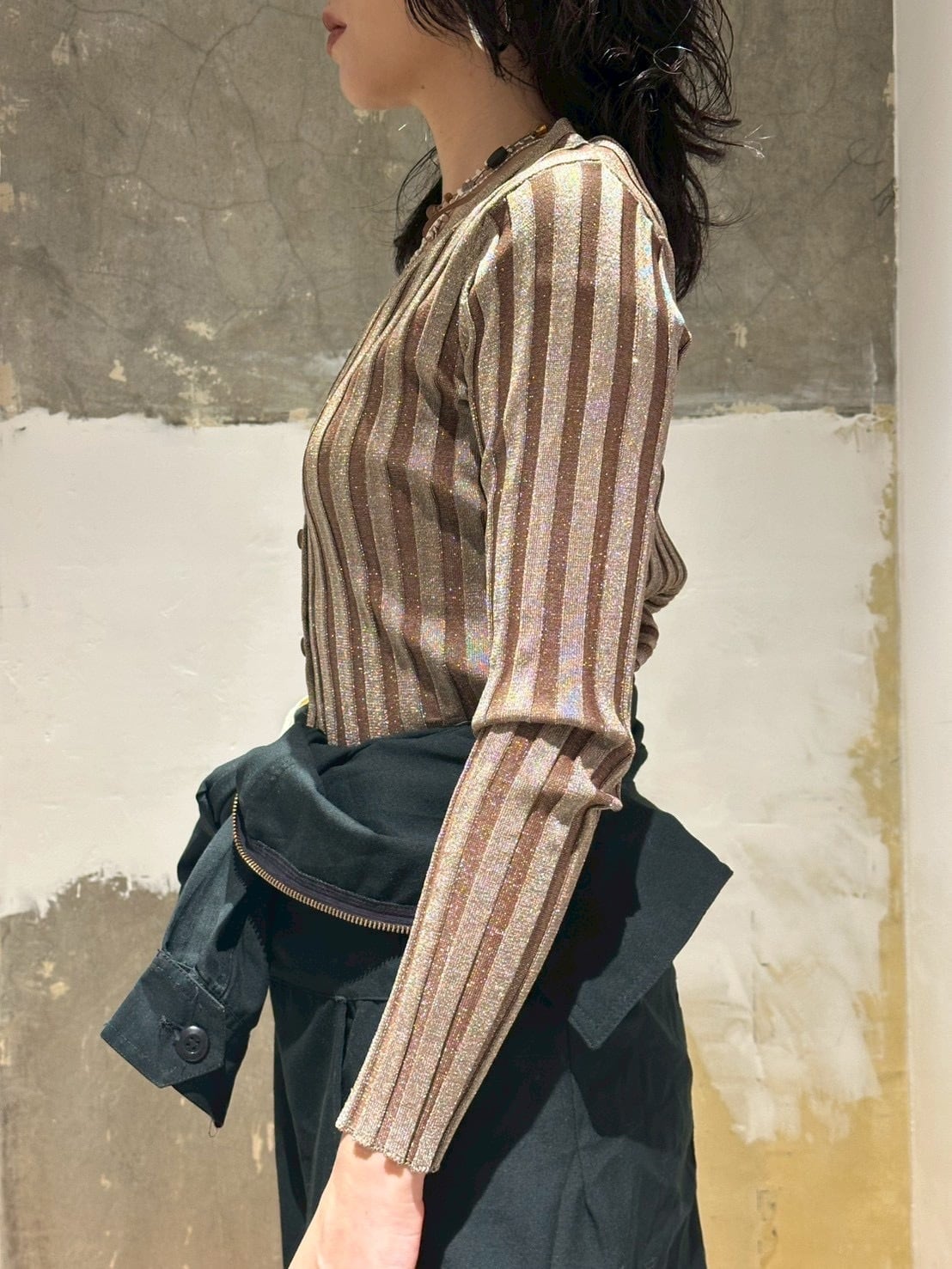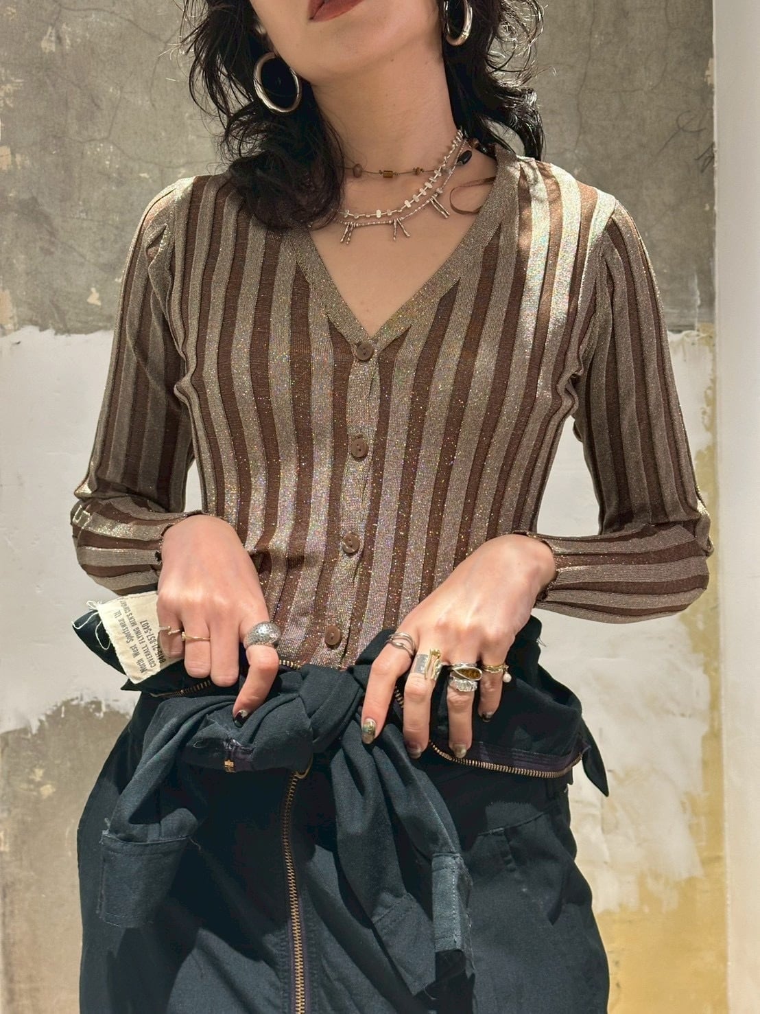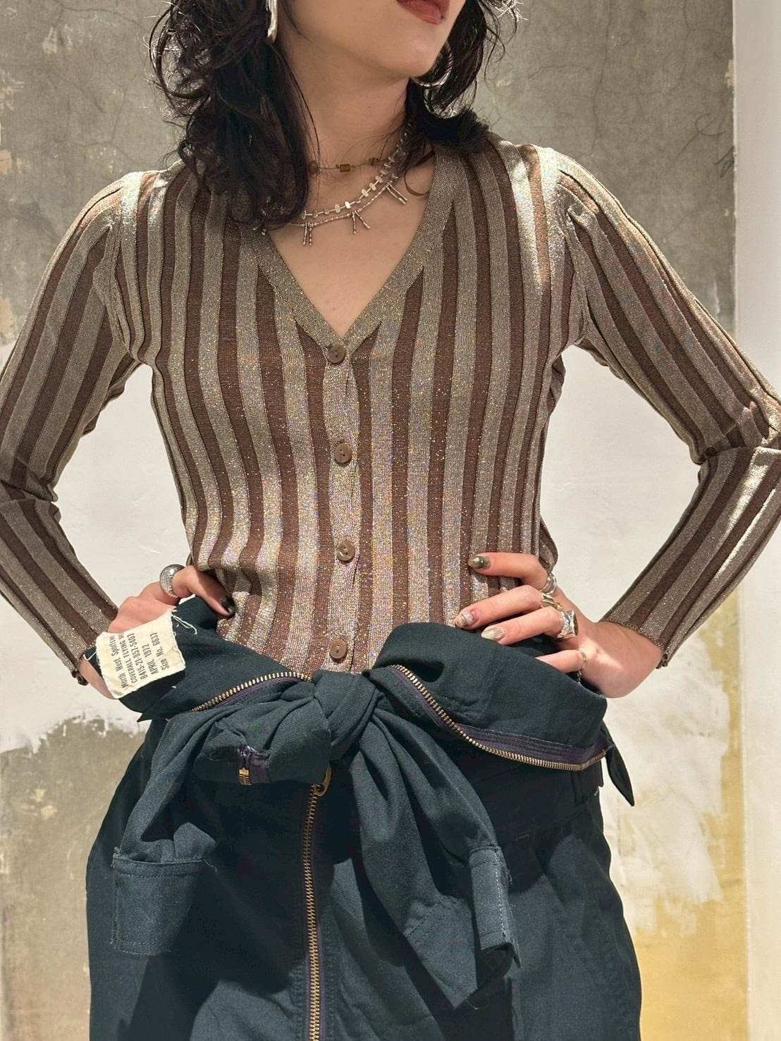かなり小さいタイトなリブニットなので伸ばして身体にフィットするタイプのカーディガンです。vネックがこれからの季節にはデコルテも見えて顔周りもとてもスッキリ見せてくれるので、カーディガンとしてもカットソー代わりに使っても良いと思います。