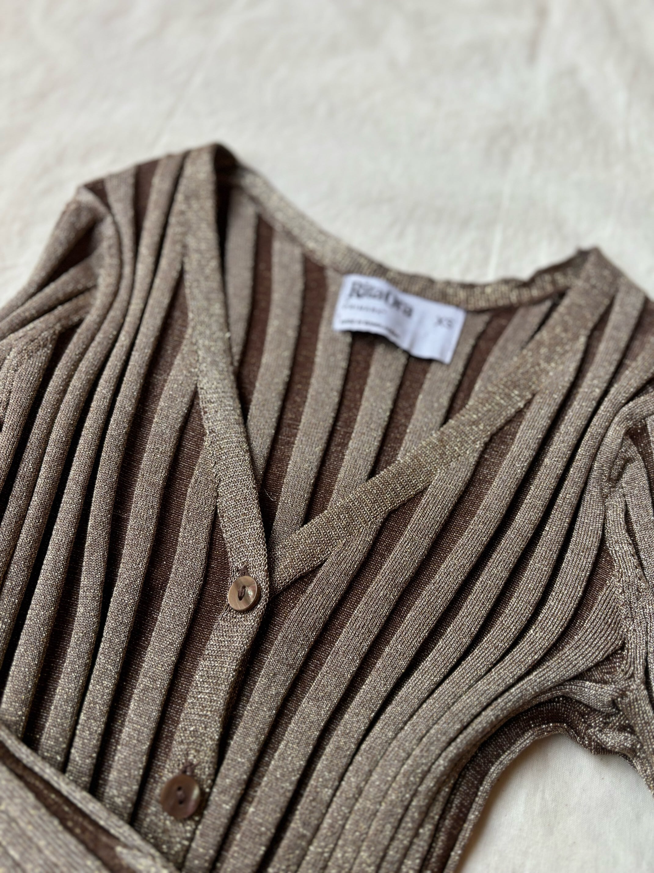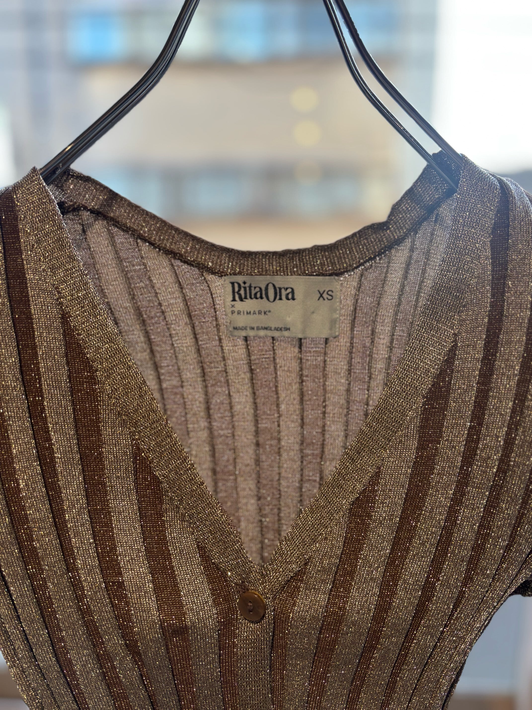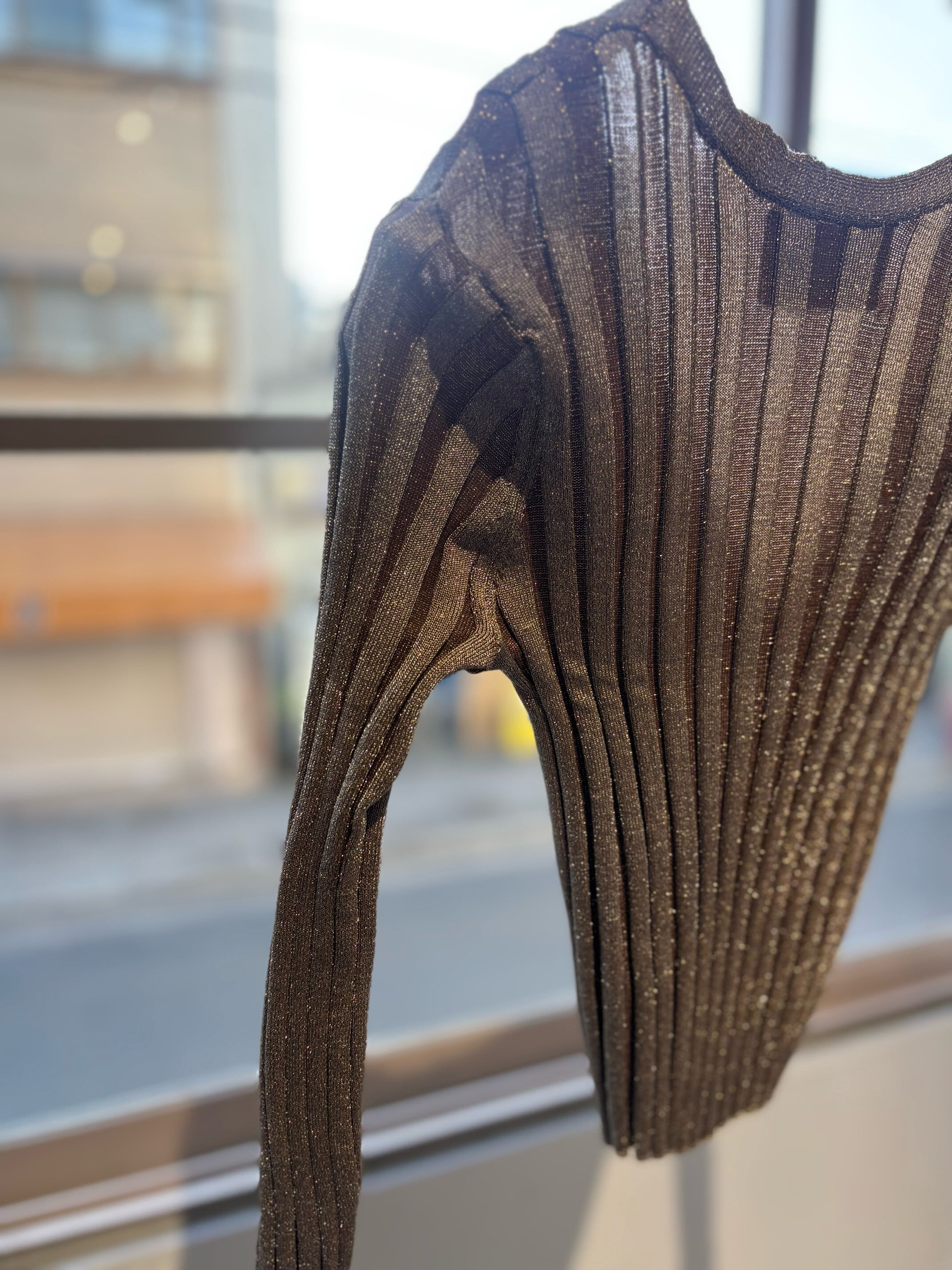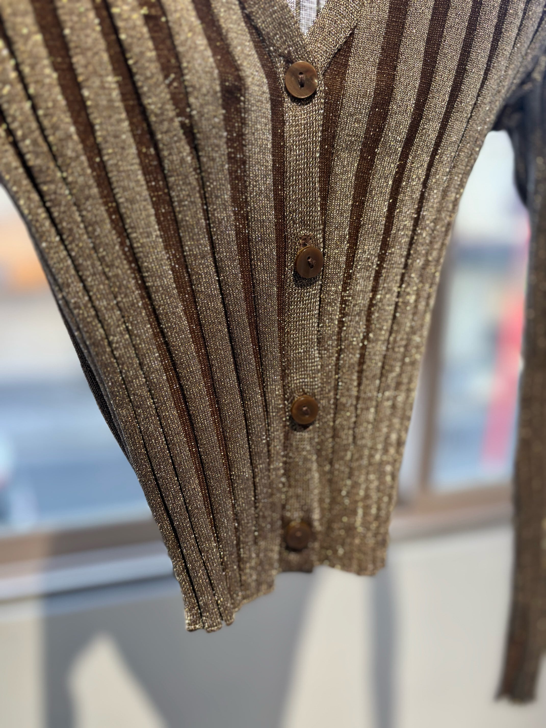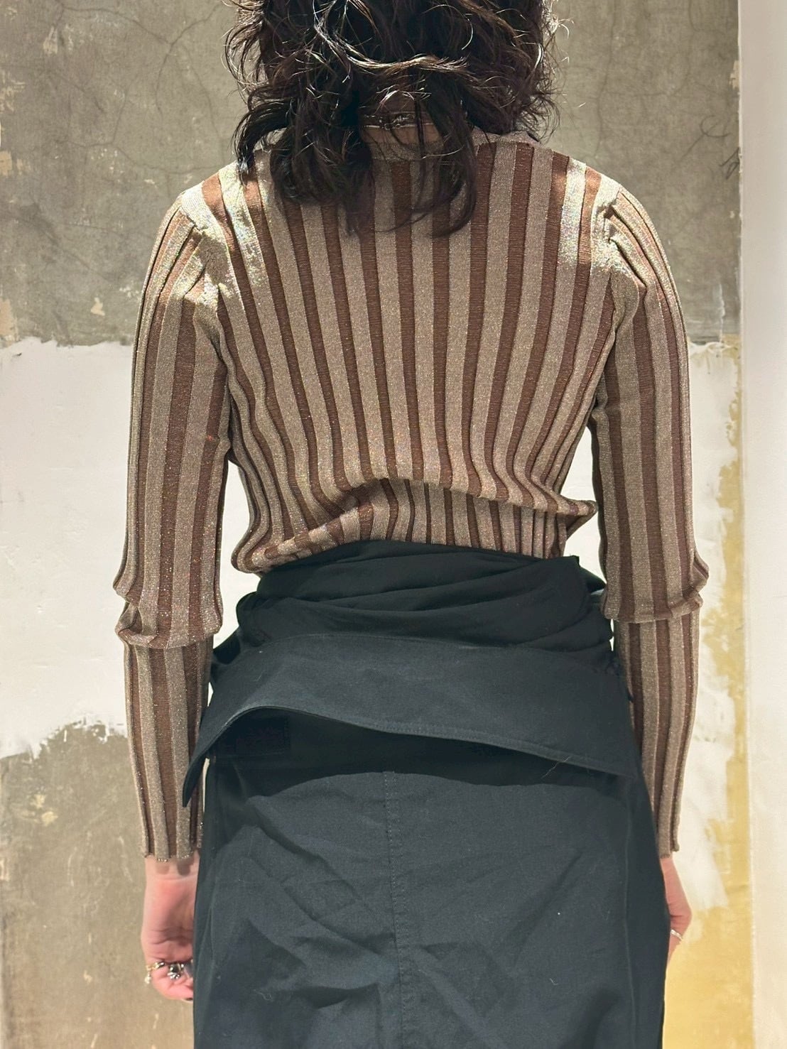 かなり小さいタイトなリブニットなので伸ばして身体にフィットするタイプのカーディガンです。vネックがこれからの季節にはデコルテも見えて顔周りもとてもスッキリ見せてくれるので、カーディガンとしてもカットソー代わりに使っても良いと思います。