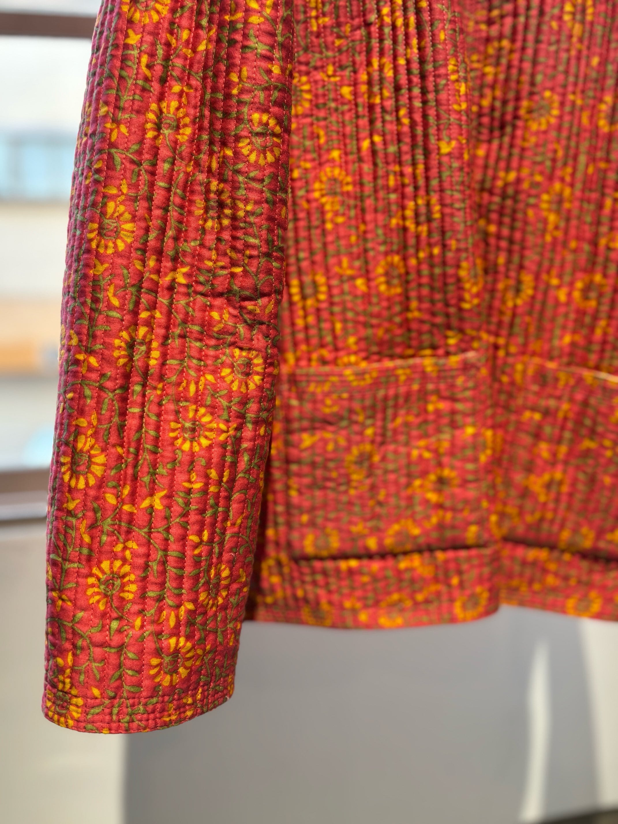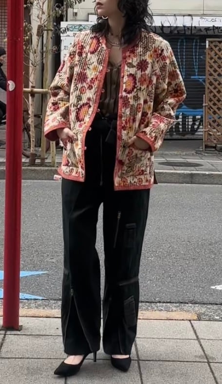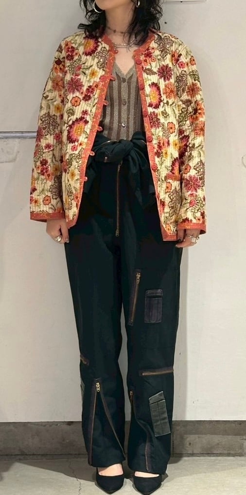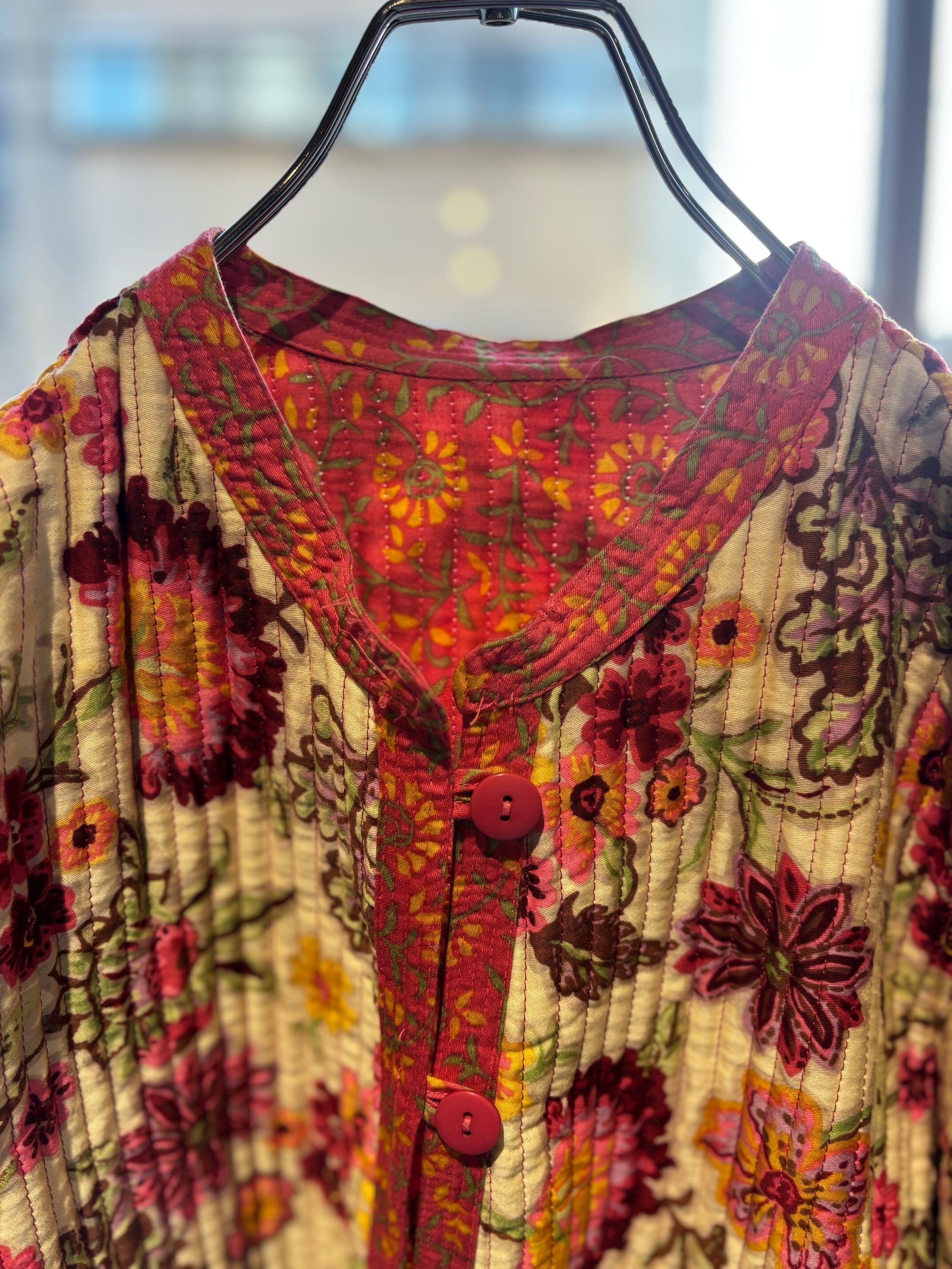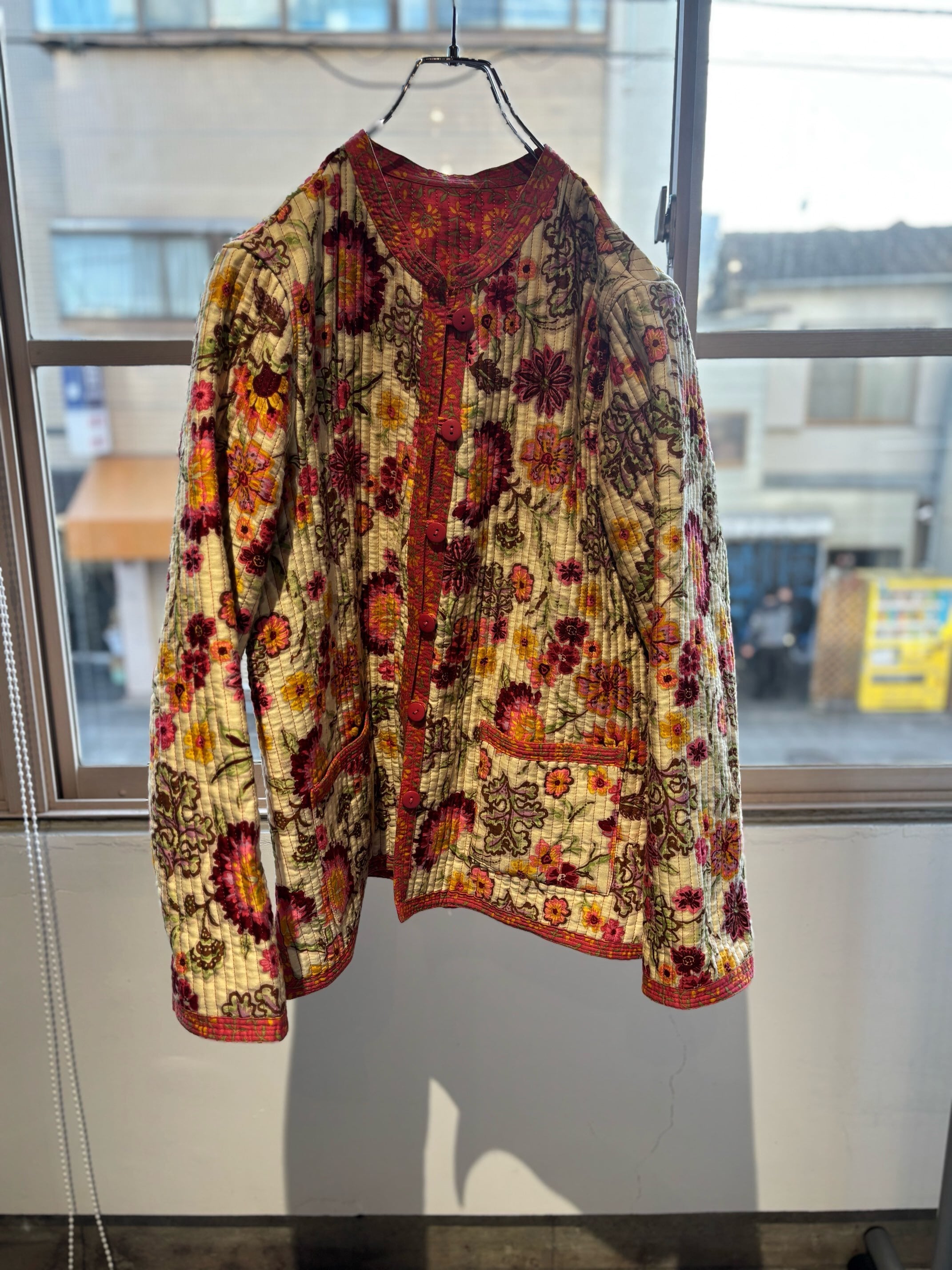 atsuraeでは度々入荷のあるキルティングジャケットですが、今年も貯めていた分がこちらの1着で最後になりました。とても可愛い明るい花柄と、オレンジのような色の赤系統の色のリバーシブルになります。オープン当初からatsuraeのテーマのエスニックに該当するアイテムとして入荷がありましたが、ここ数年でグッと数が減ってしまいなかなか入荷が難しくなっているアイテムの一つです。