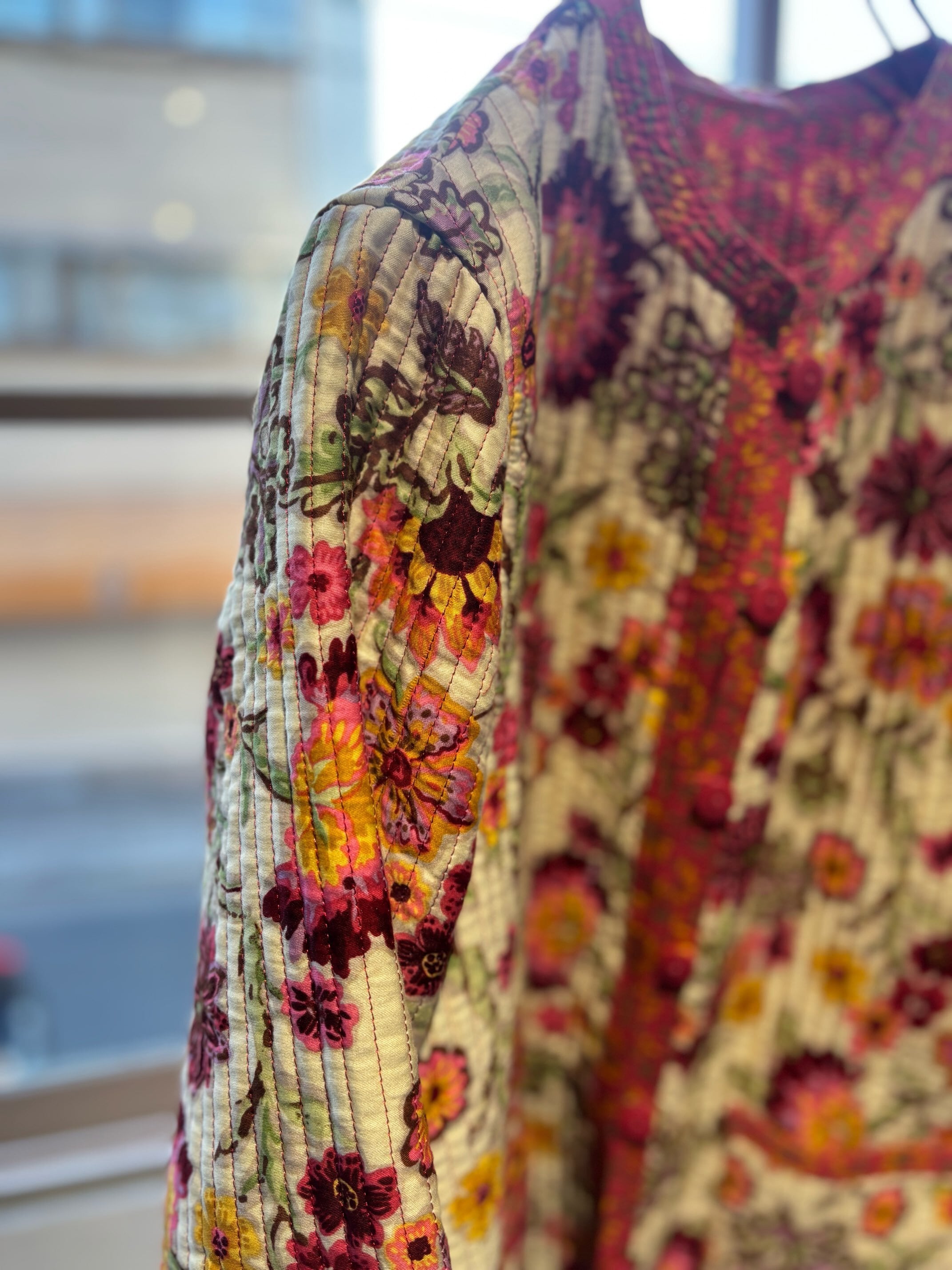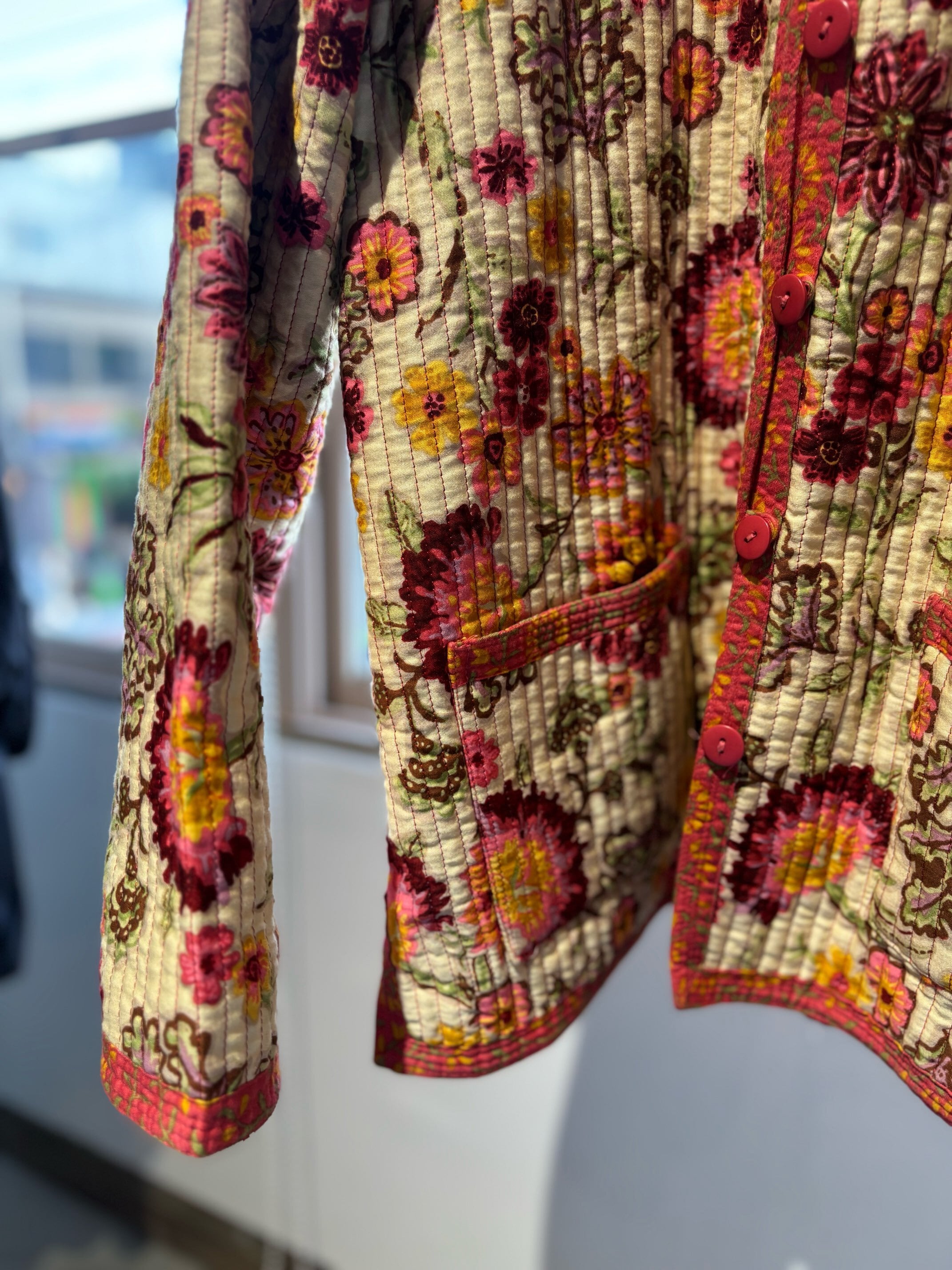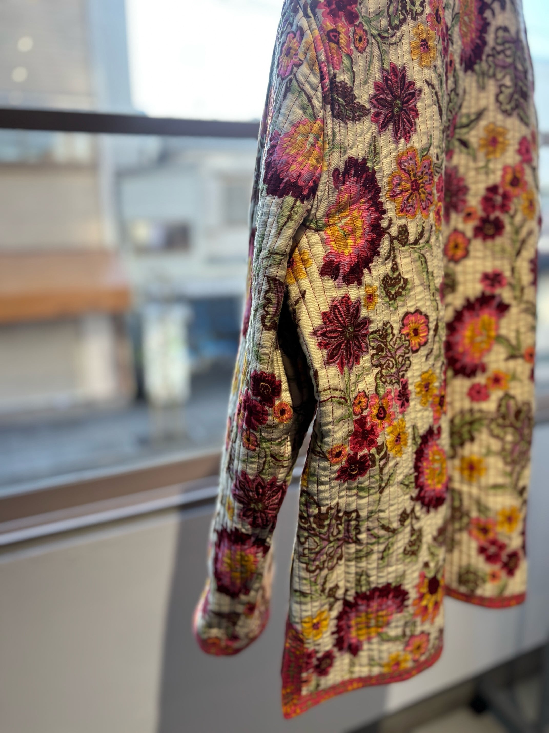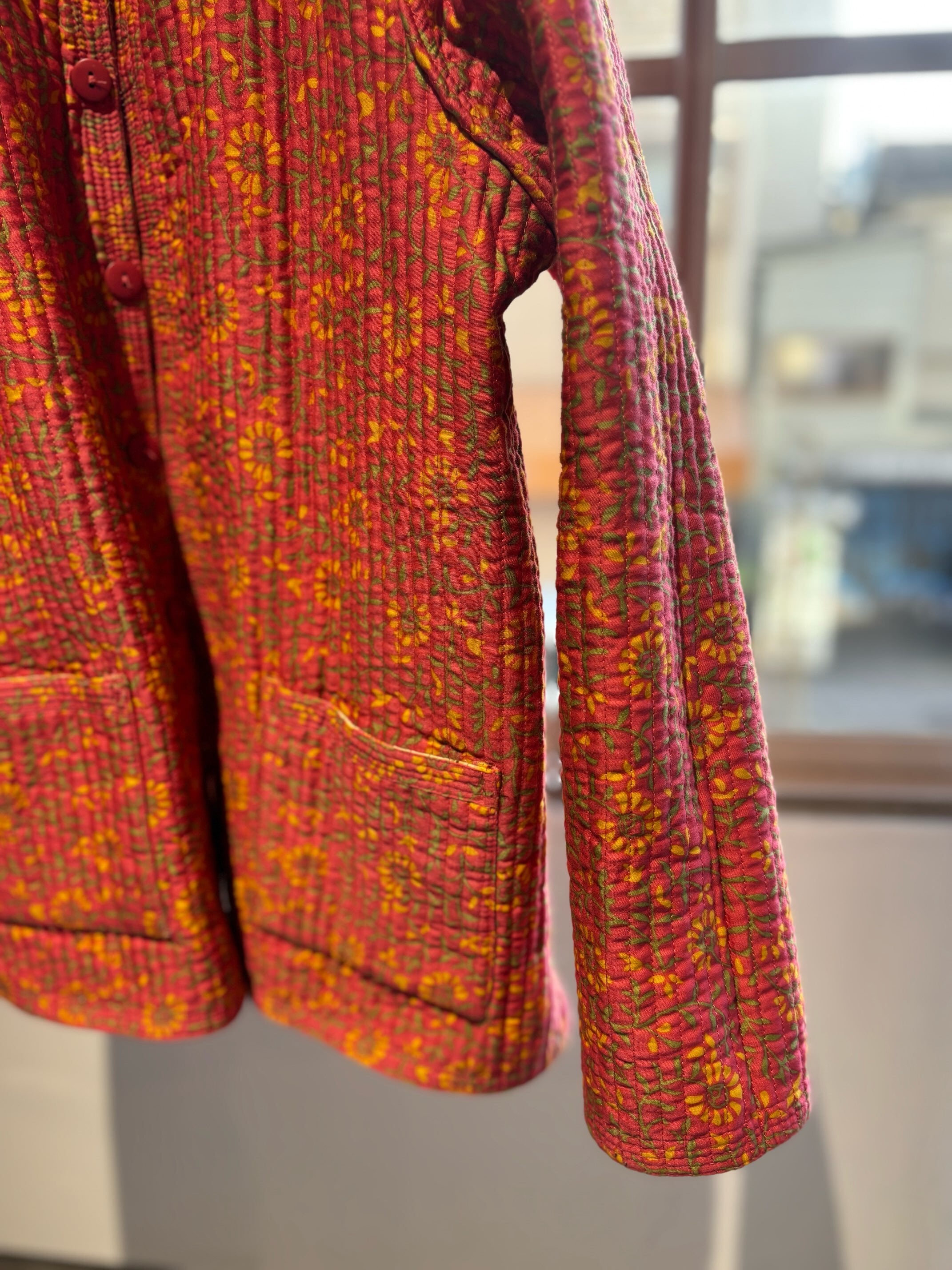 atsuraeでは度々入荷のあるキルティングジャケットですが、今年も貯めていた分がこちらの1着で最後になりました。とても可愛い明るい花柄と、オレンジのような色の赤系統の色のリバーシブルになります。オープン当初からatsuraeのテーマのエスニックに該当するアイテムとして入荷がありましたが、ここ数年でグッと数が減ってしまいなかなか入荷が難しくなっているアイテムの一つです。