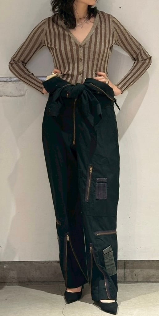 勿論軍ものですので男性用なのですが、こちらは総丈などが小さめなので女性の方が向いているサイズ感だと思います。モデルが164㎝で7センチ弱のヒールを履いている状態です。170㎝前後の男性も着れるサイズでしょう。
