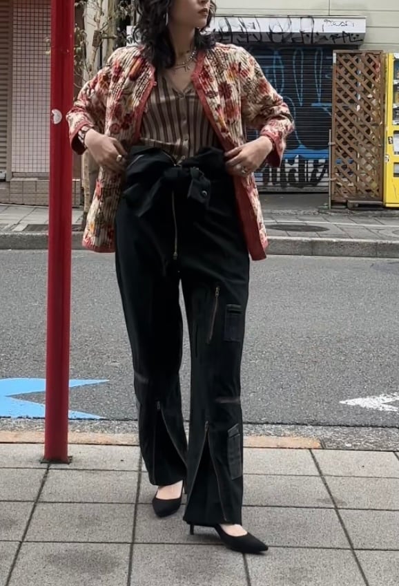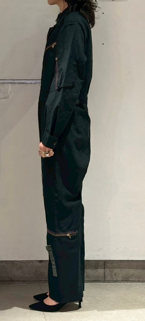 これからの季節に着ても暑くない素材のジャンプスーツで、かなり薄手の生地を使ったアイテムです。腰に巻くにも生地が厚手過ぎず巻きやすいと思います。腰巻きにしてジャケットを羽織ったり、そのまま着てベストを合わせたりしてもらうと良いと思います。