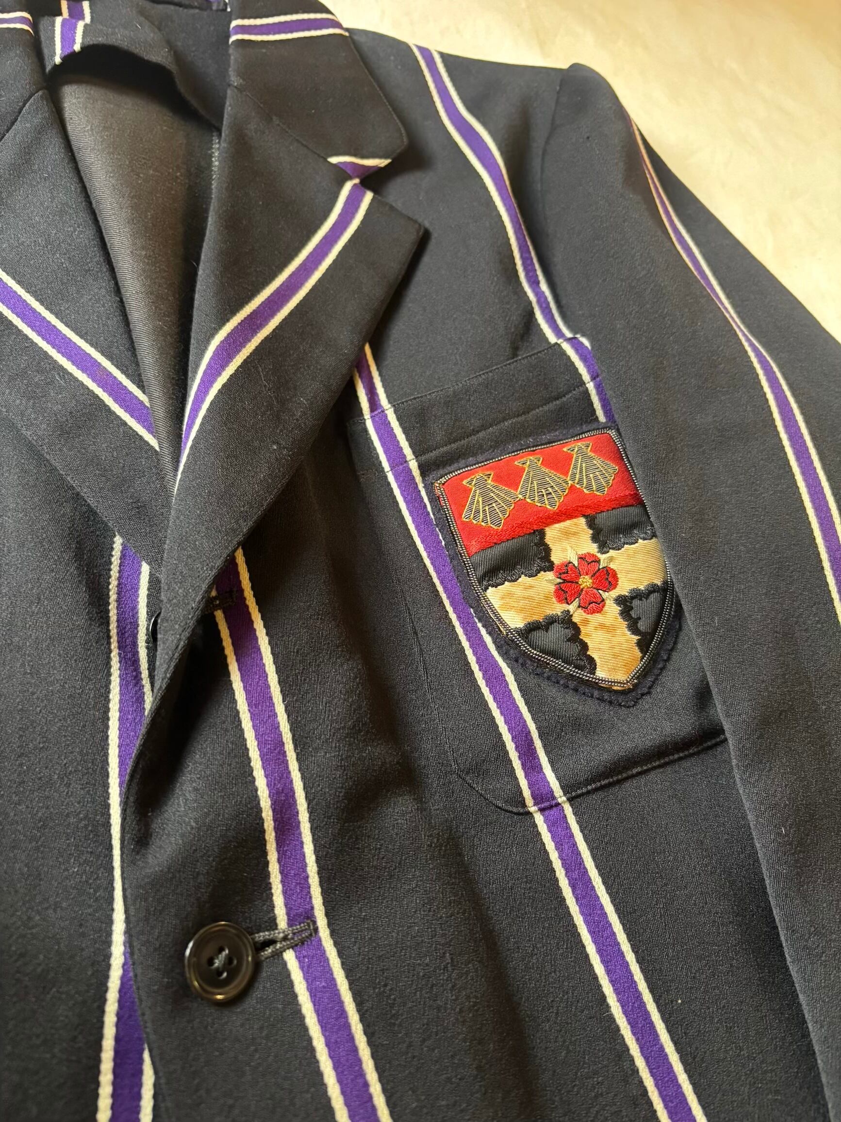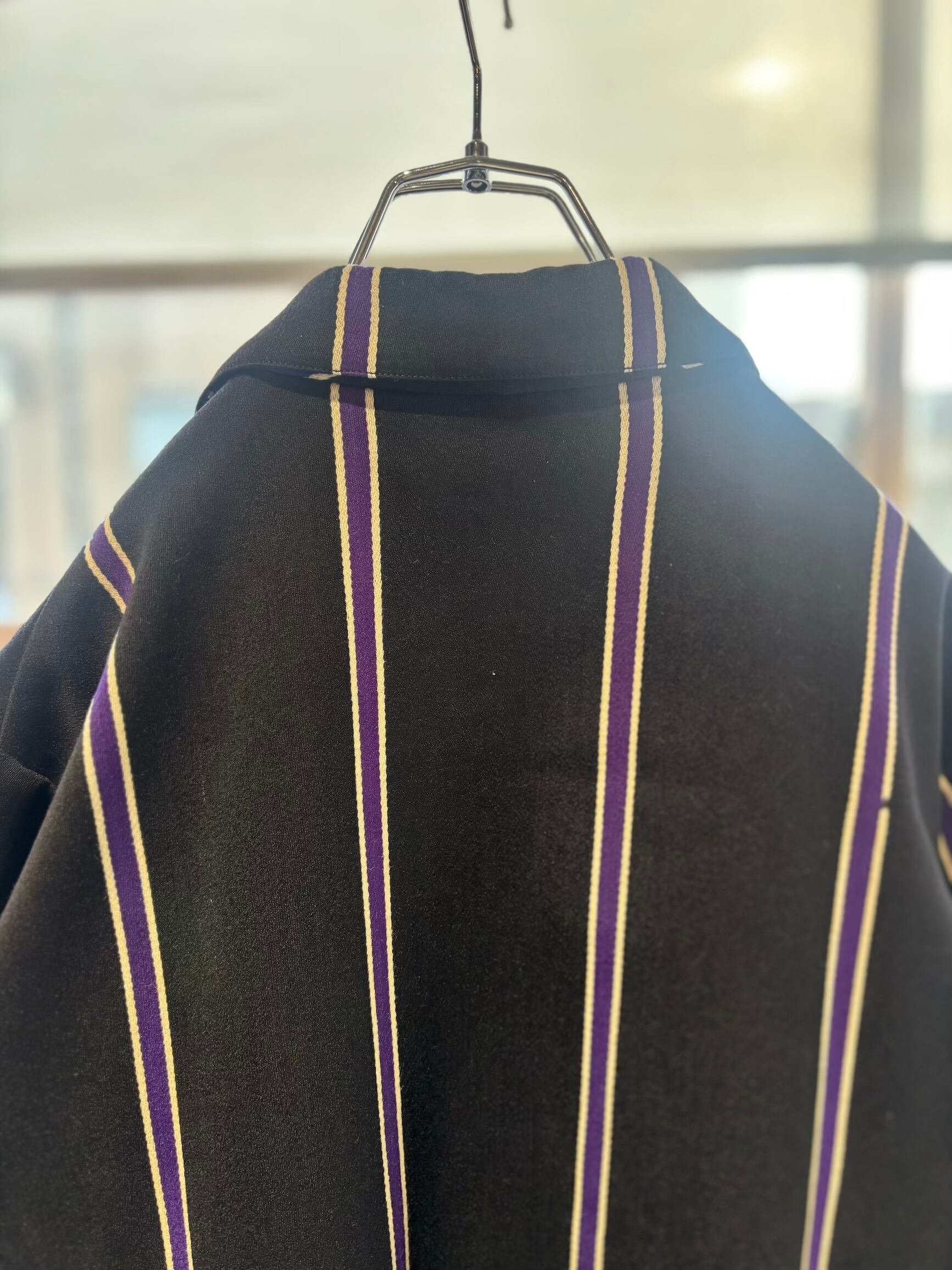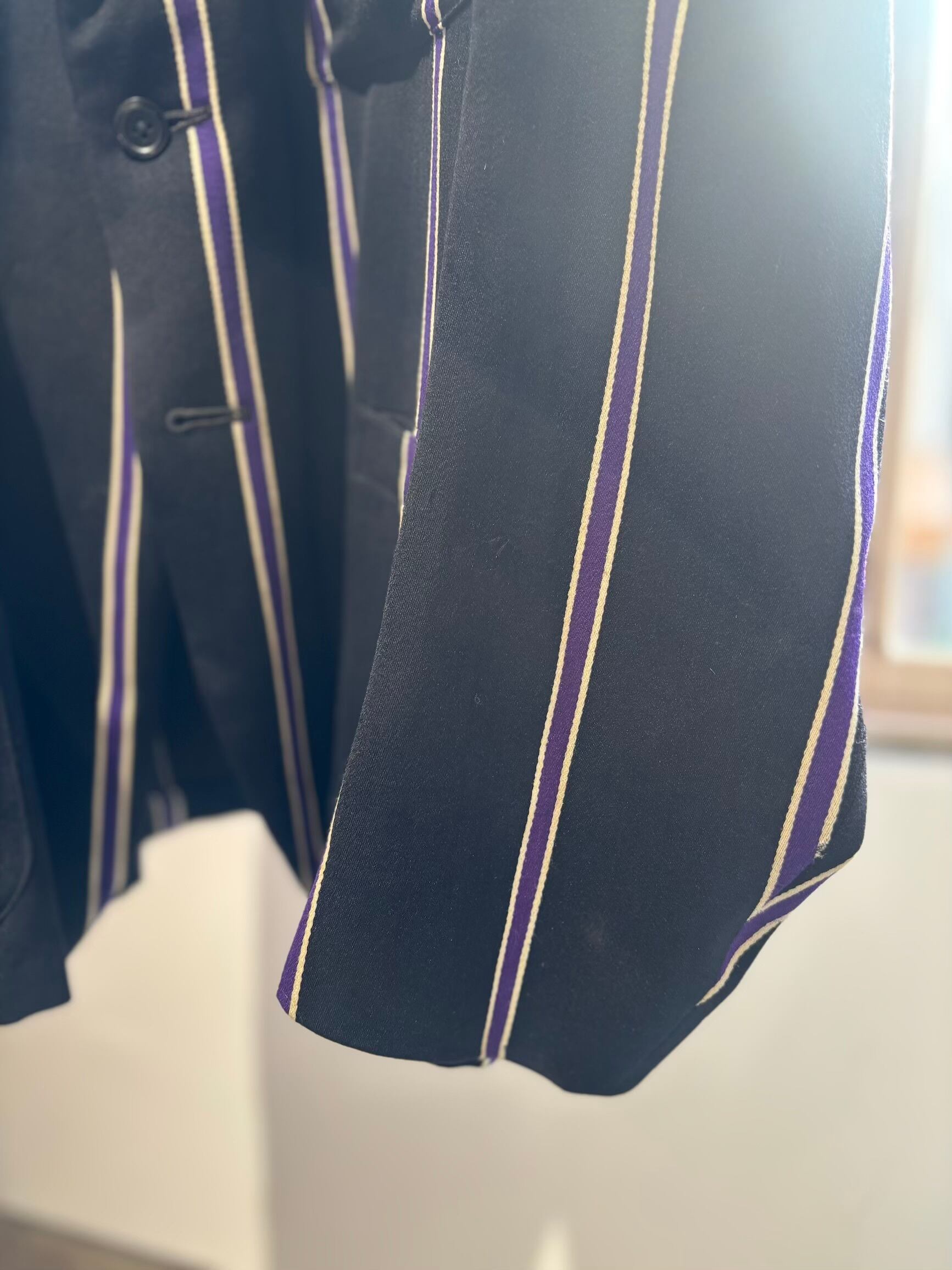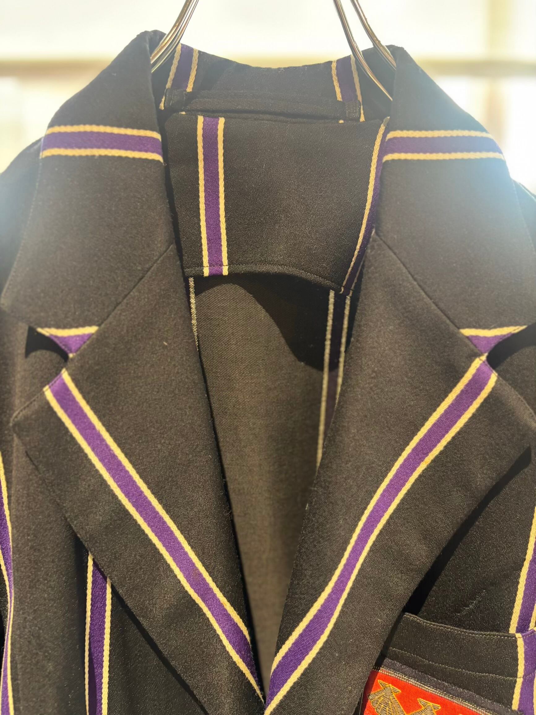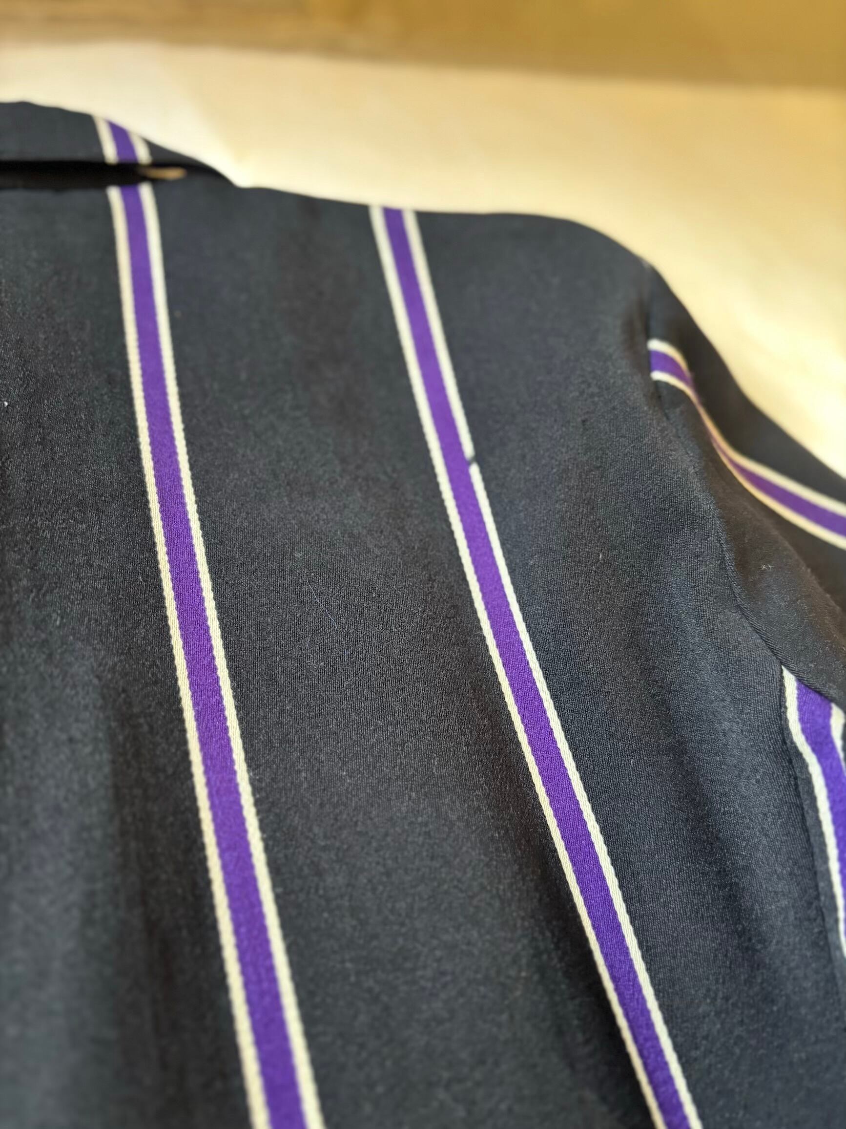 スクールジャケットとしてはとても珍しいブラックベースにパープルのストライプがとても良いです。古い年代だと小さなサイズのものが多いのですが、こちらは珍しく大きめサイズになります。栄養環境の違いと学生服という事で大きいサイズが出るのは稀だと思います。