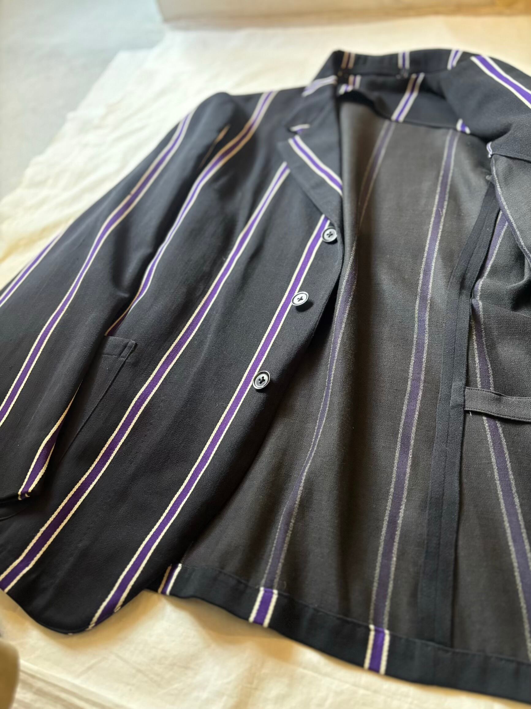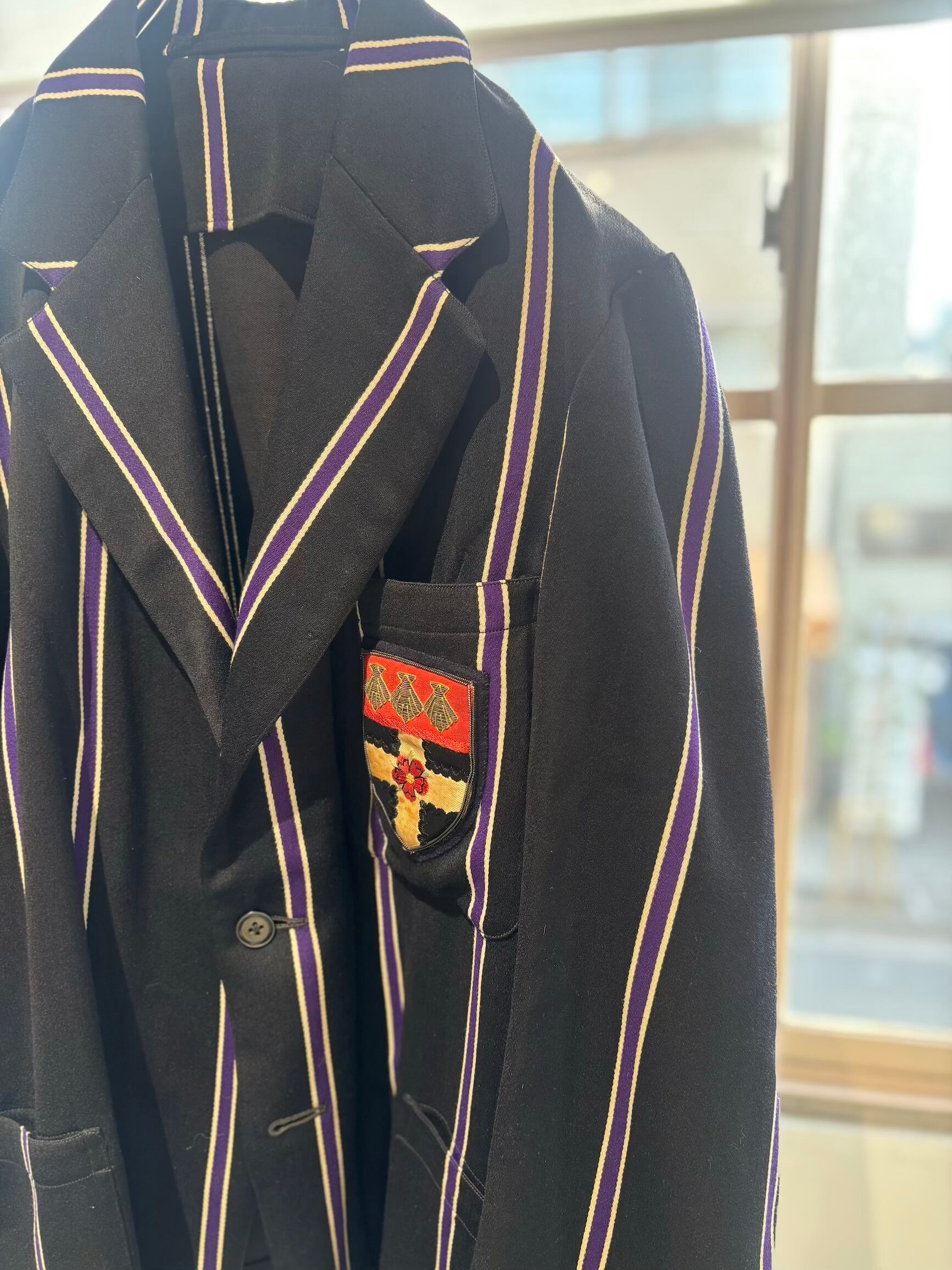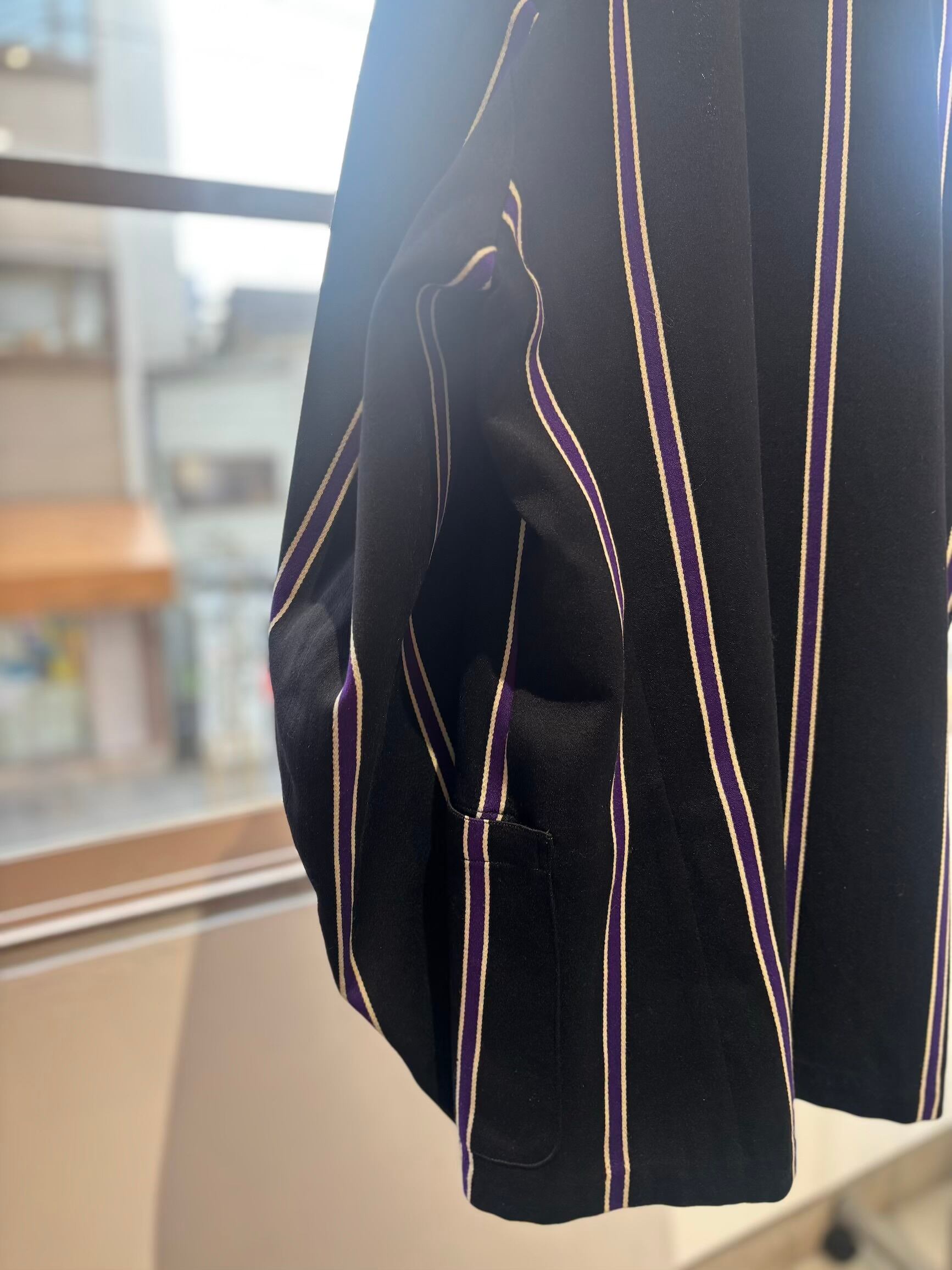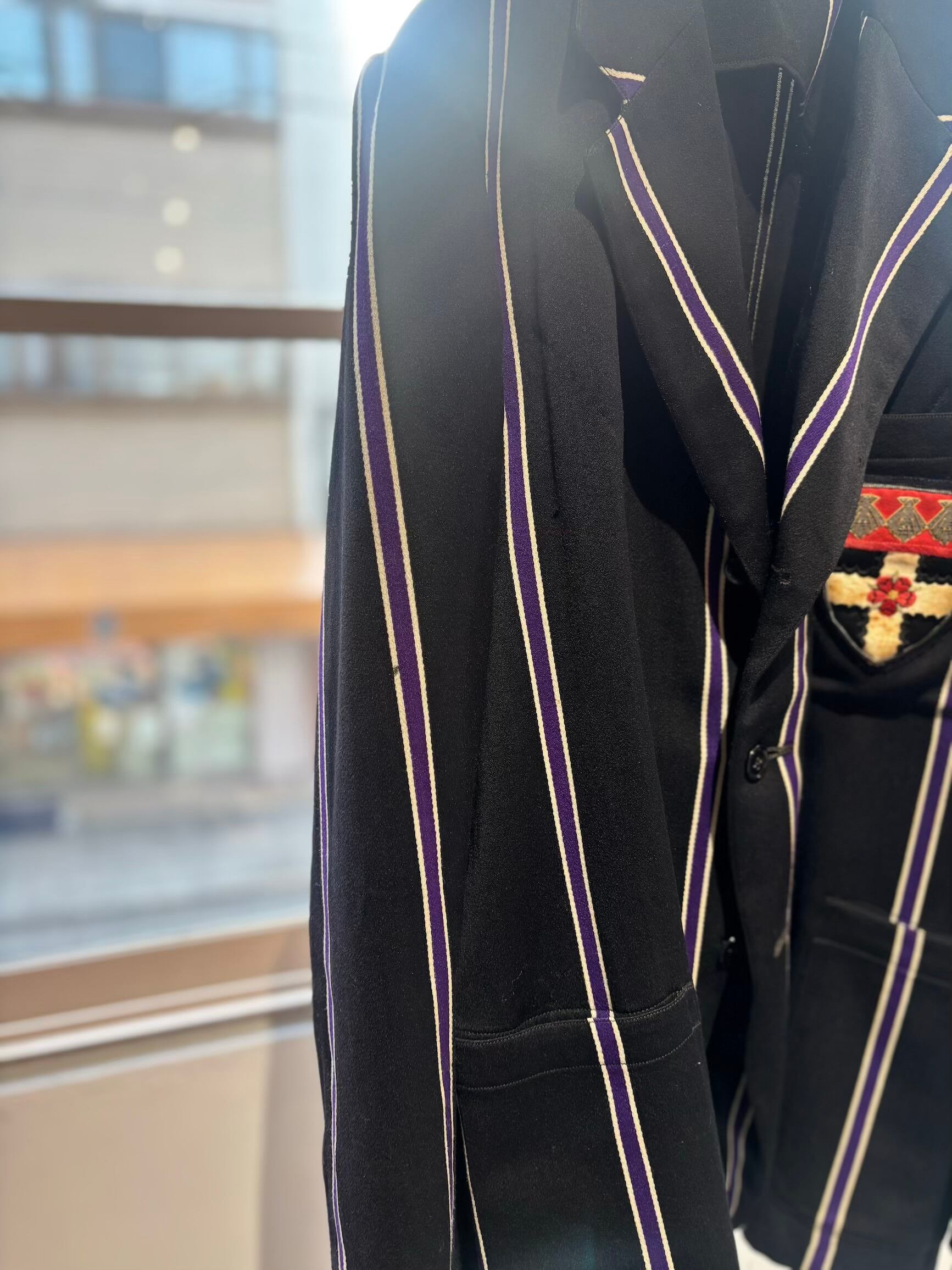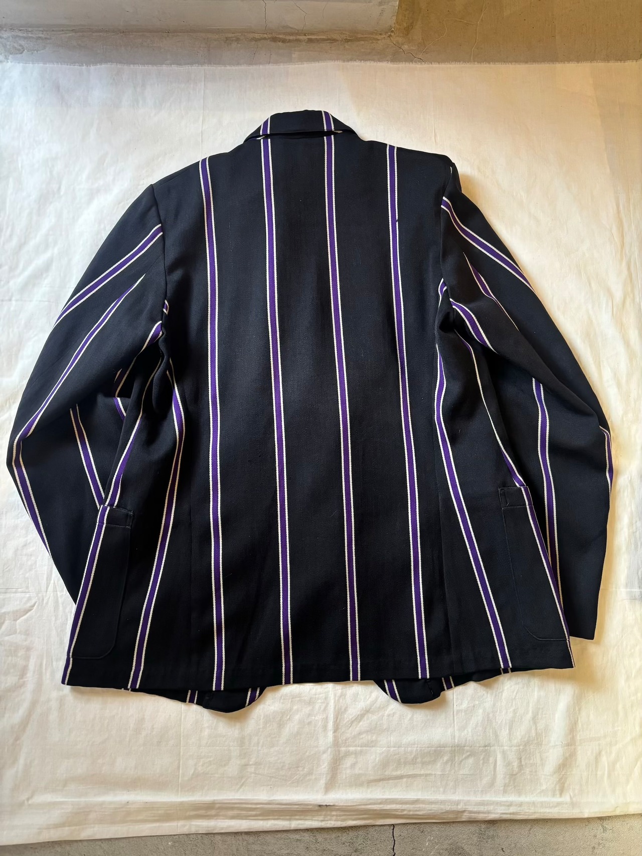 スクールジャケットとしてはとても珍しいブラックベースにパープルのストライプがとても良いです。古い年代だと小さなサイズのものが多いのですが、こちらは珍しく大きめサイズになります。栄養環境の違いと学生服という事で大きいサイズが出るのは稀だと思います。
